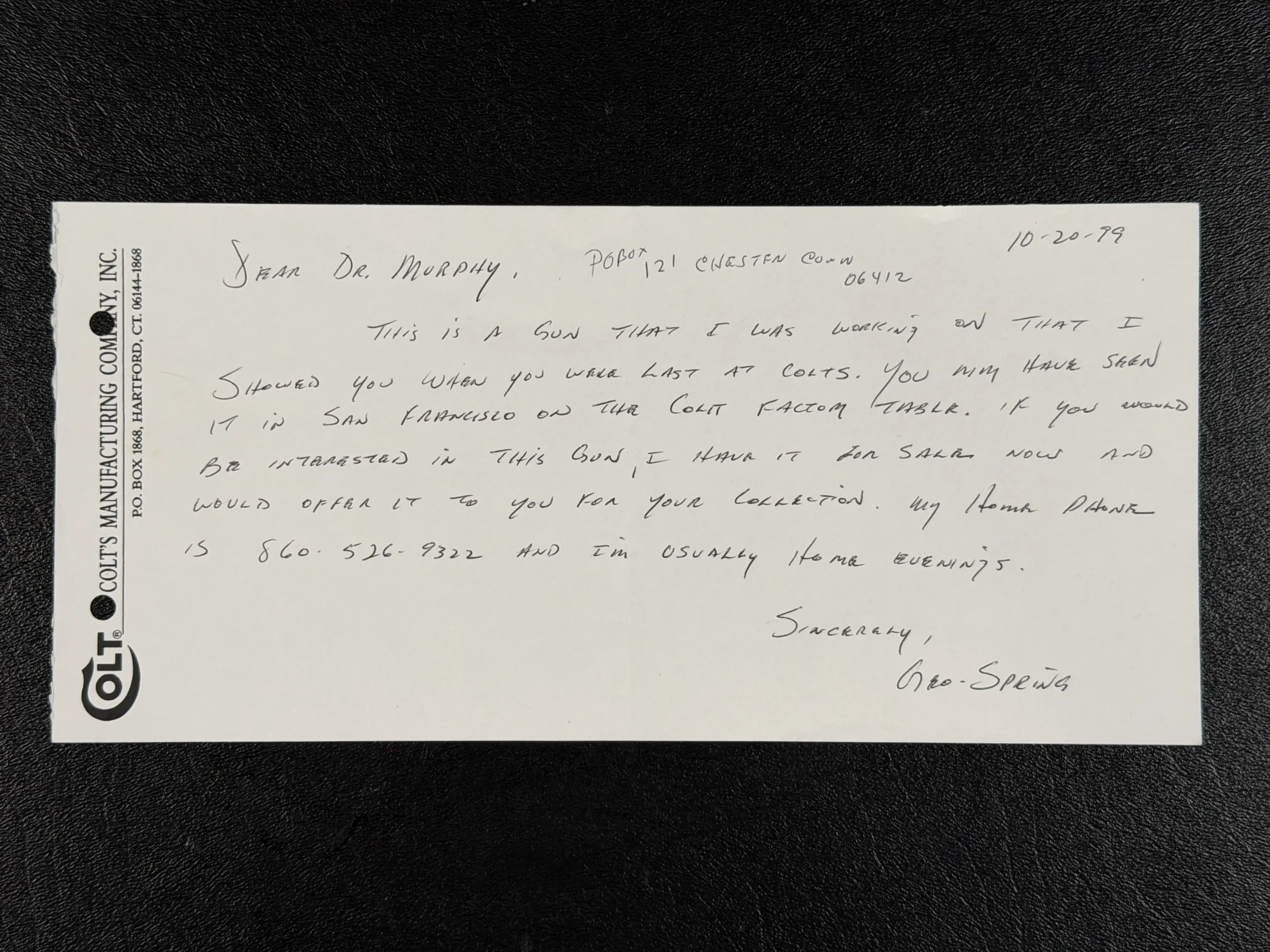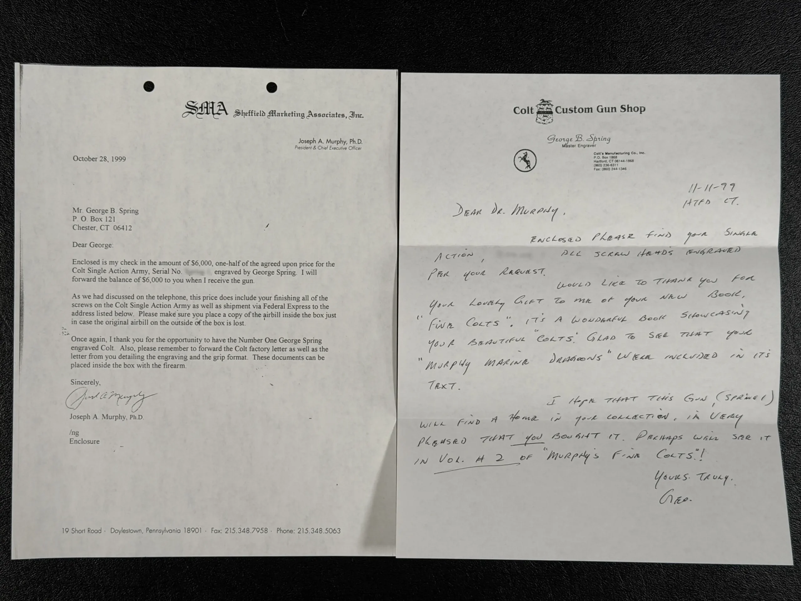 This Colt is accompanied by an extensive group of documents, including a Colt factory letter confirming shipment in the white for engraving, a letter from George B. Spring describing the engraving, finish, and exhibition history, period correspondence between Spring and the original owner, and documentation connecting the revolver to display at the 1999 Colt Collectors Association Show.