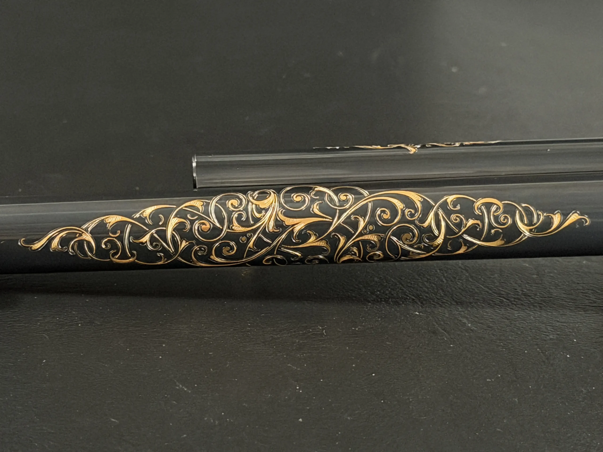 Nearly every visible surface is covered with 24-karat gold inlaid scrollwork, executed with strong depth and flowing movement. The barrel top flat carries a gold scroll treatment, while the cylinder is richly embellished with sweeping gold inlay across each flute. The frame, backstrap, trigger guard, and hammer are engraved and accented in gold, with detailed background work that contrasts beautifully against the polished blue finish.