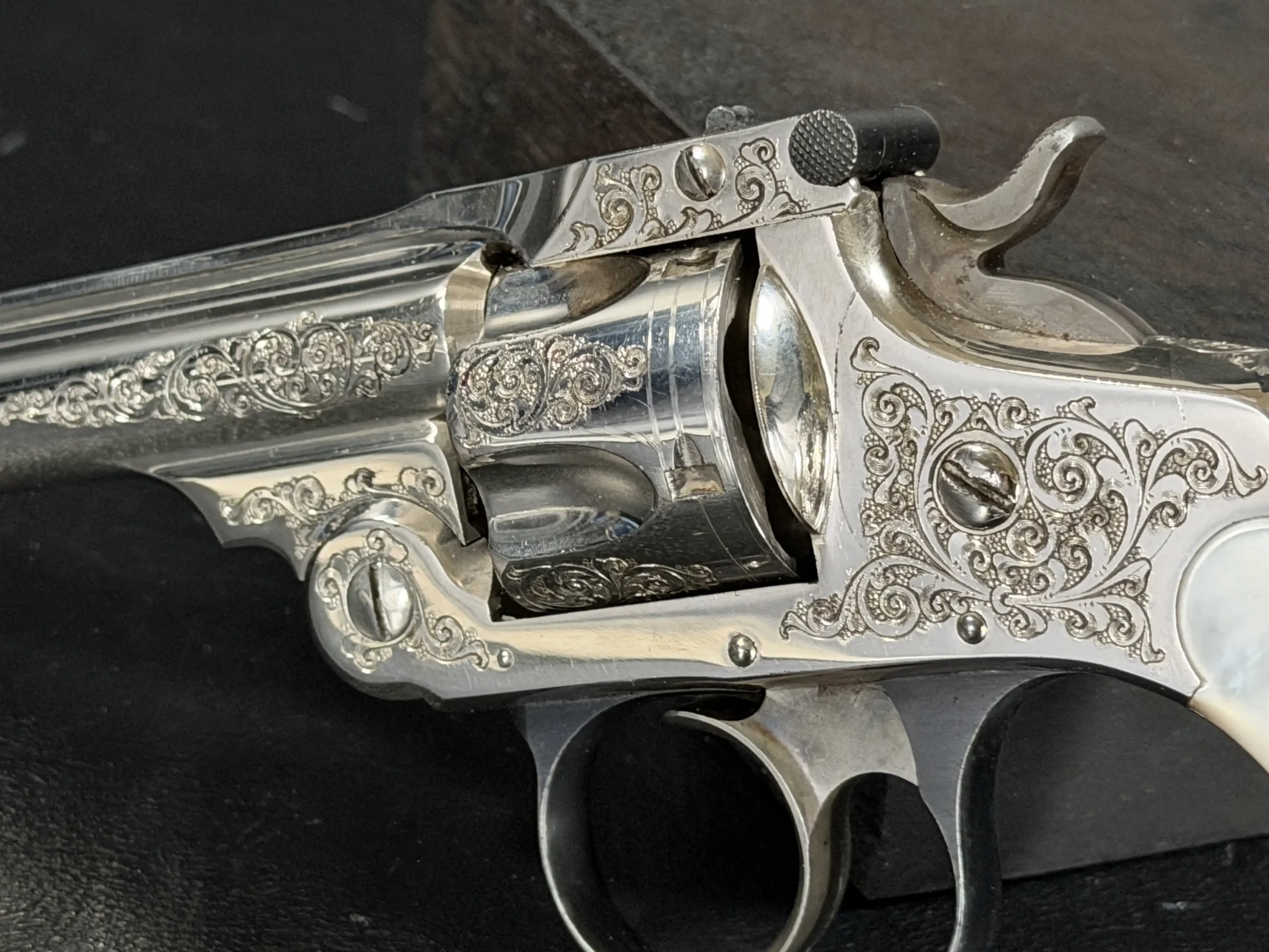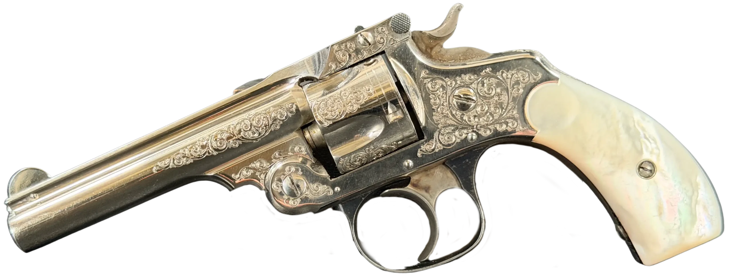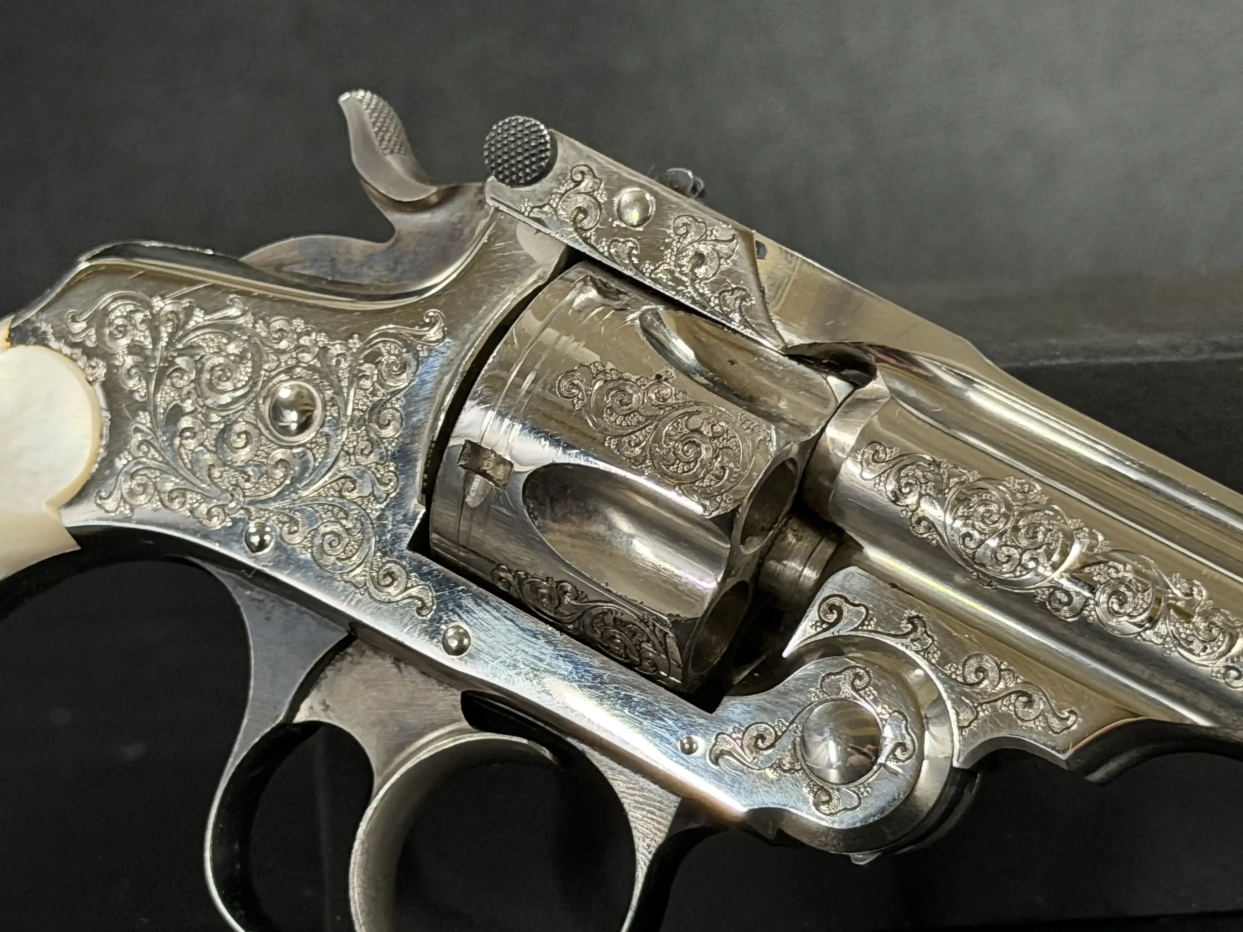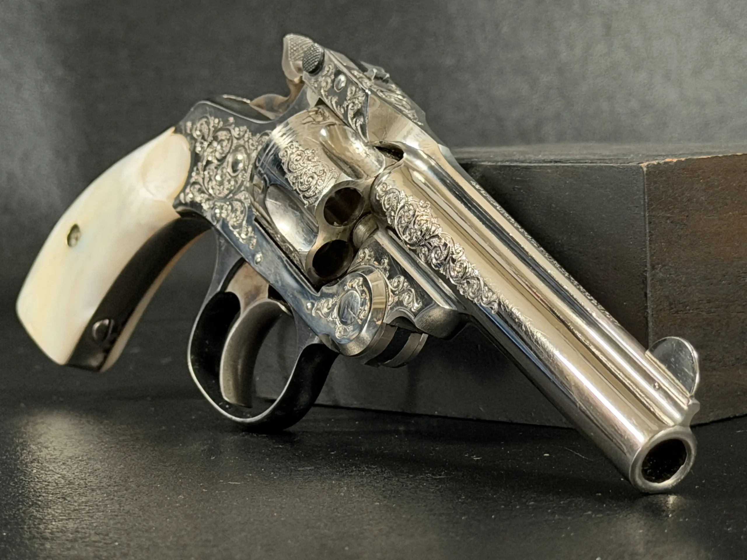 A factory-engraved Smith & Wesson .32 Double Action Fourth Model attributed to Gustave Young, this revolver brings together fine late 19th-century detail and classic Smith & Wesson form. The engraving covers the barrel, cylinder, and frame with flowing scrollwork that complements the contours of the revolver without overpowering them.