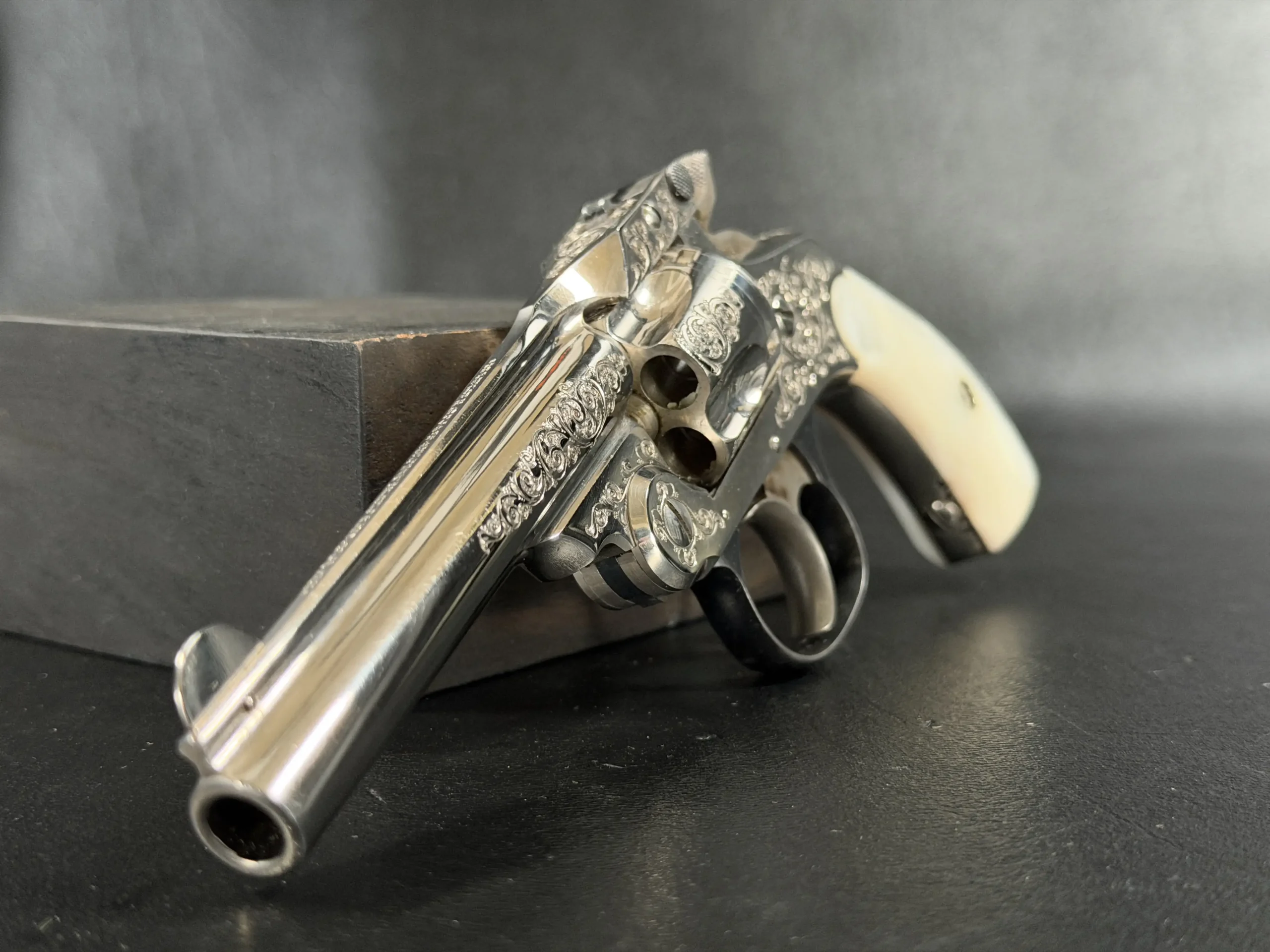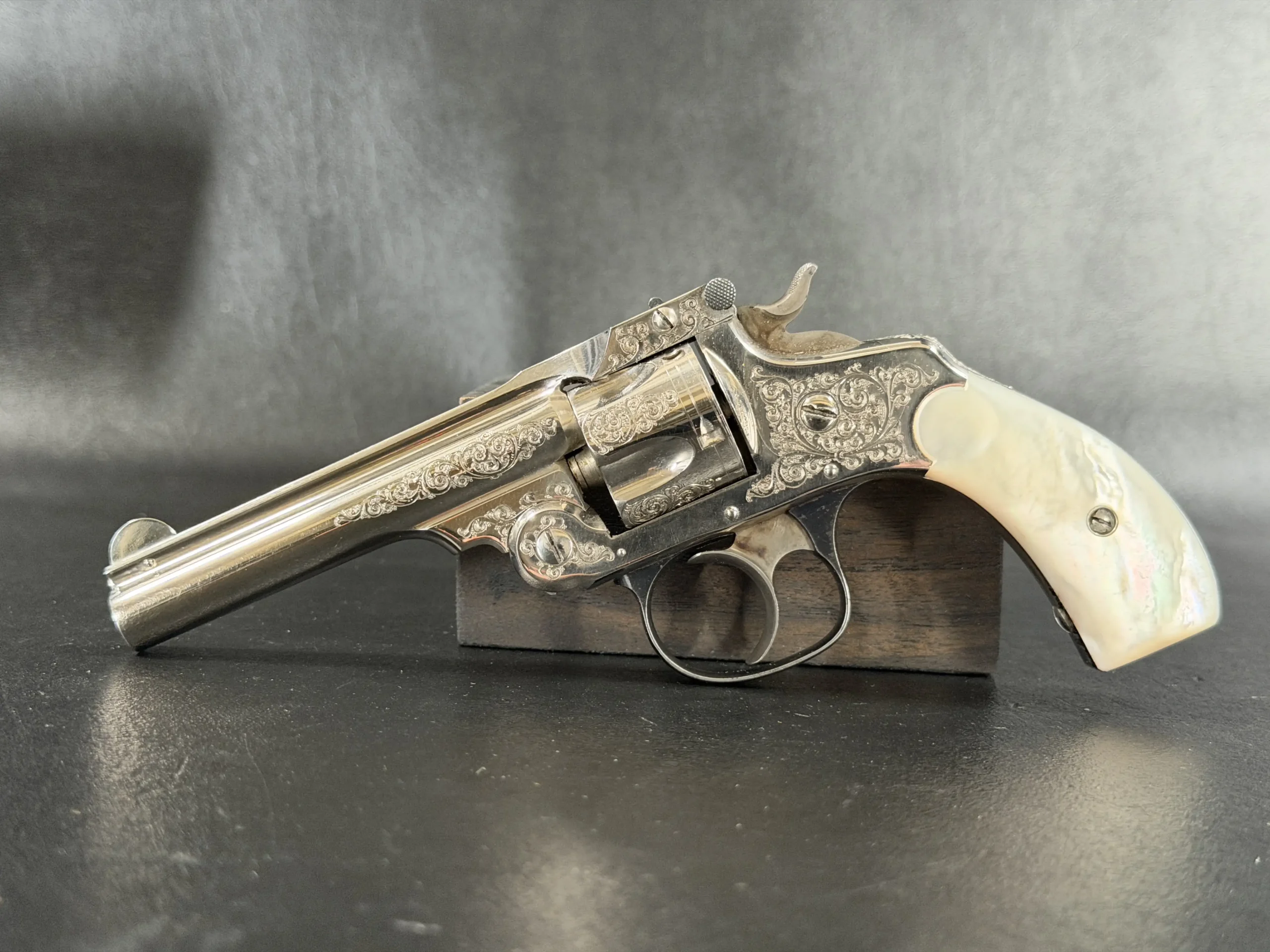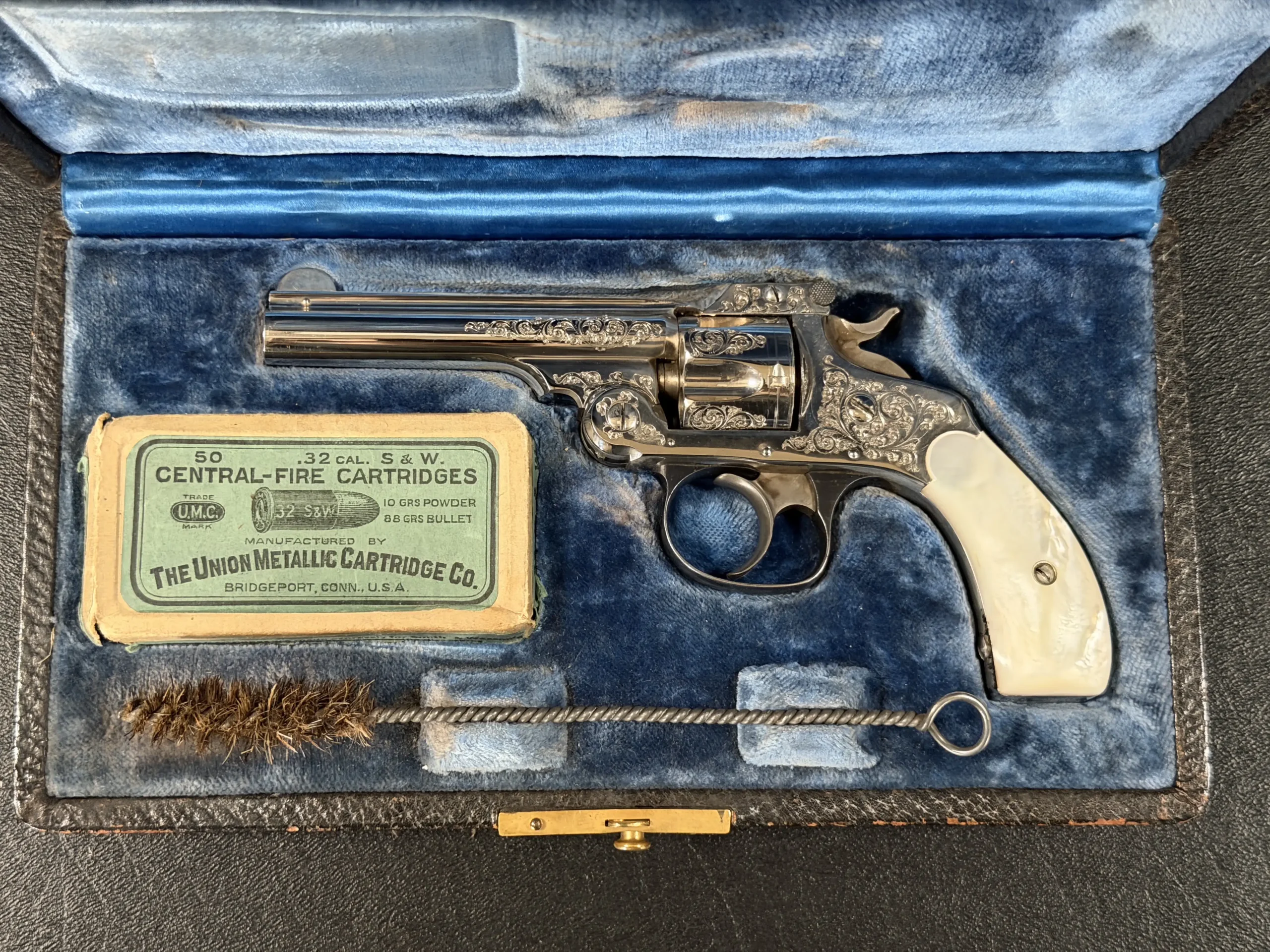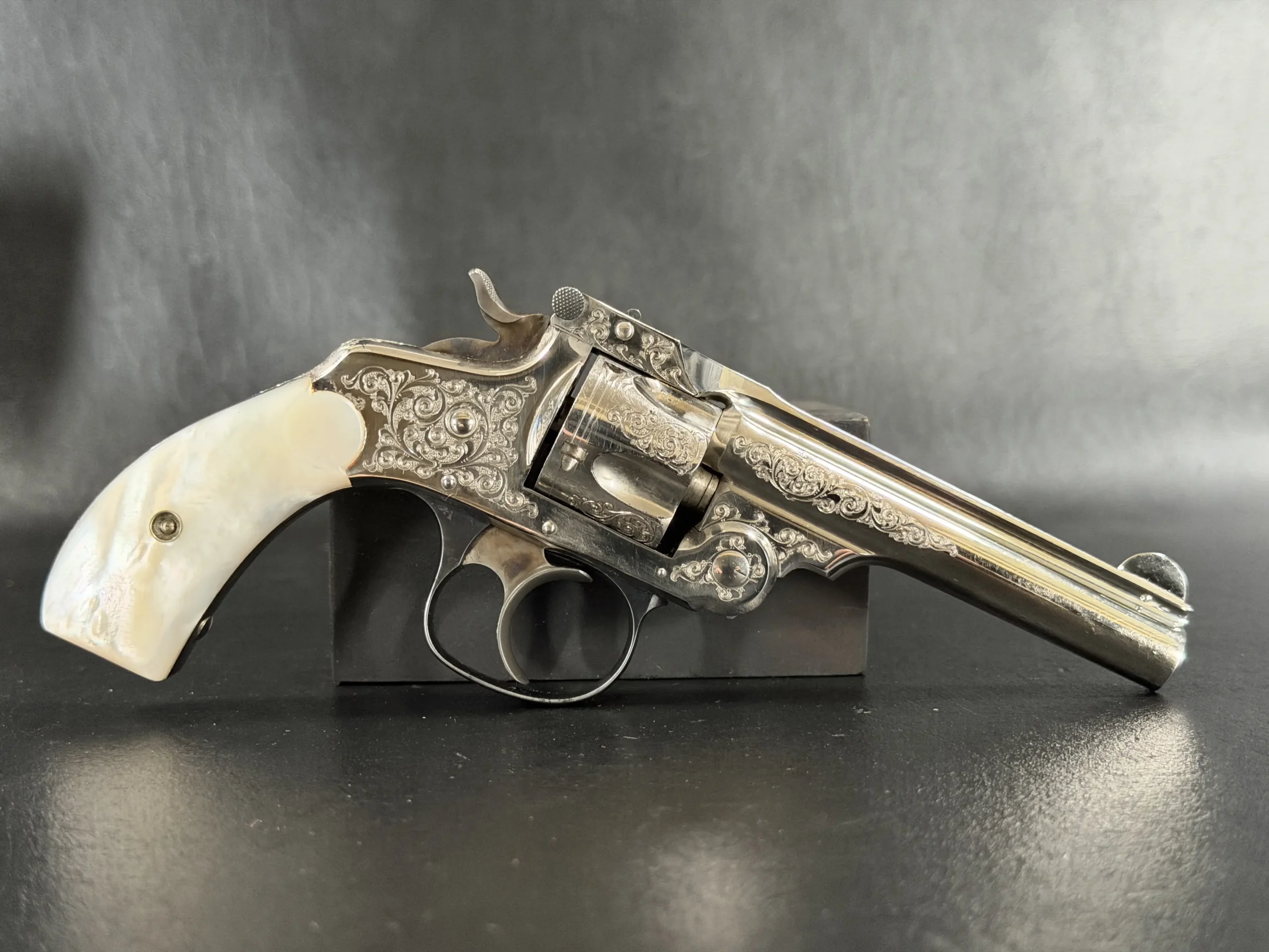 A factory-engraved Smith & Wesson .32 Double Action Fourth Model attributed to Gustave Young, this revolver brings together fine late 19th-century detail and classic Smith & Wesson form. The engraving covers the barrel, cylinder, and frame with flowing scrollwork that complements the contours of the revolver without overpowering them.
