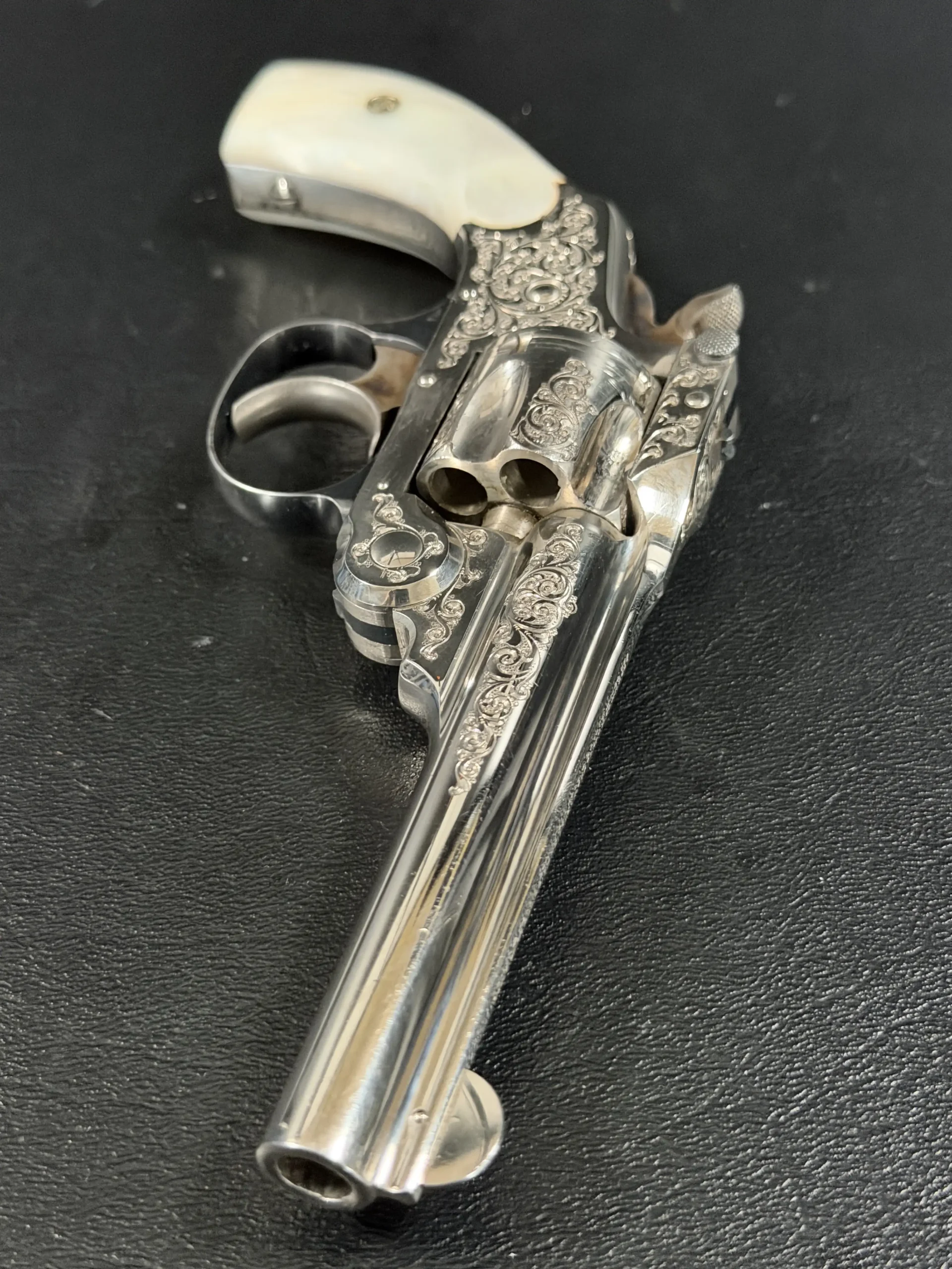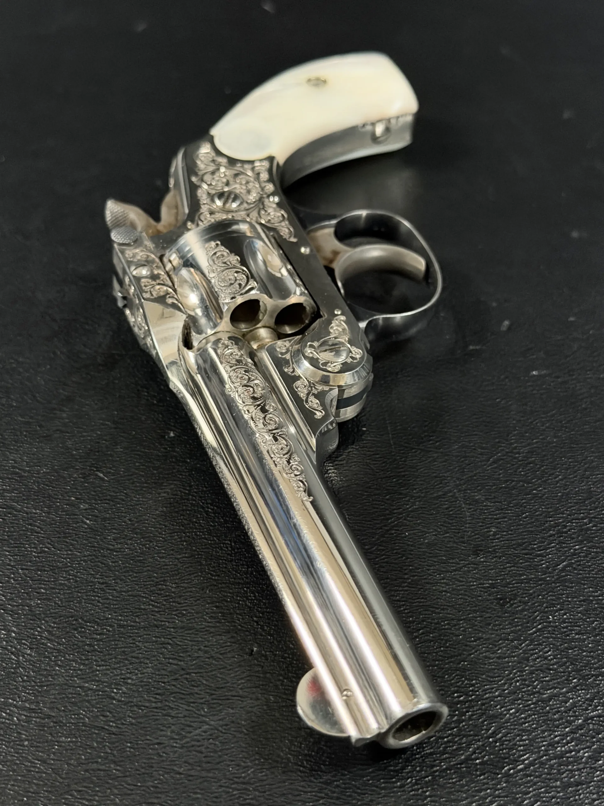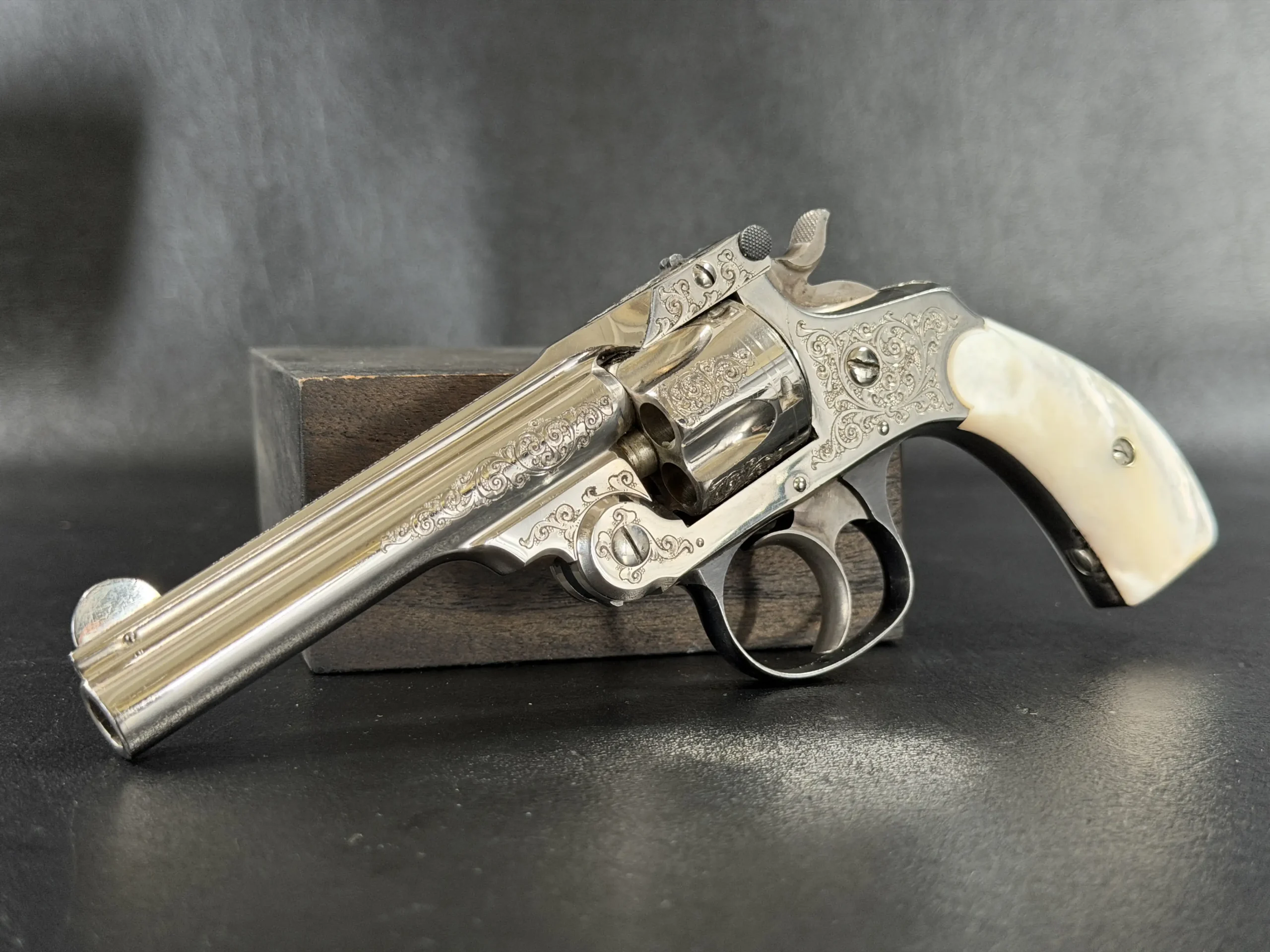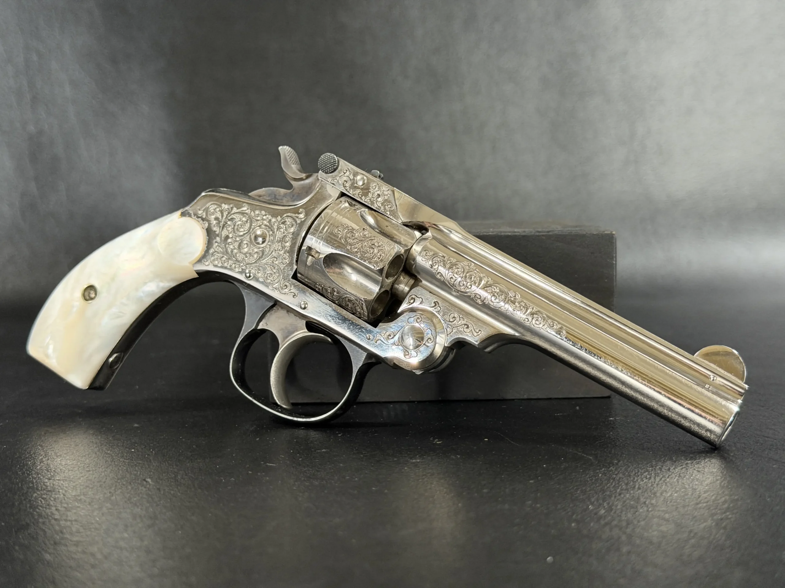 A factory-engraved Smith & Wesson .32 Double Action Fourth Model attributed to Gustave Young, this revolver brings together fine late 19th-century detail and classic Smith & Wesson form. The engraving covers the barrel, cylinder, and frame with flowing scrollwork that complements the contours of the revolver without overpowering them.