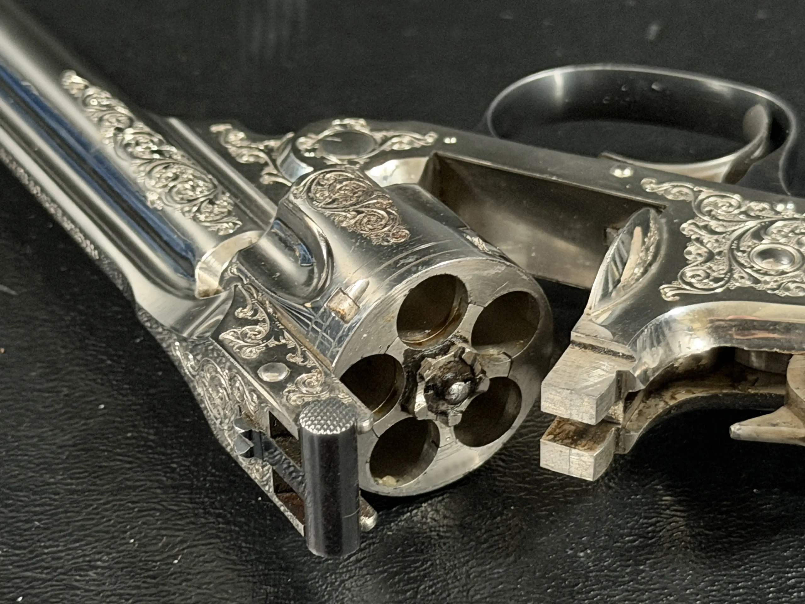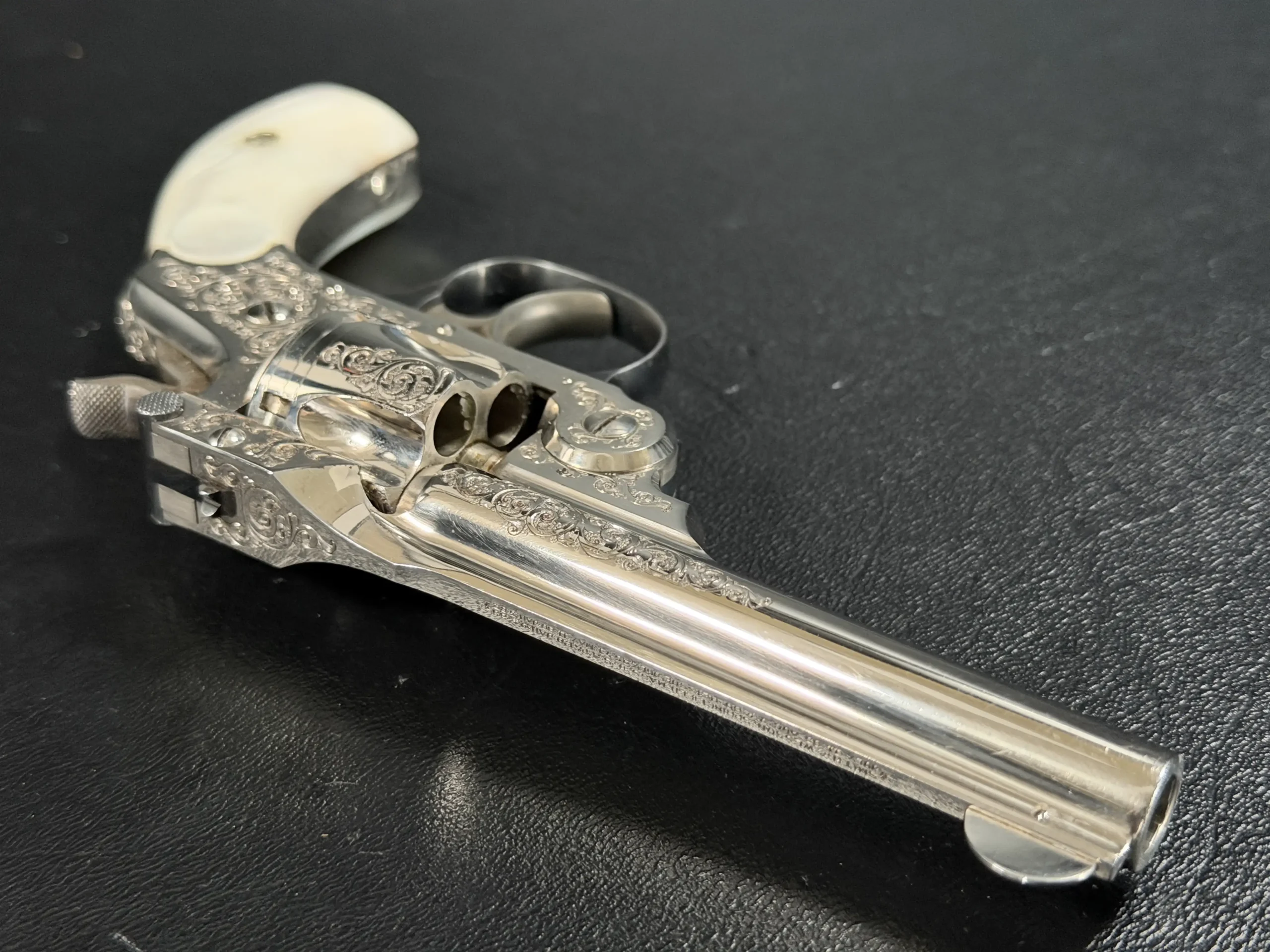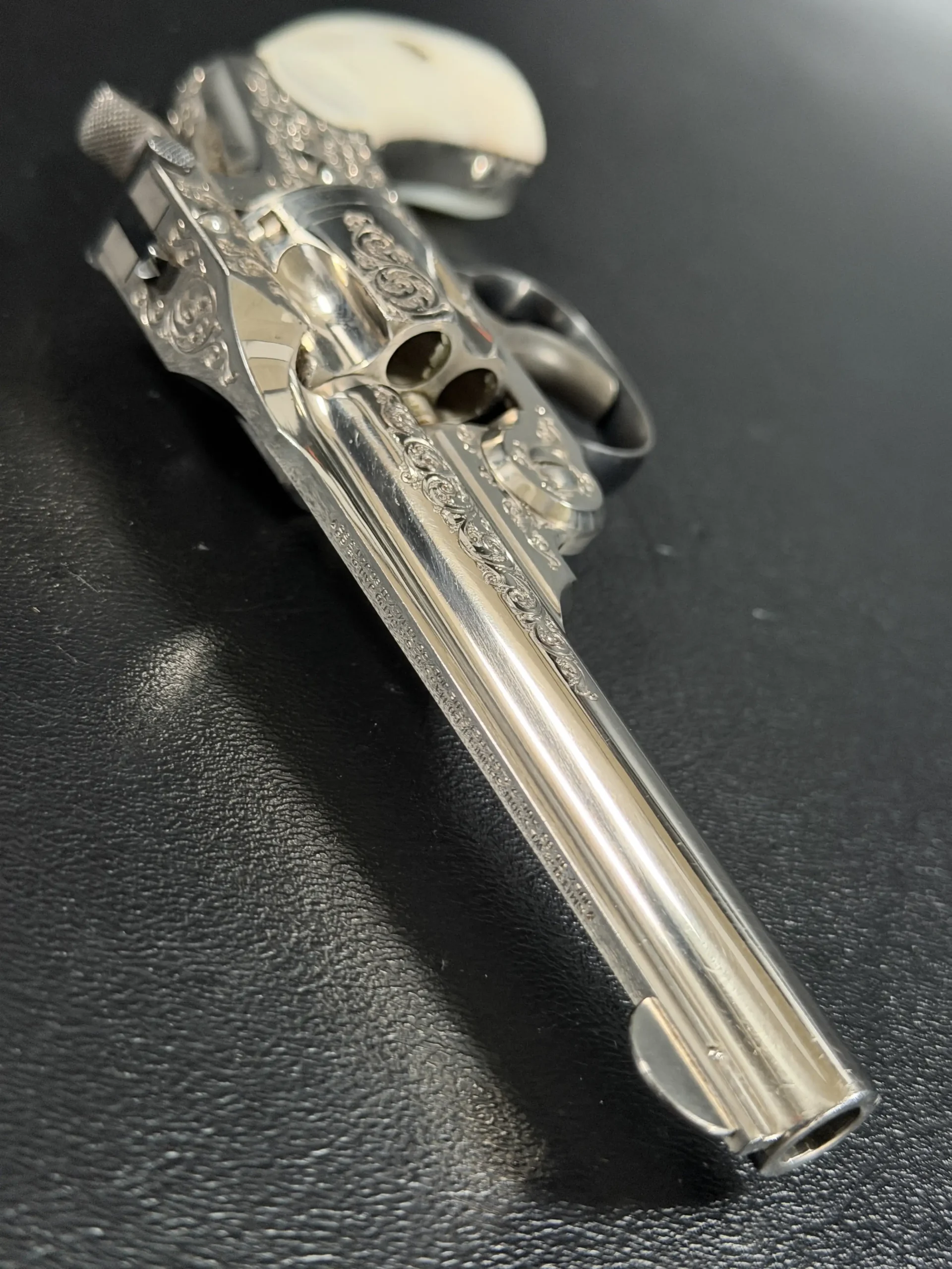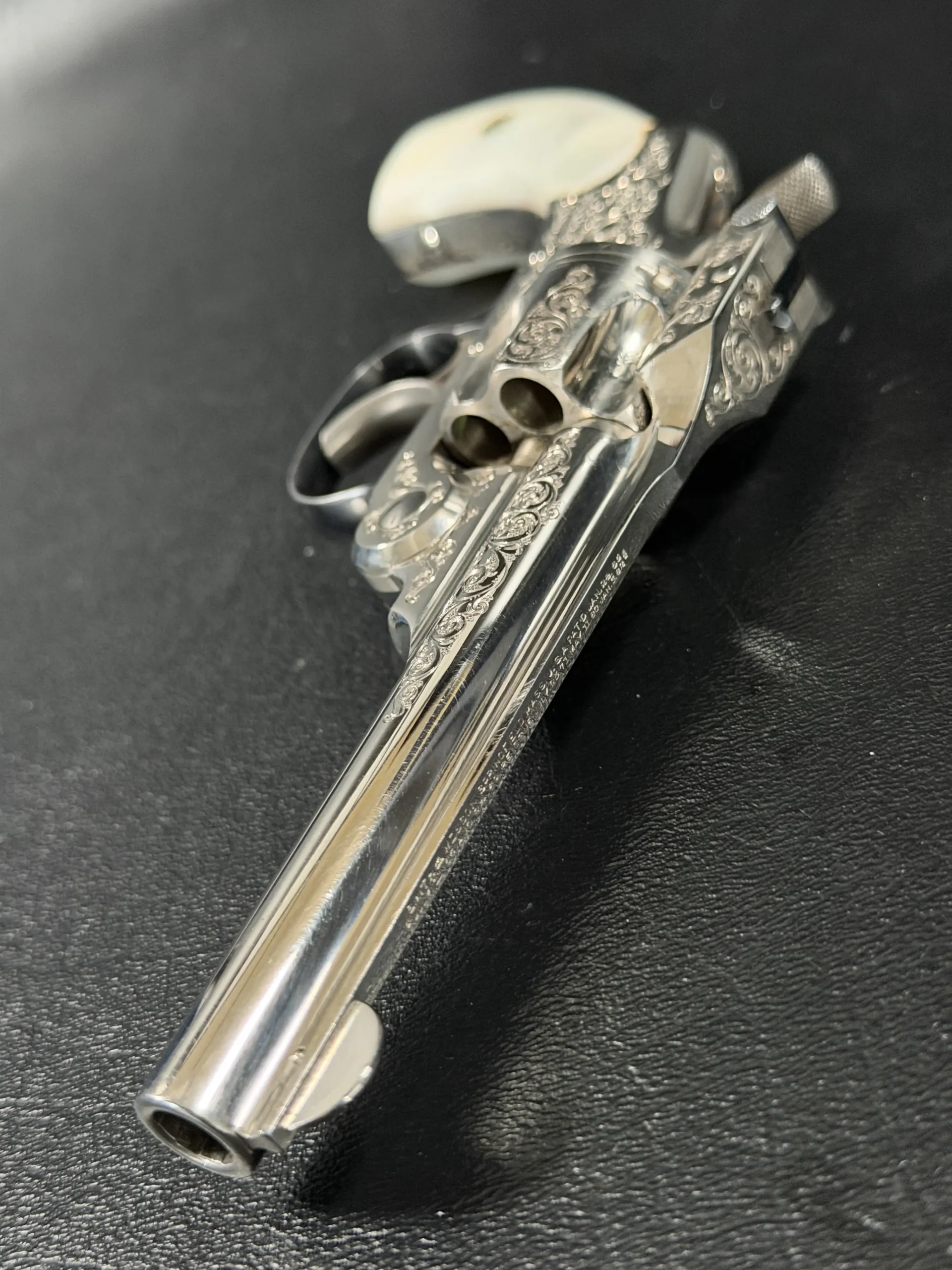 A factory-engraved Smith & Wesson .32 Double Action Fourth Model attributed to Gustave Young, this revolver brings together fine late 19th-century detail and classic Smith & Wesson form. The engraving covers the barrel, cylinder, and frame with flowing scrollwork that complements the contours of the revolver without overpowering them.