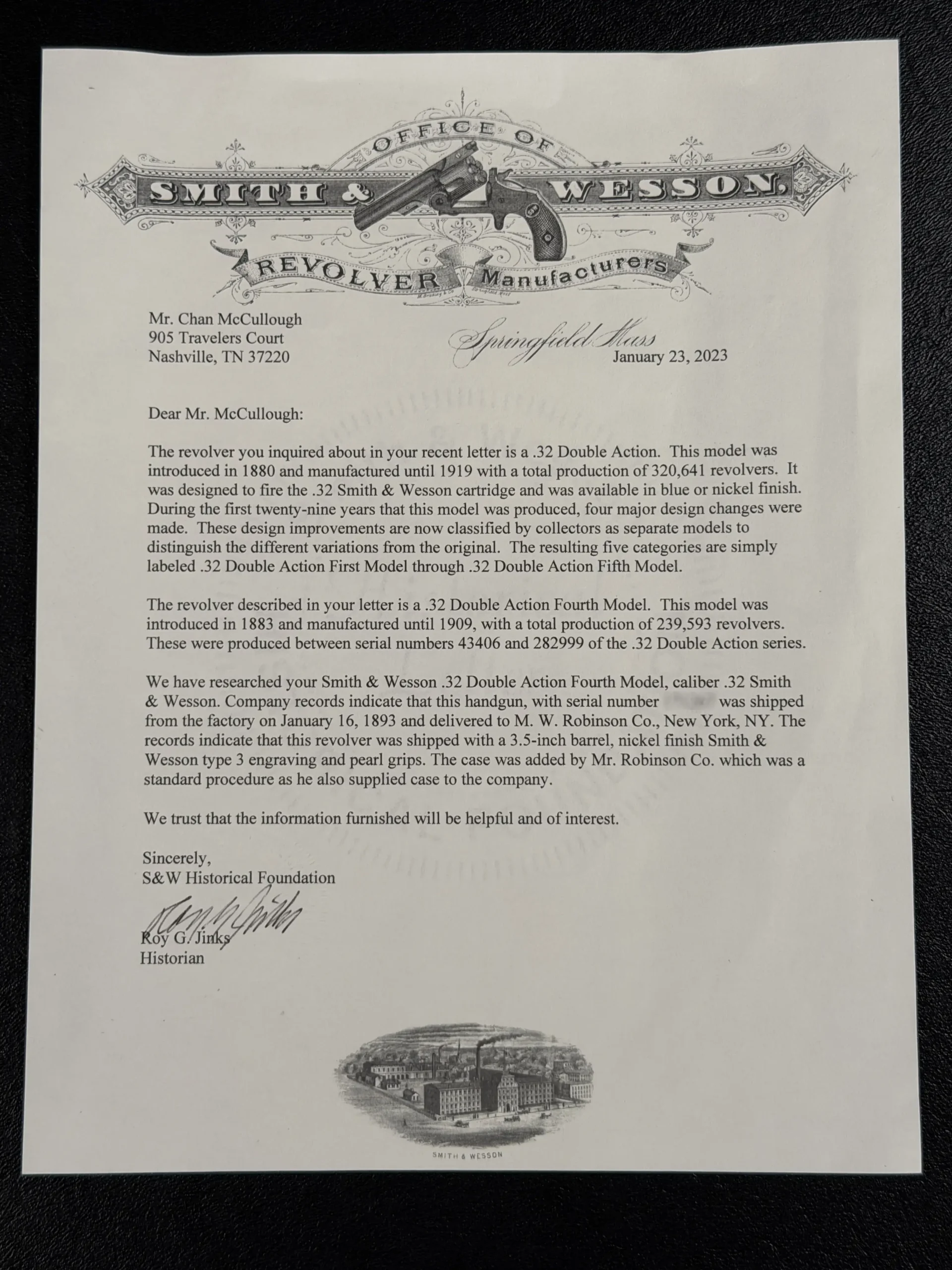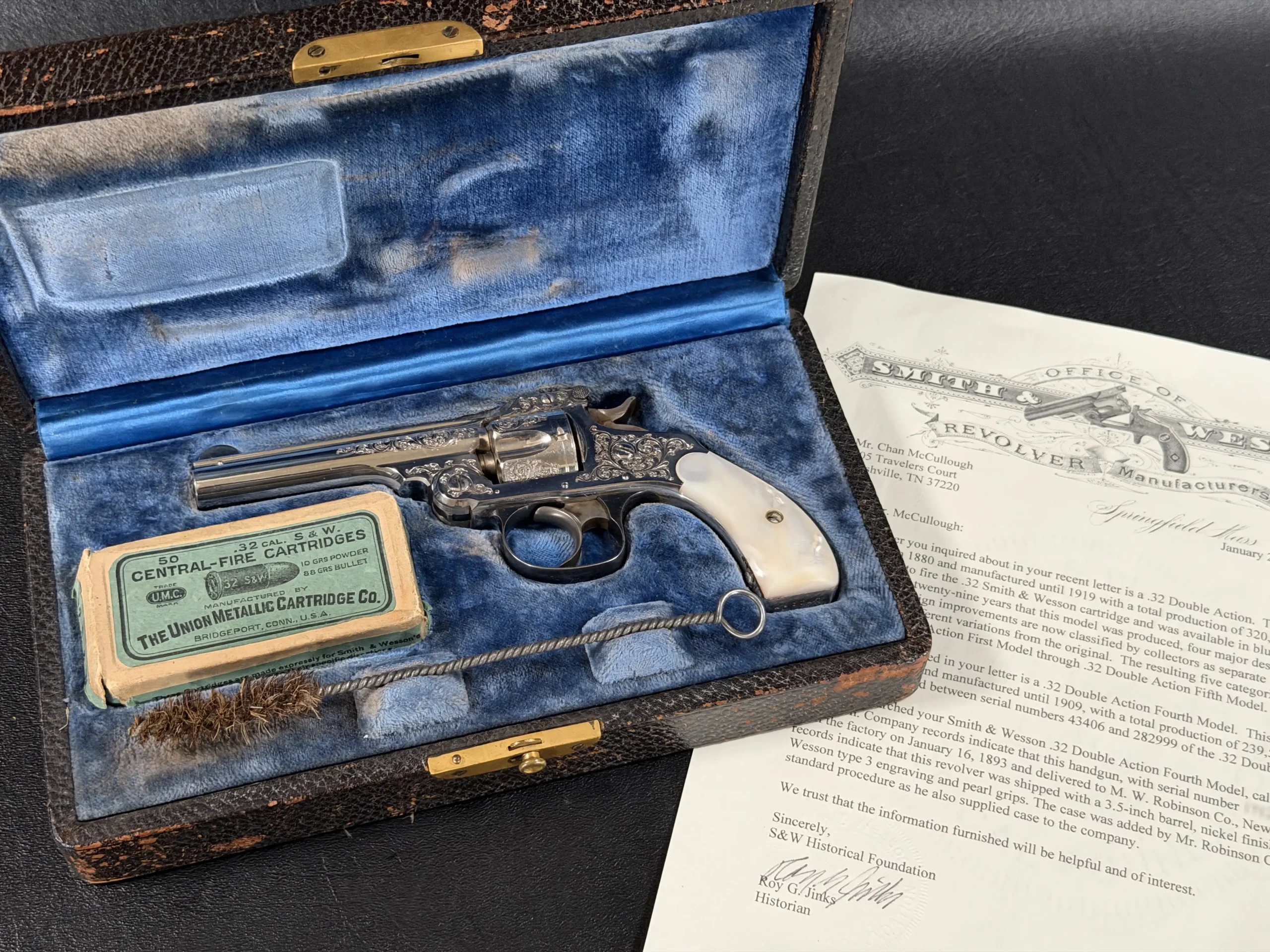 According to the included factory historical letter, this .32 Double Action Fourth Model was shipped in the late 19th century with a 3.5-inch barrel, nickel finish, and factory embellishments to M.W. Robinson Company of New York.