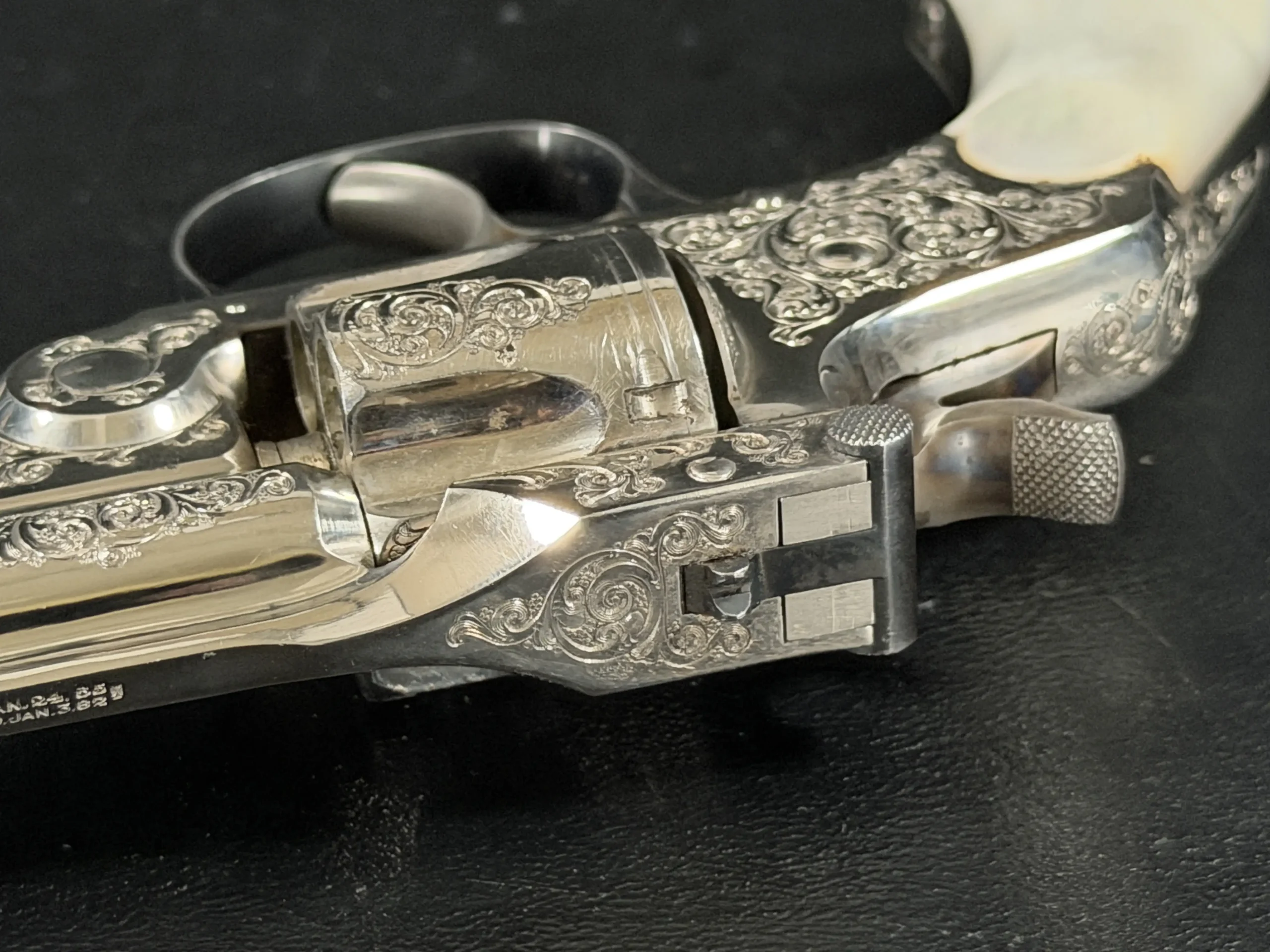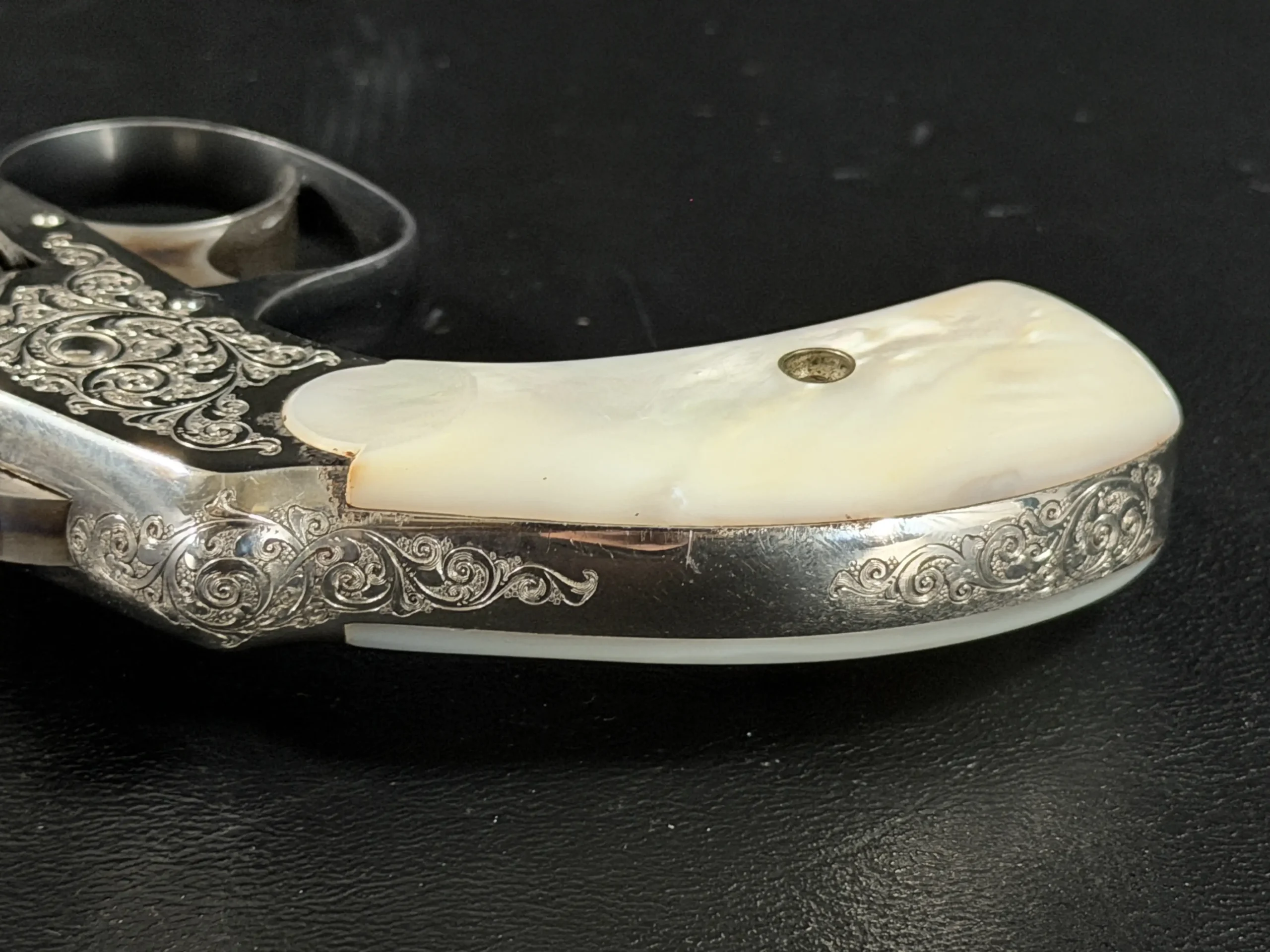 Nickel finish and mother-of-pearl grips create a distinctive contrast, pairing bright metal with the soft luster of pearl. The result is a presentation that feels elegant and deliberate, with decorative details integrated throughout the design.