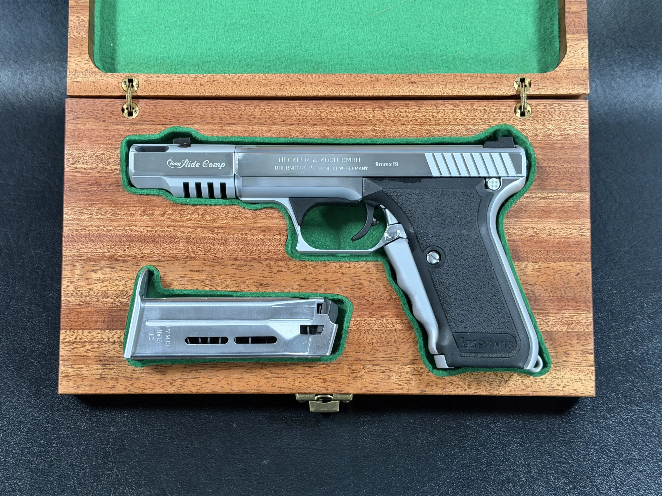 A custom Heckler & Koch P7 M13 in a Nickel Long Slide configuration with compensator, chambered in 9mm. Finished with a matching magazine and fitted presentation case, it pairs the P7’s signature squeeze-cocking design and double-stack format with a striking custom profile.