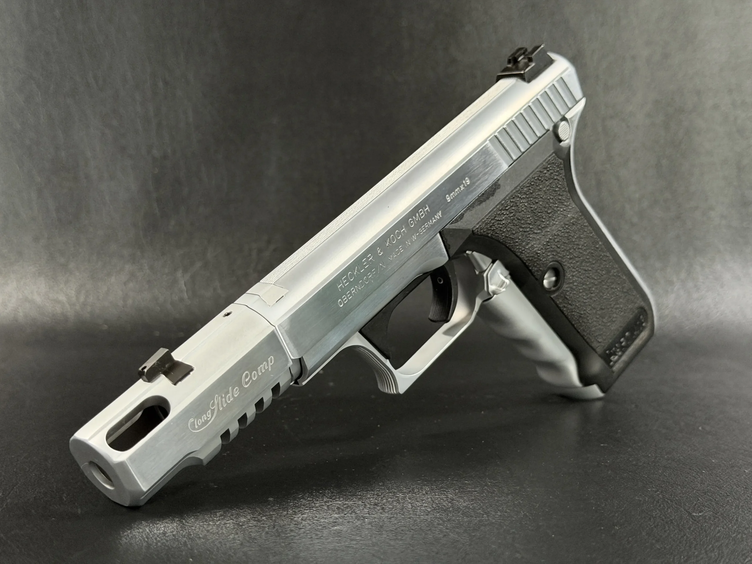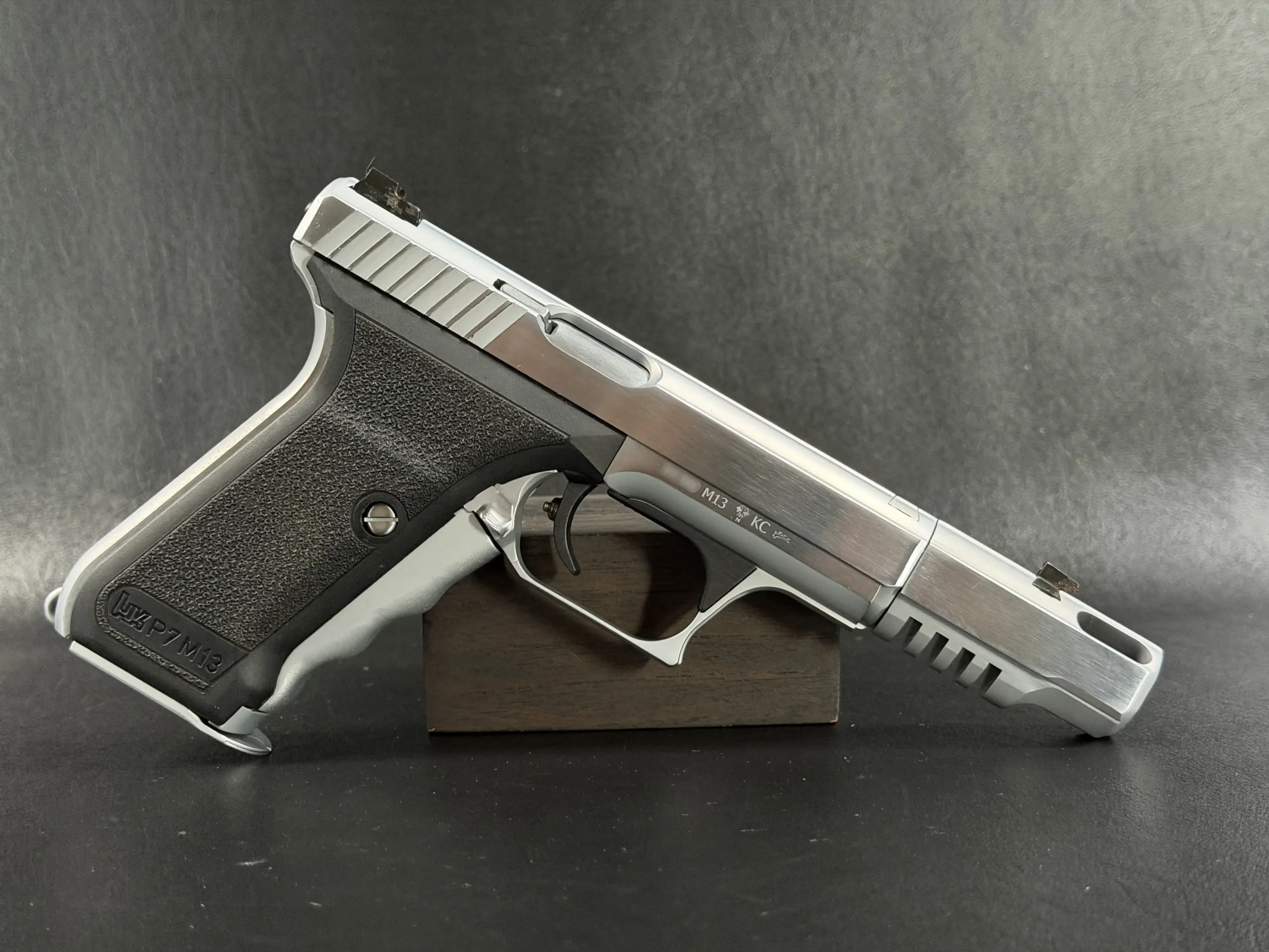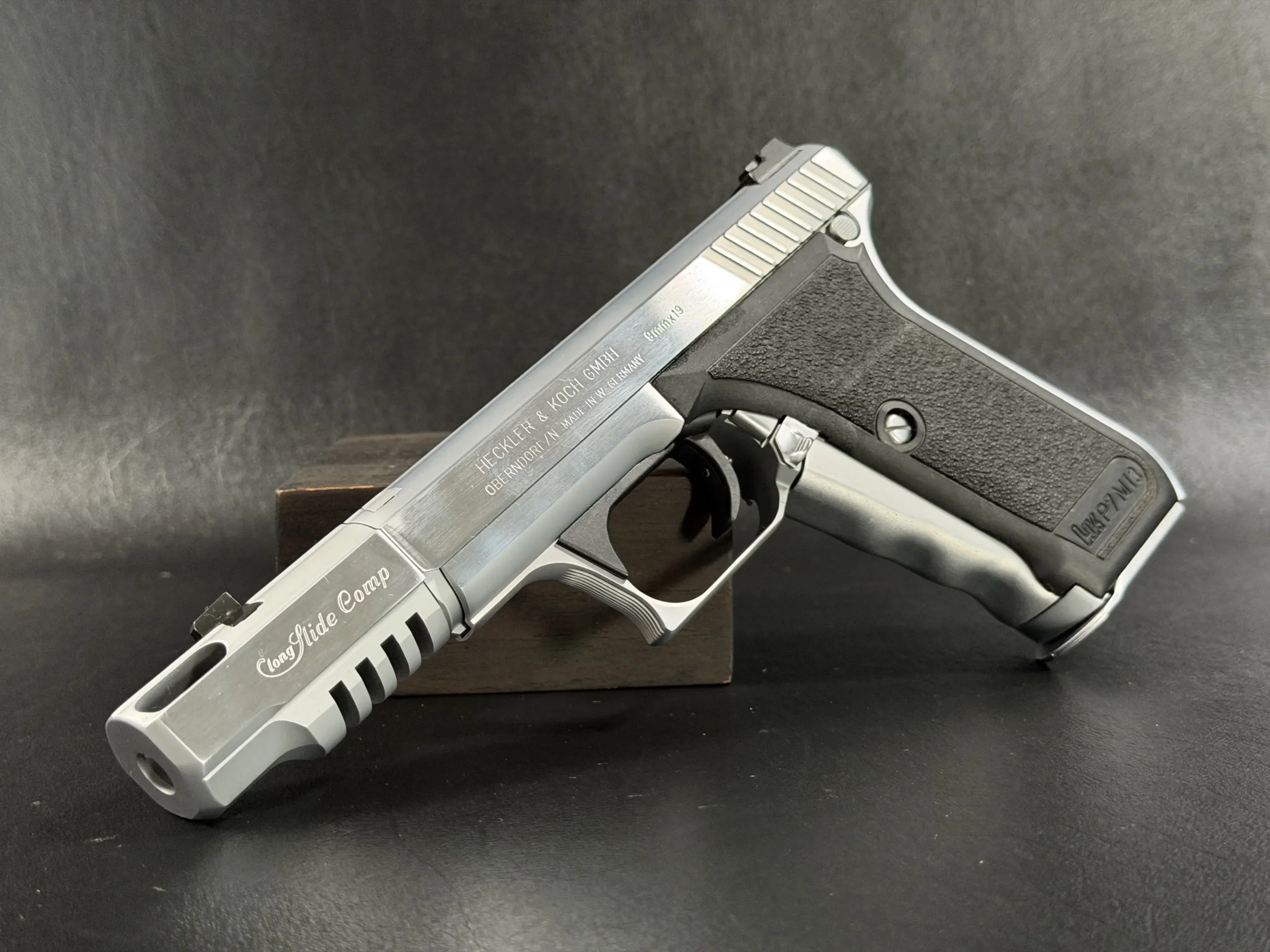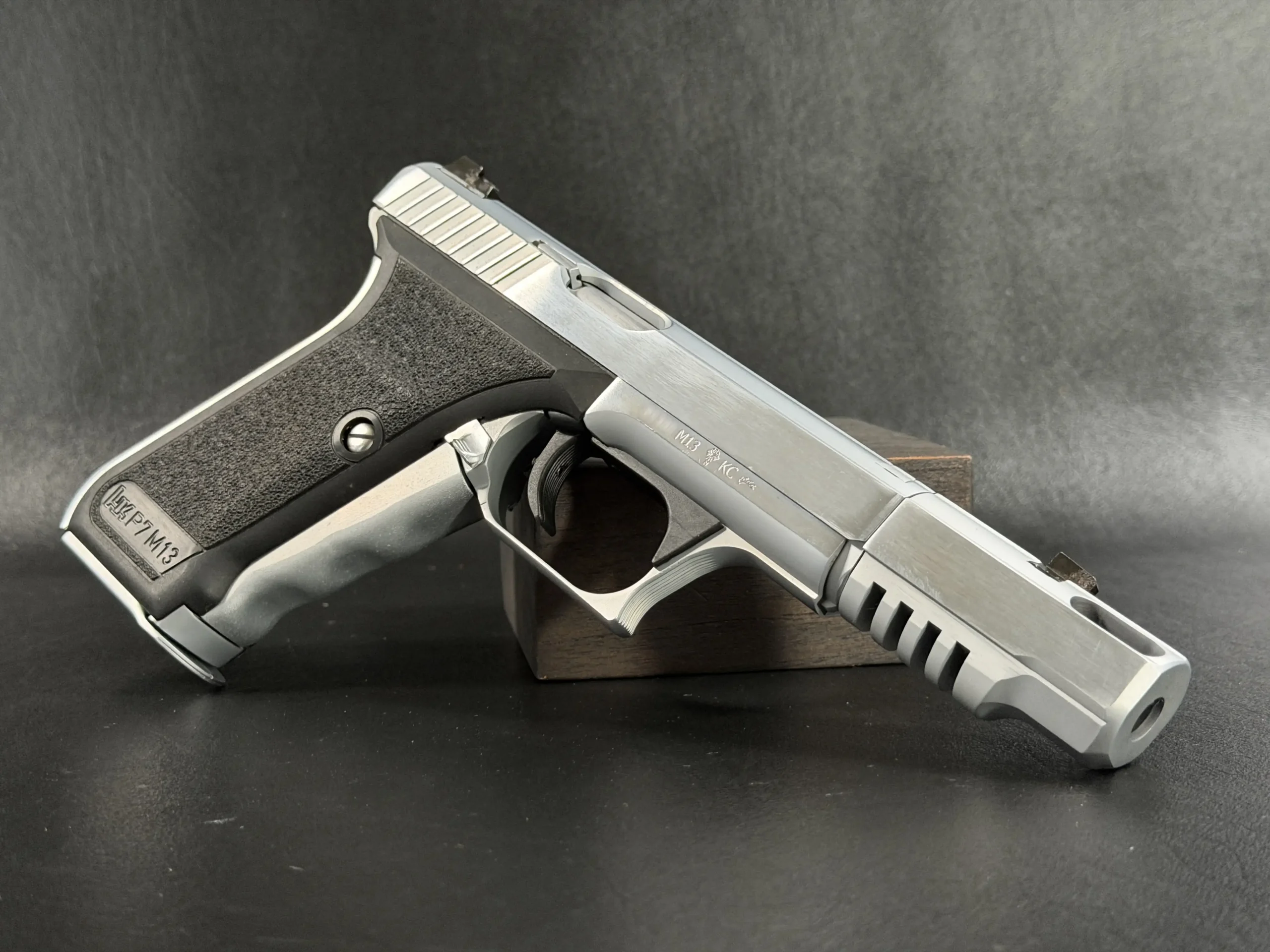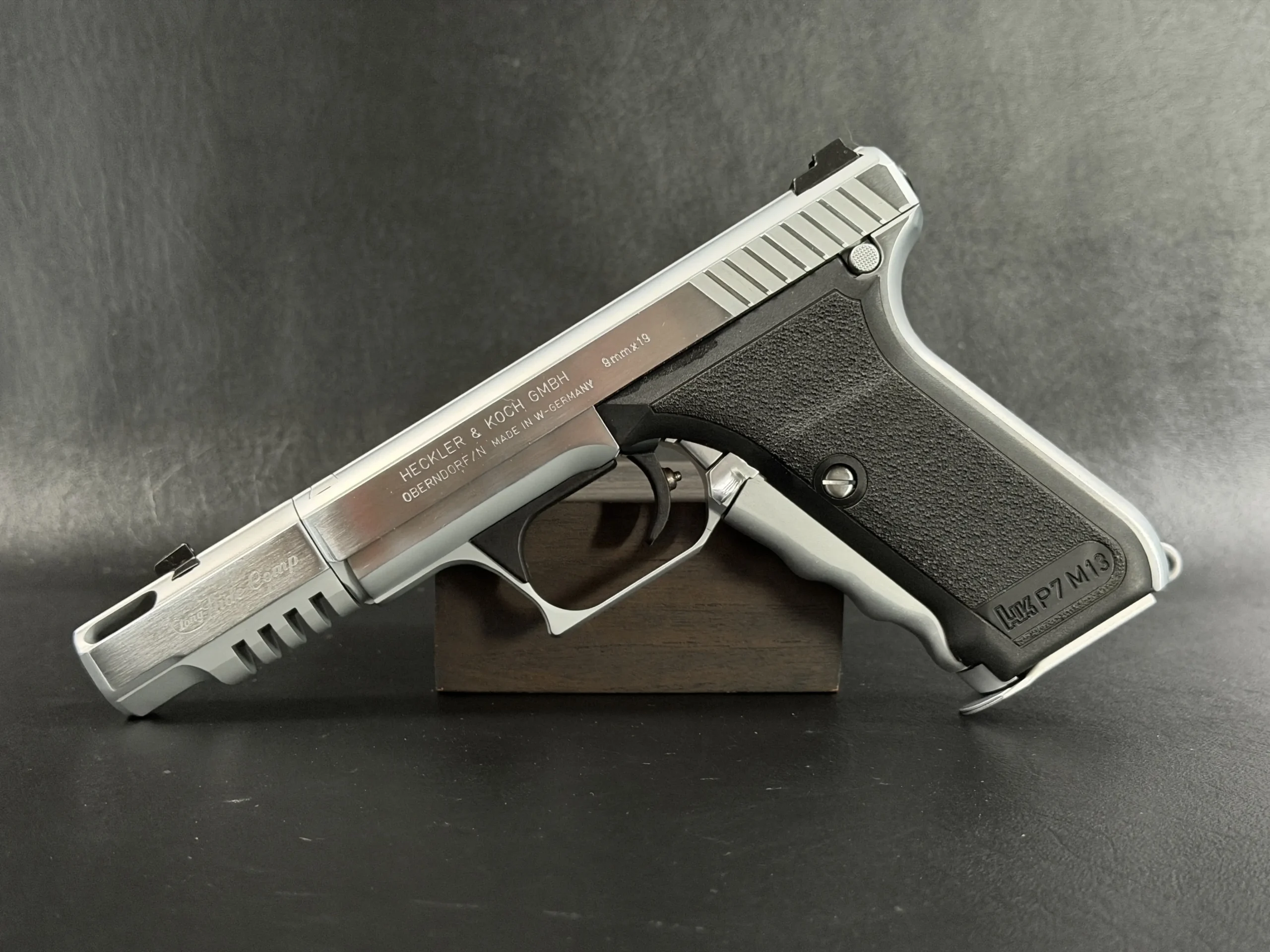 The Heckler & Koch P7 M13 is presented here in a custom Nickel Long Slide configuration with a compensator, giving this distinctive pistol a bold, cohesive profile. The nickel-tone finish across the slide assembly and compensator highlights the P7’s recognizable lines while adding a bright, polished visual contrast to the frame.