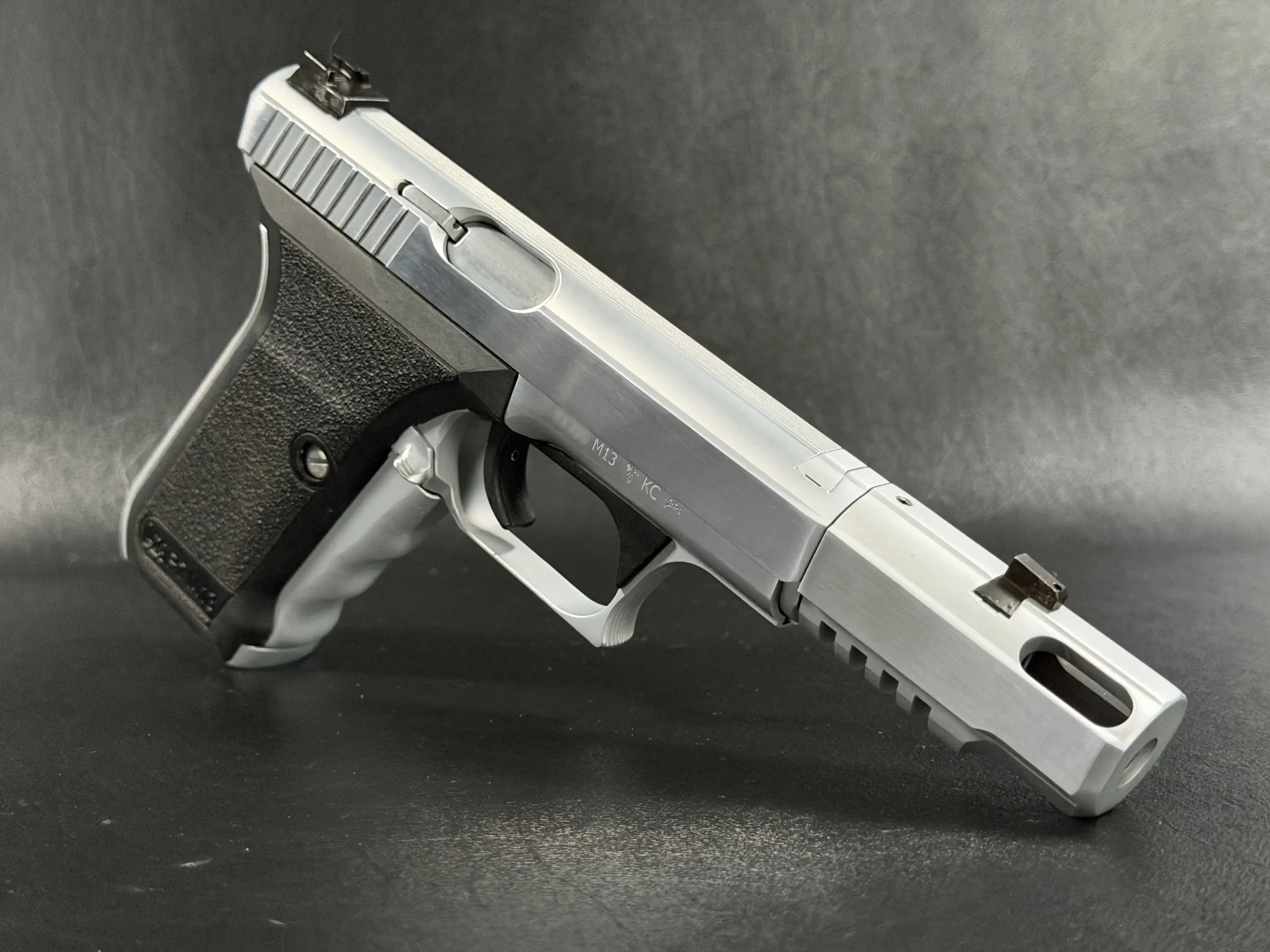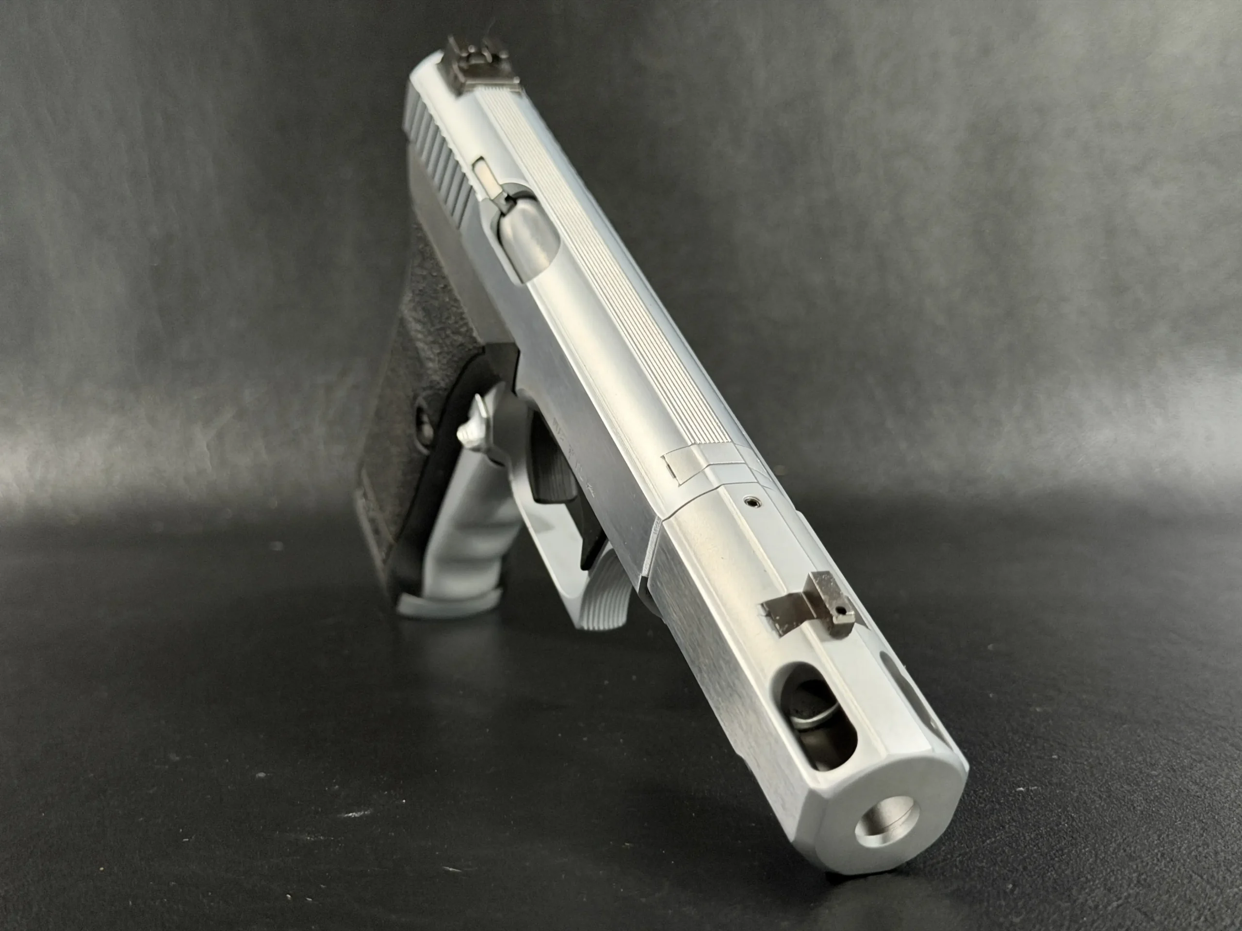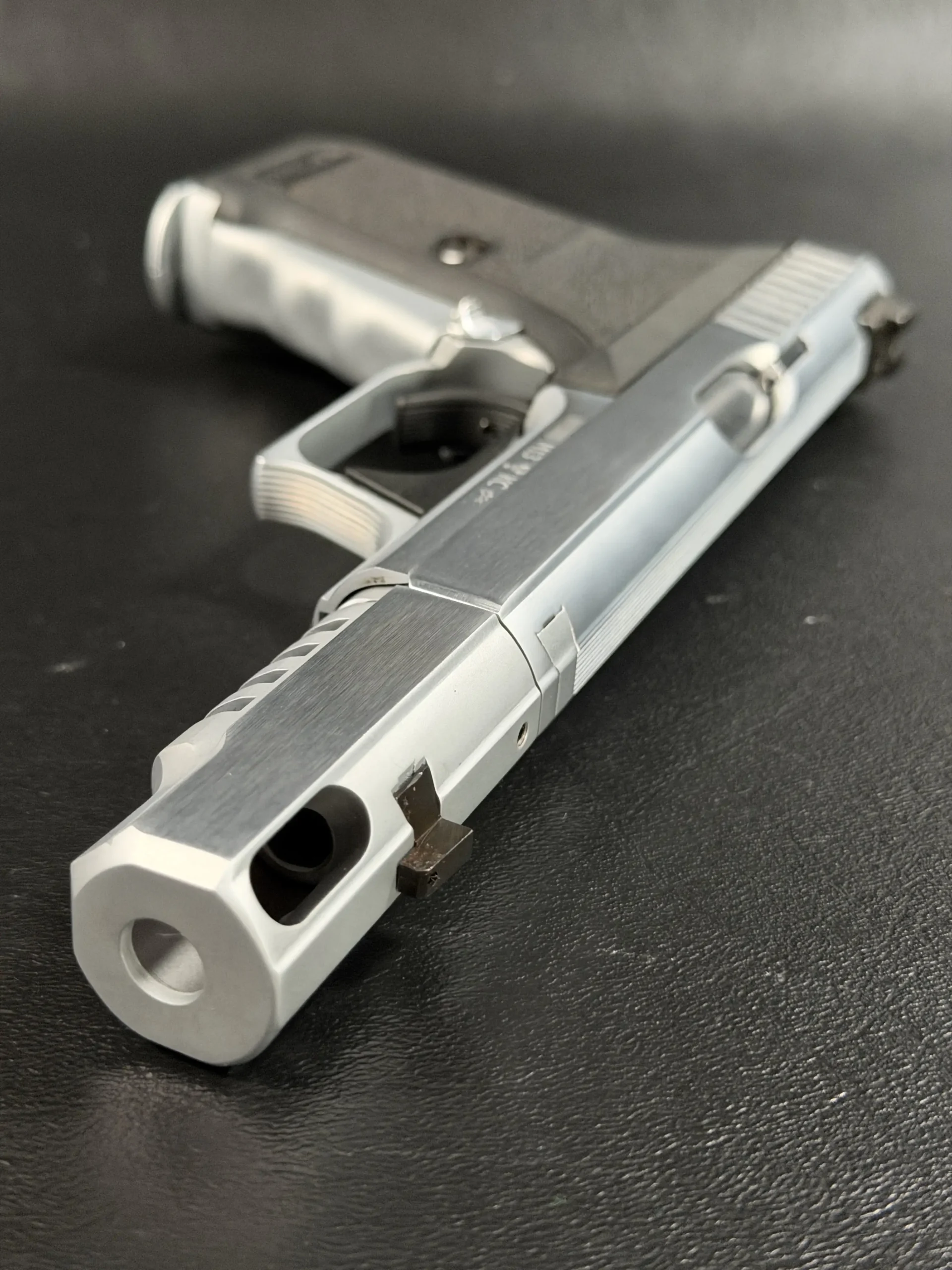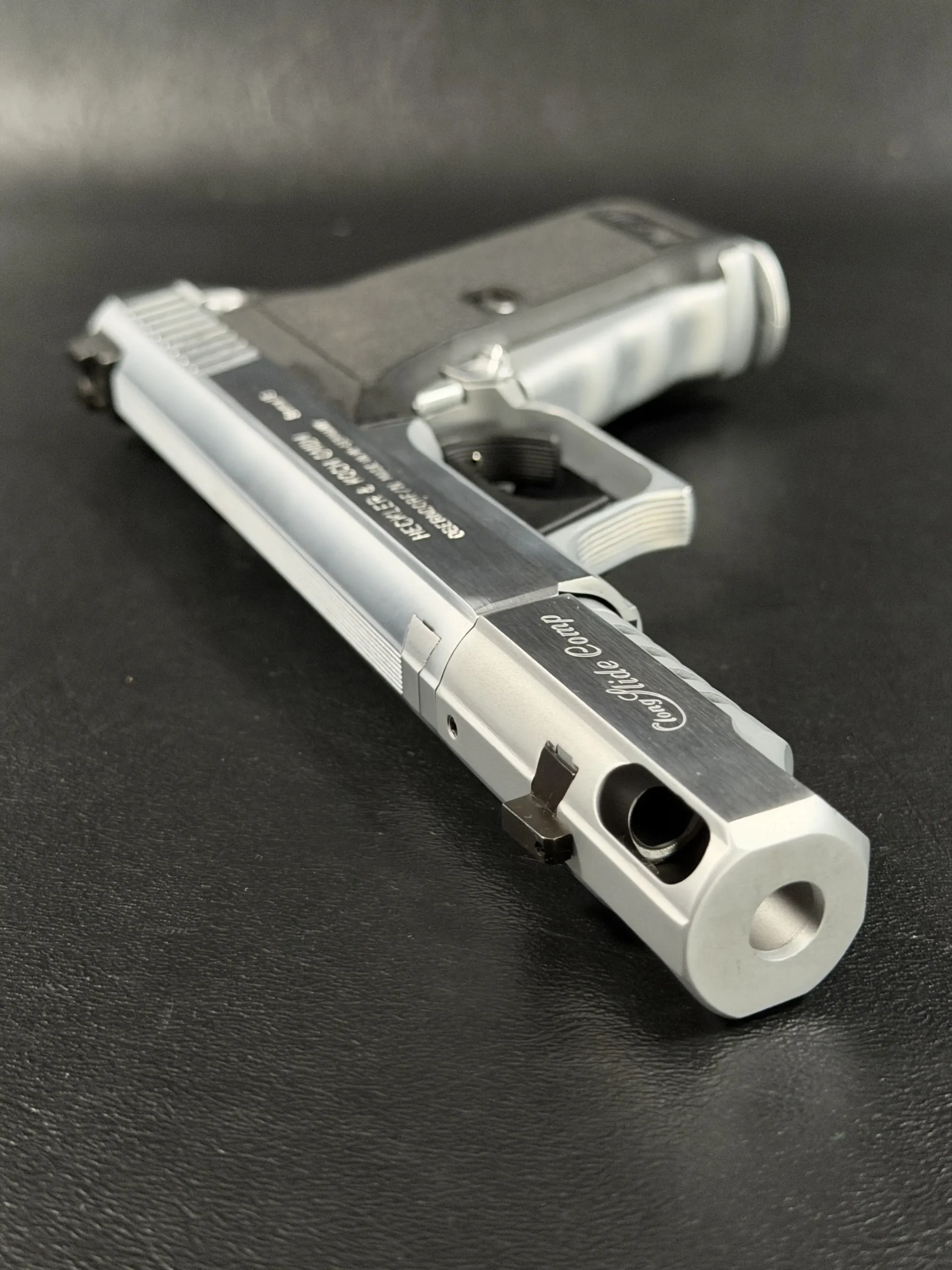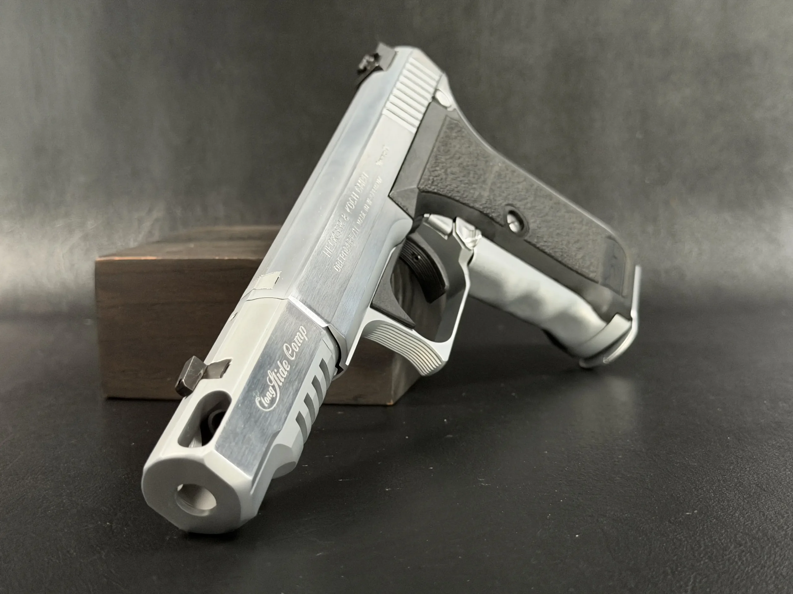 The Heckler & Koch P7 M13 is presented here in a custom Nickel Long Slide configuration with a compensator, giving this distinctive pistol a bold, cohesive profile. The nickel-tone finish across the slide assembly and compensator highlights the P7’s recognizable lines while adding a bright, polished visual contrast to the frame.