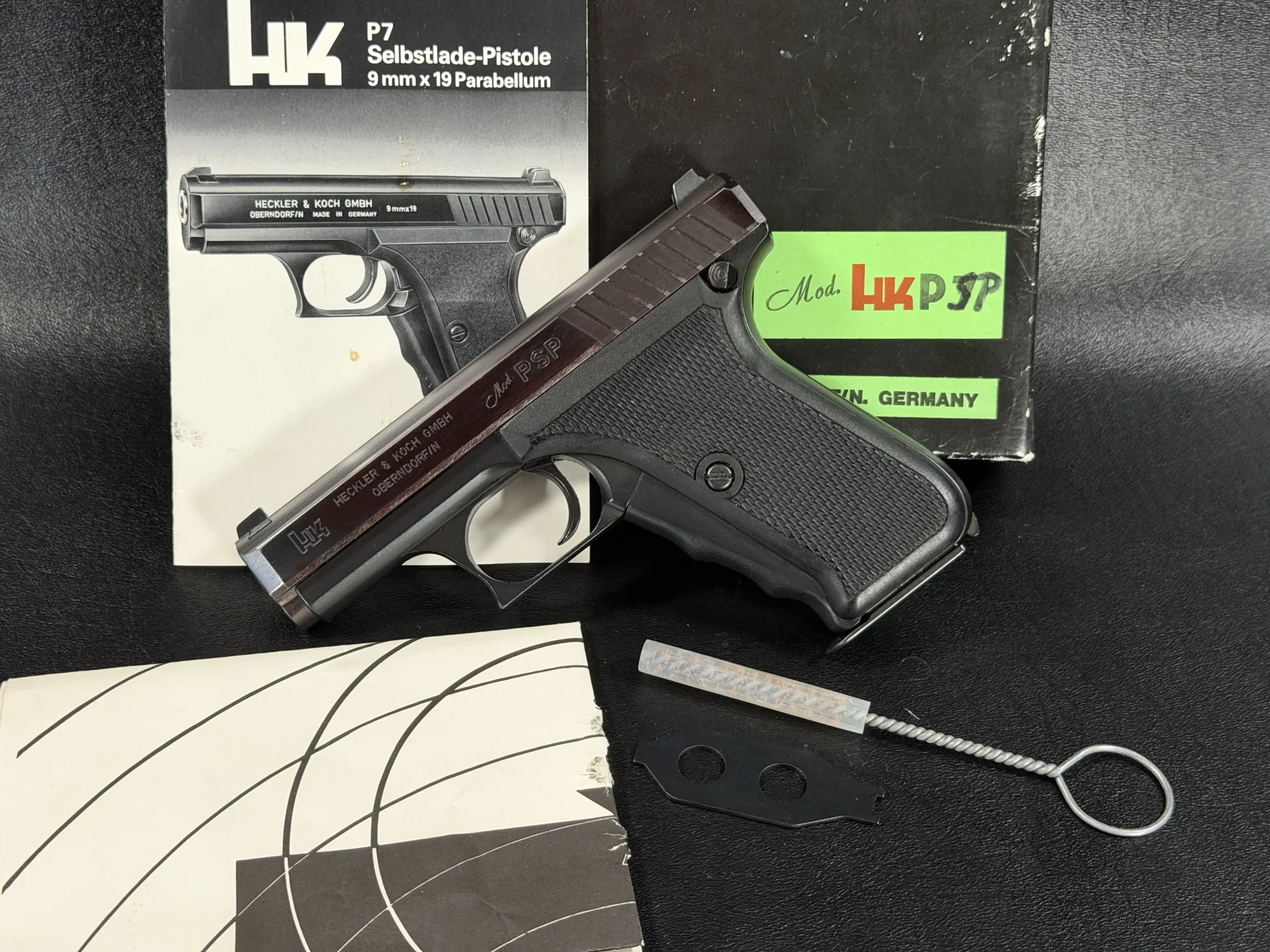 An early Heckler & Koch P7 PSP Prototype chambered in 9×19mm Parabellum, representing the original PSP configuration before later P7 variants. Includes the factory box, documentation, and original target.