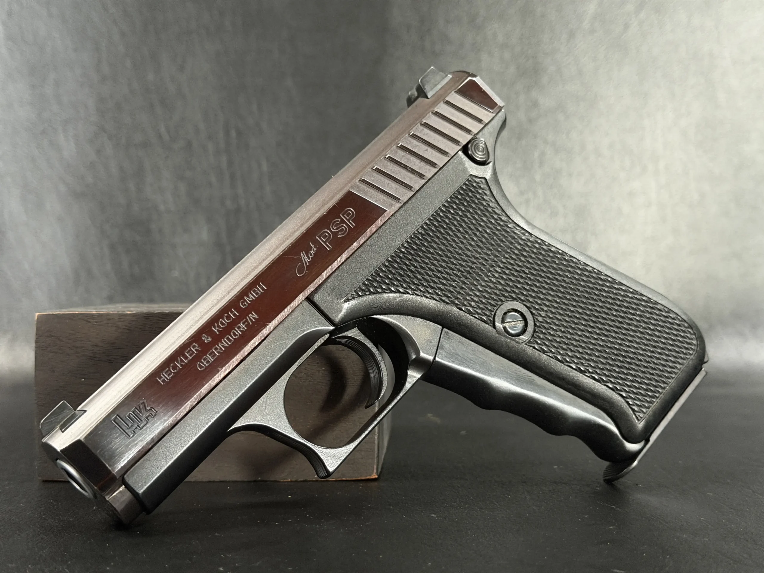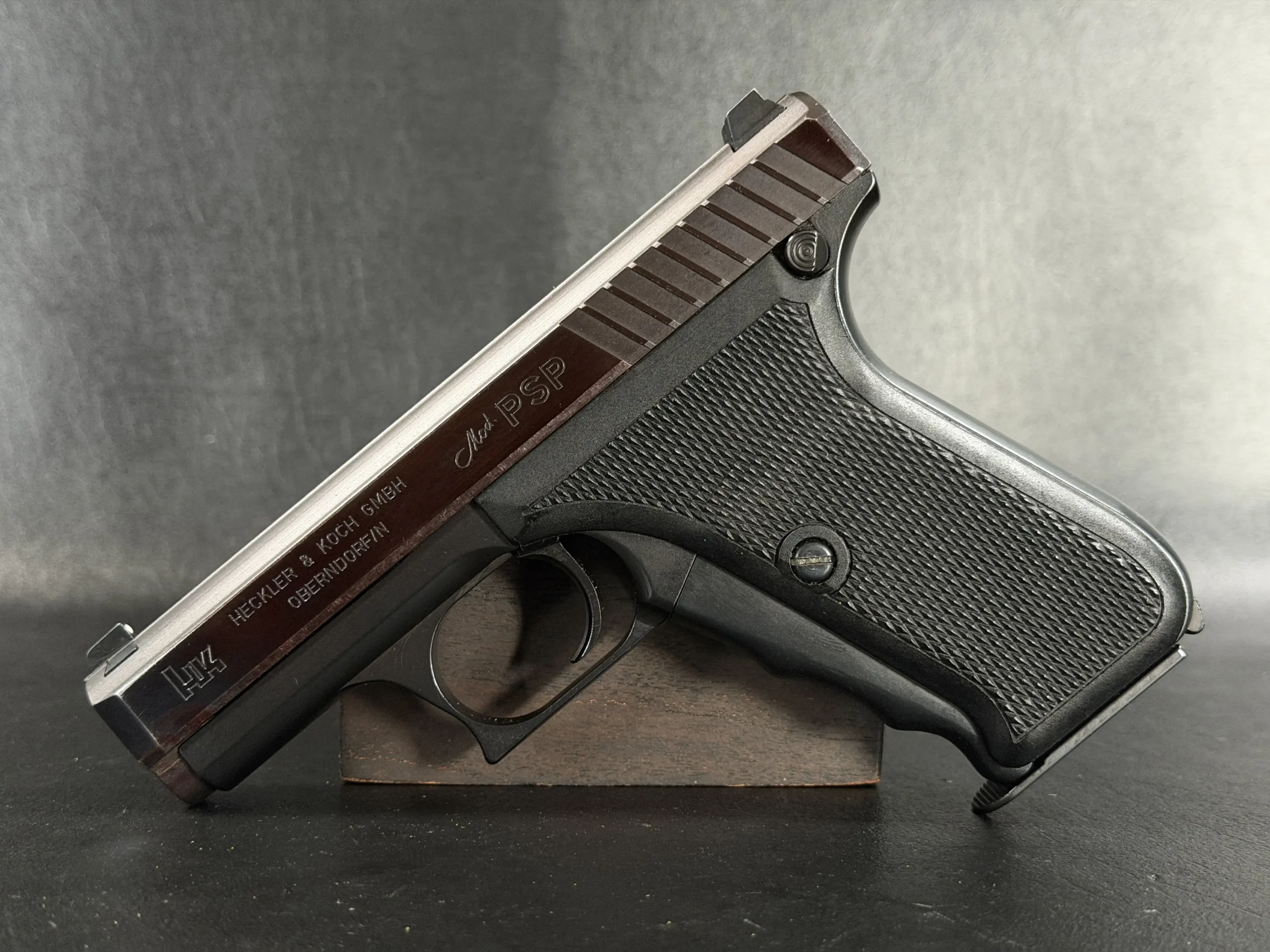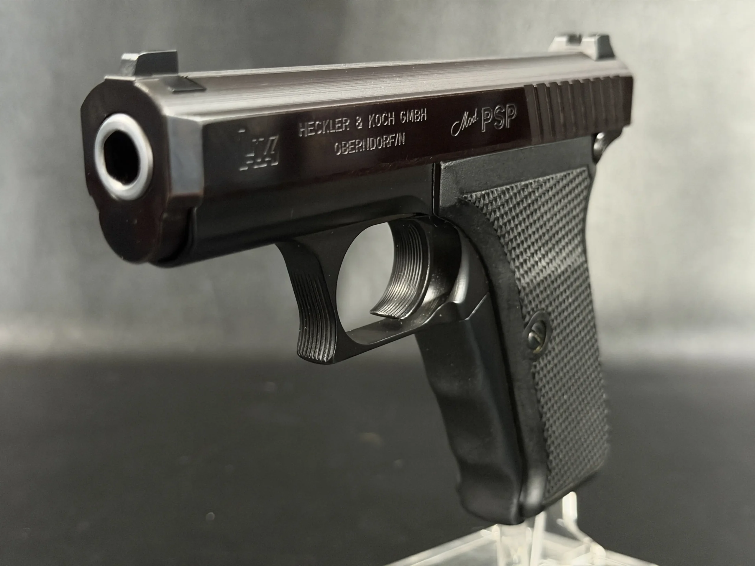 This prototype example shows the early development character of the P7 PSP (“Polizei Selbstlade Pistole”), the original version produced before the later P7M8 and P7M13 models. The pistol features a dark slide, a matte black frame, and original black grip panels with checkering.
