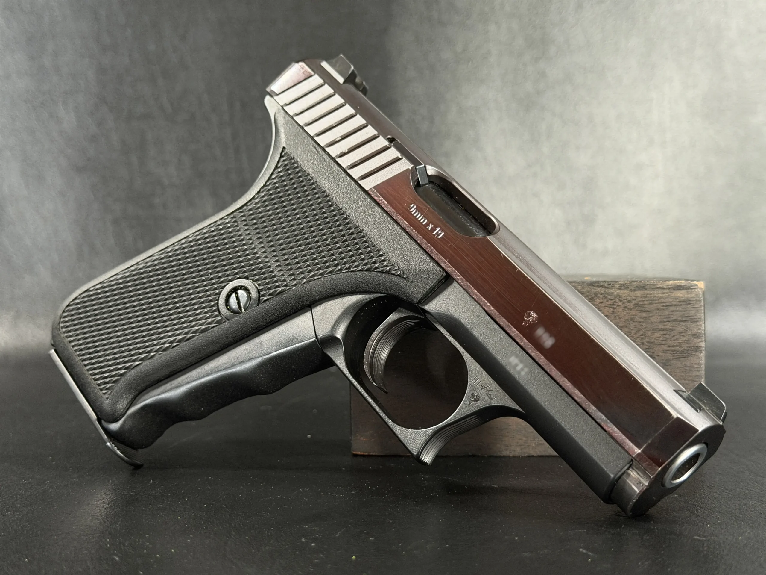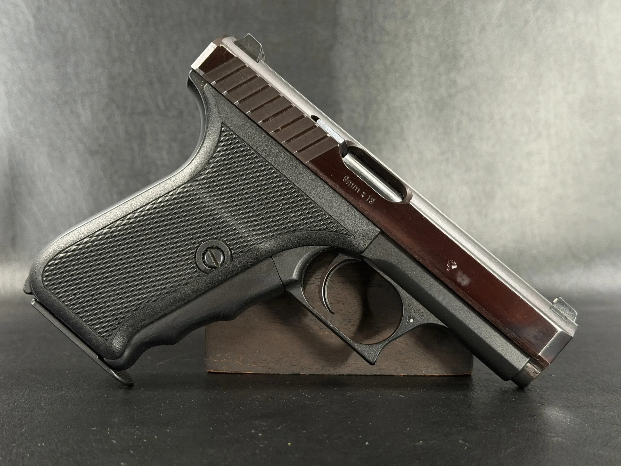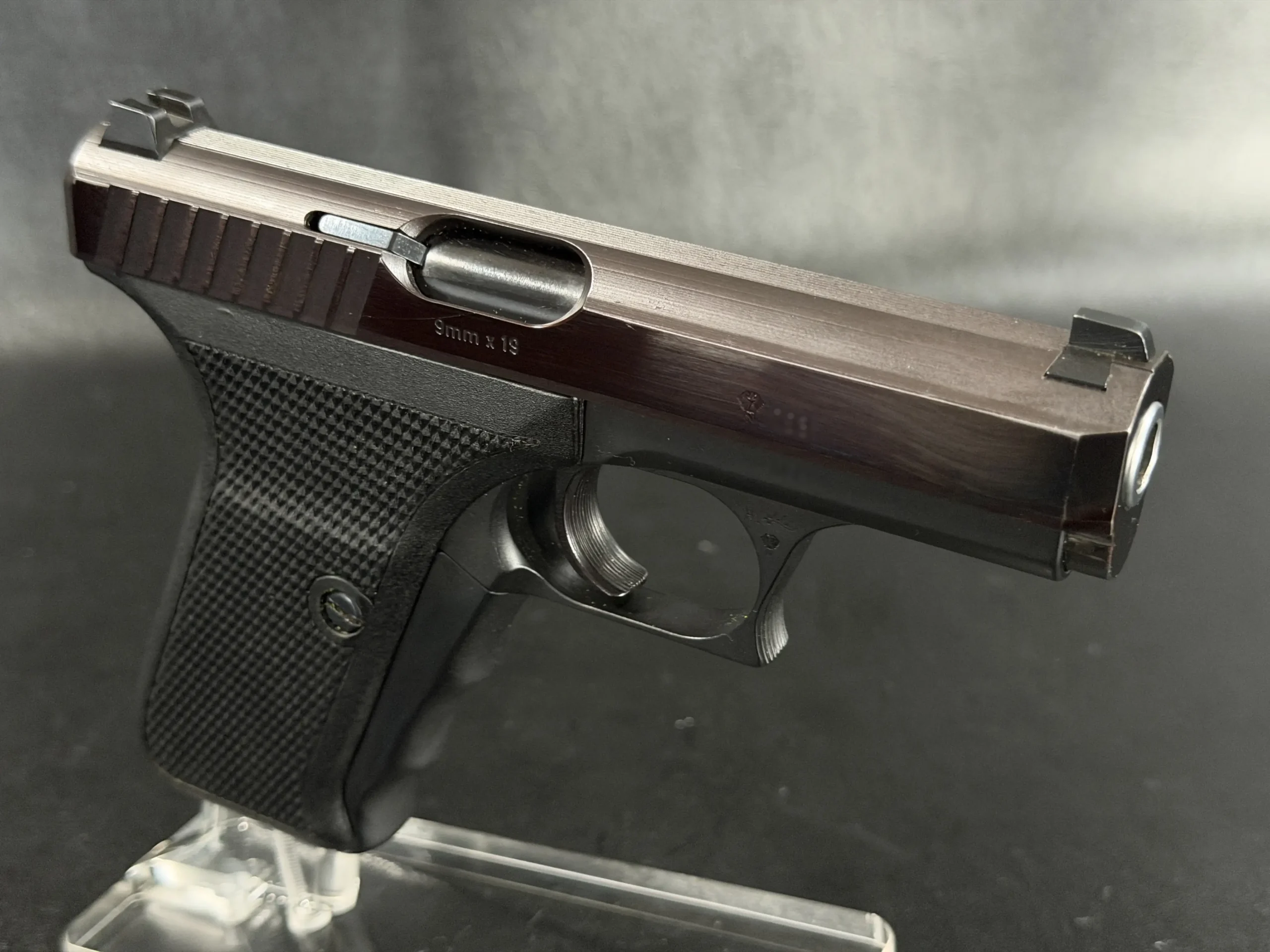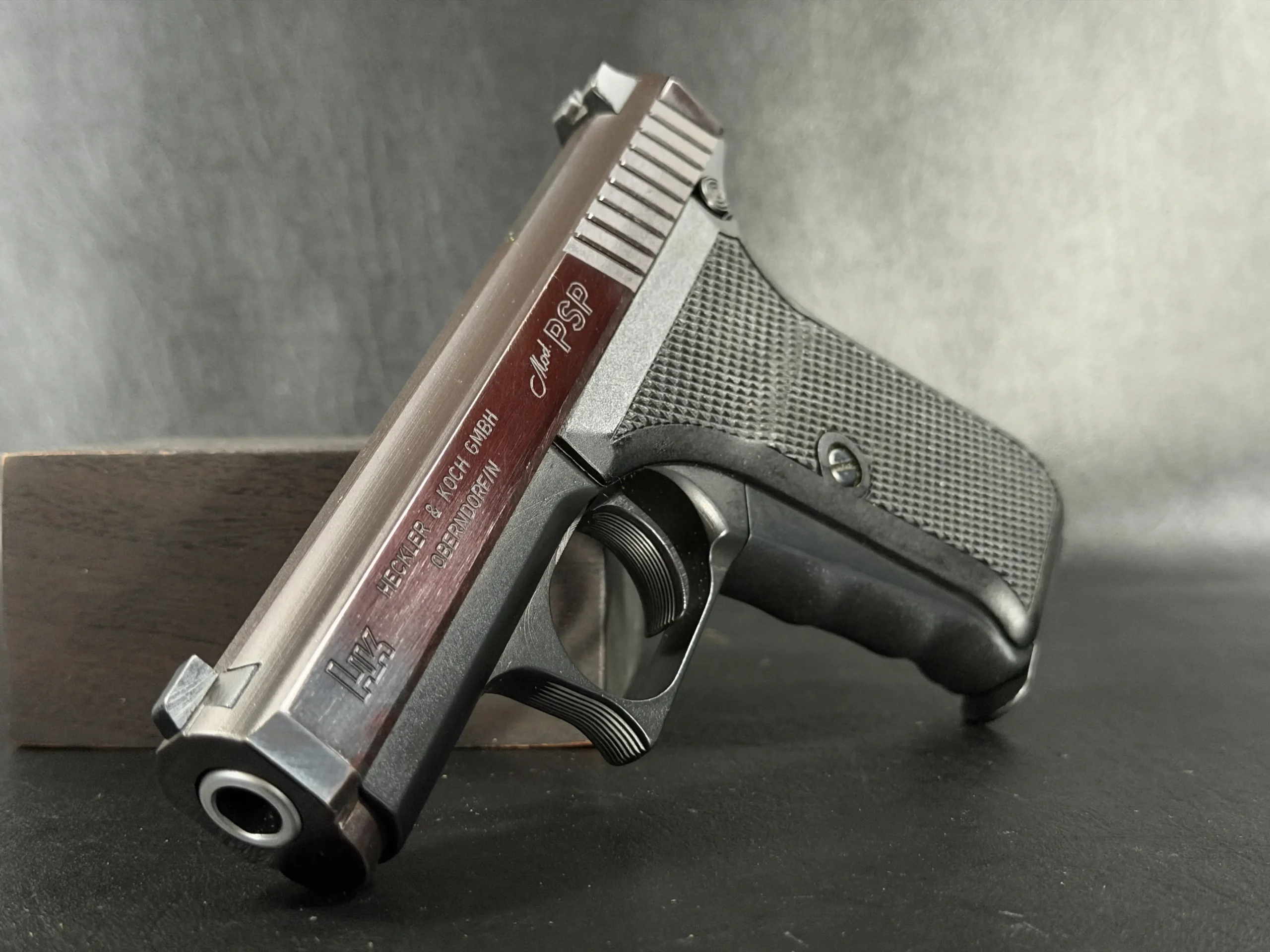 This prototype example shows the early development character of the P7 PSP (“Polizei Selbstlade Pistole”), the original version produced before the later P7M8 and P7M13 models. The pistol features a dark slide, a matte black frame, and original black grip panels with checkering.