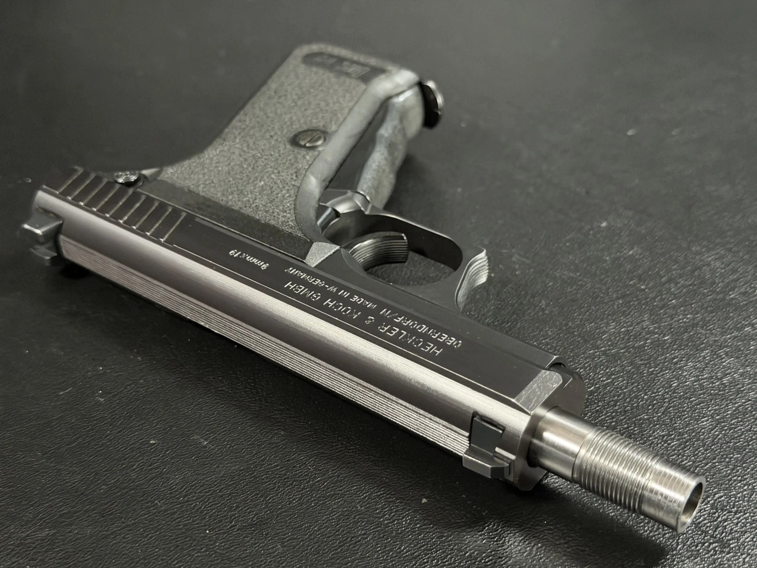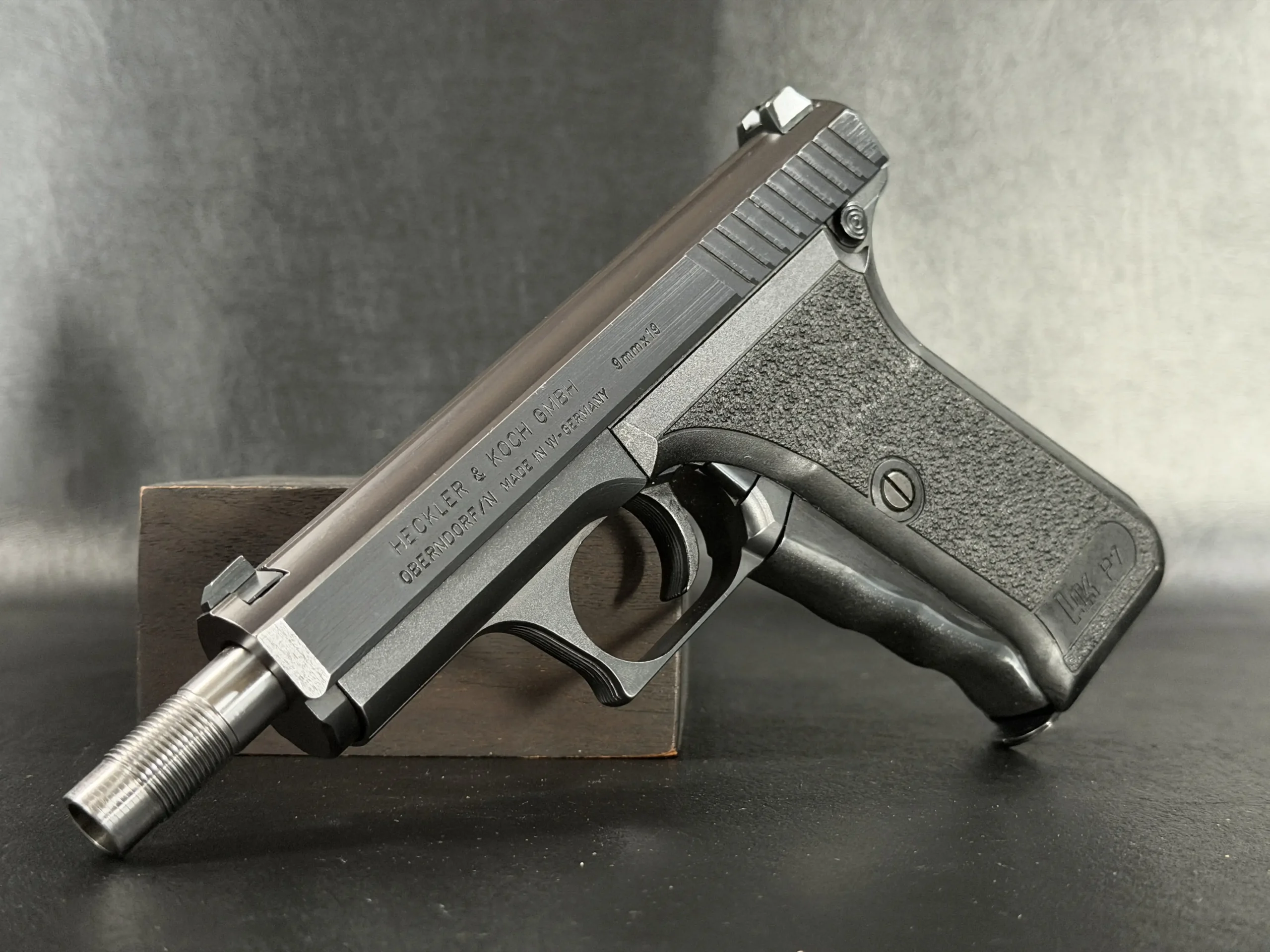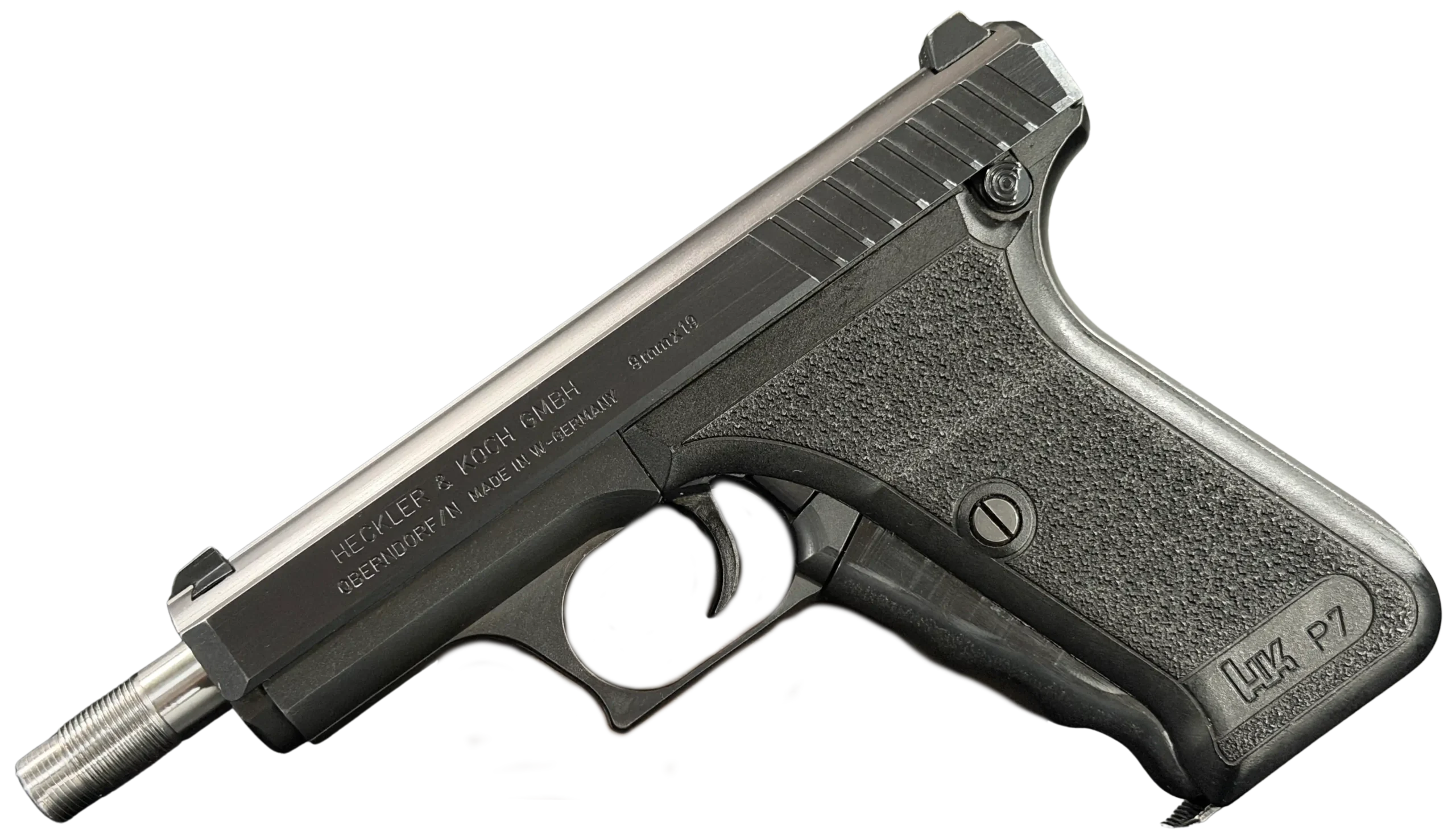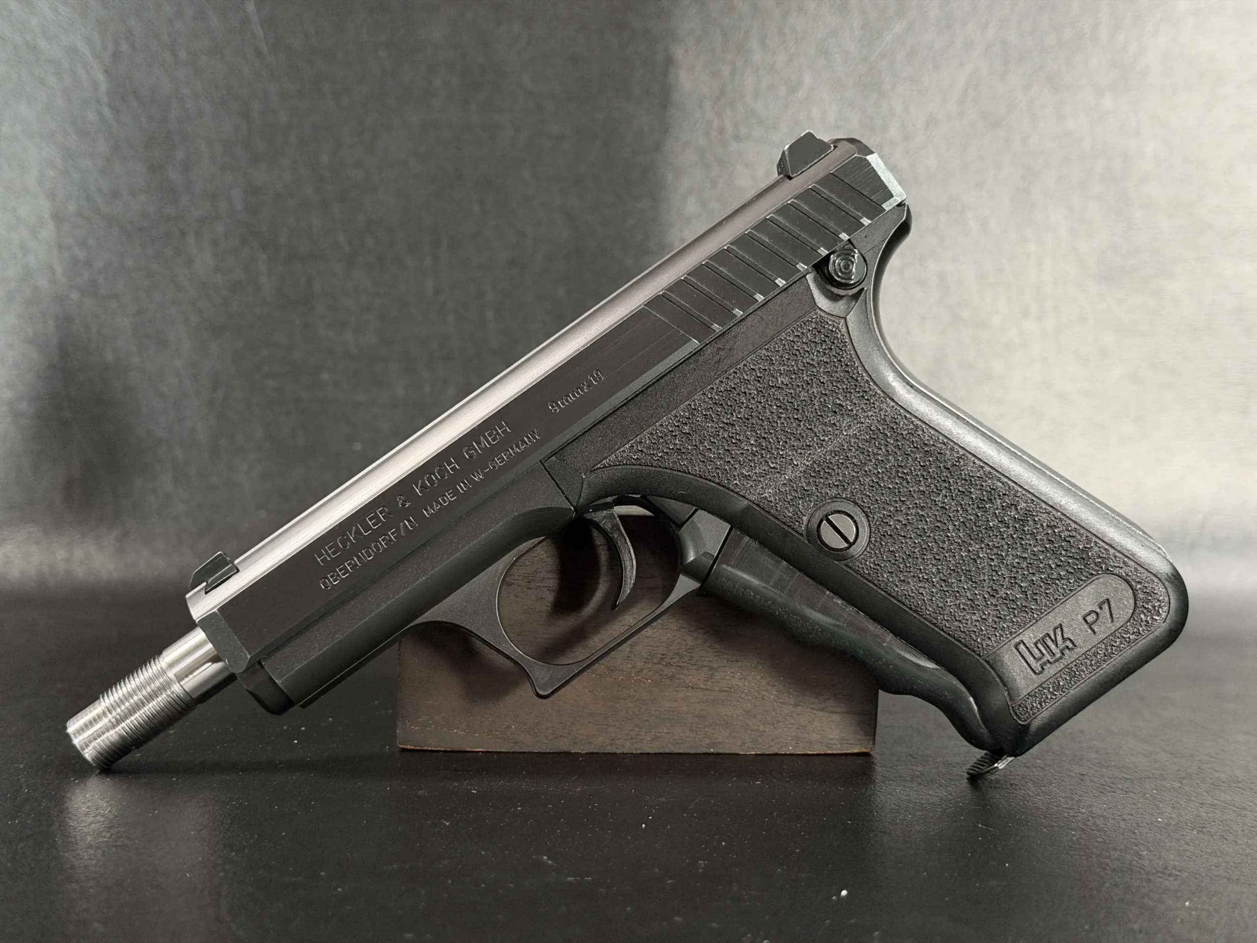 This P7SD configuration features a factory threaded barrel for suppressor use, with the extended barrel projecting forward from the slide to create the model’s unmistakable profile. The matte finish, precise slide serrations, and sculpted trigger guard reflect the clean, functional design language associated with Heckler & Koch.