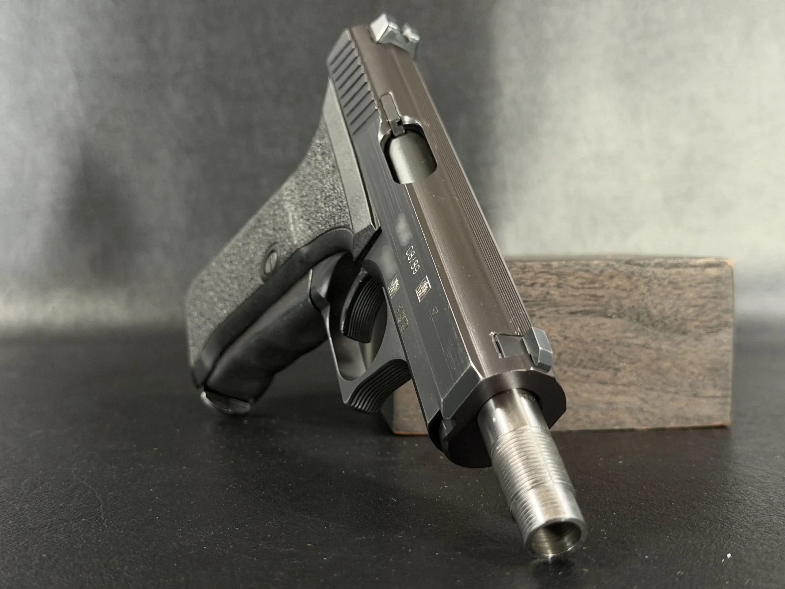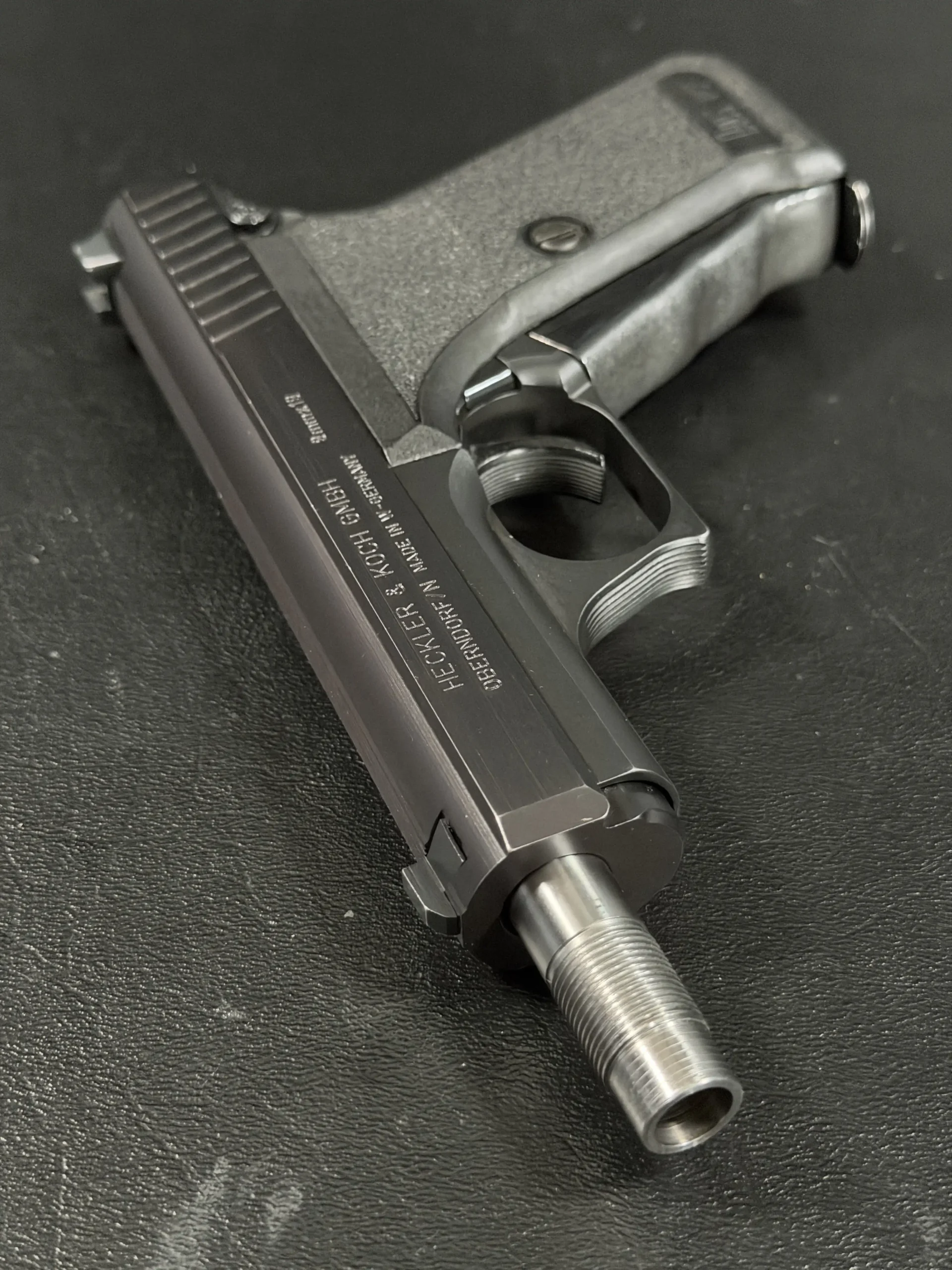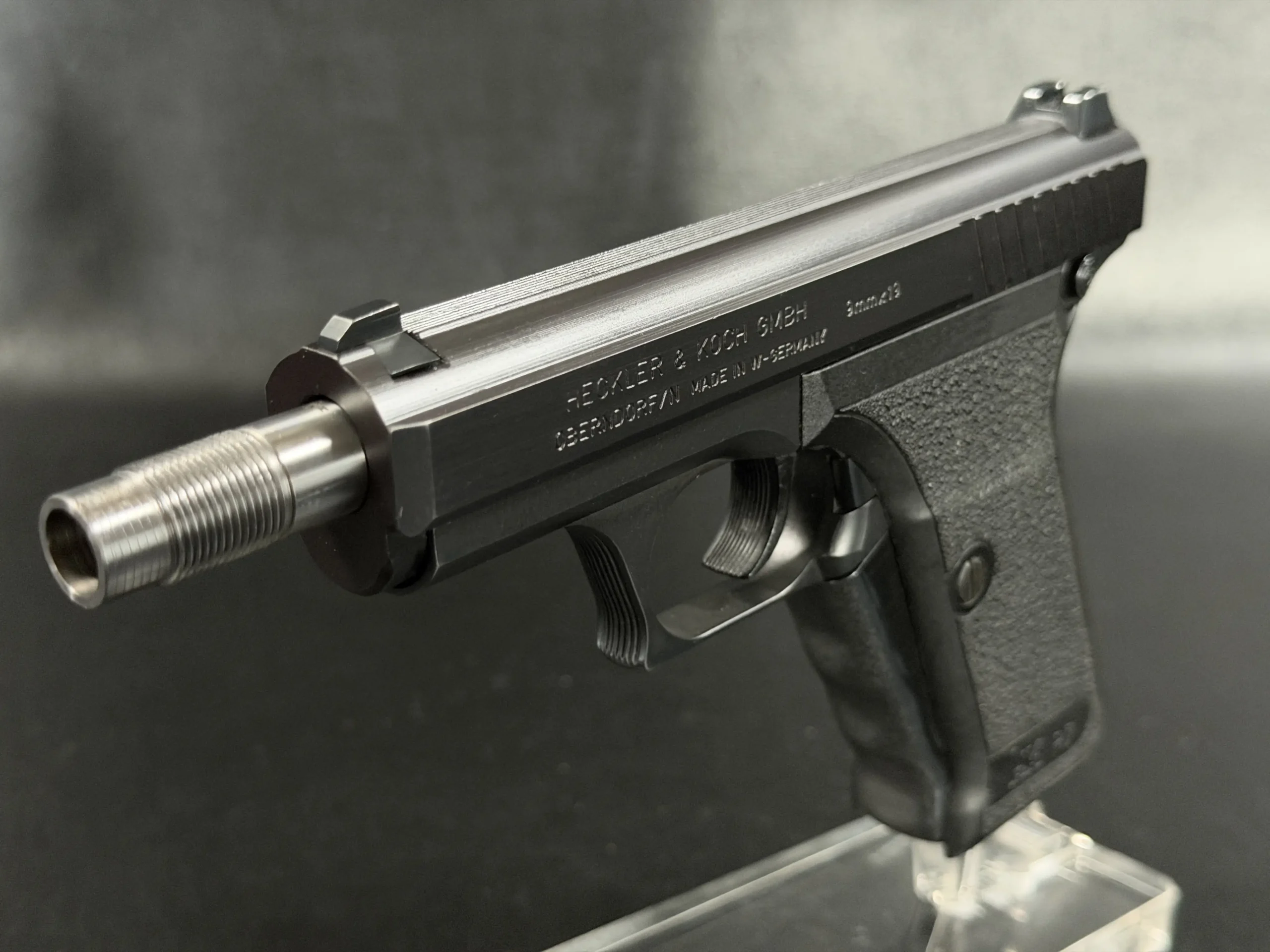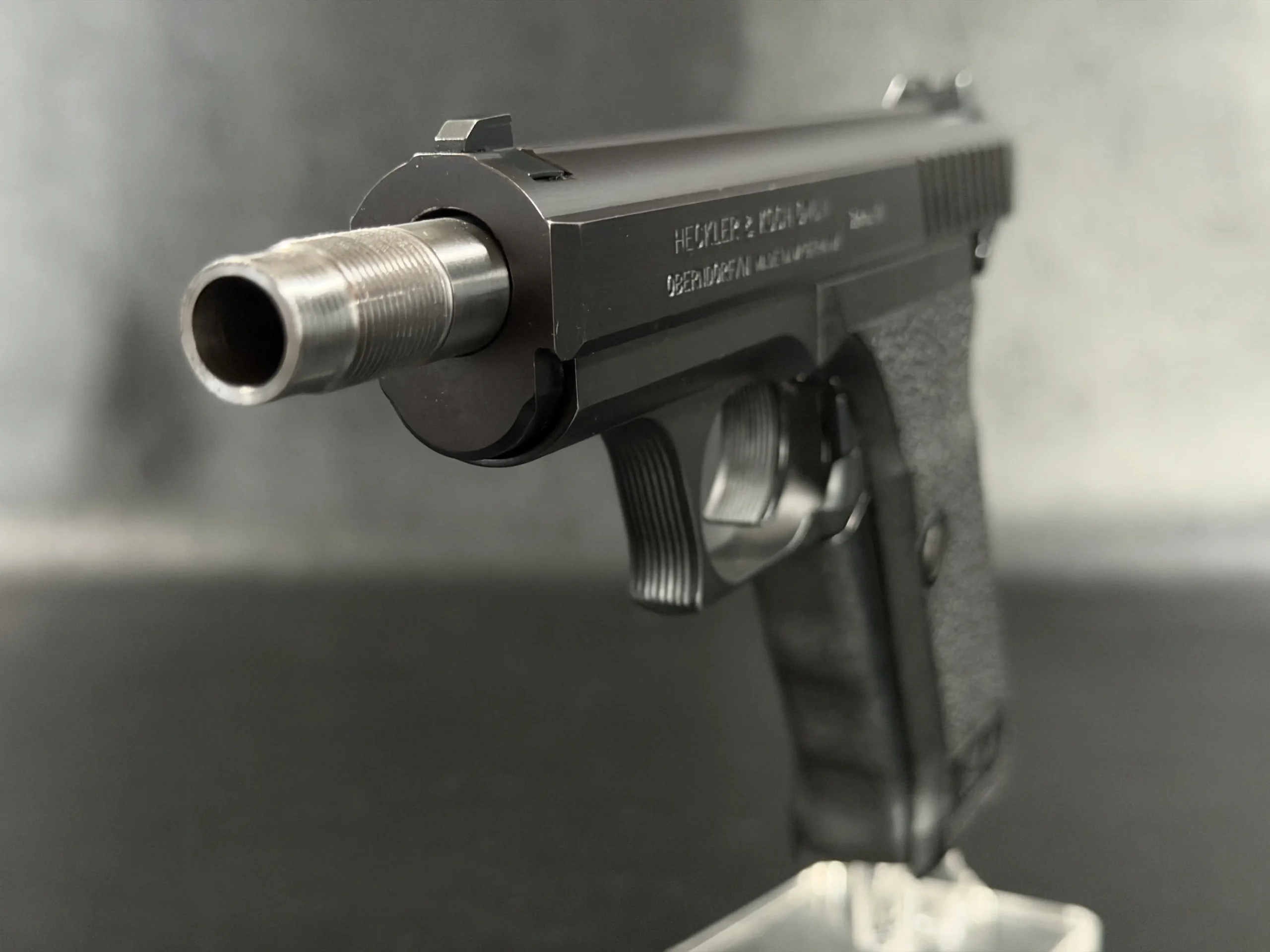 This P7SD configuration features a factory threaded barrel for suppressor use, with the extended barrel projecting forward from the slide to create the model’s unmistakable profile. The matte finish, precise slide serrations, and sculpted trigger guard reflect the clean, functional design language associated with Heckler & Koch.