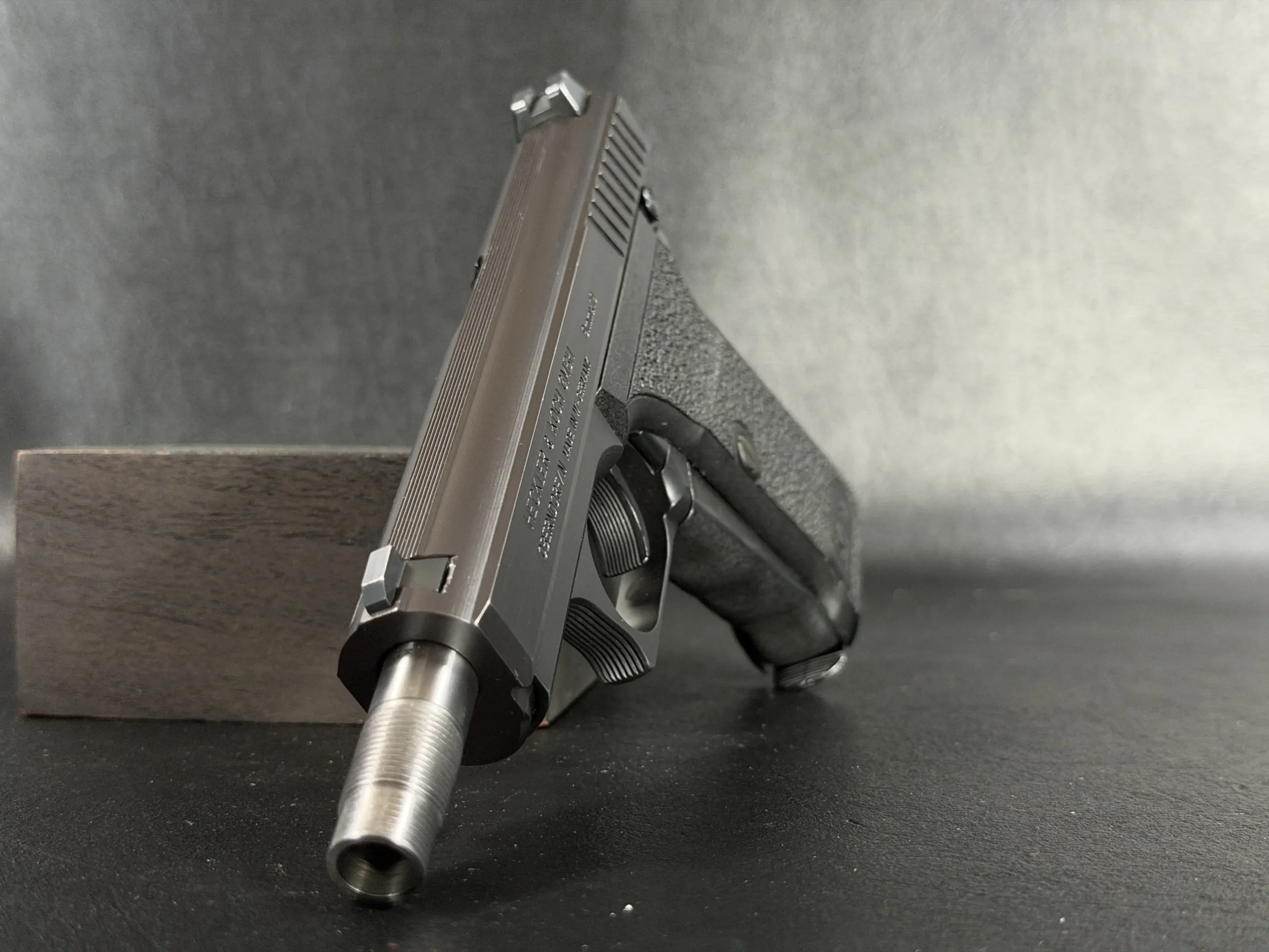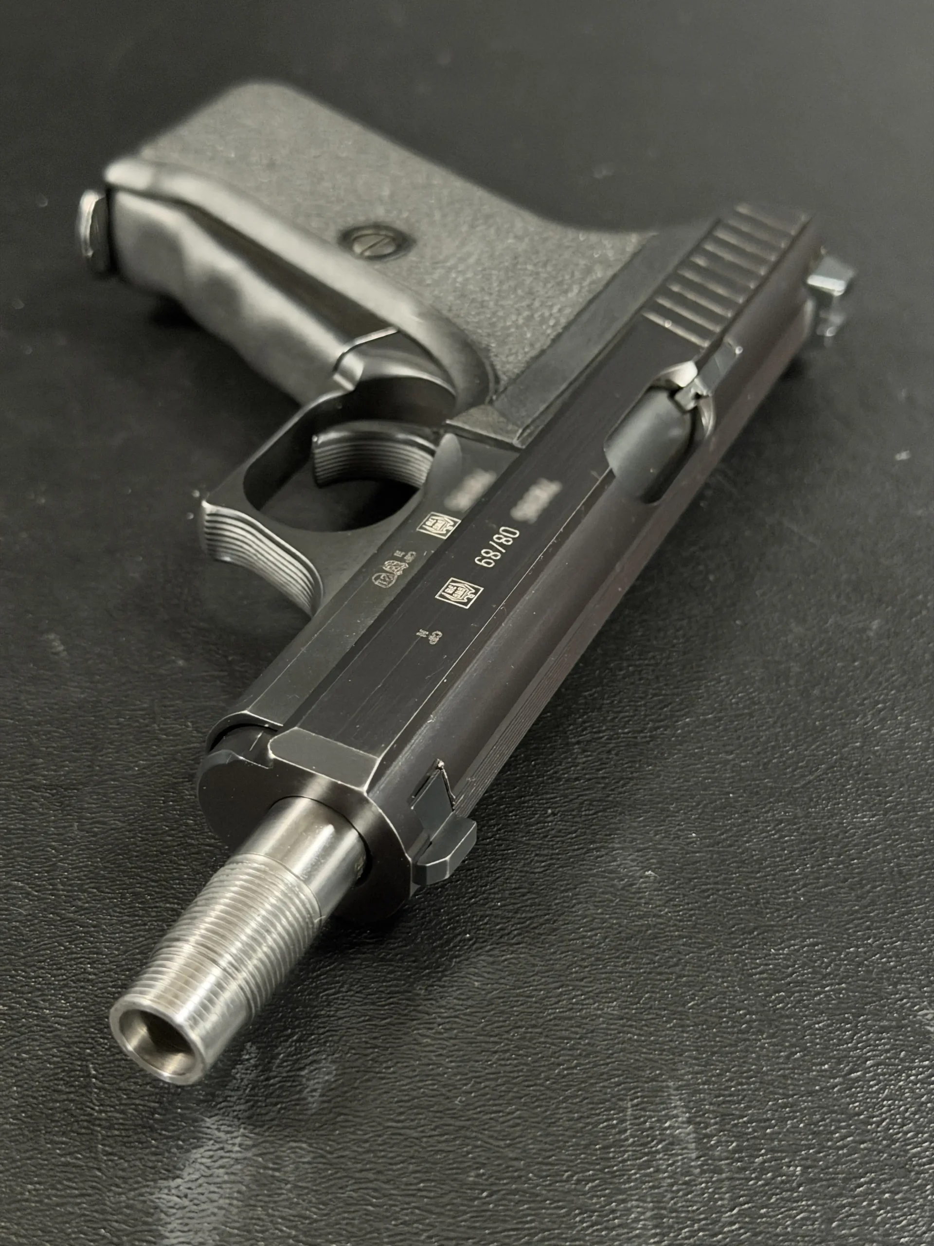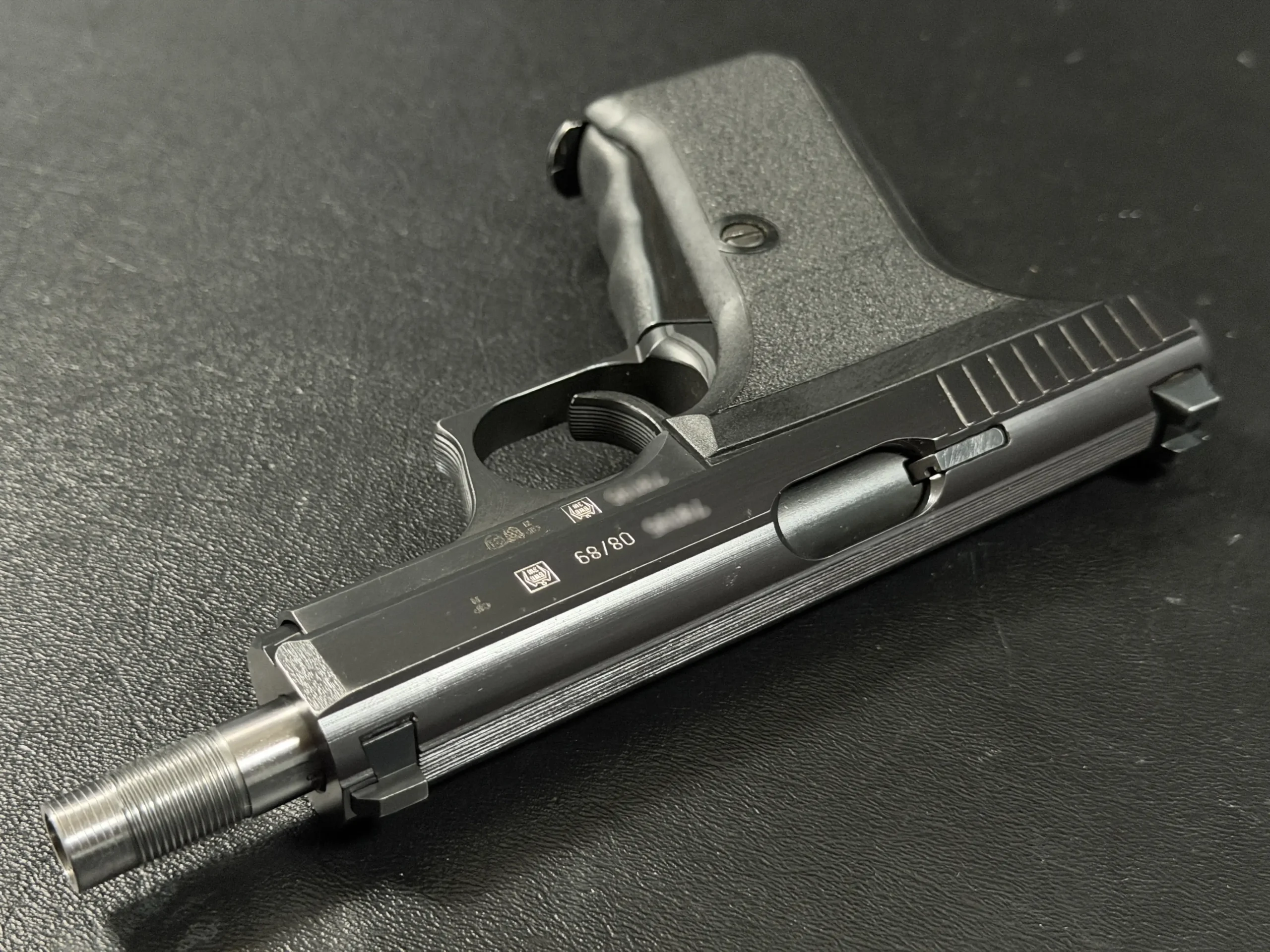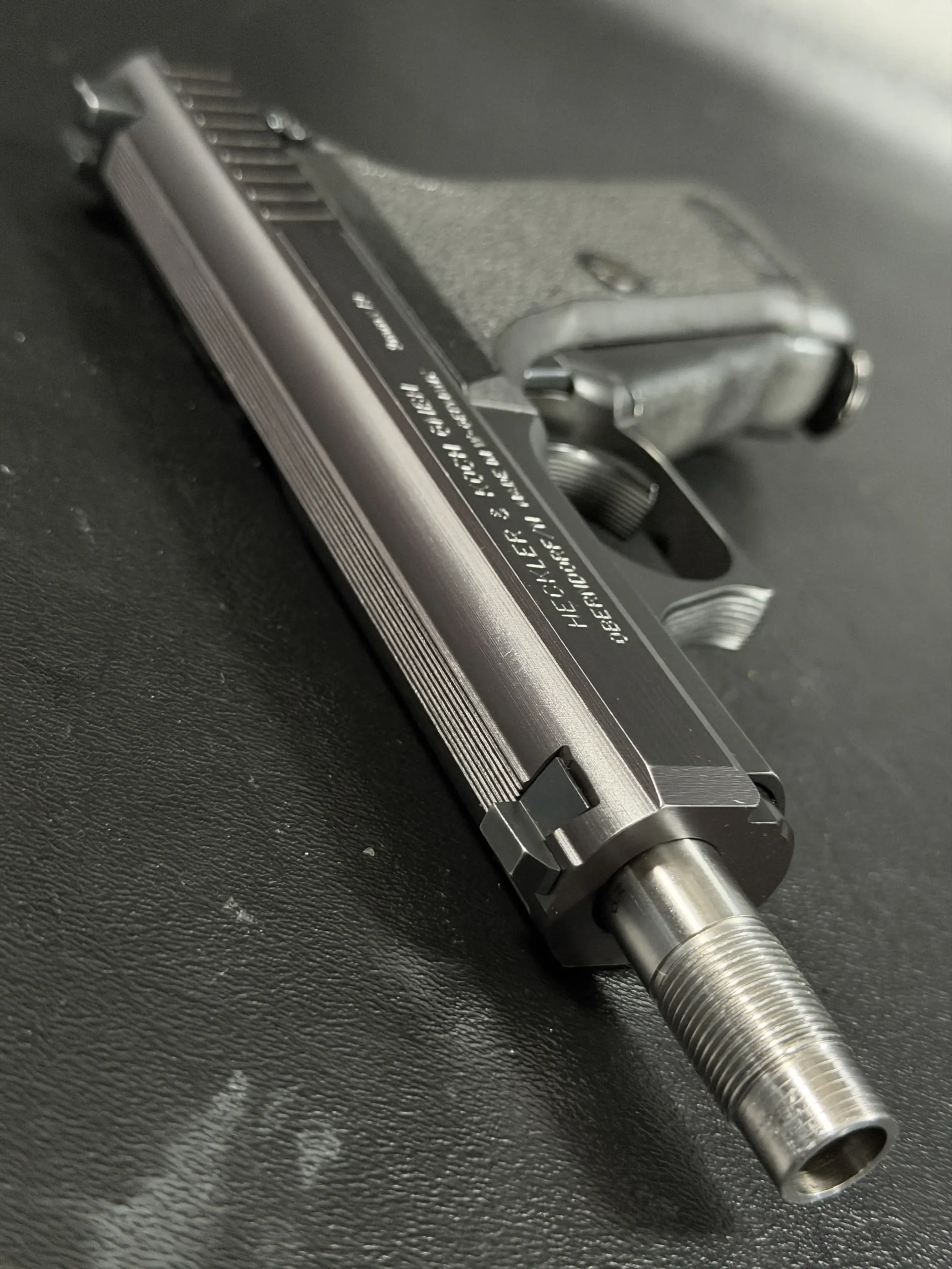This P7SD configuration features a factory threaded barrel for suppressor use, with the extended barrel projecting forward from the slide to create the model’s unmistakable profile. The matte finish, precise slide serrations, and sculpted trigger guard reflect the clean, functional design language associated with Heckler & Koch.
