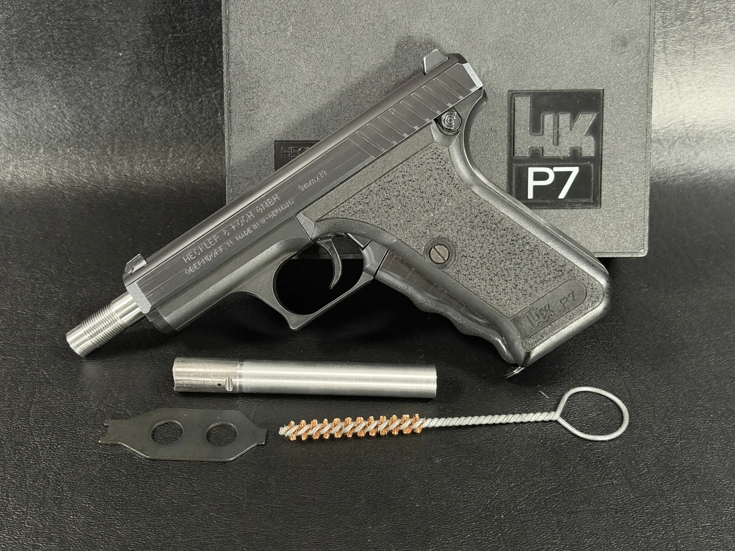 Included with the pistol are its factory box and accessories, offering a more complete presentation for collectors and enthusiasts interested in this specialized P7 variant.
