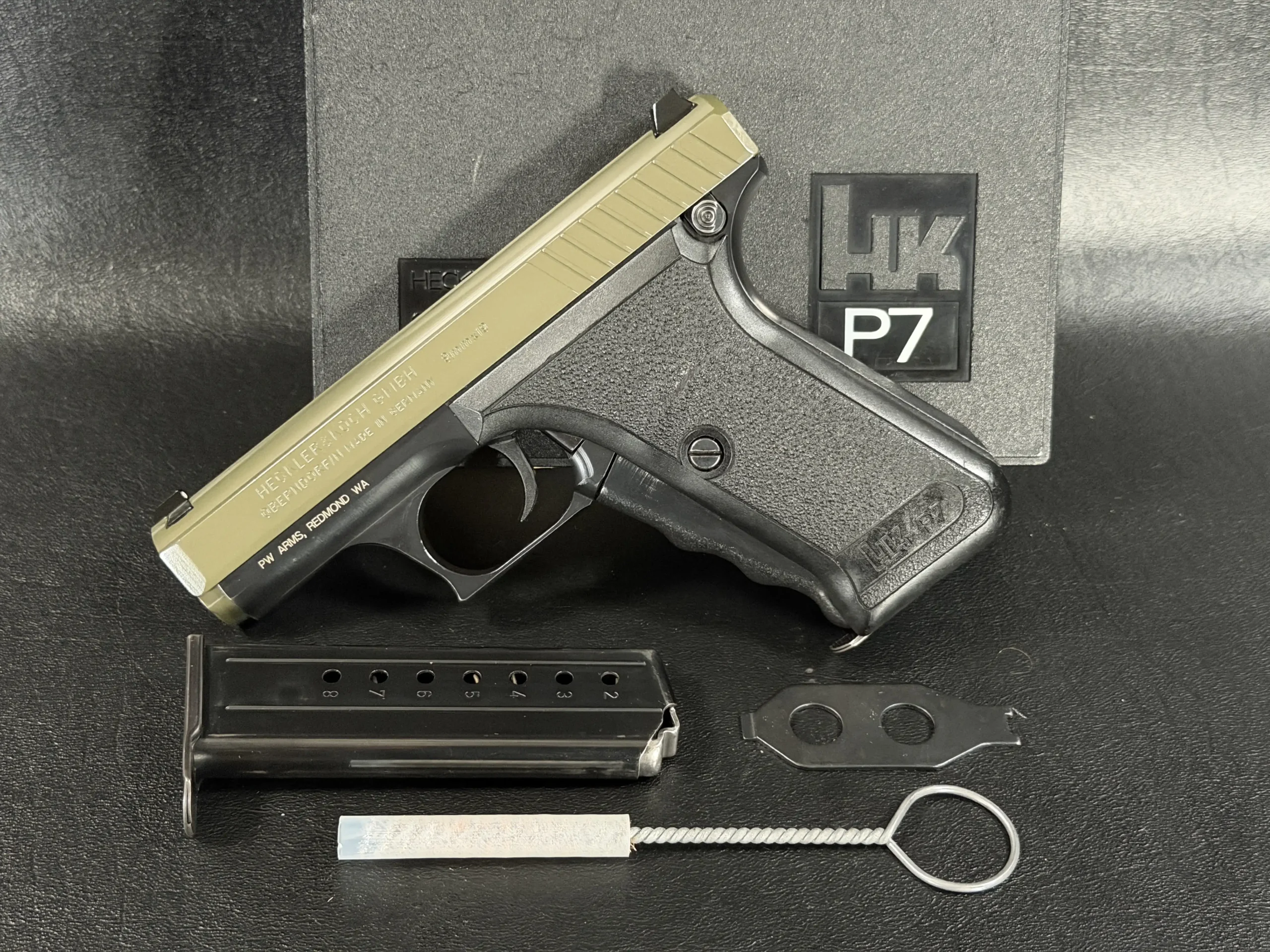 Included with the pistol is a factory magazine and cleaning tool, accessories long associated with the P7 platform.