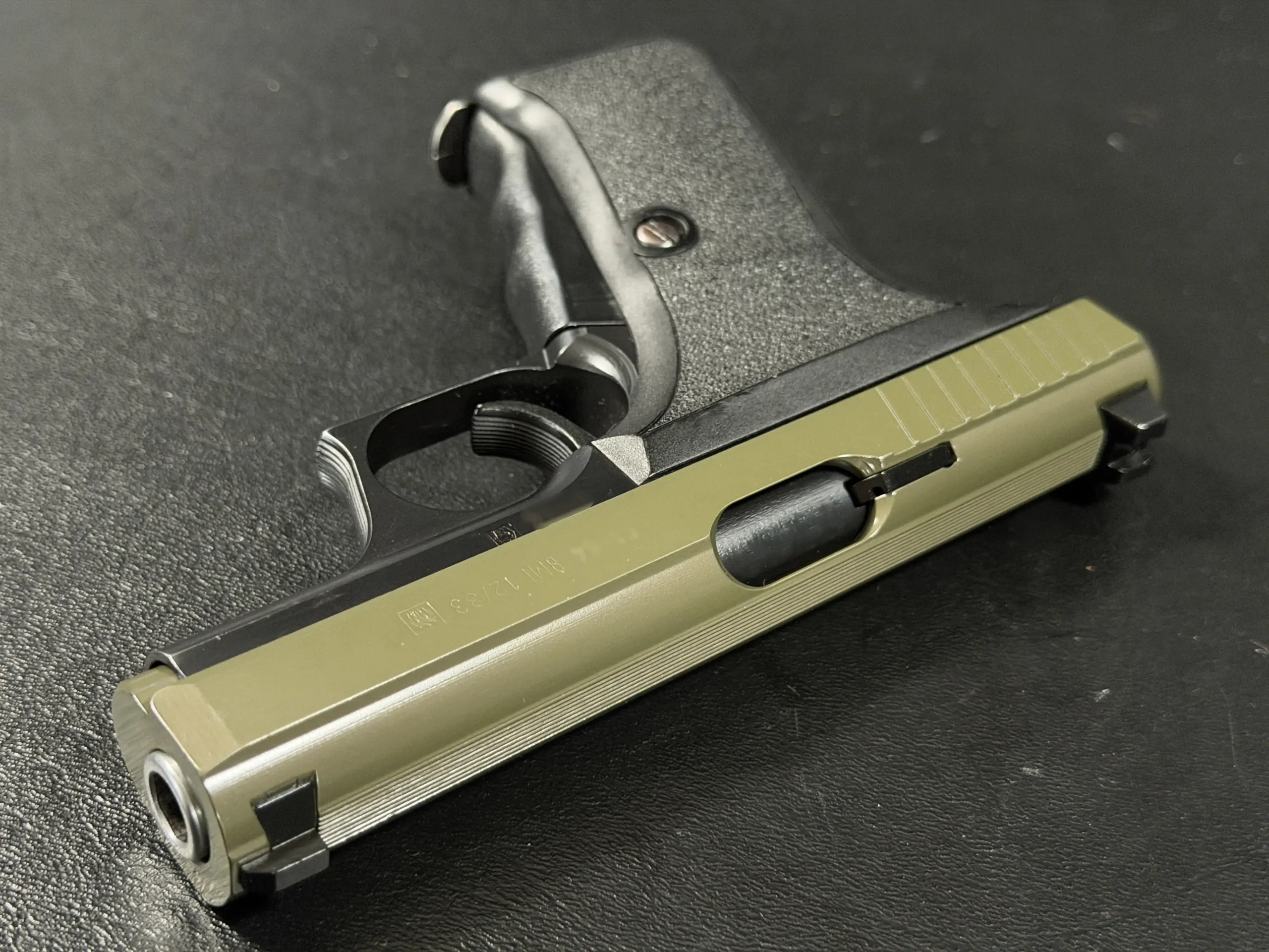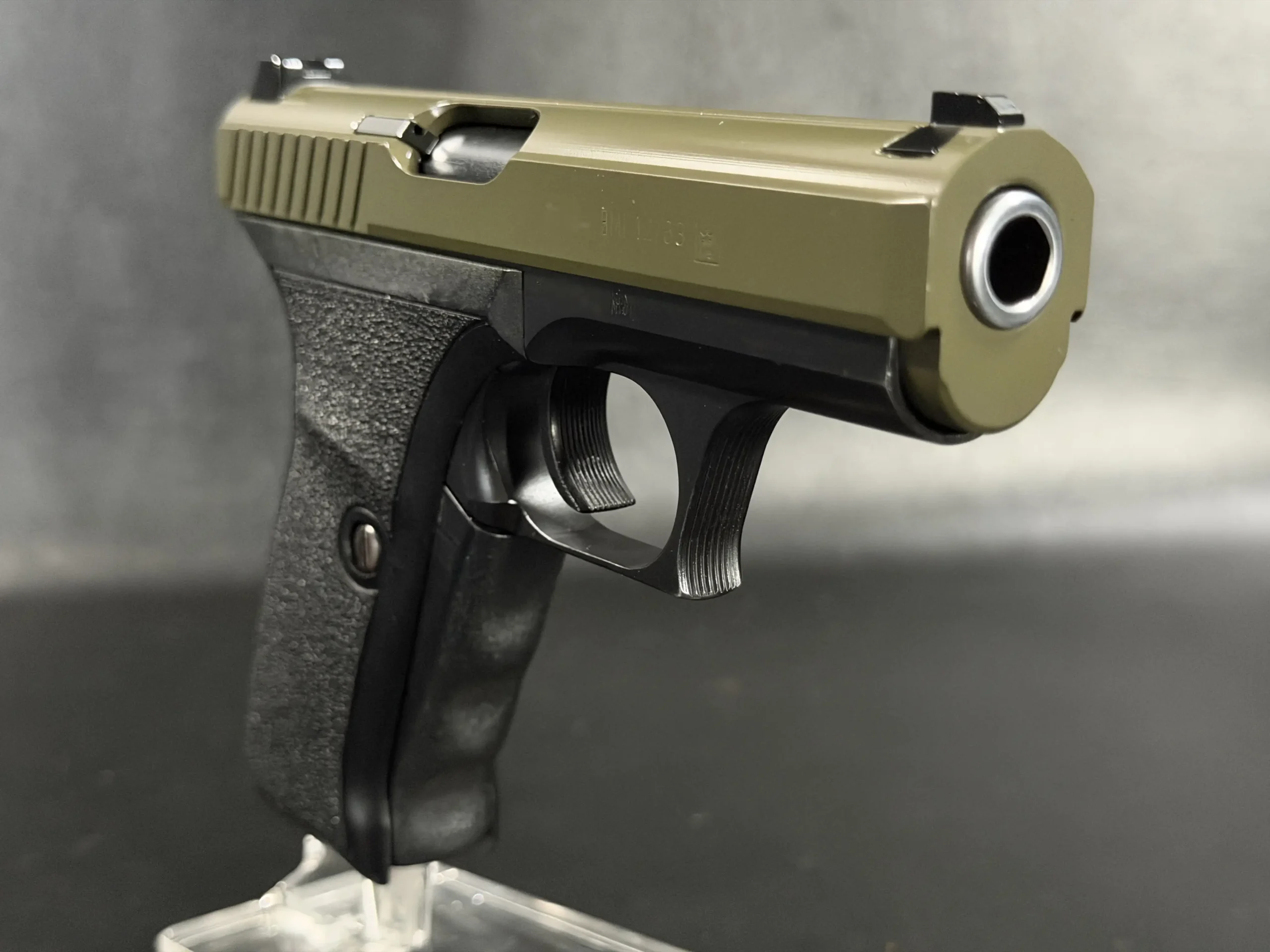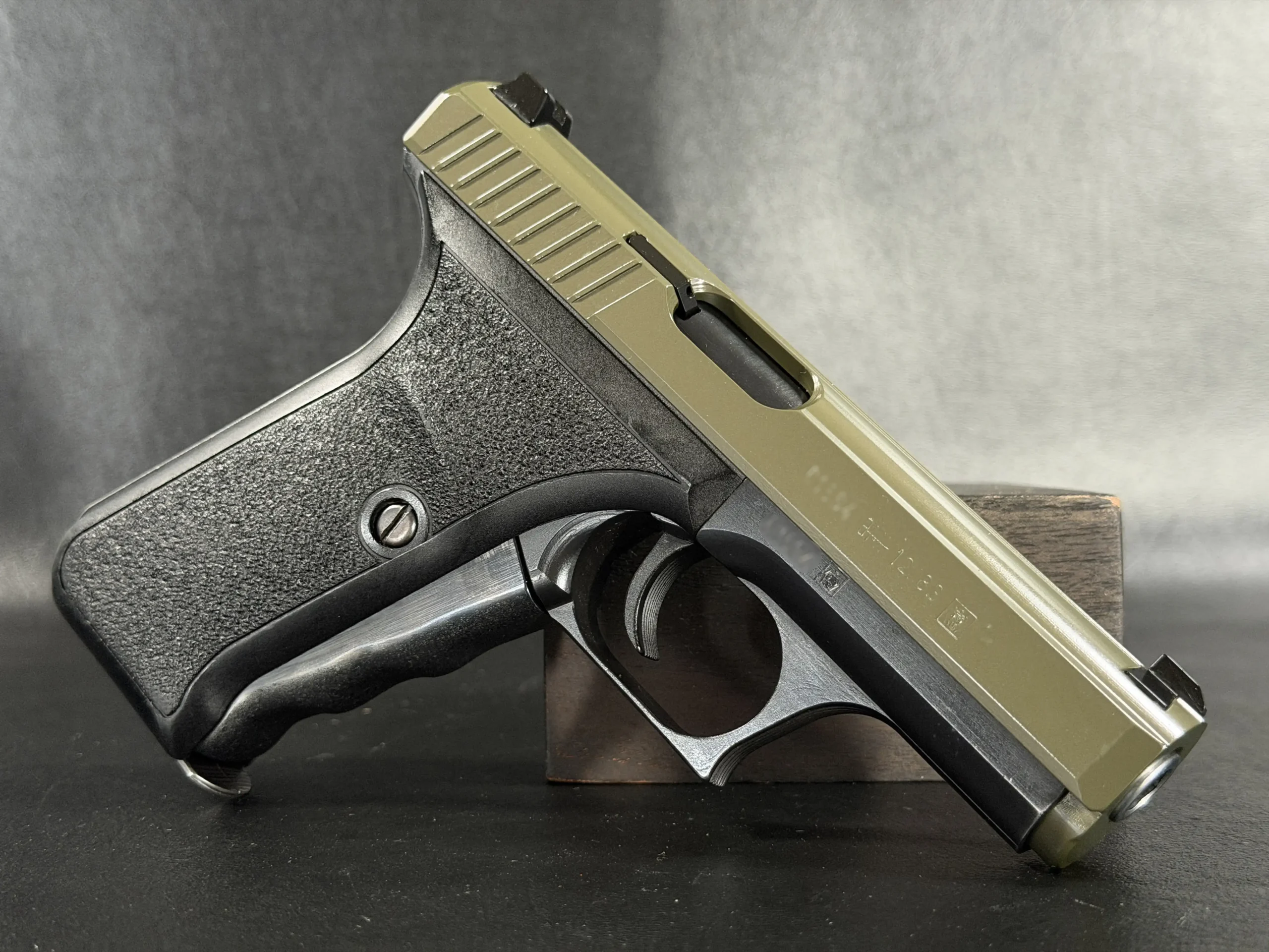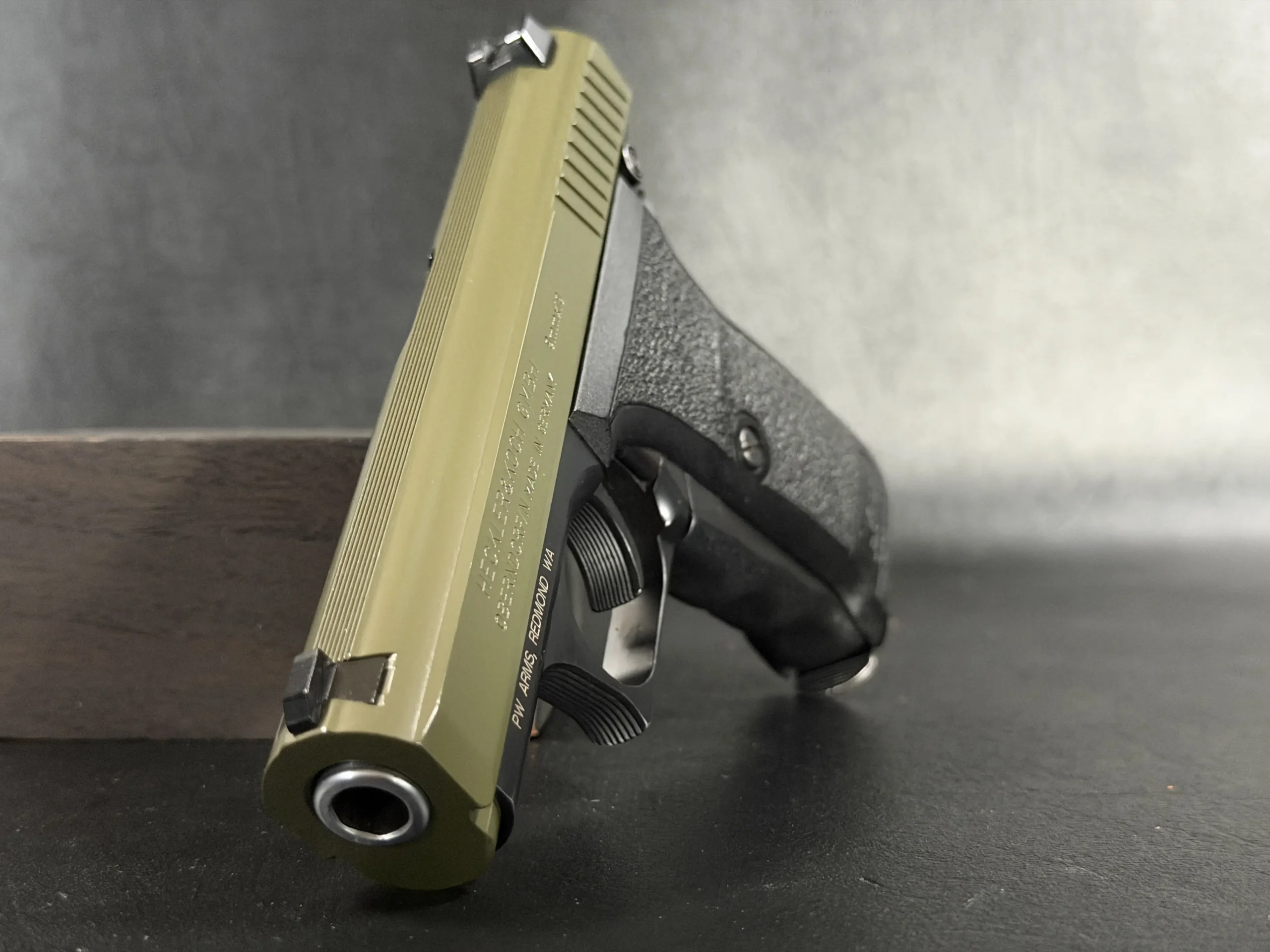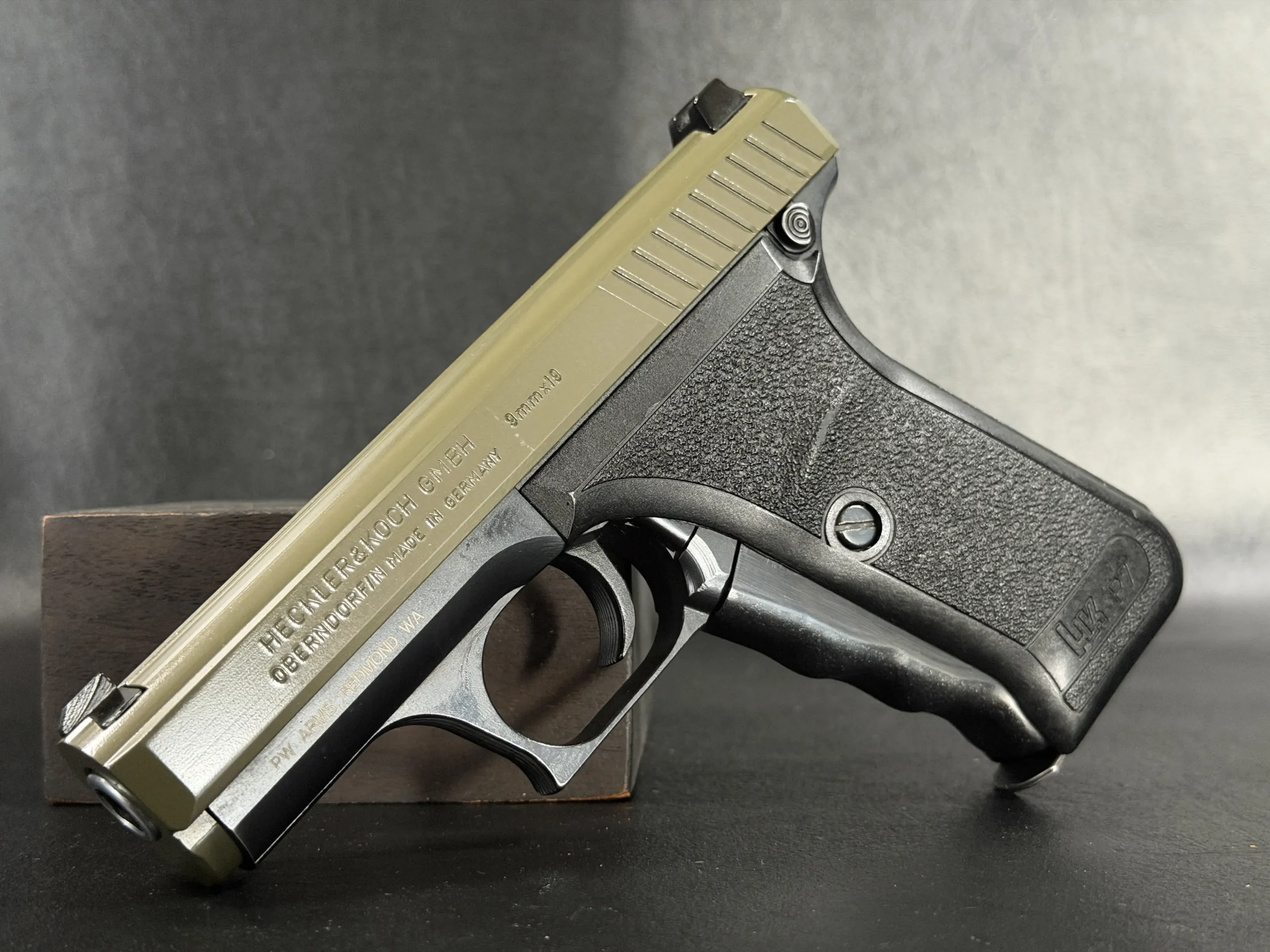 This example pairs an olive-tone slide with a black frame, giving the pistol a distinctive two-tone appearance while preserving the clean lines and crisp detailing of the model. The slide serrations, contoured grip, and overall compact form all contribute to the recognizable feel of the P7 series.