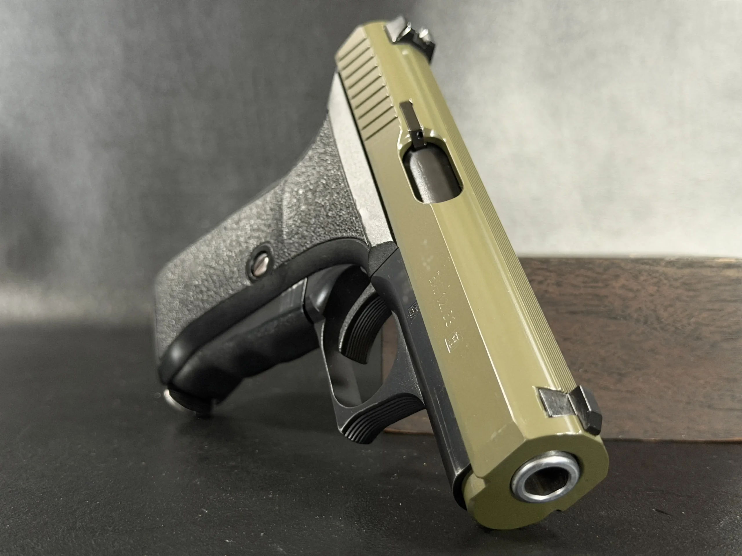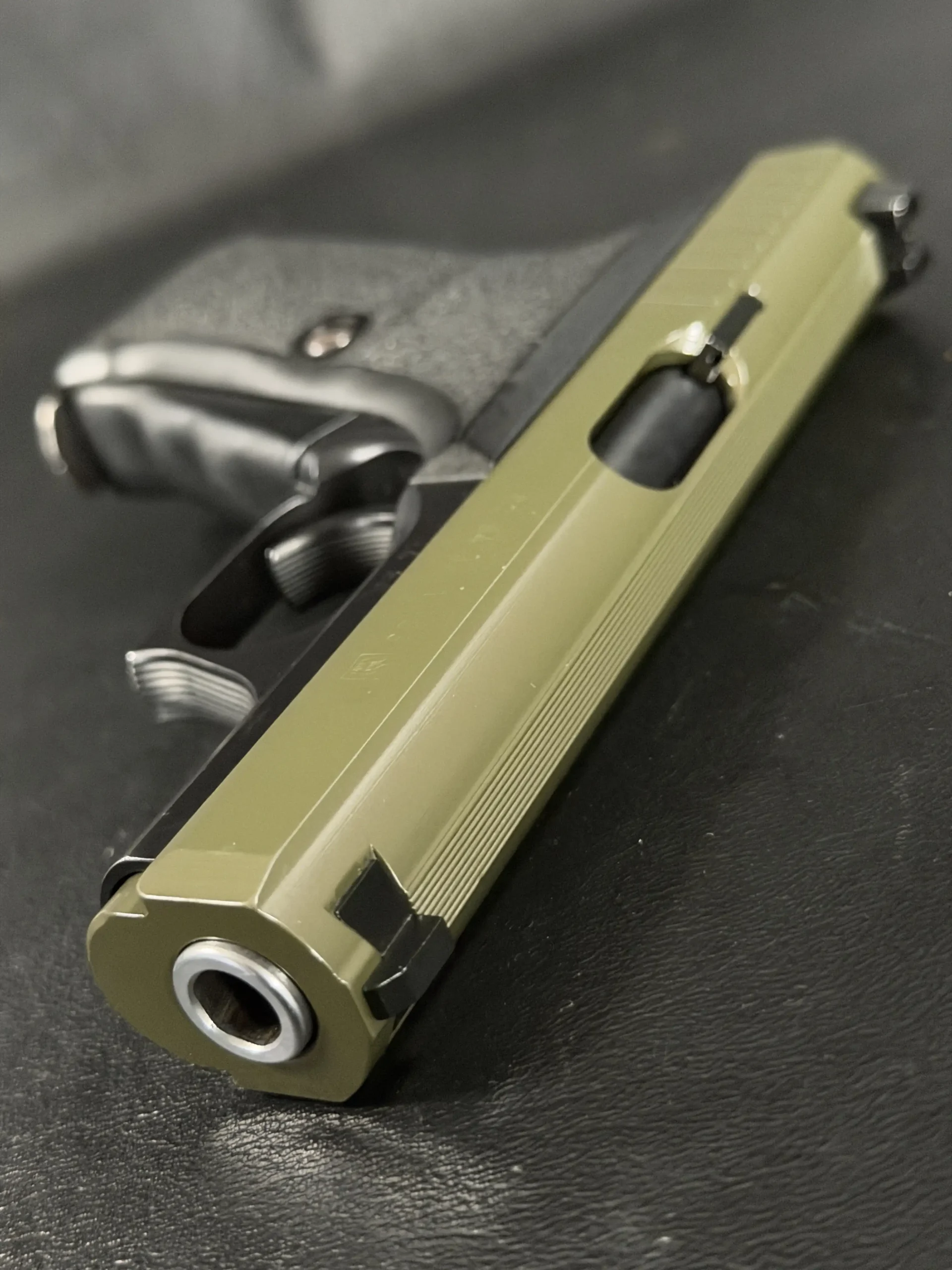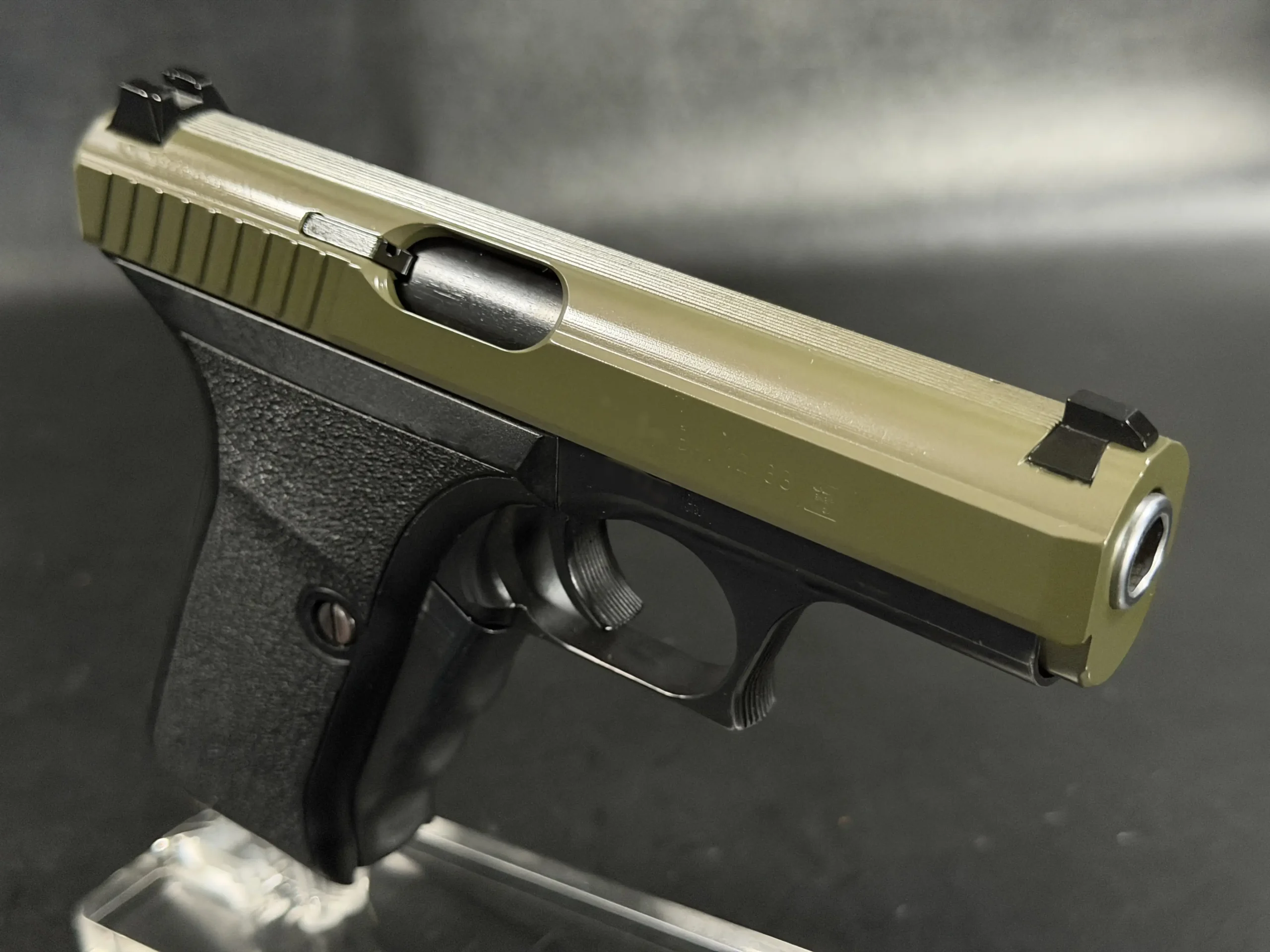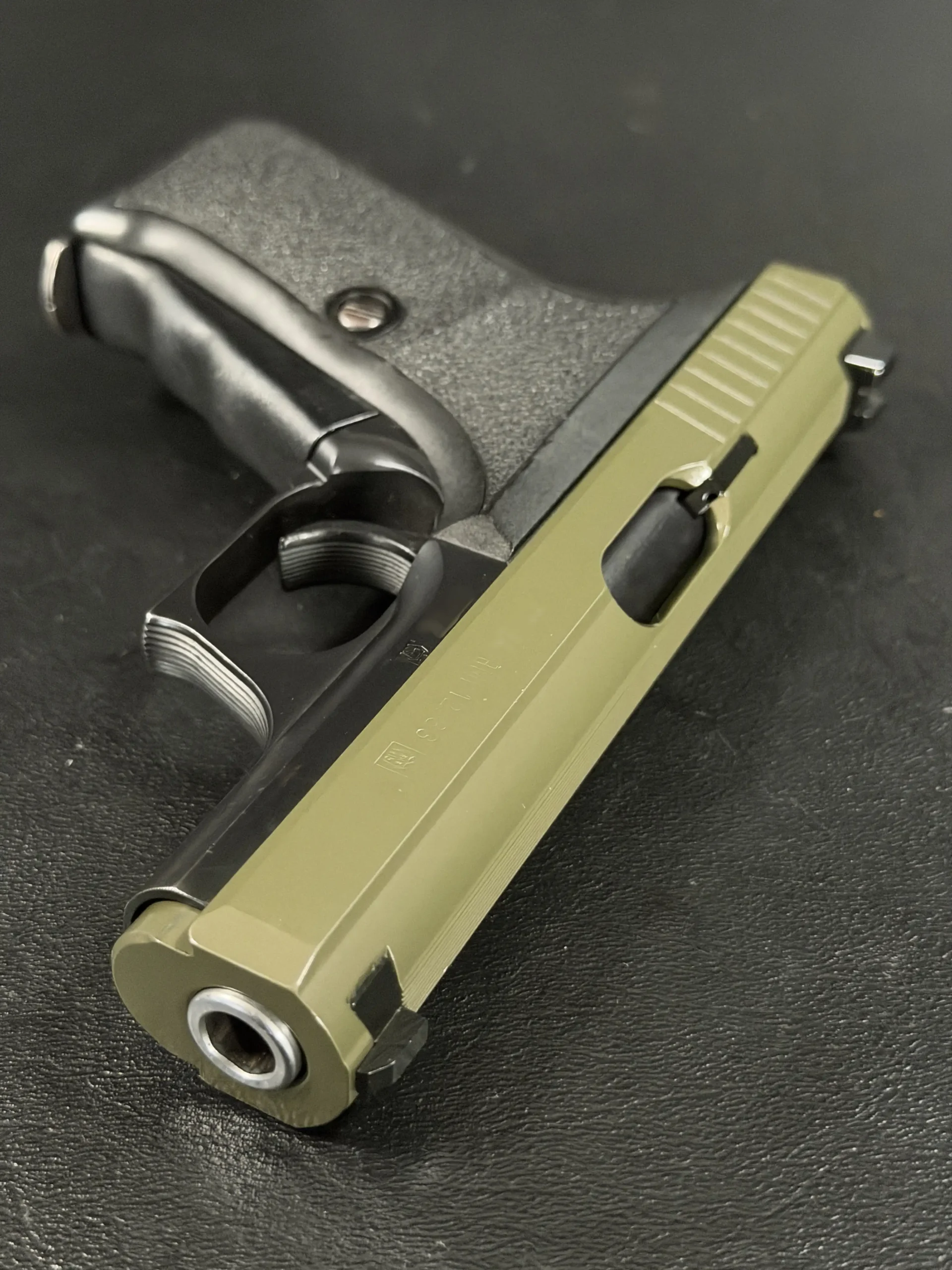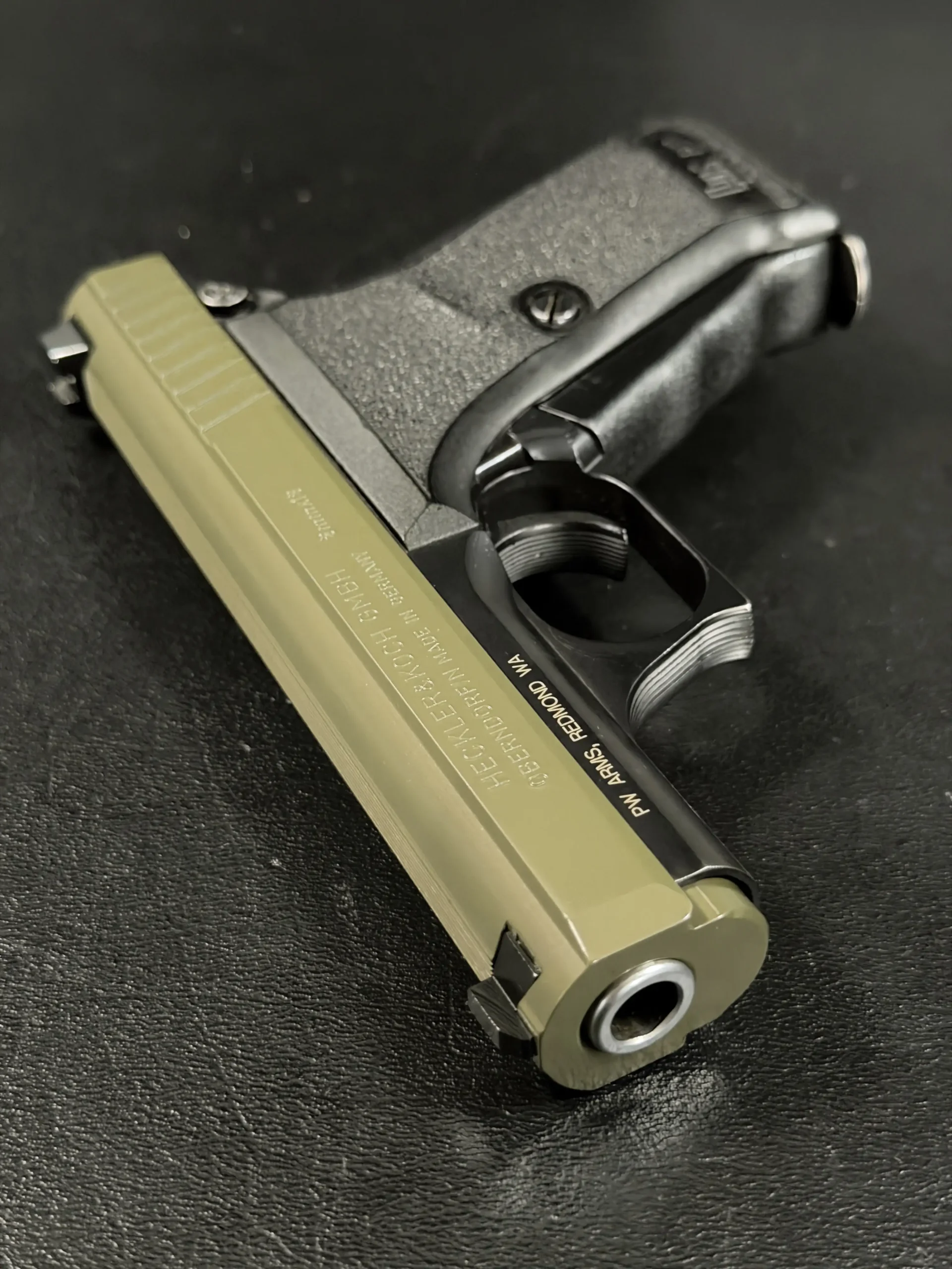 This example pairs an olive-tone slide with a black frame, giving the pistol a distinctive two-tone appearance while preserving the clean lines and crisp detailing of the model. The slide serrations, contoured grip, and overall compact form all contribute to the recognizable feel of the P7 series.