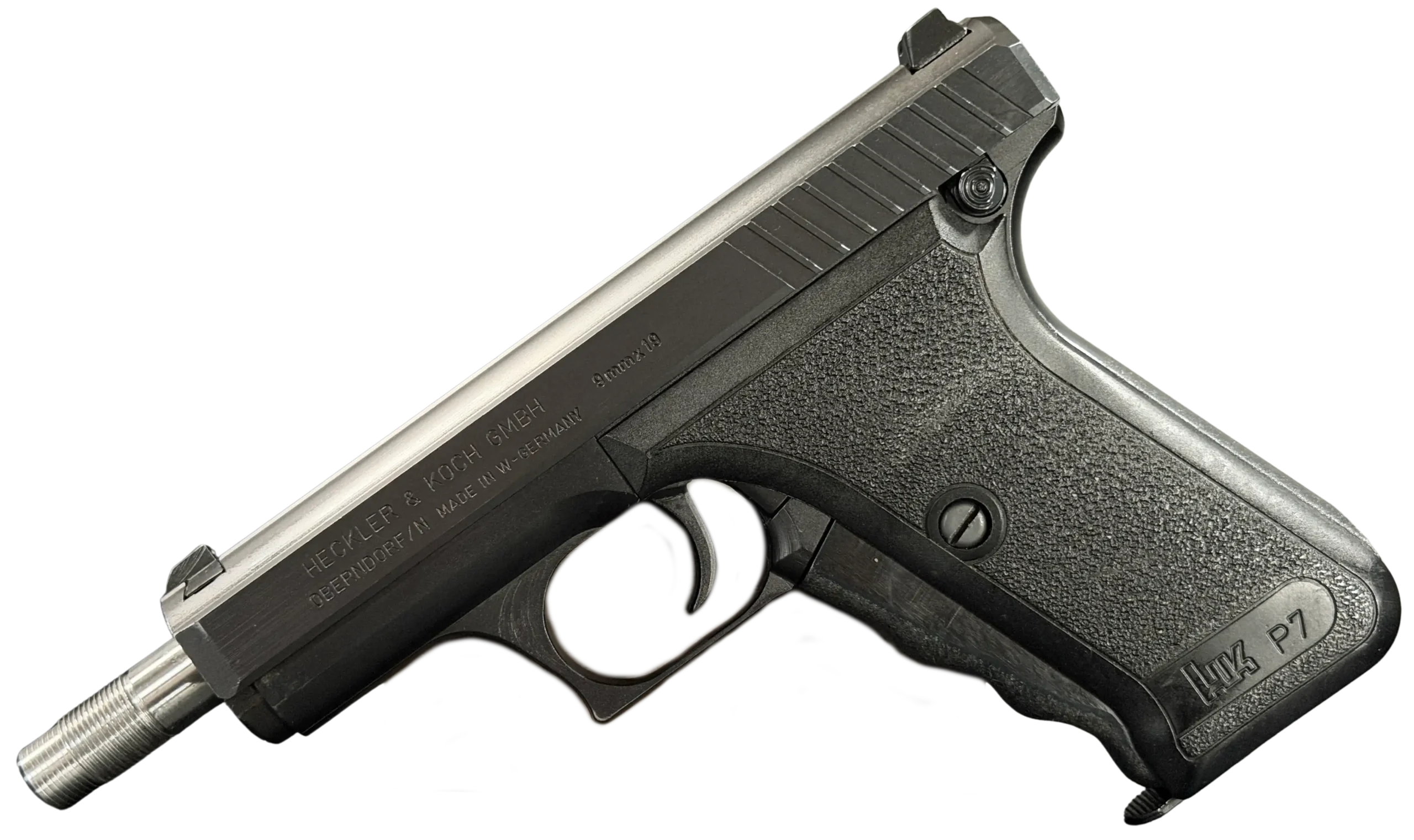 The Heckler & Koch P7 is one of the most distinctive pistol designs of its era, known for its innovative engineering and unmistakable profile. This Heckler & Koch P7SD configuration features a threaded barrel extension and the hallmark squeeze-cocker mechanism integrated into the front strap.