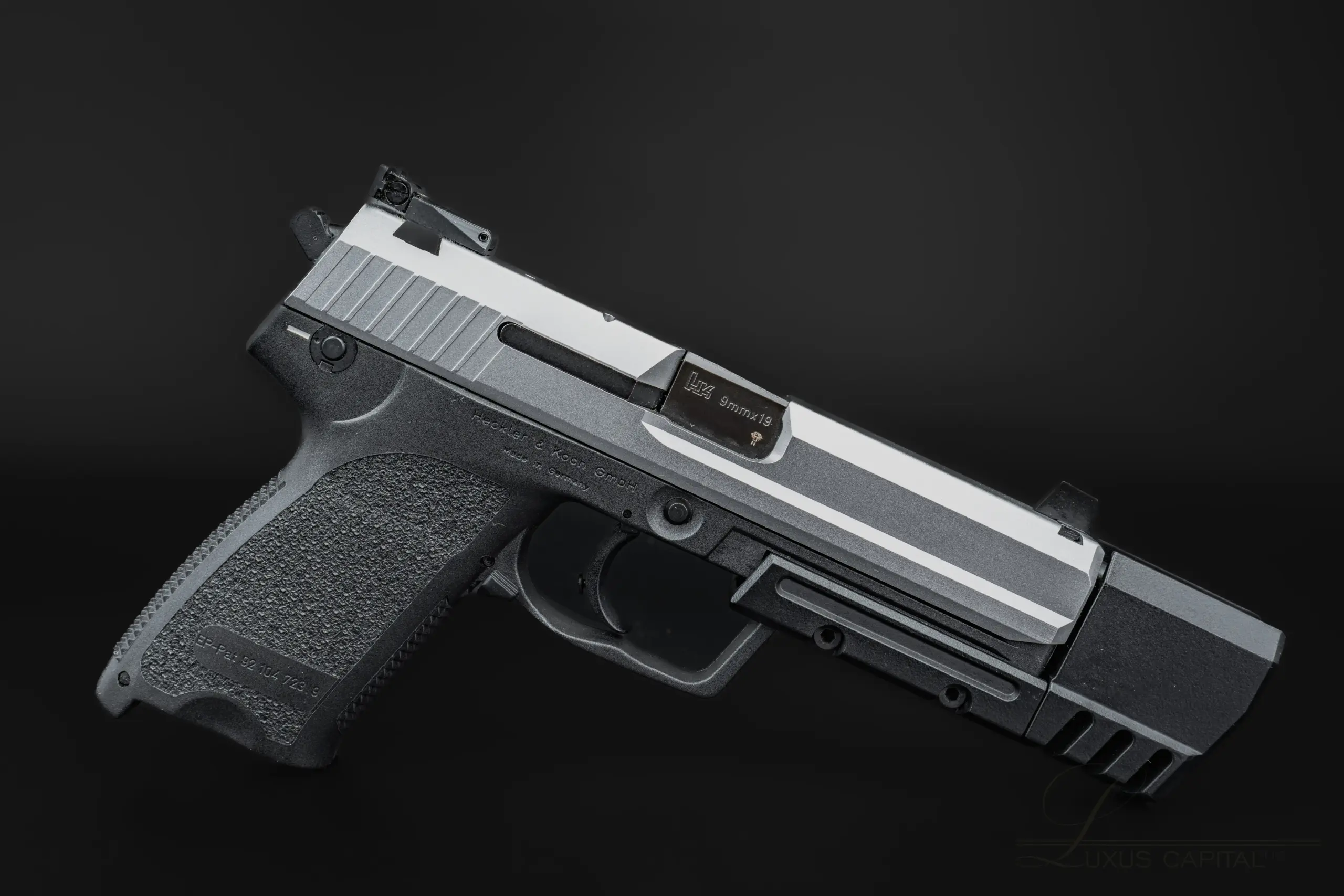 This example retains the familiar USP ergonomics, including textured grip panels, intuitive controls, and adjustable target sights. The added forward weight and compensator assembly are central to the Match configuration, giving the pistol its distinctive appearance and specialized setup.