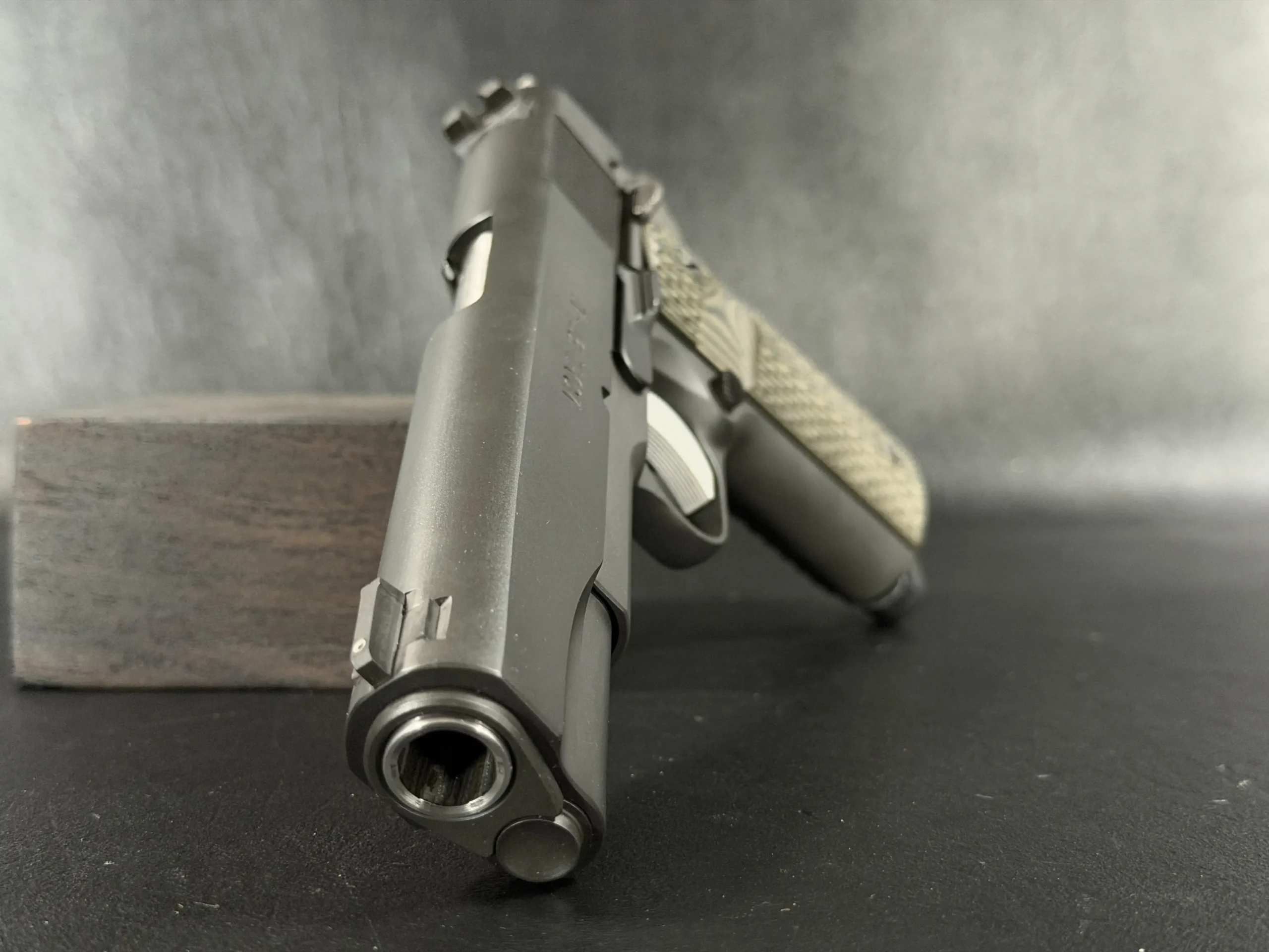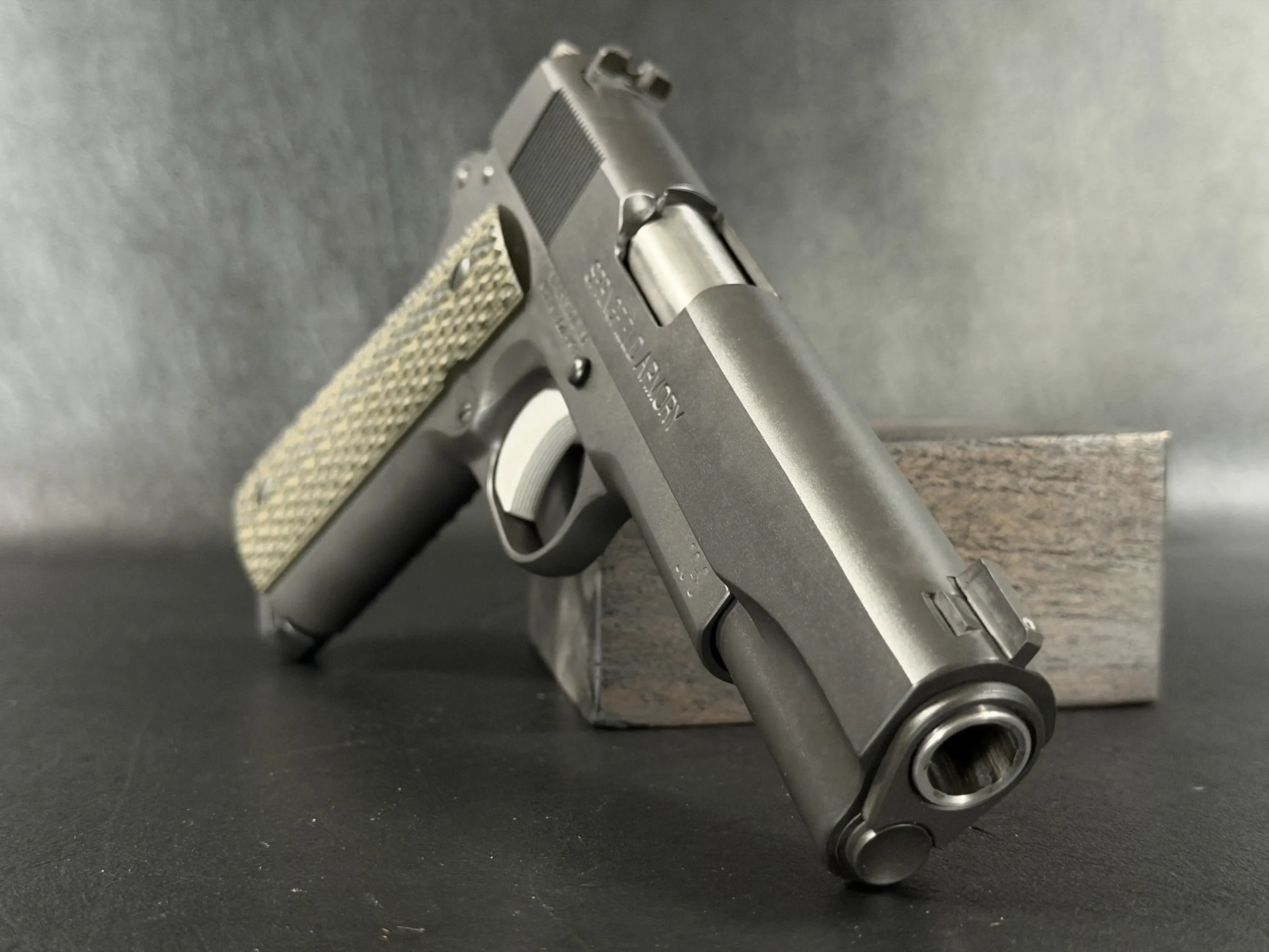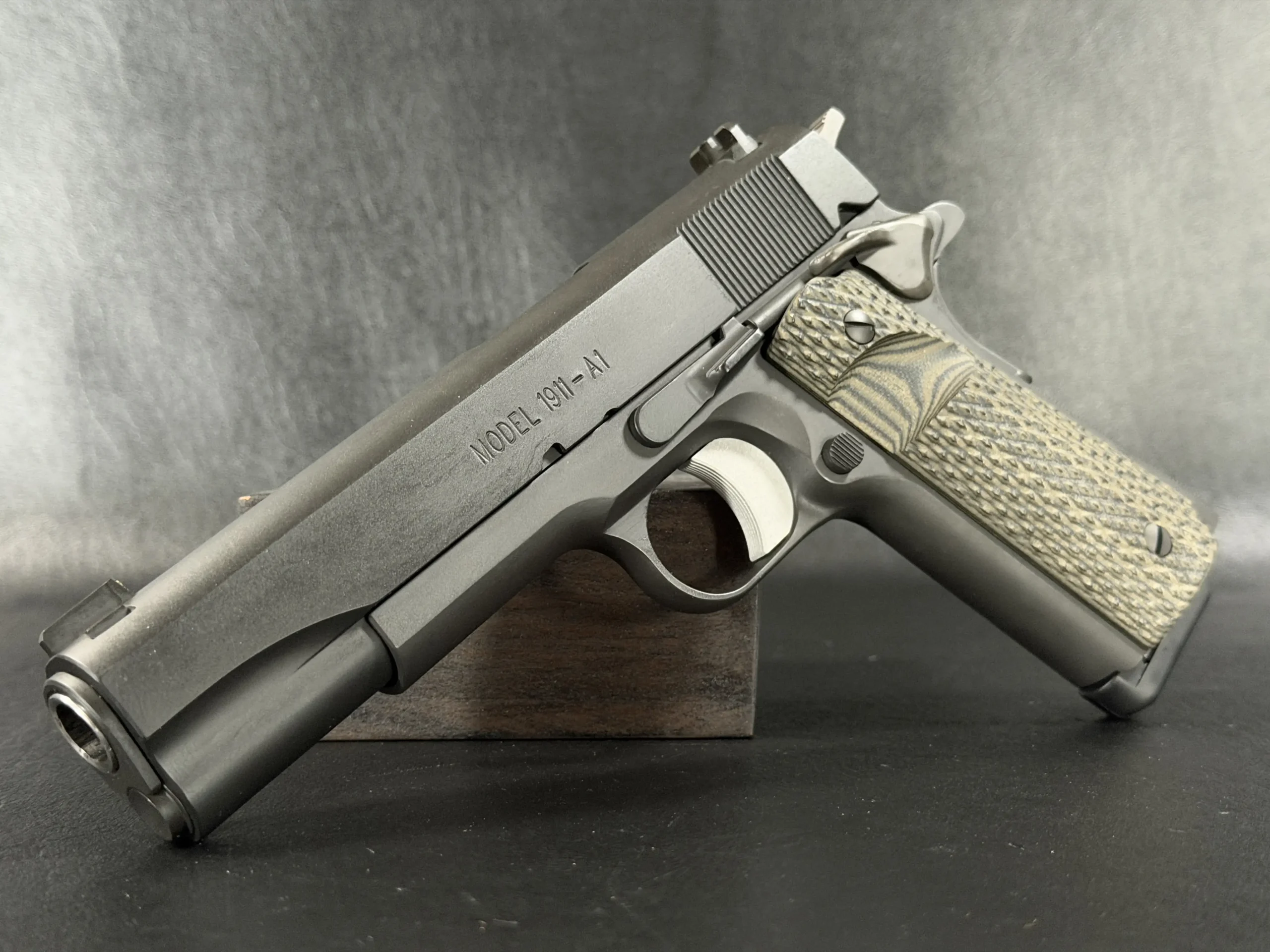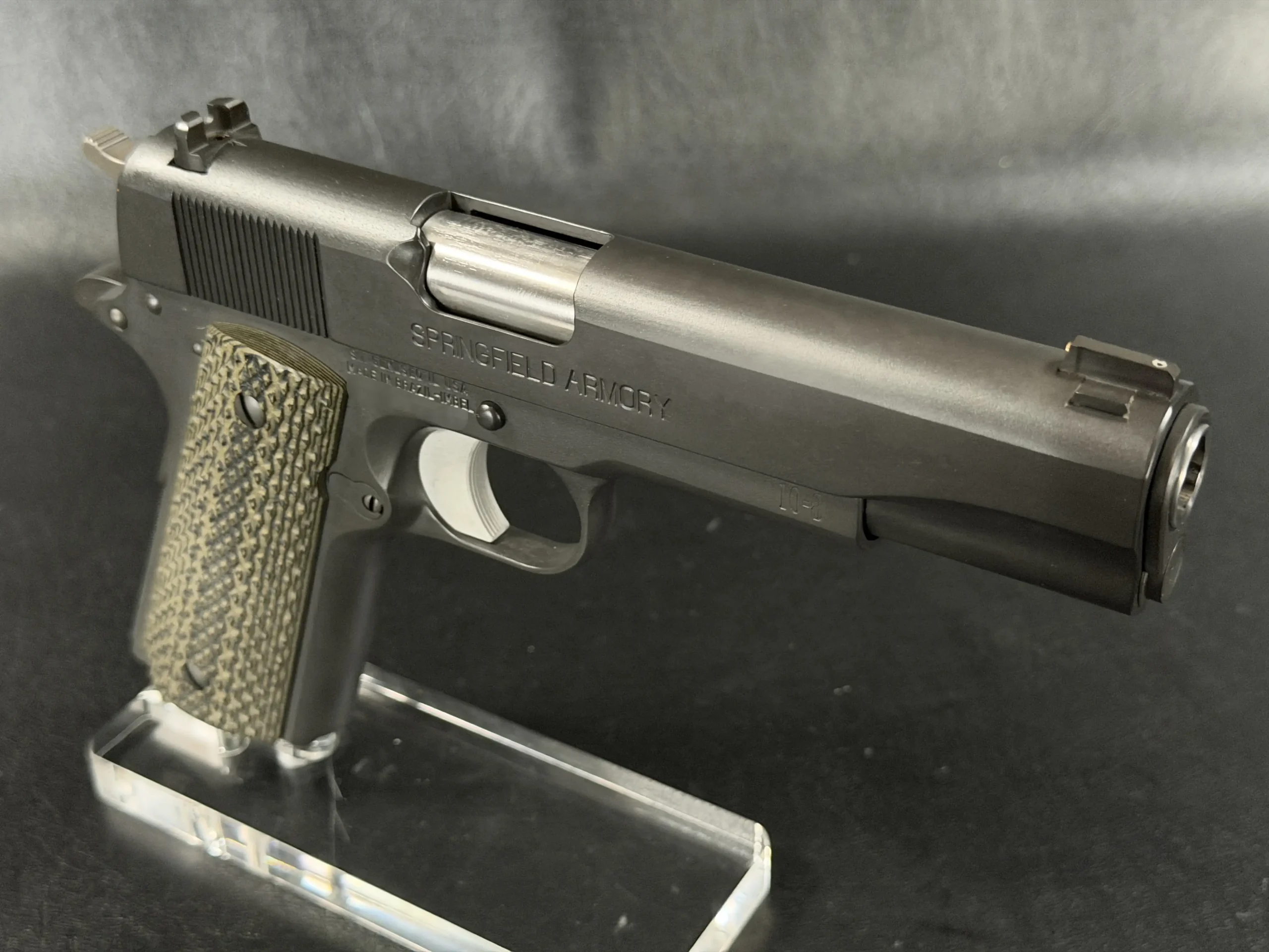 Internal parts include an EGW tool steel sear, Wilson Combat Bulletproof extractor and firing pin stop, Ed Brown ejector and mainspring housing, and a Wolff spring system tuned for reliability. Dirty Olive 10-8 grip panels complete the build with a functional, understated finish.