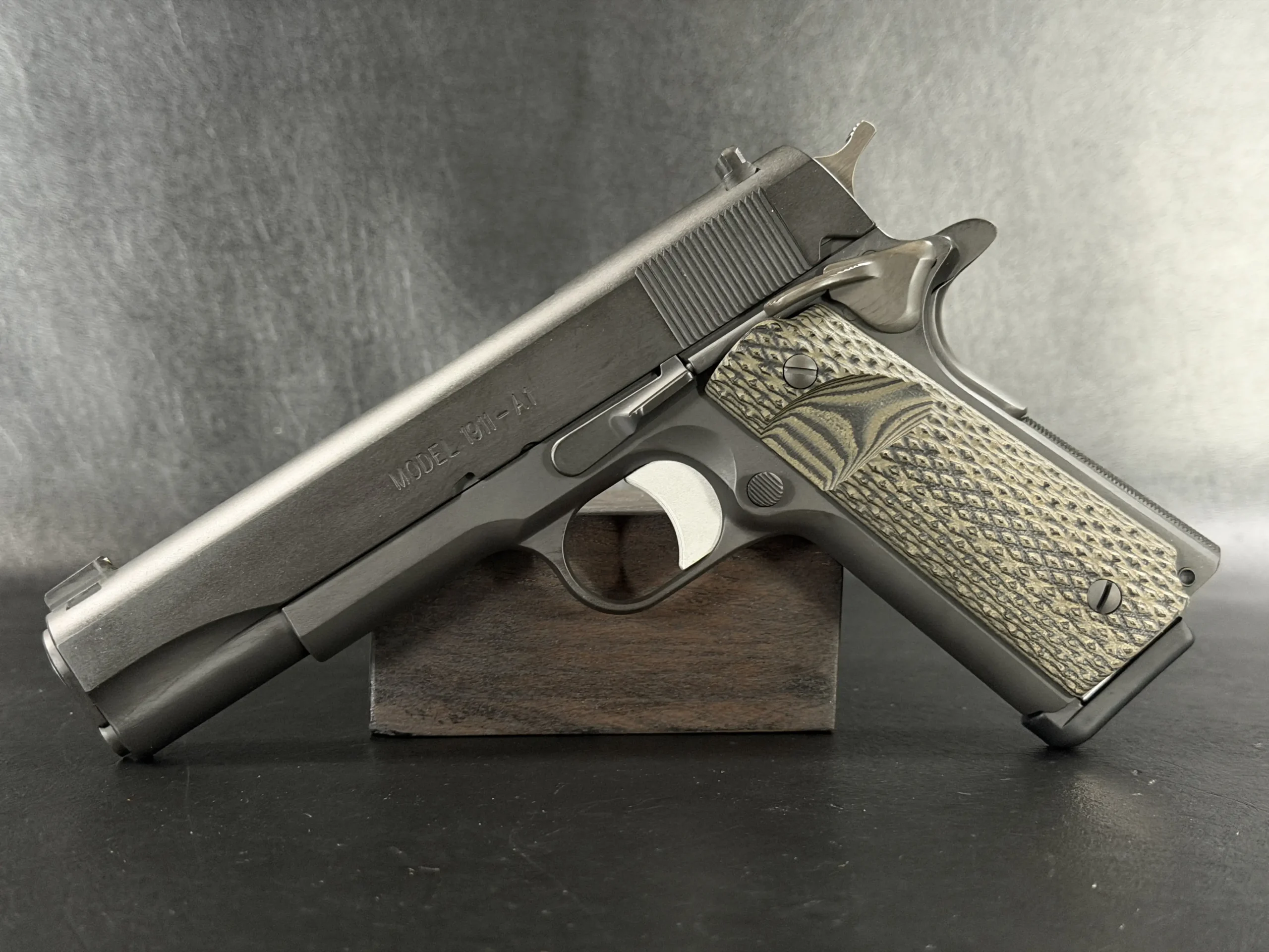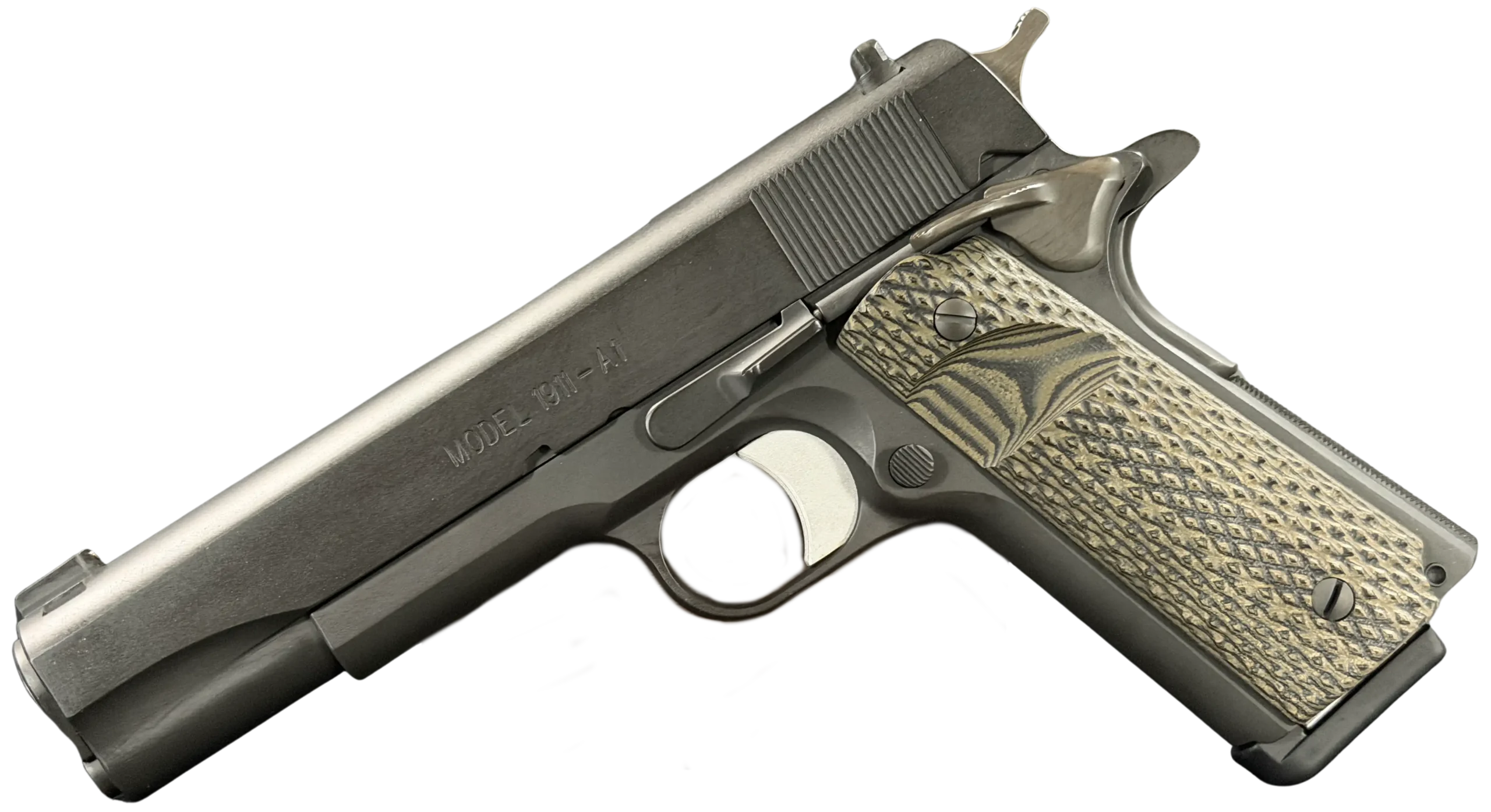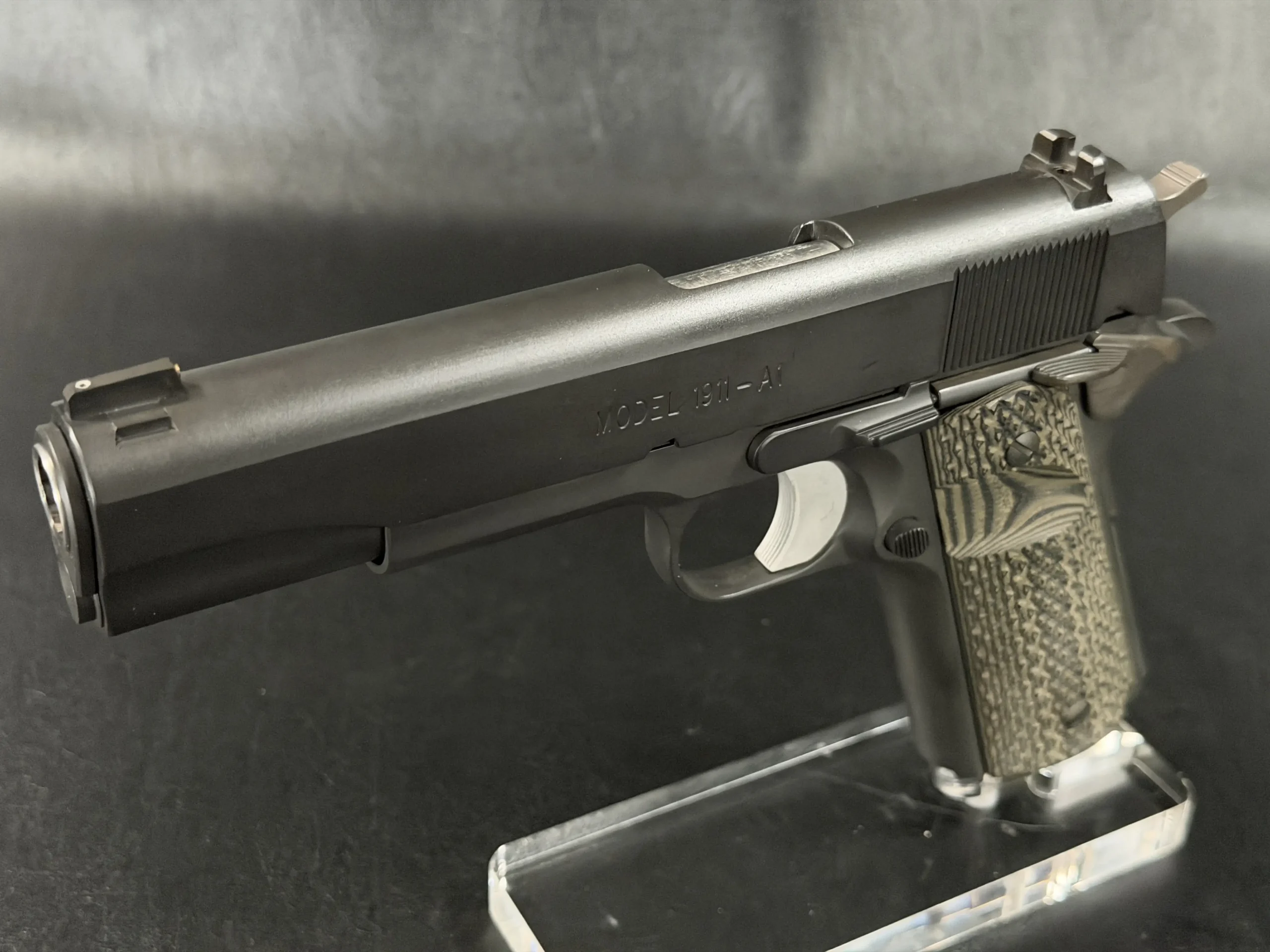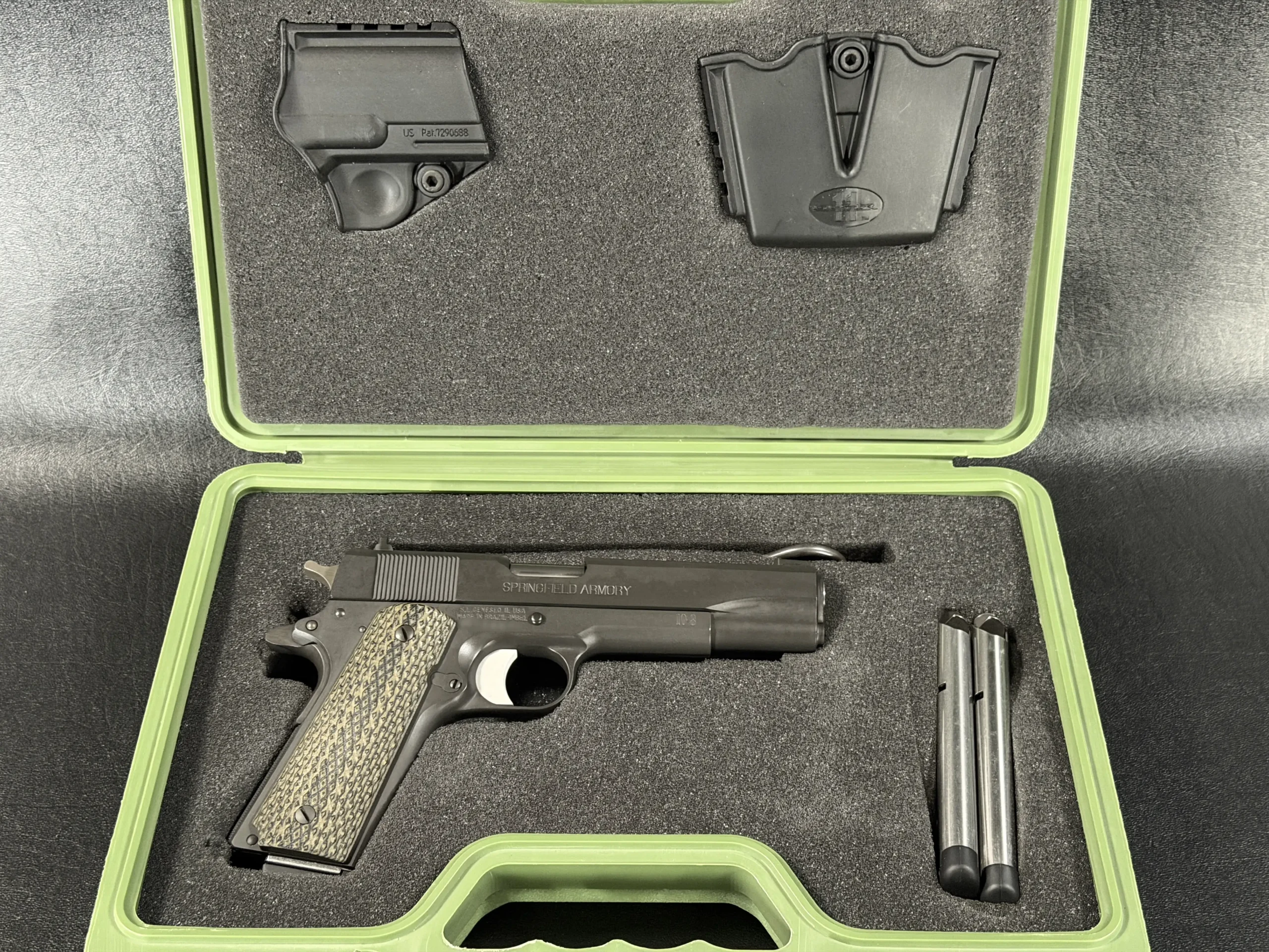 Internal parts include an EGW tool steel sear, Wilson Combat Bulletproof extractor and firing pin stop, Ed Brown ejector and mainspring housing, and a Wolff spring system tuned for reliability. Dirty Olive 10-8 grip panels complete the build with a functional, understated finish.