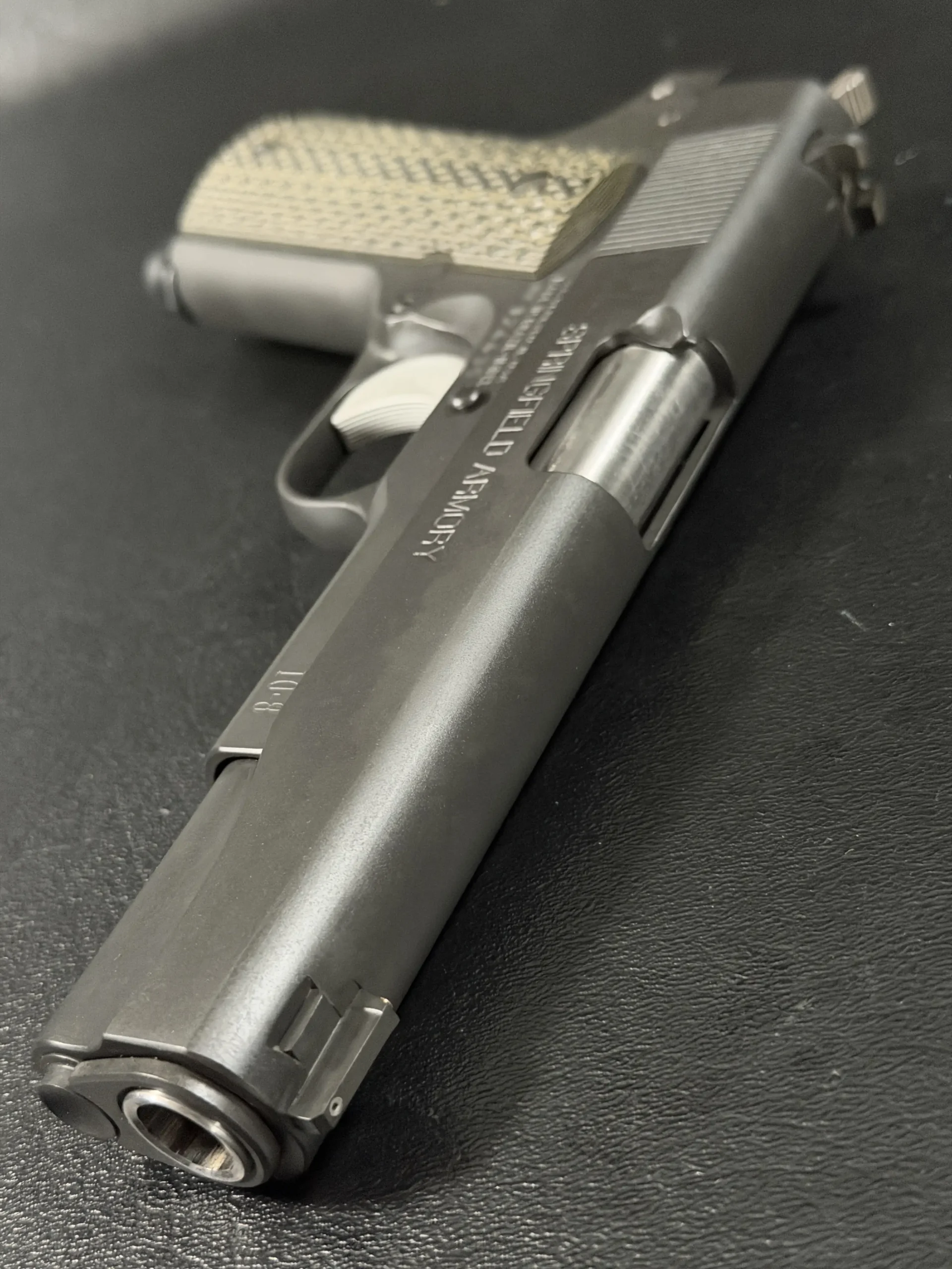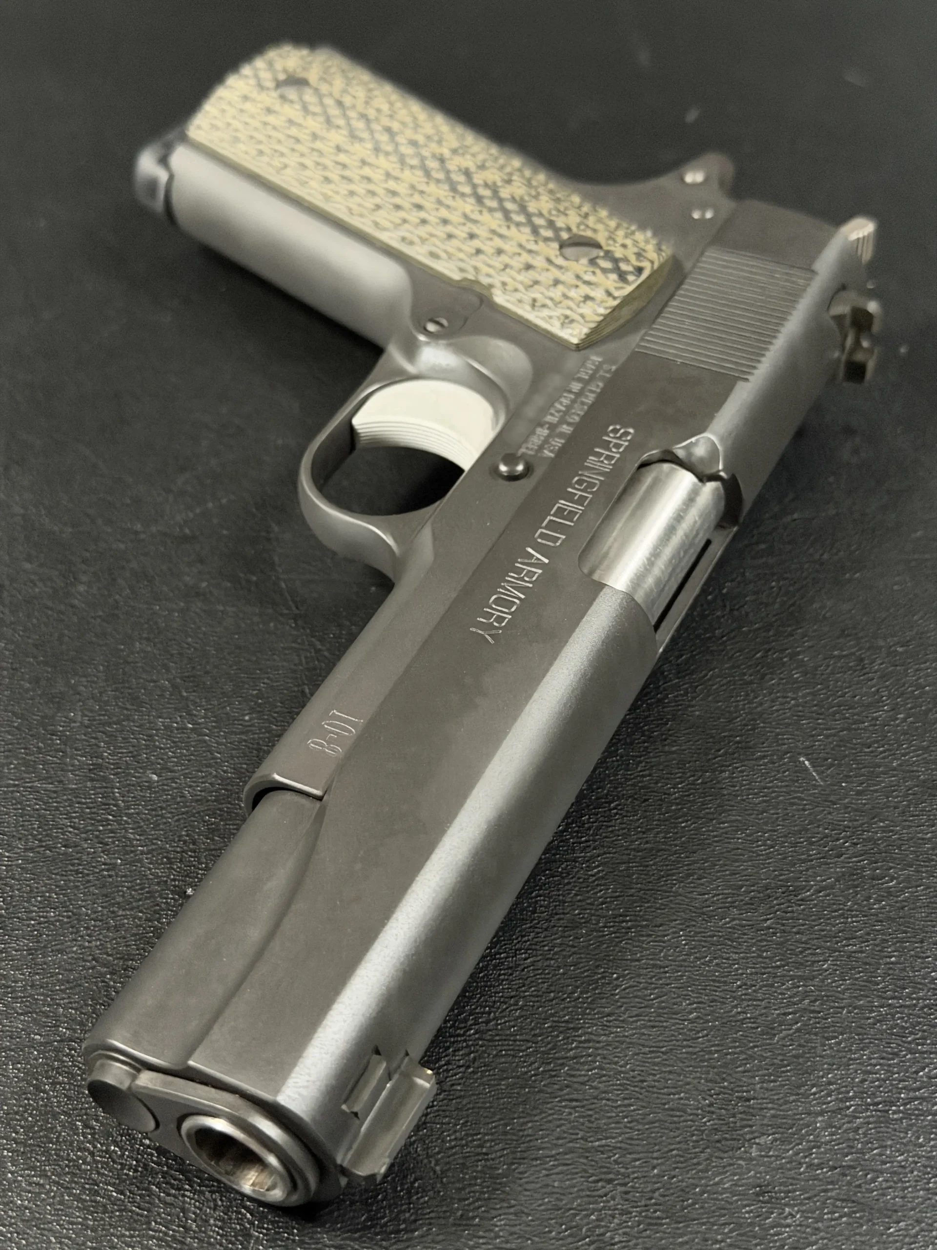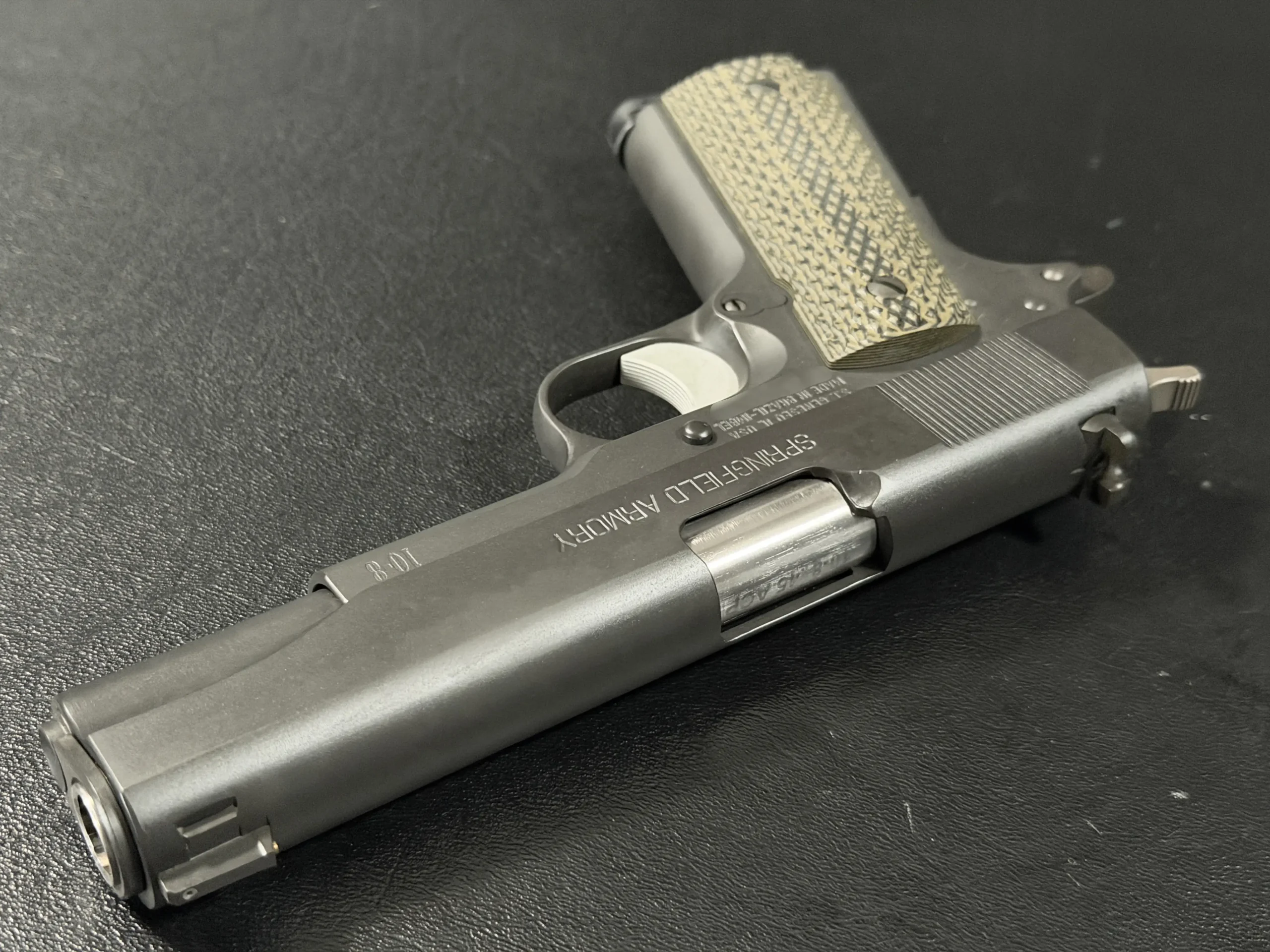 The Hilton Yam Custom “Delta” 1911 is an early 10-8 Performance Delta-series build based on a Springfield Armory WWII-spec pistol. Finished in matte manganese phosphate, it presents a subdued, purposeful look with details selected for practical function.