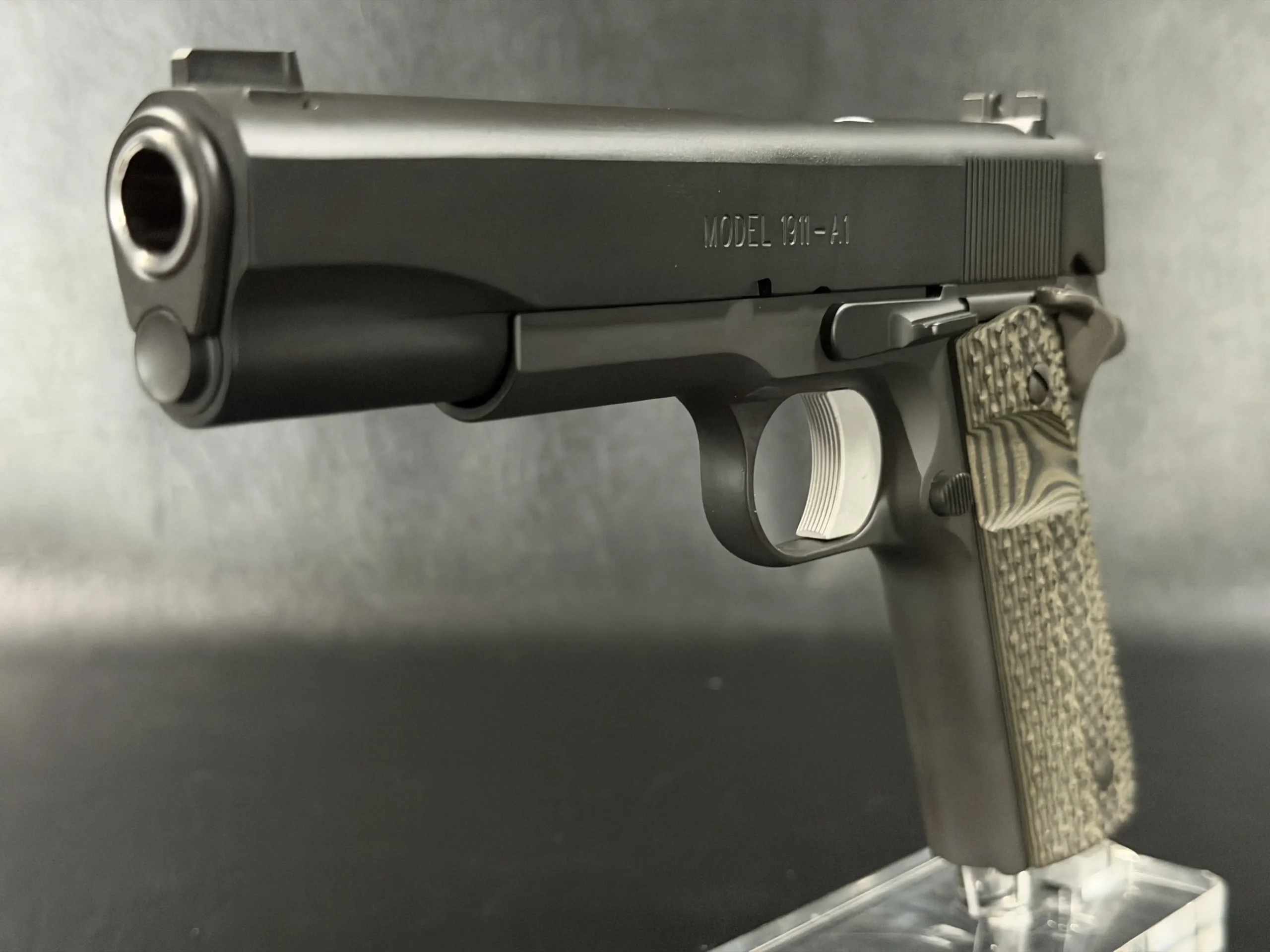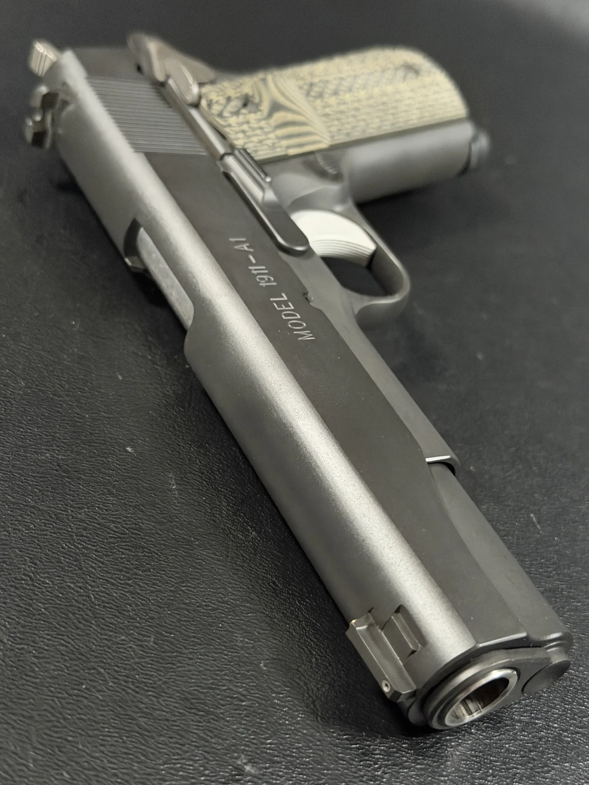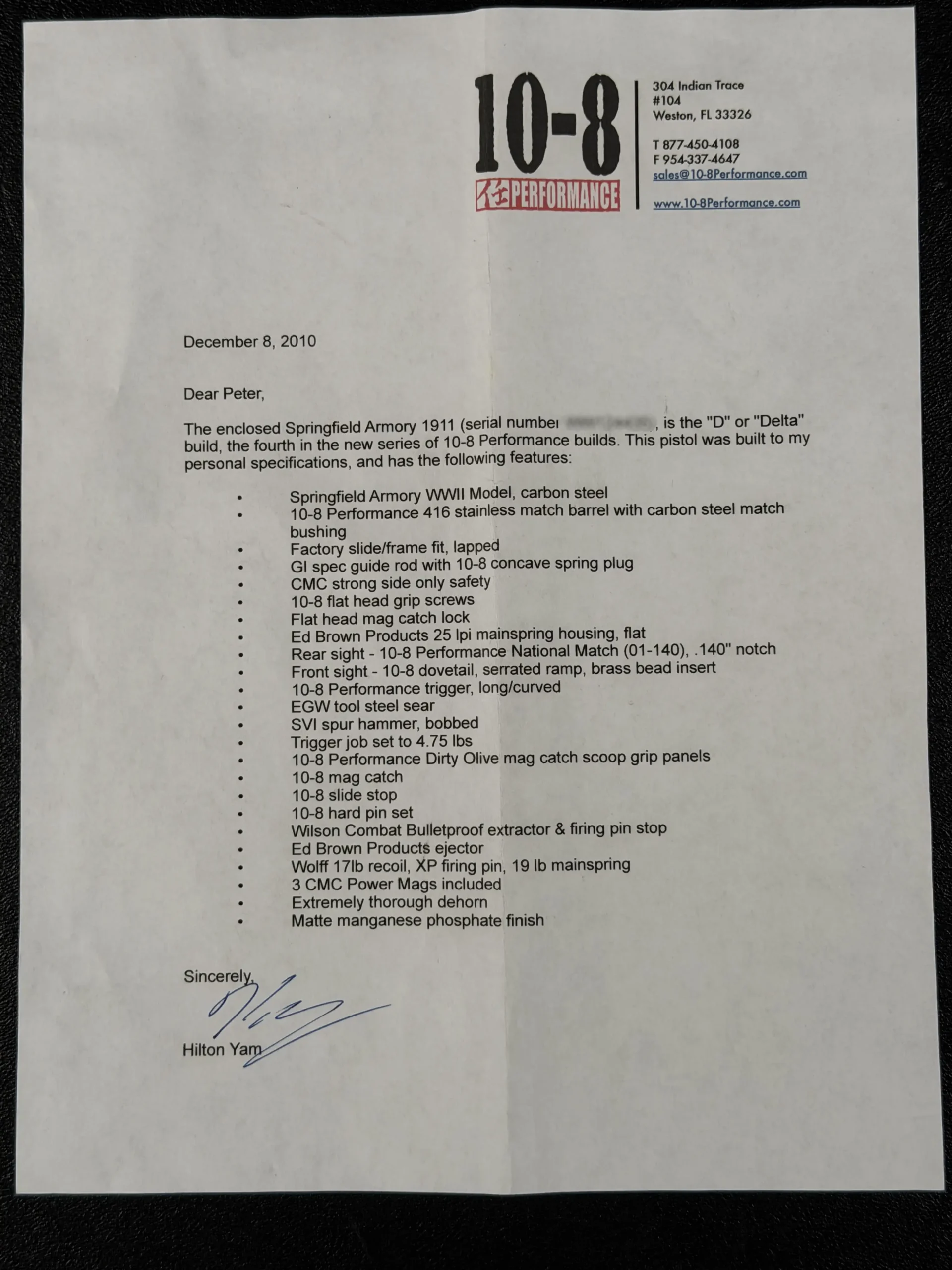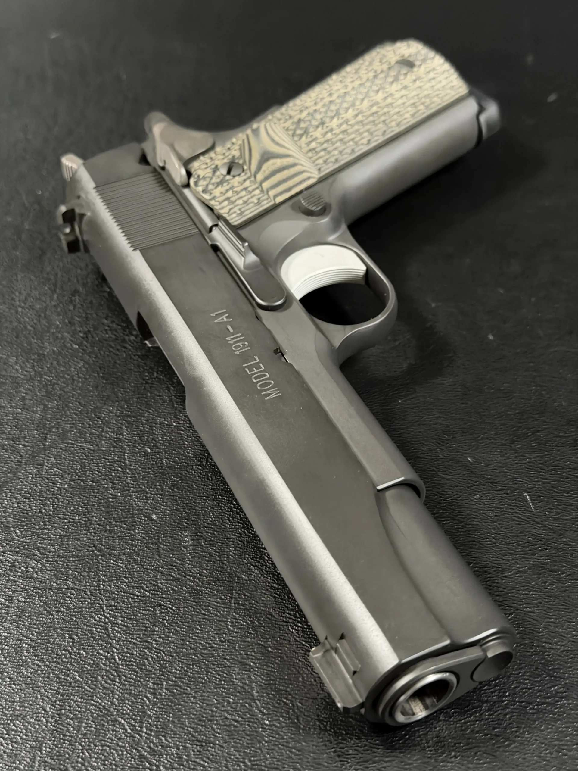 The Hilton Yam Custom “Delta” 1911 is an early 10-8 Performance Delta-series build based on a Springfield Armory WWII-spec pistol. Finished in matte manganese phosphate, it presents a subdued, purposeful look with details selected for practical function.