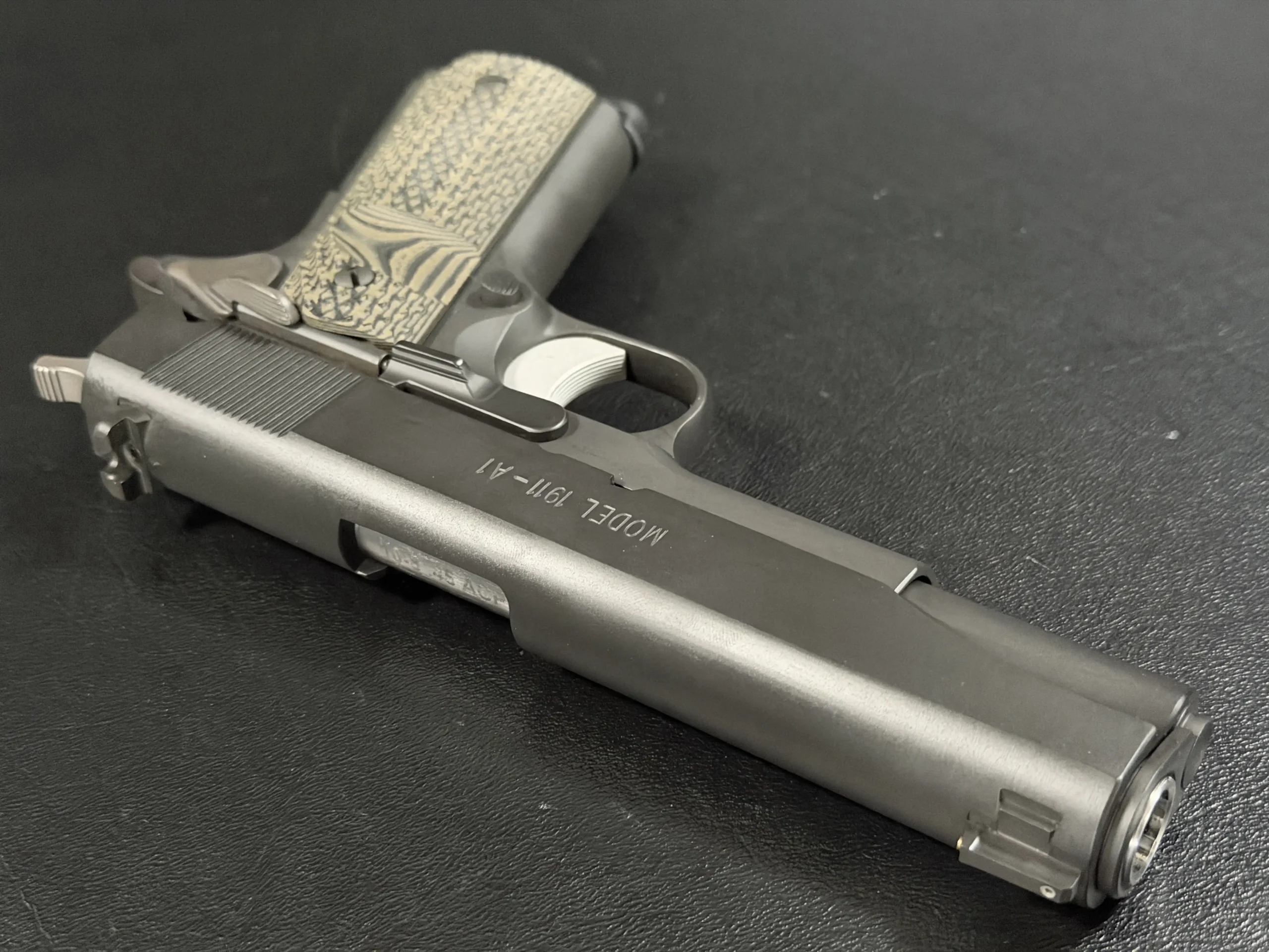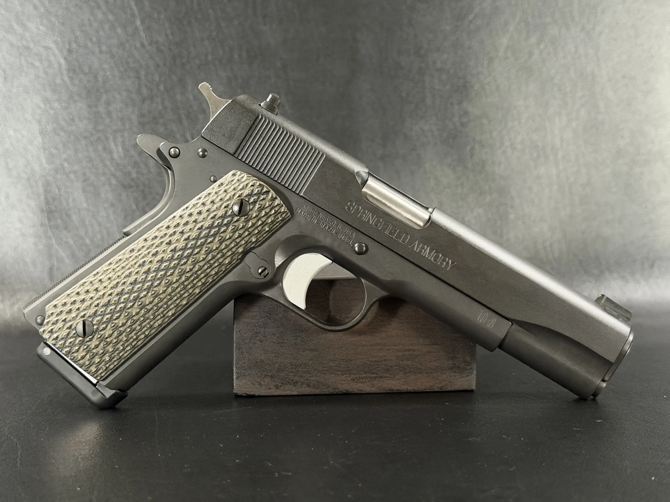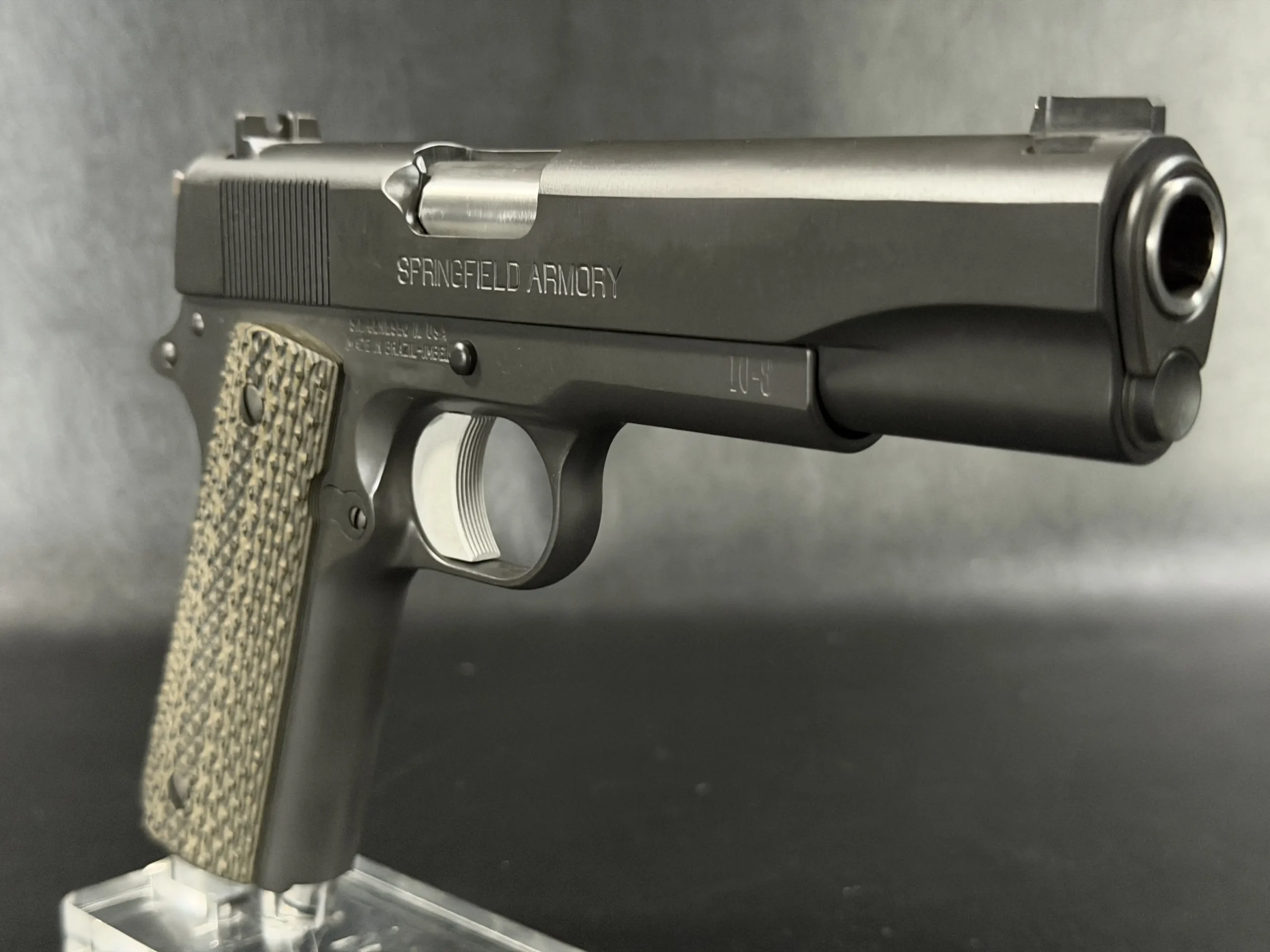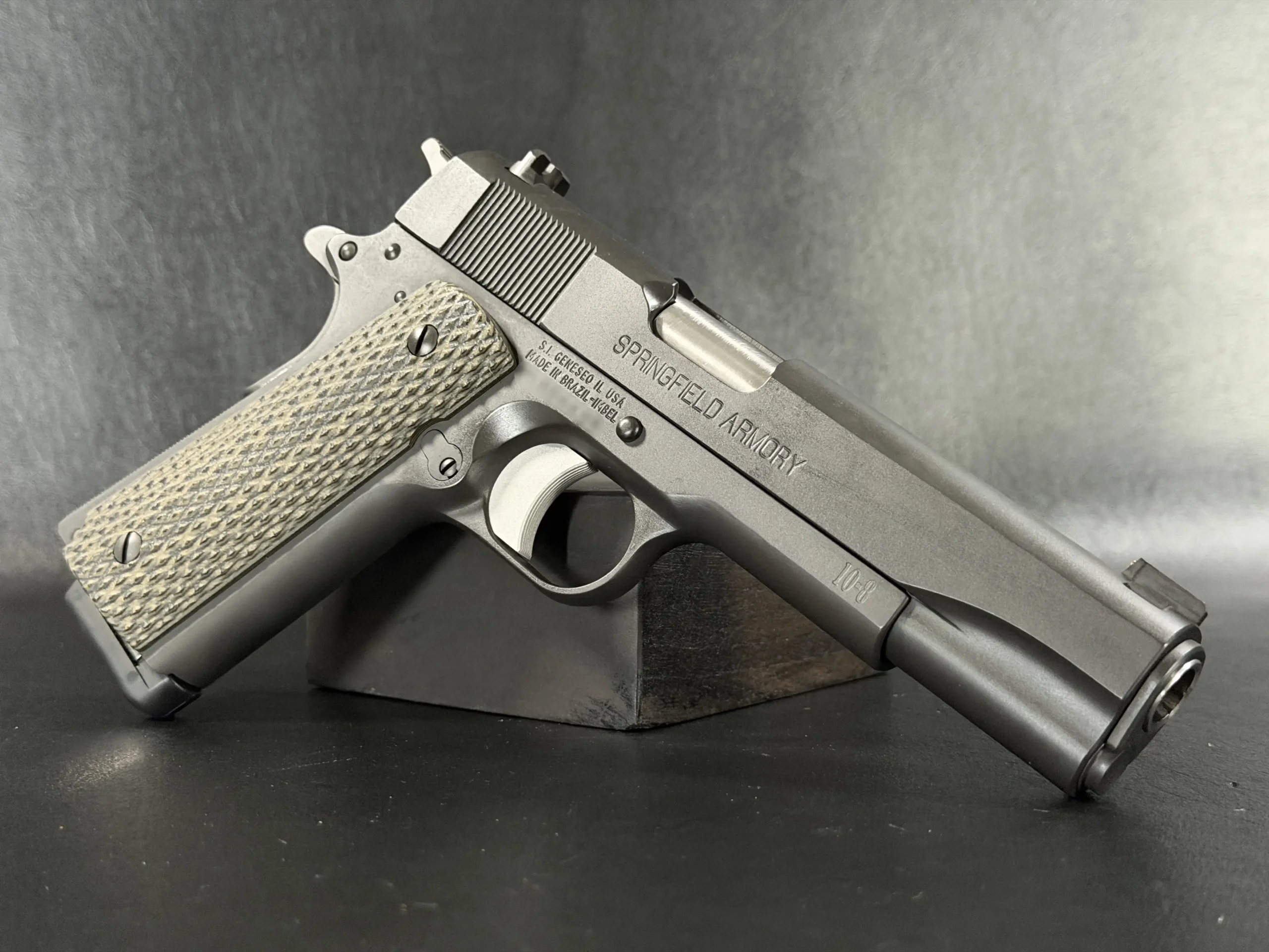 Sight configuration includes a 10-8 rear sight with a .140" notch and a serrated ramp front sight with a brass bead. A GI-style guide rod and 10-8 concave spring plug maintain a simple, serviceable setup.