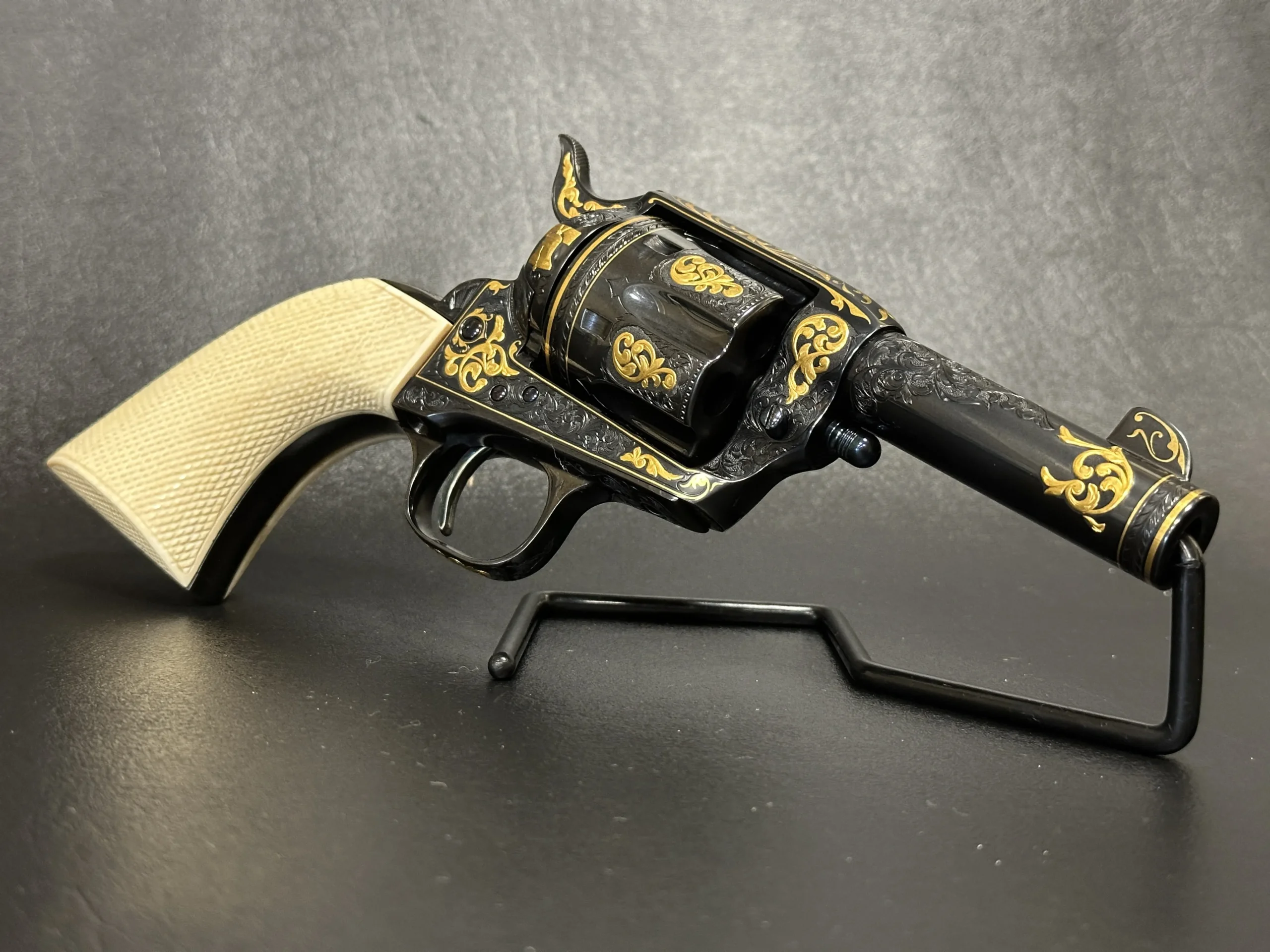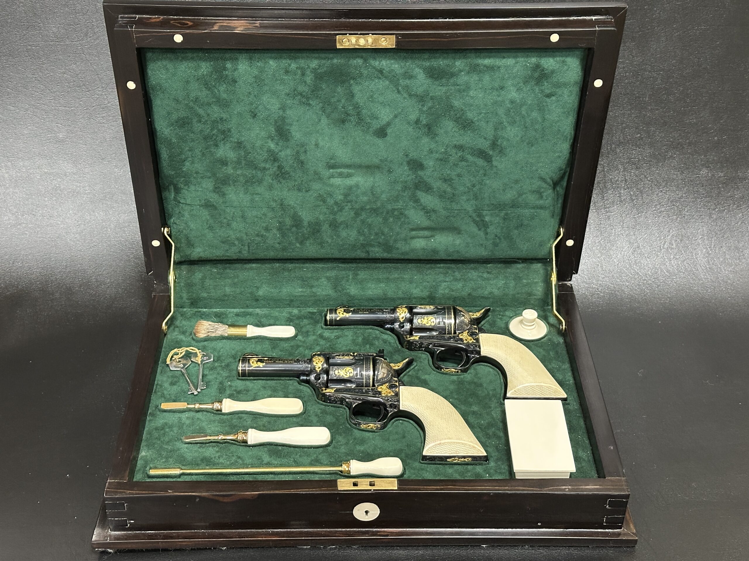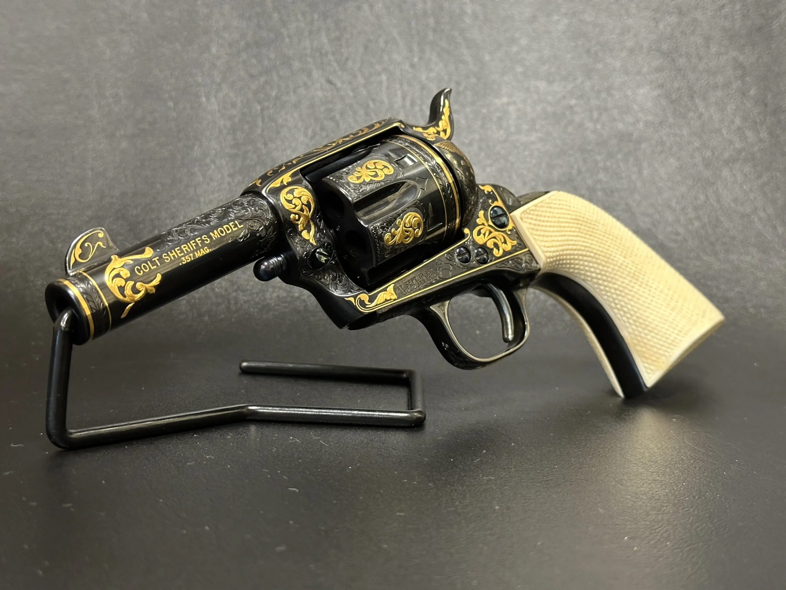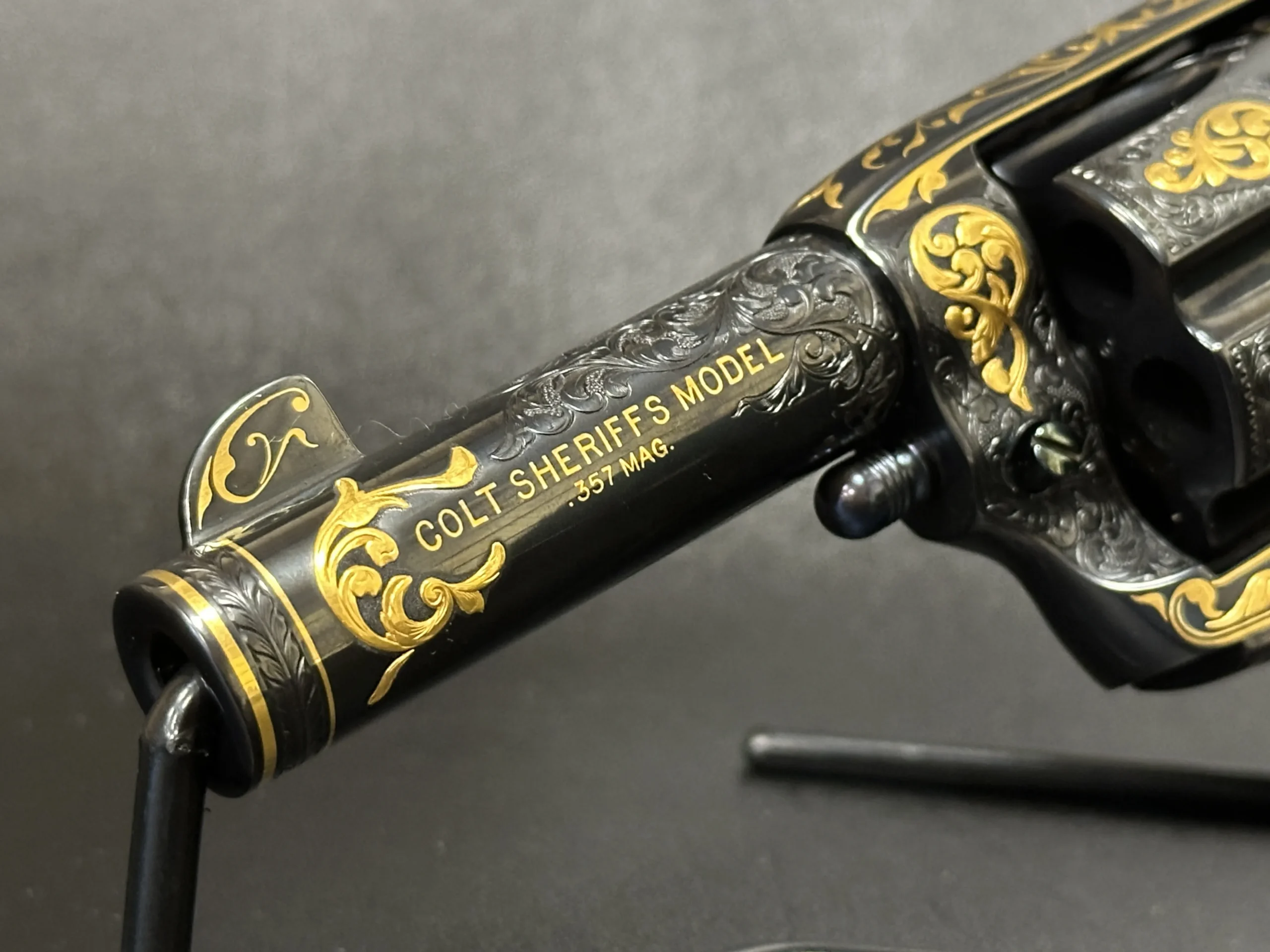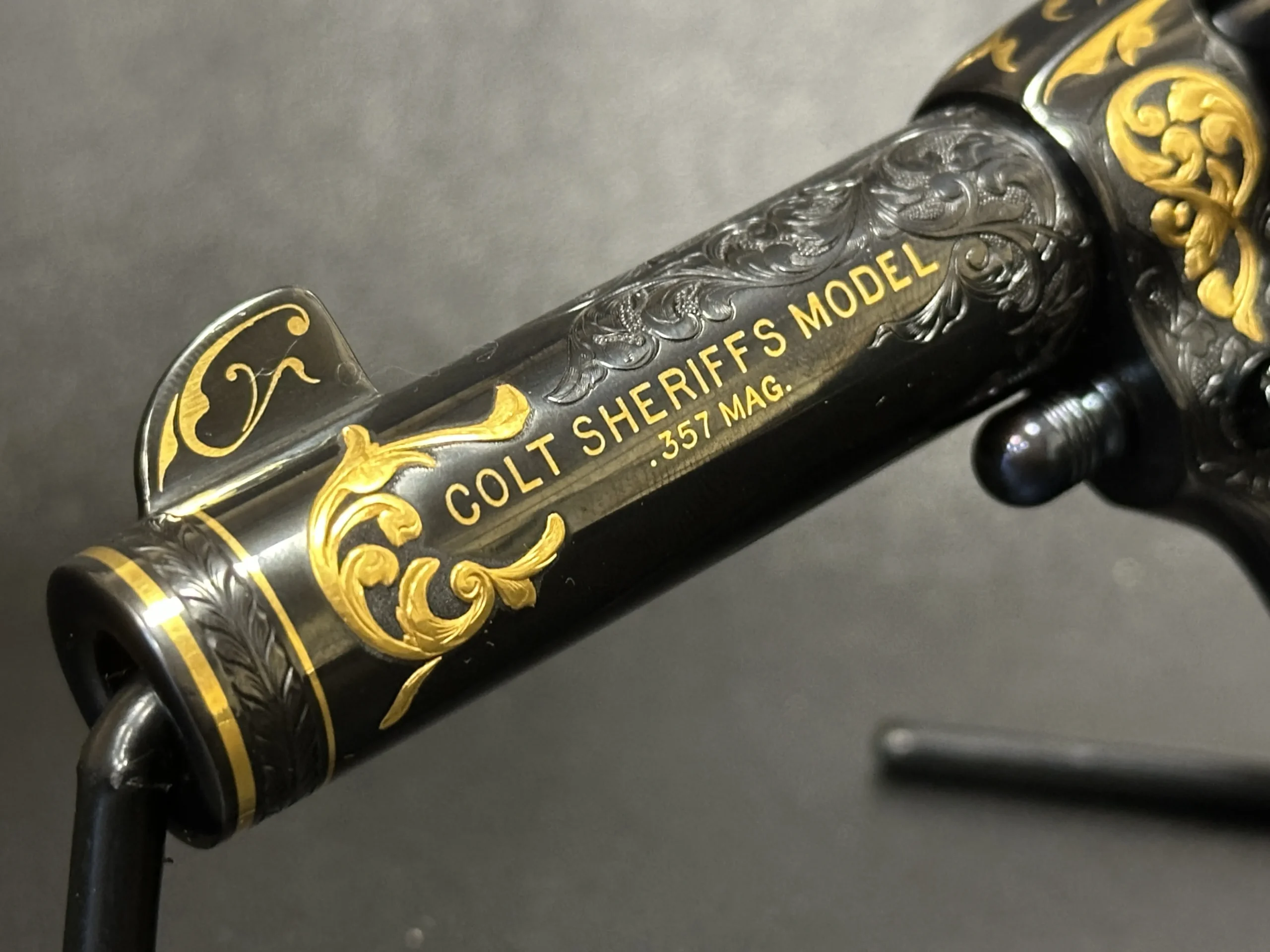 A striking cased pair of Colt Sheriff’s Model revolvers engraved by Colt Master Engraver Howard Dove, this set brings together detailed scrollwork, gold inlay, and distinctly American motifs across two finely executed revolvers.
