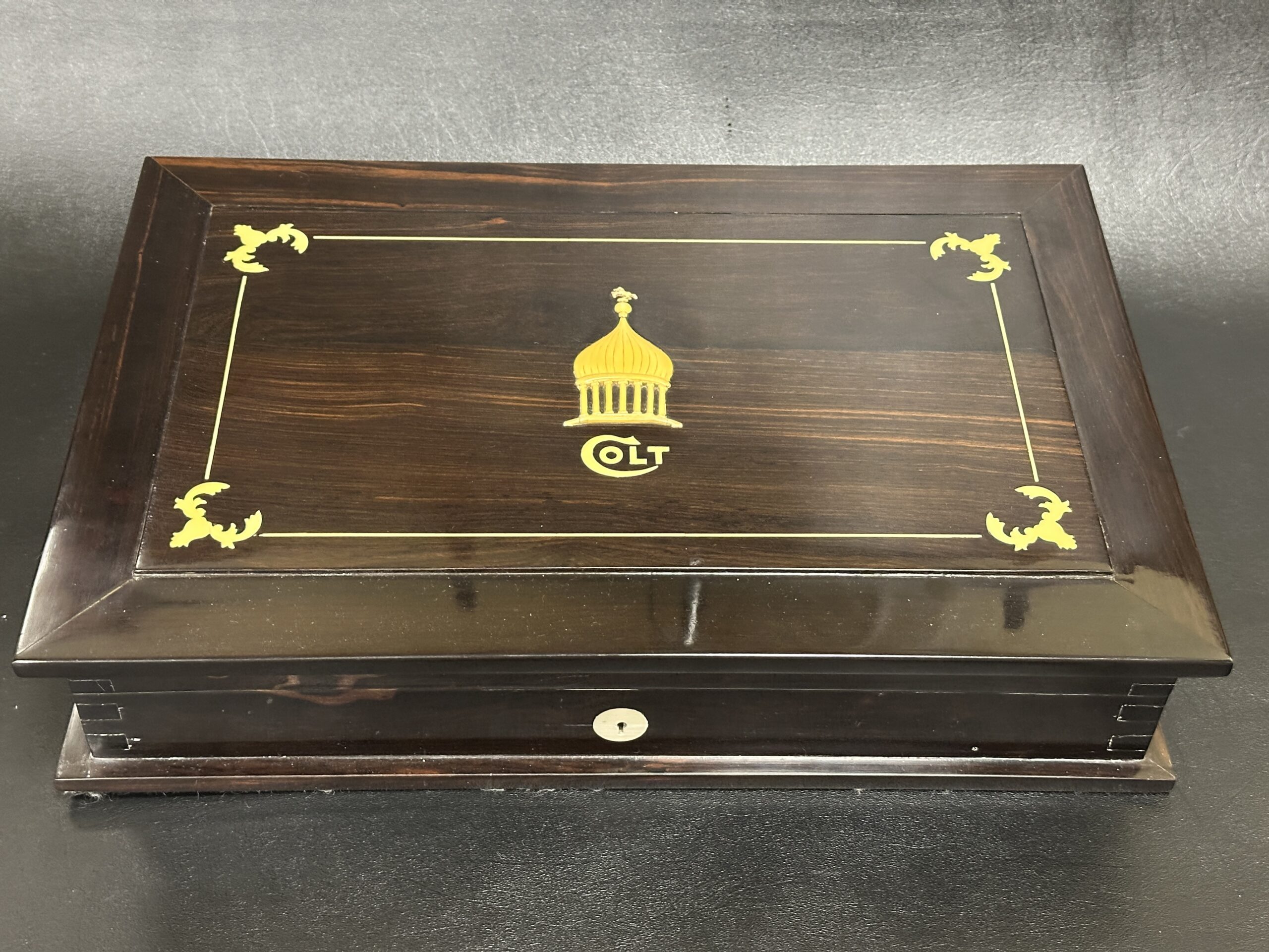 According to the included Colt factory letter, this revolver was delivered to Universal Firearms Ltd. on September 26, 1987. It is housed in a double ebony presentation case and is accompanied by original correspondence and documentation. The revolver is described as near mint, retaining over 99% of its royal blue finish.