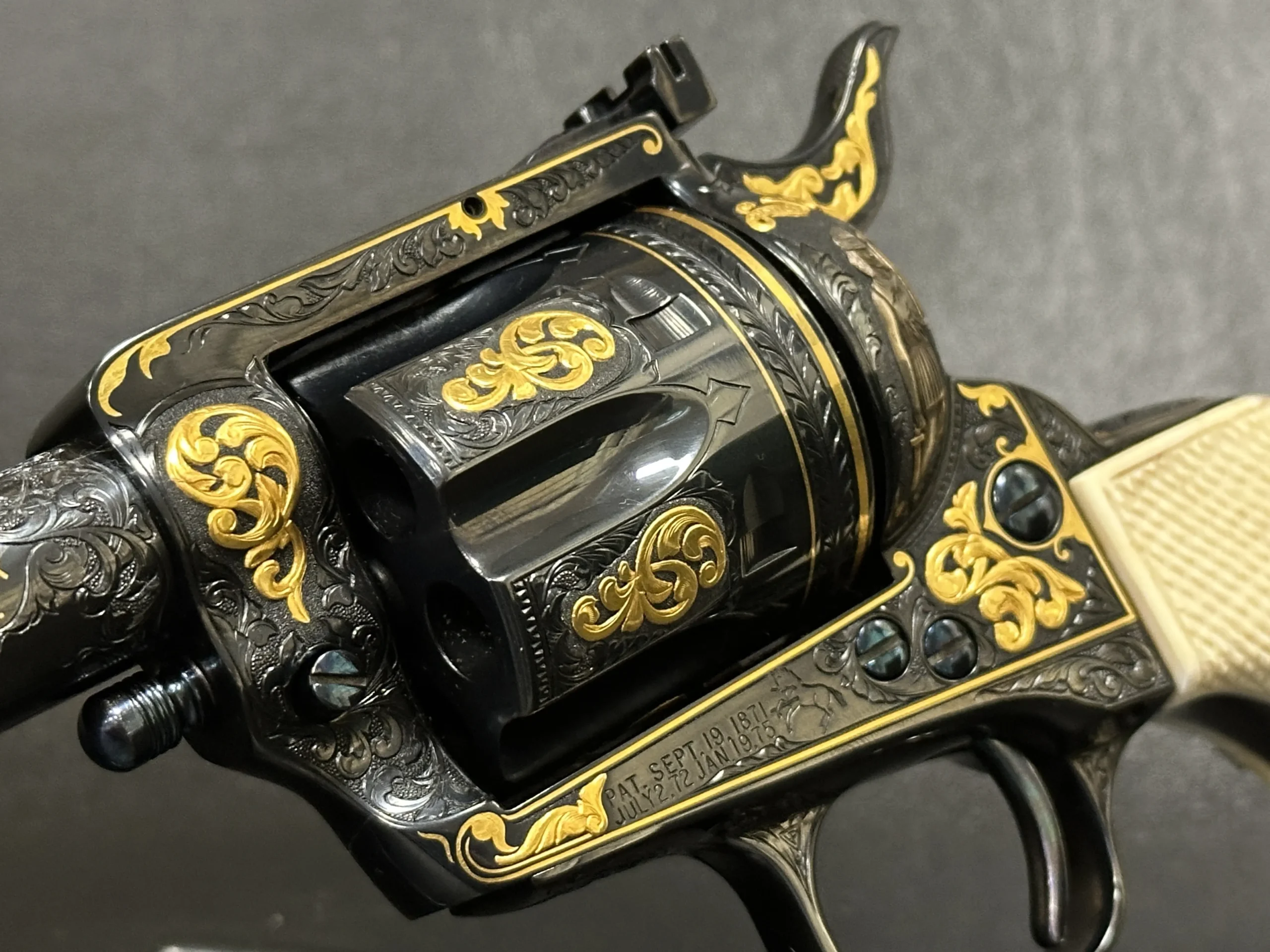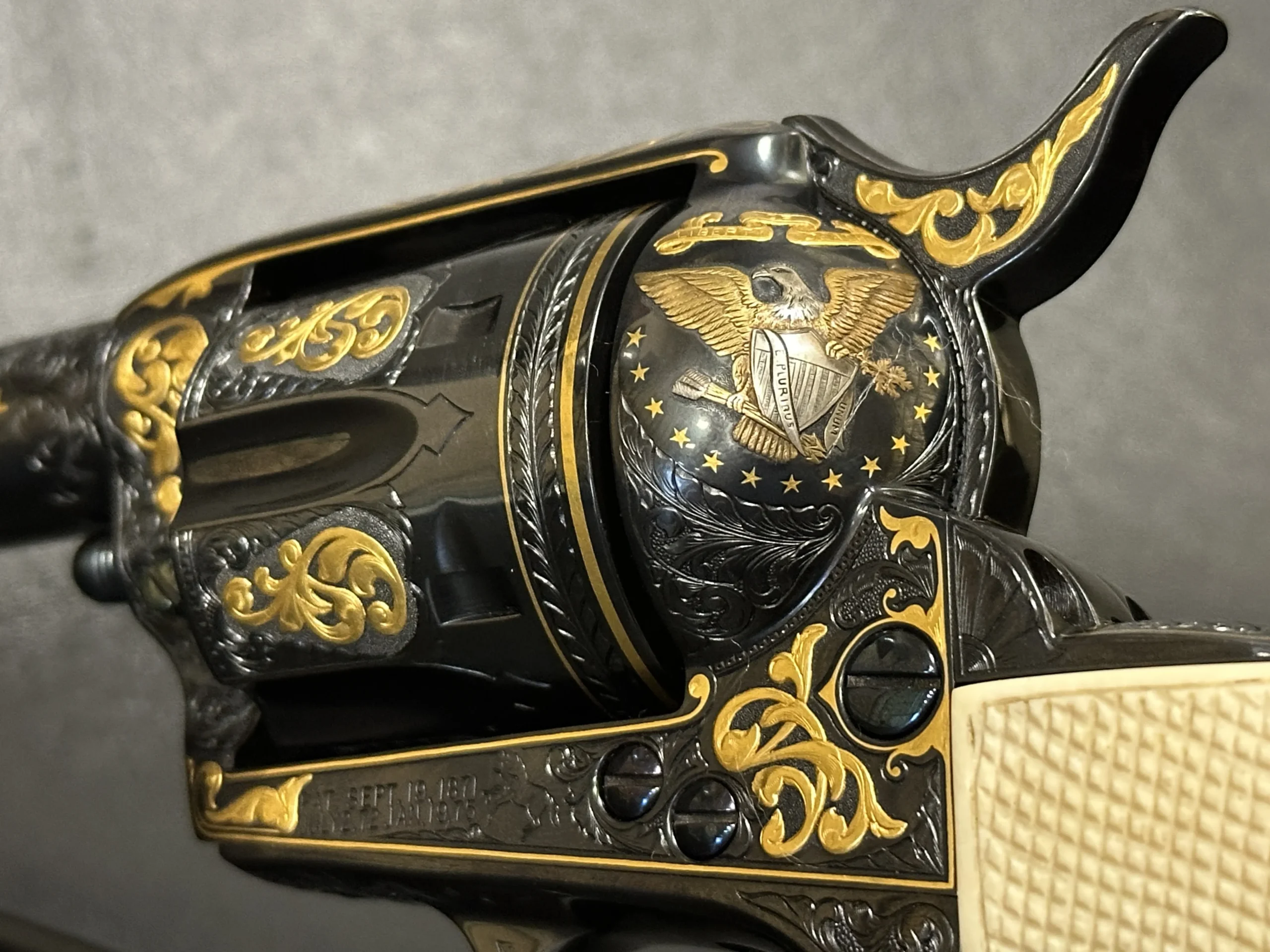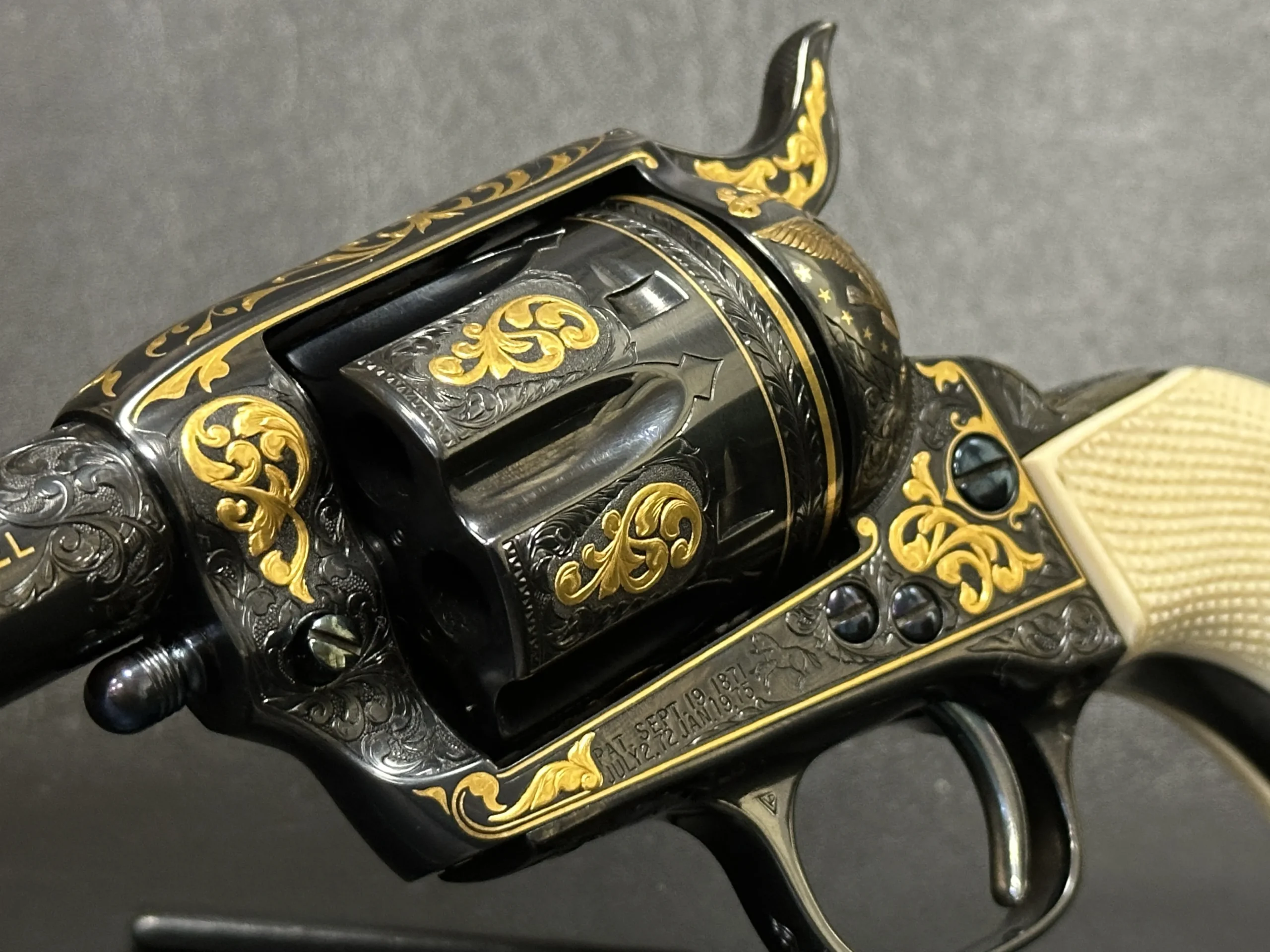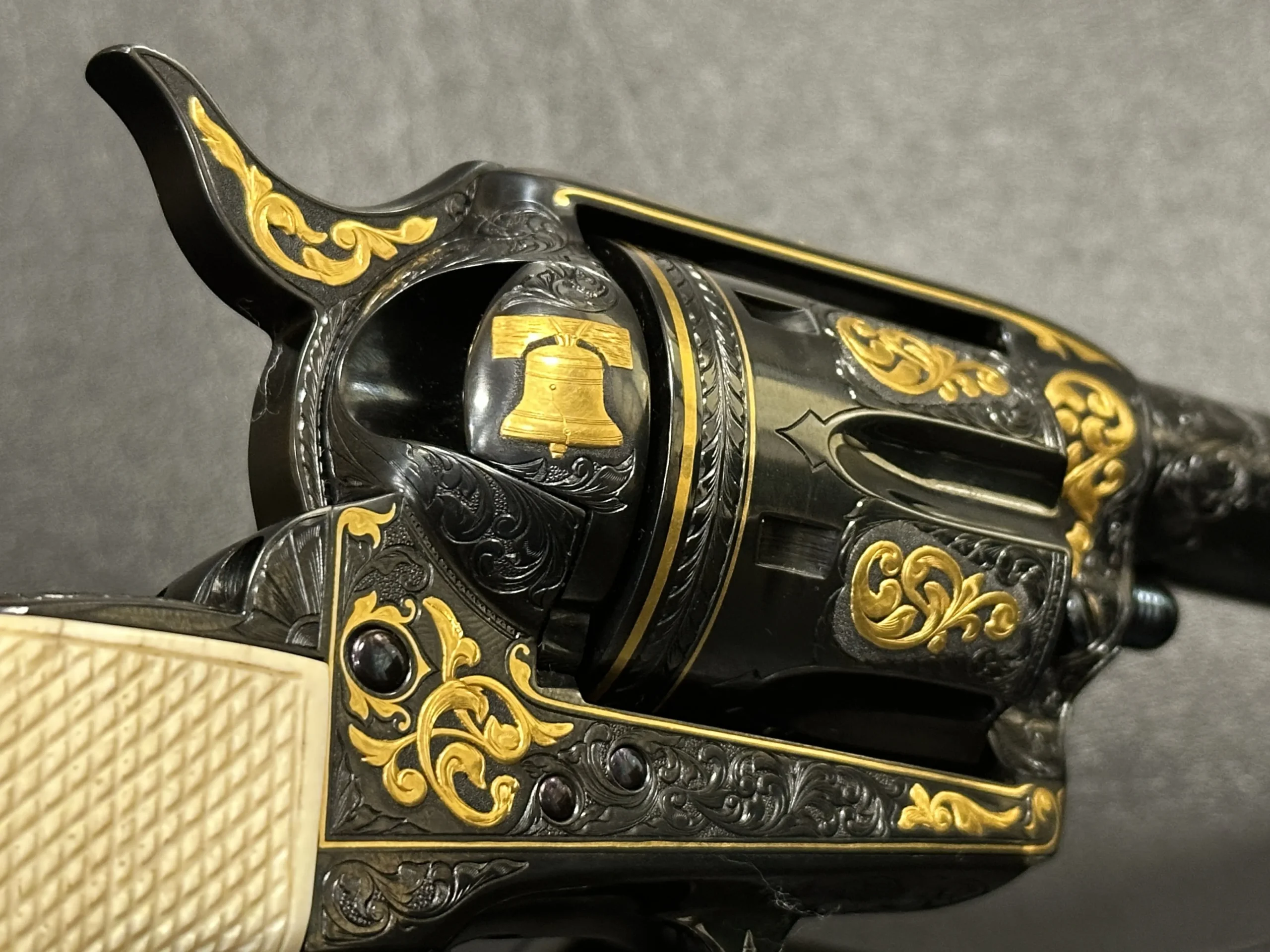 The companion revolver is a Colt Single Action Sheriff’s Model chambered in .357 Magnum. Like its counterpart, it is finished in royal blue with fire-blued accents and engraved by Howard Dove. Gold inlay on the loading gate depicts the Liberty Bell, while the recoil shield features an Eagle and Shield motif surrounded by thirteen stars and the inscription “LIBERTY OR DEATH.” Scrollwork and flush gold leaf inlays continue across the backstrap and trigger guard.