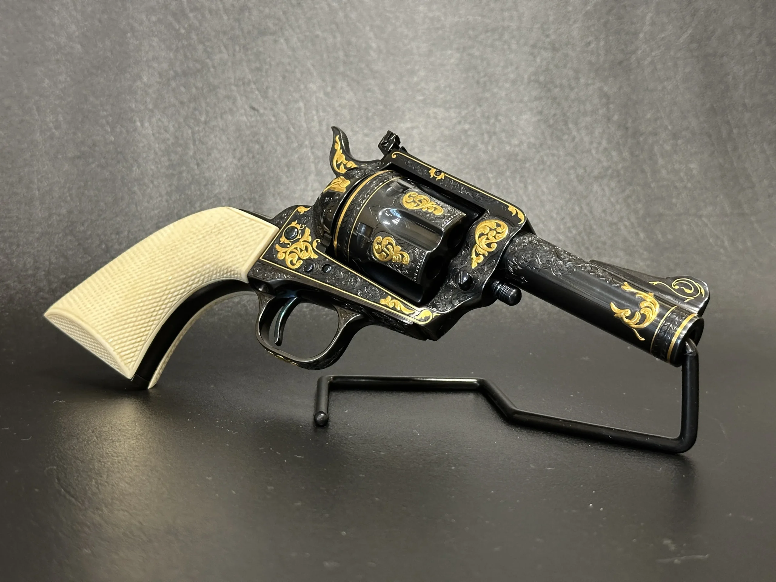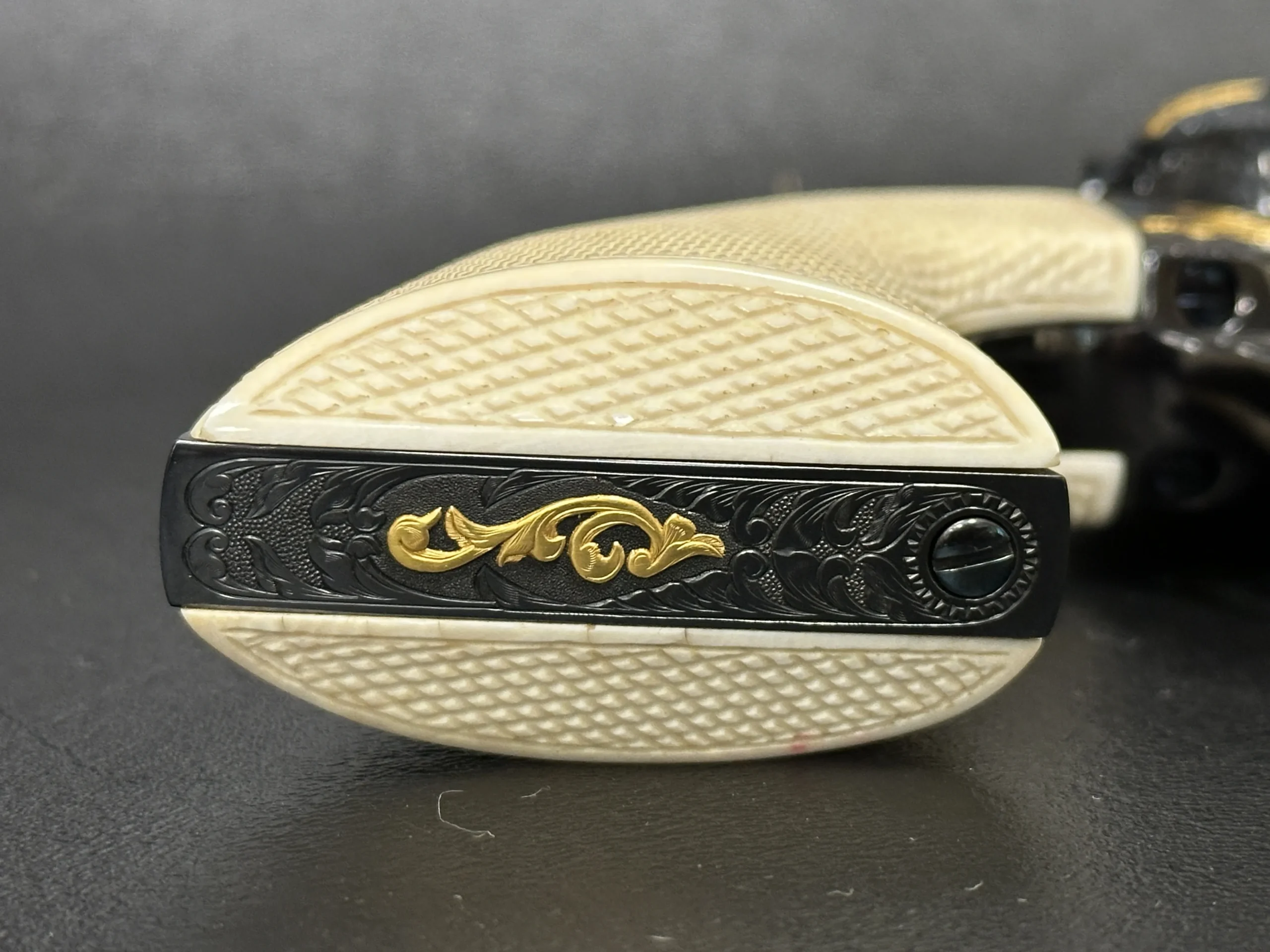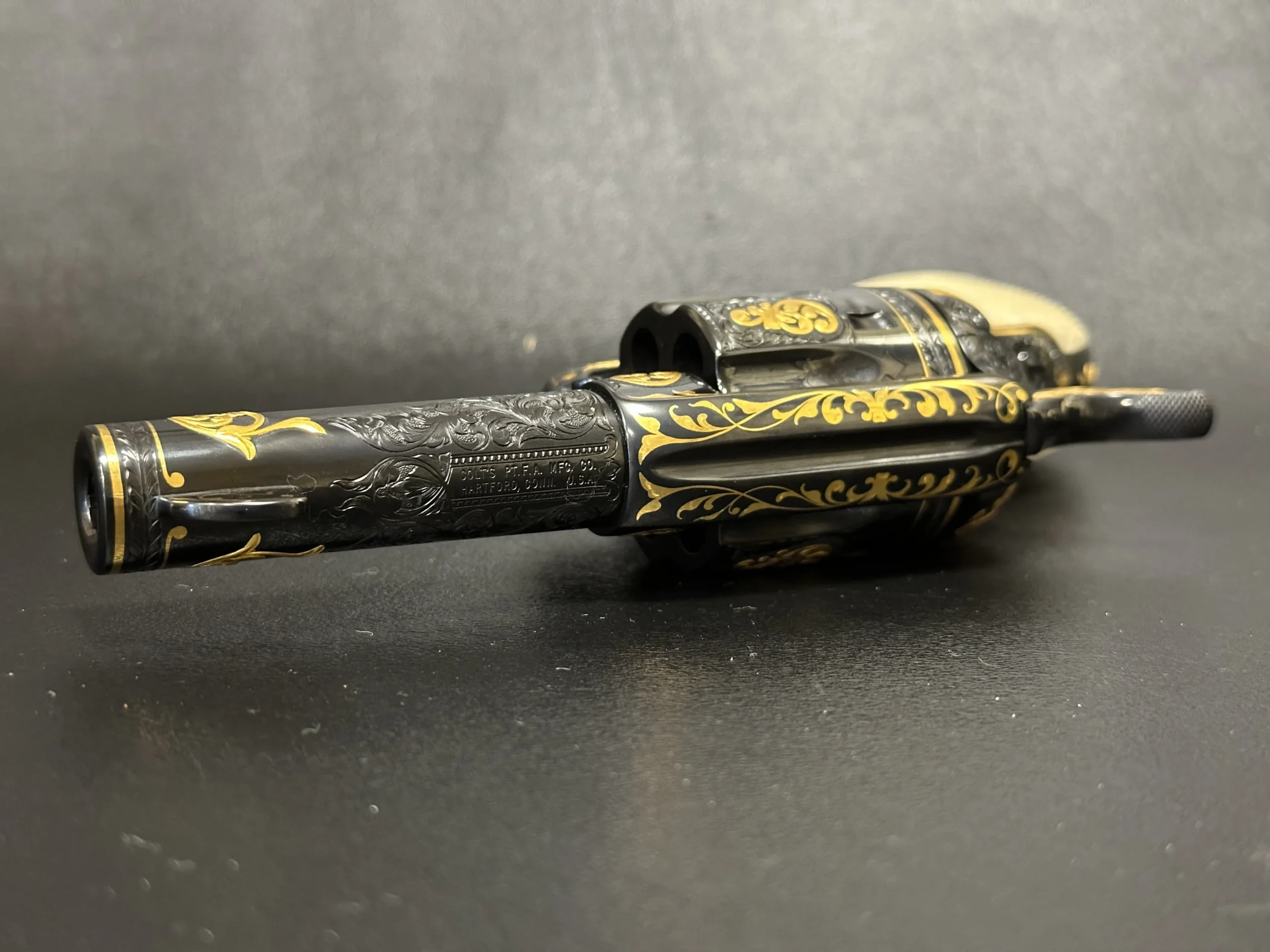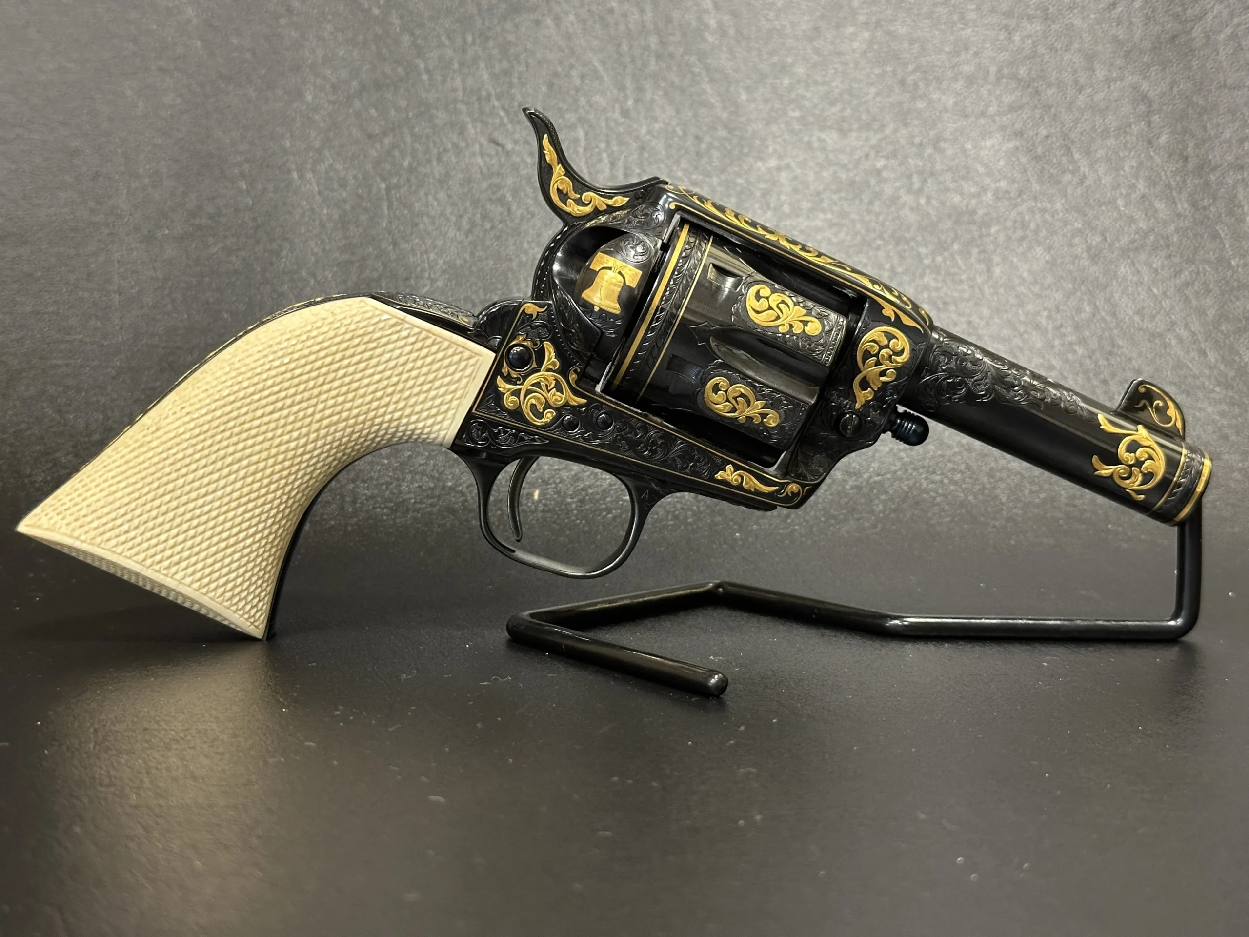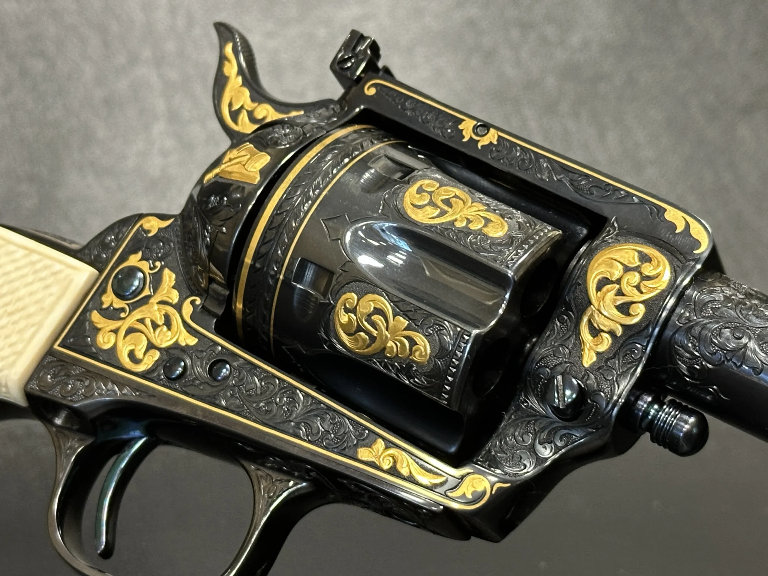 The companion revolver is a Colt Single Action Sheriff’s Model chambered in .357 Magnum. Like its counterpart, it is finished in royal blue with fire-blued accents and engraved by Howard Dove. Gold inlay on the loading gate depicts the Liberty Bell, while the recoil shield features an Eagle and Shield motif surrounded by thirteen stars and the inscription “LIBERTY OR DEATH.” Scrollwork and flush gold leaf inlays continue across the backstrap and trigger guard.