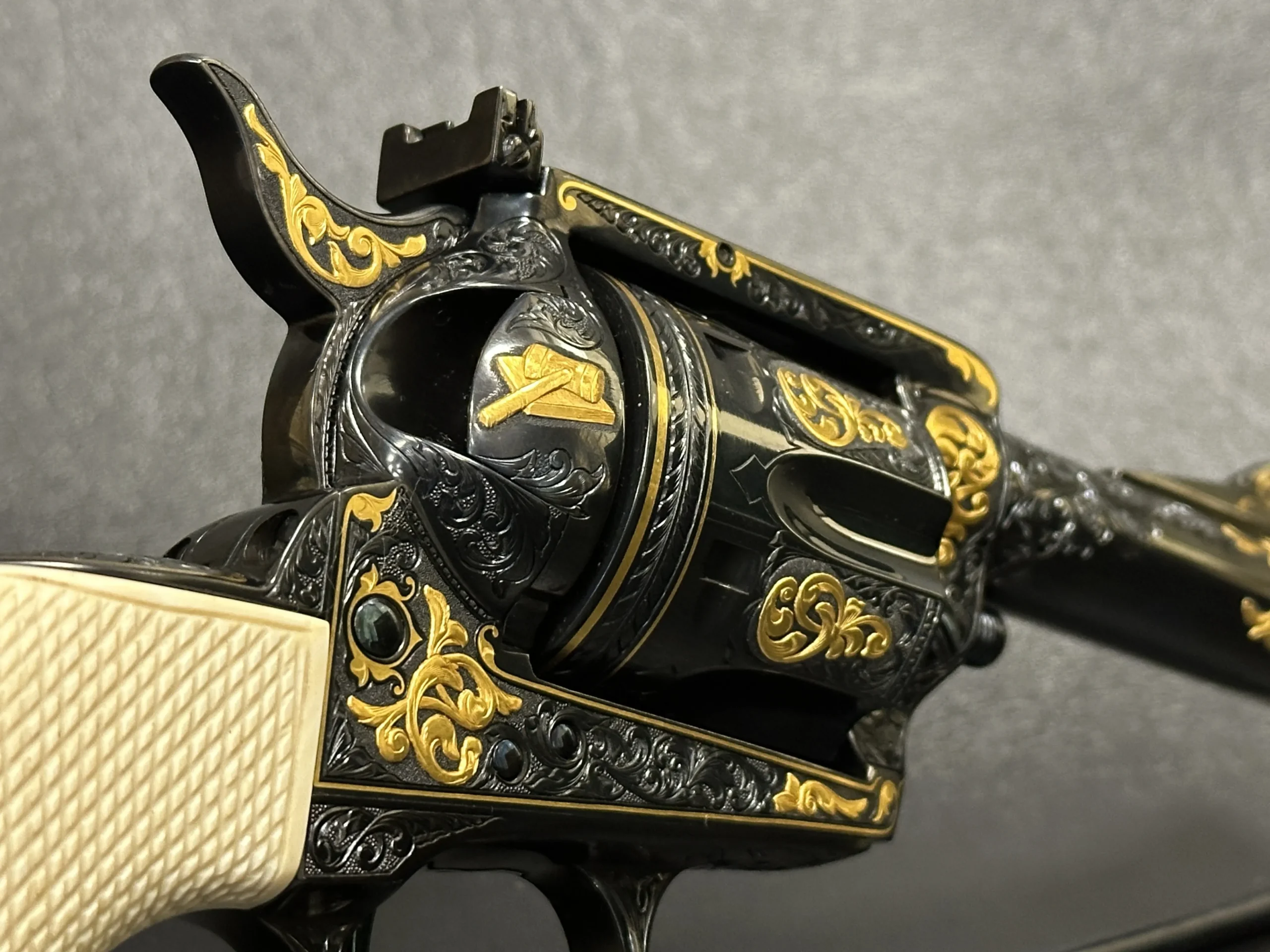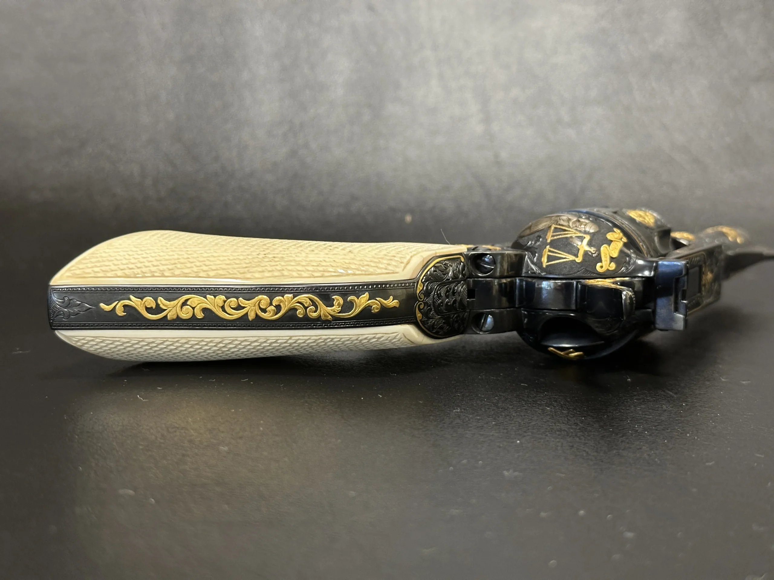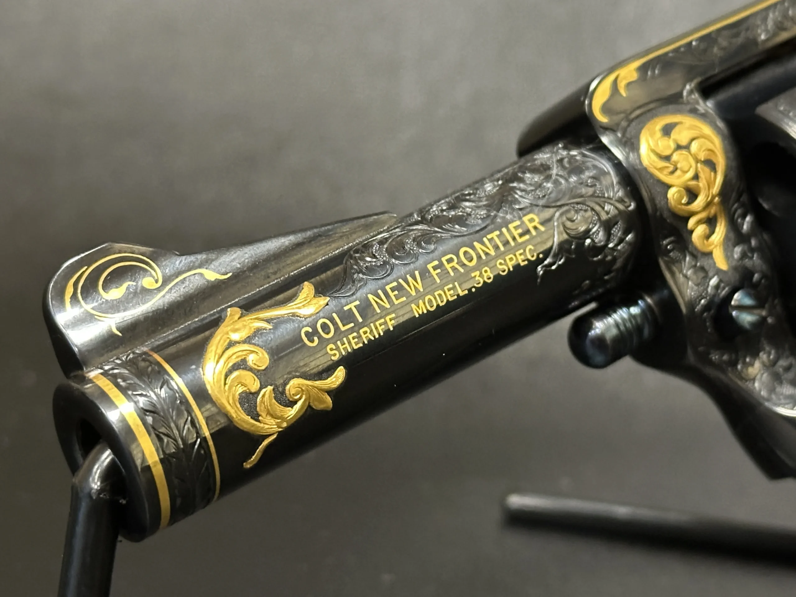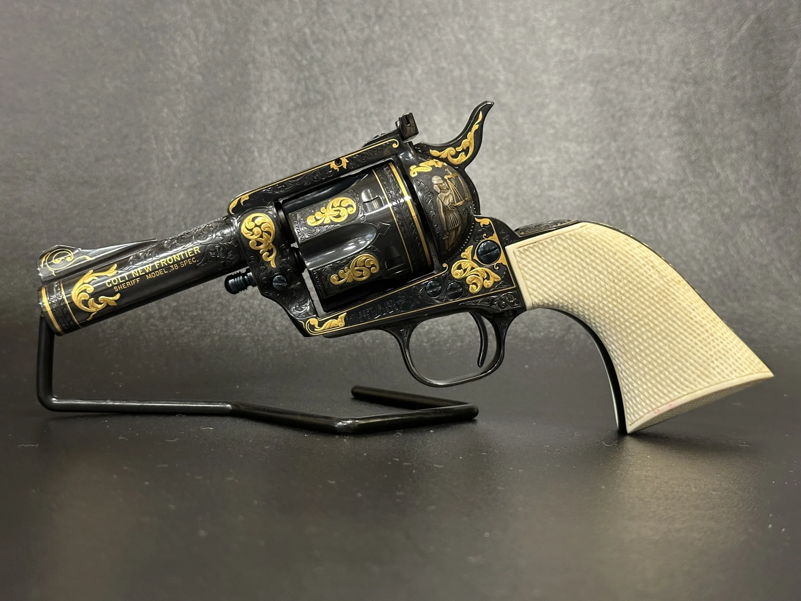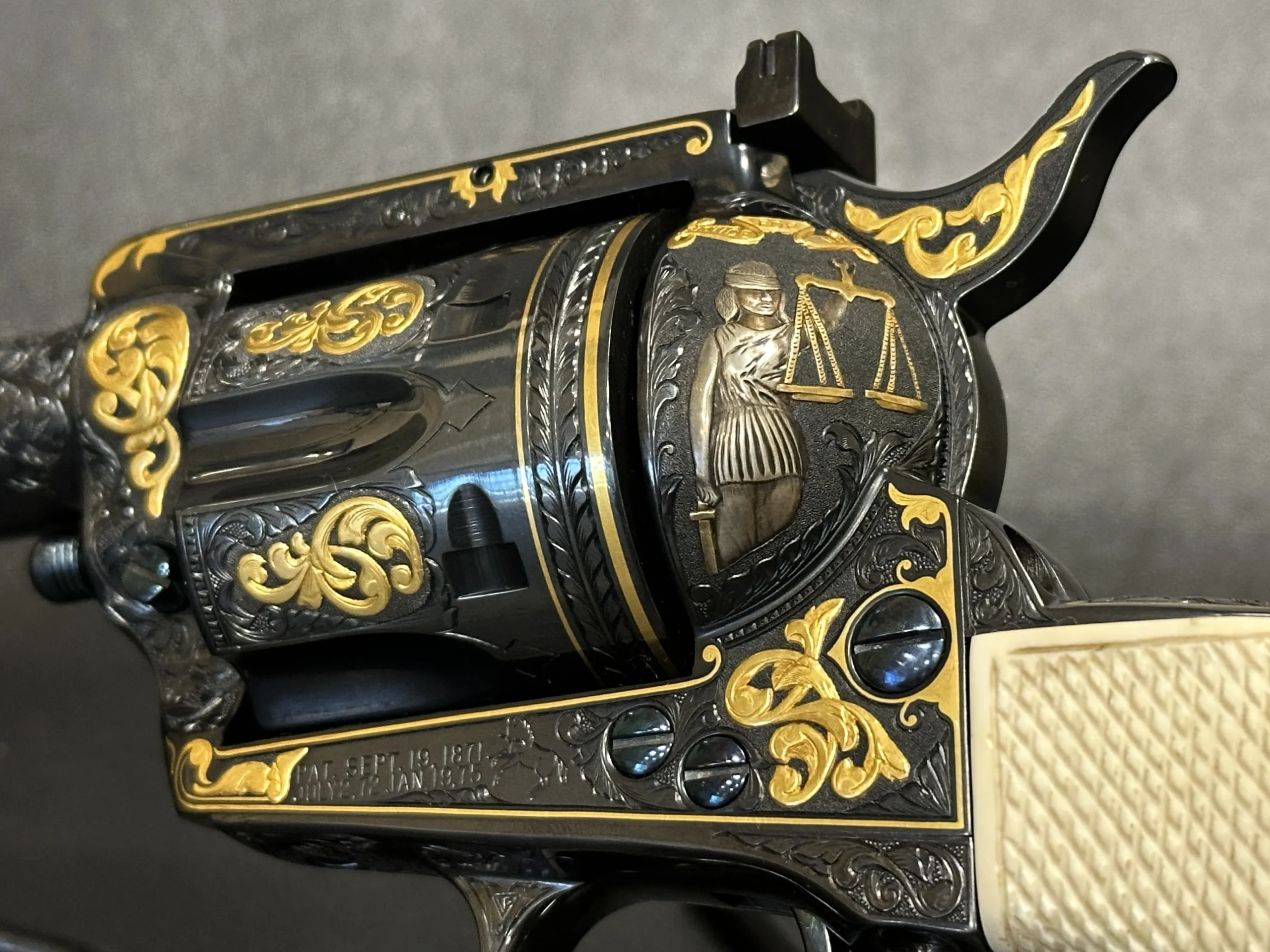 This Colt New Frontier Sheriff’s Model is chambered in .38 Special and finished in royal blue with fire-blued screws, trigger, and cylinder pins. Howard Dove’s engraving features flush gold inlays and type “B” American scrollwork, with a judge’s gavel inlaid on the loading gate and Lady Justice depicted on the recoil shield. Thirteen engraved stars complete the design.