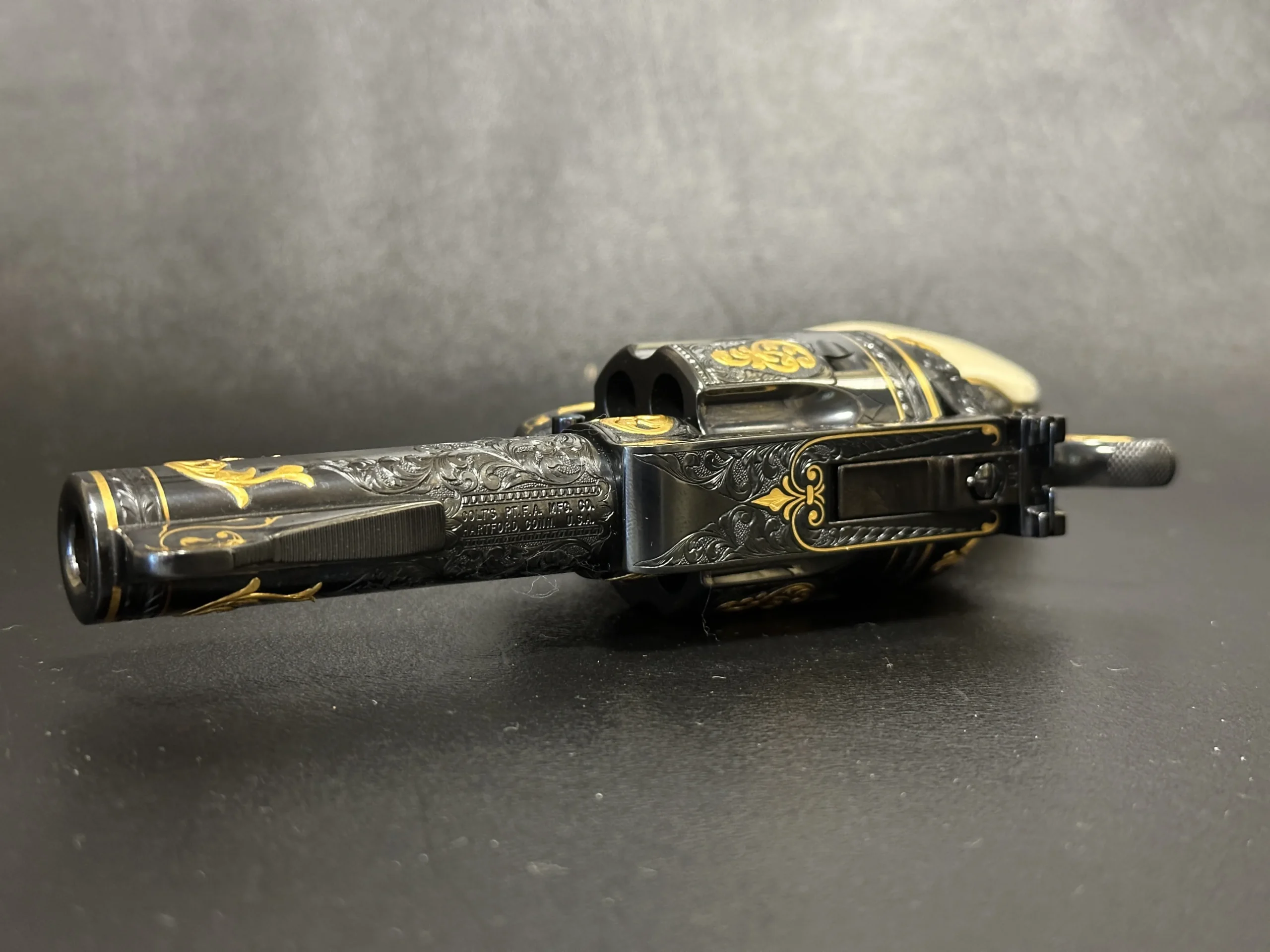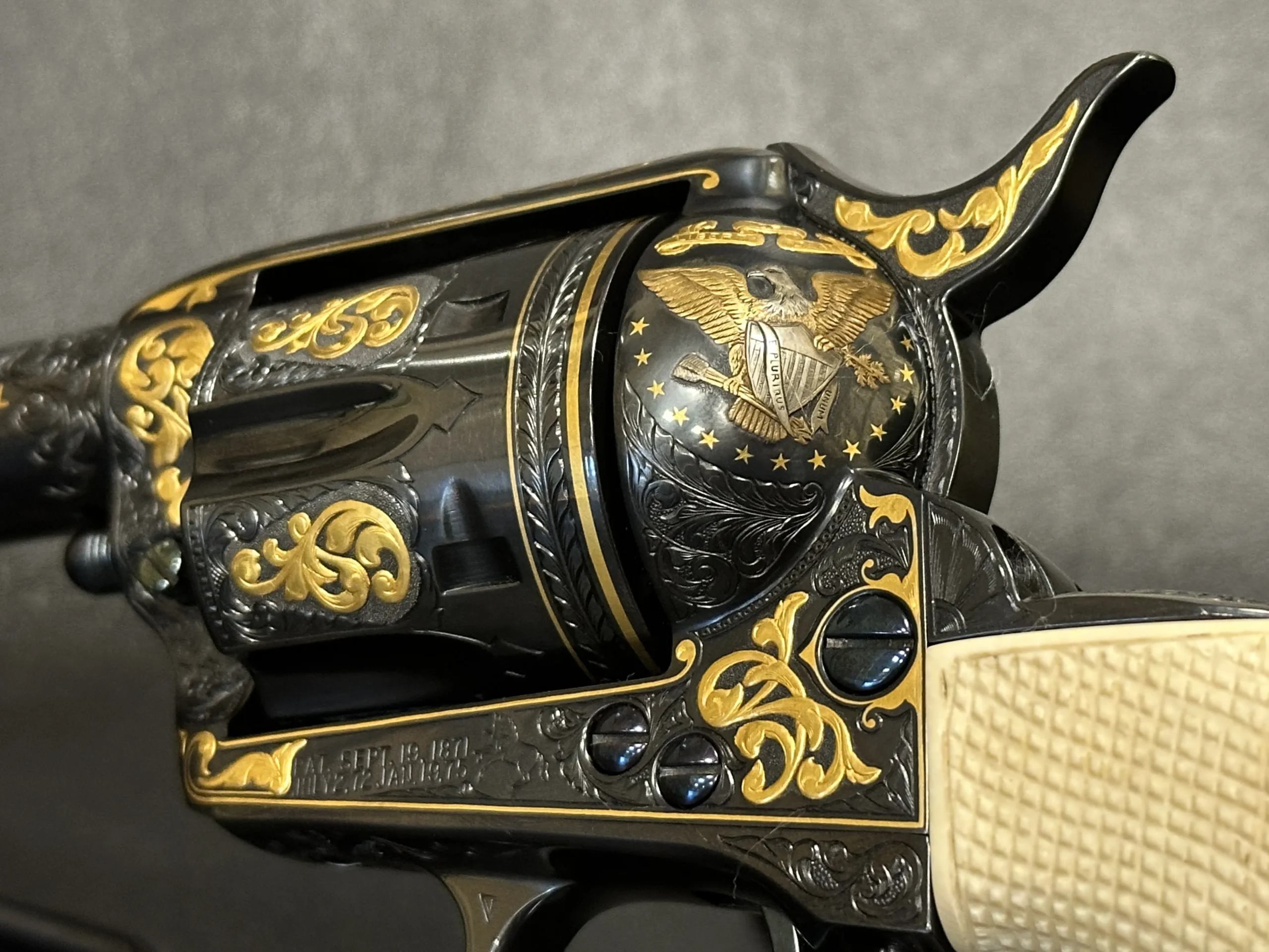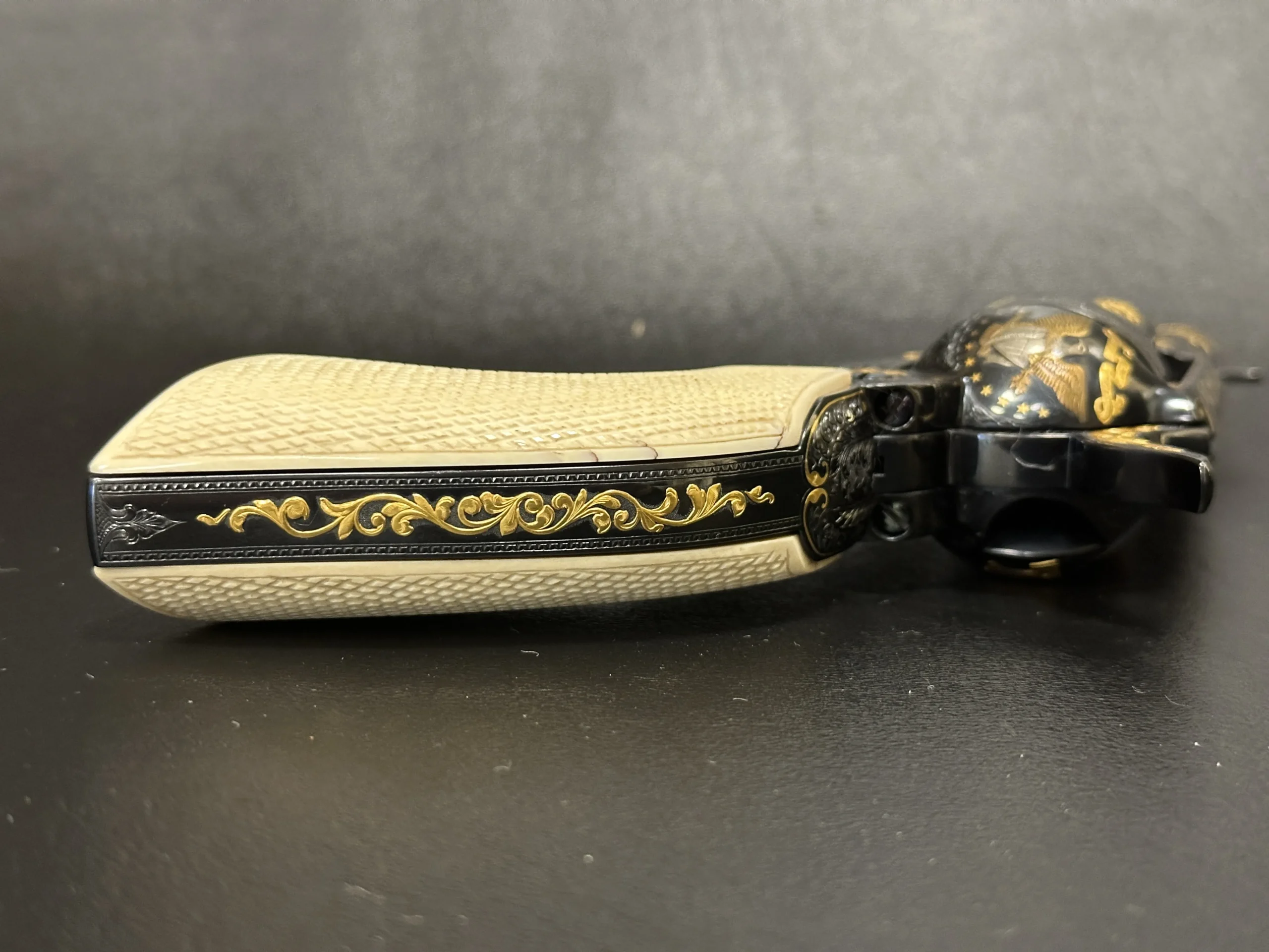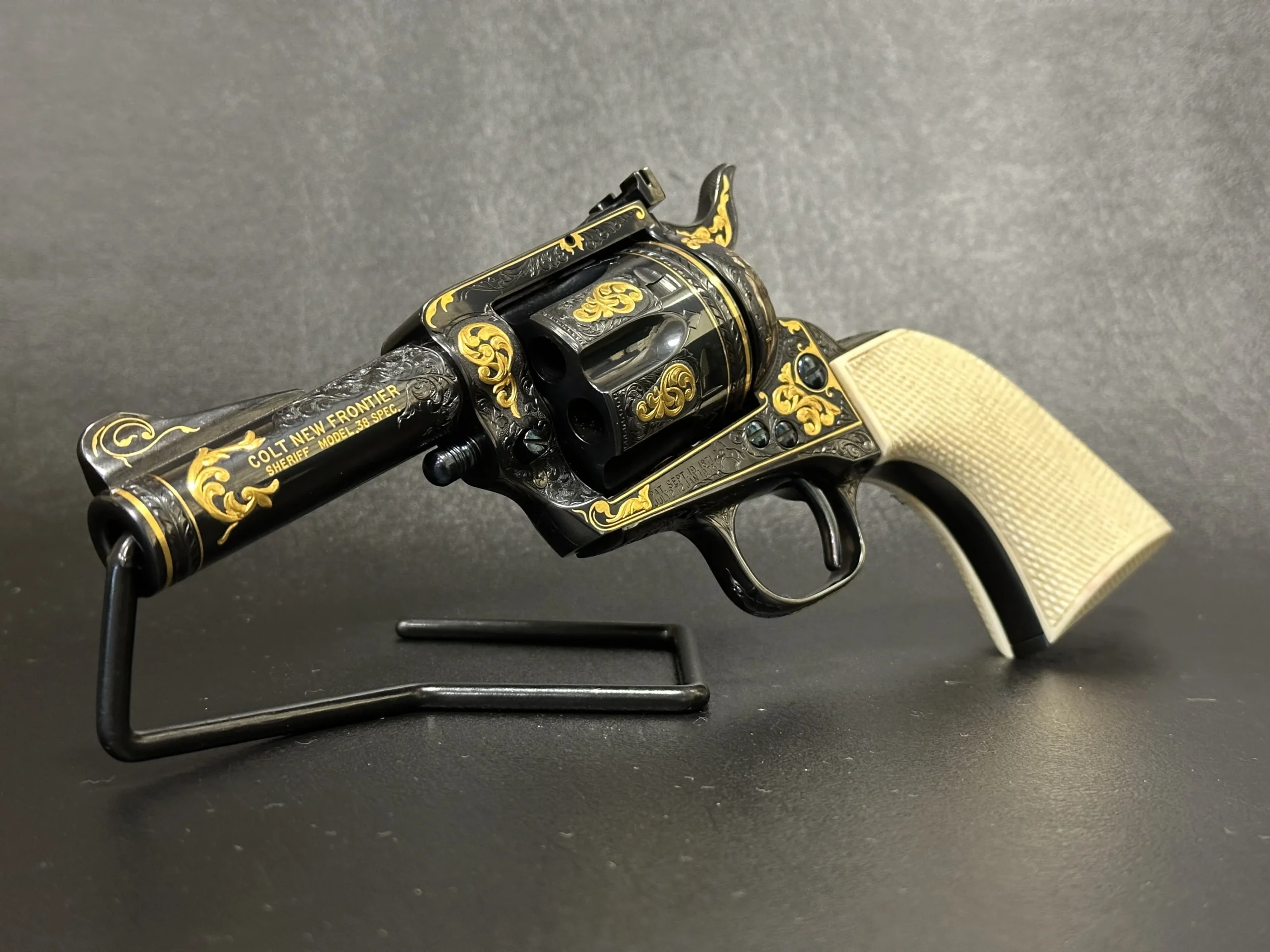 This Colt New Frontier Sheriff’s Model is chambered in .38 Special and finished in royal blue with fire-blued screws, trigger, and cylinder pins. Howard Dove’s engraving features flush gold inlays and type “B” American scrollwork, with a judge’s gavel inlaid on the loading gate and Lady Justice depicted on the recoil shield. Thirteen engraved stars complete the design.