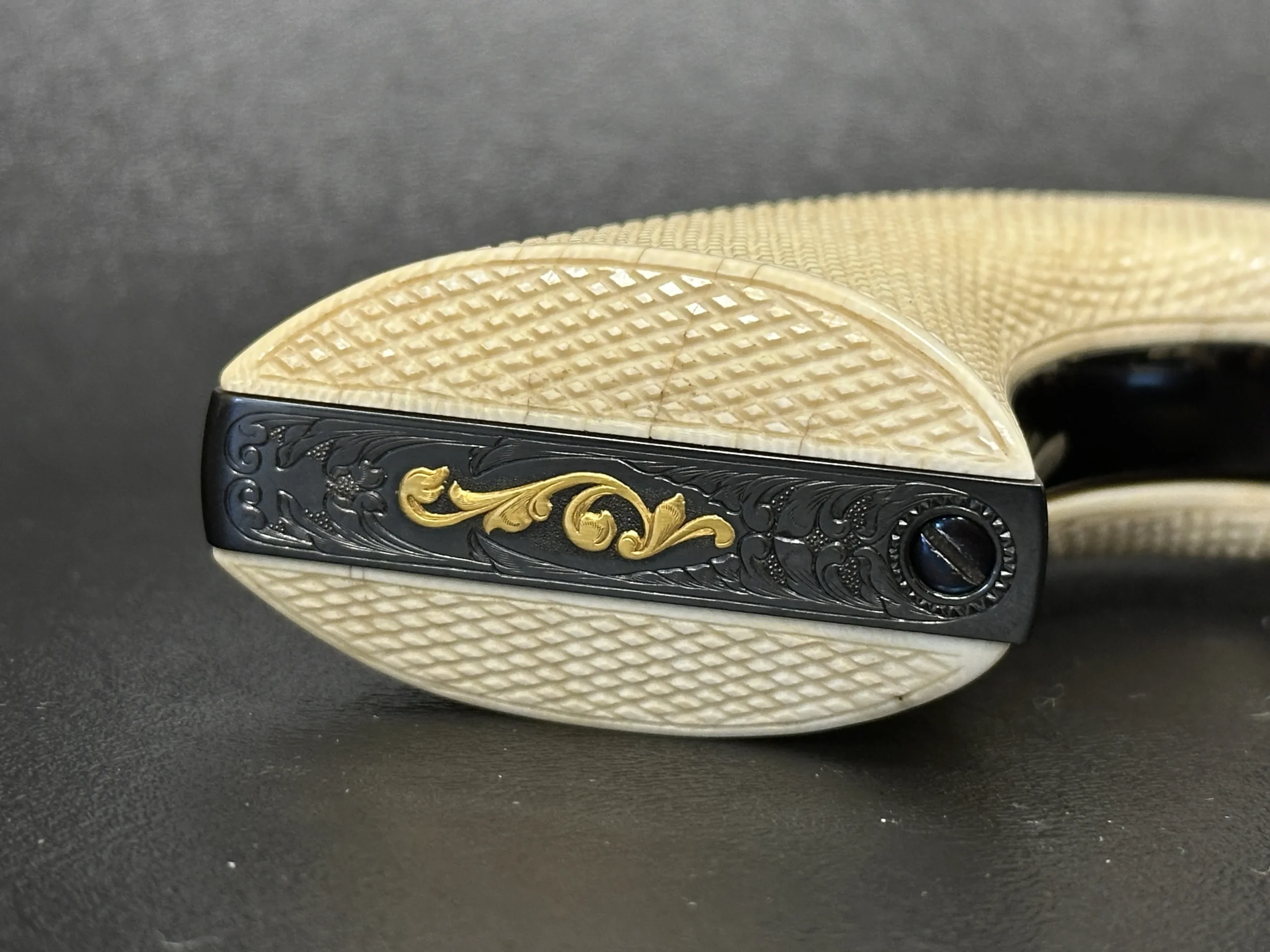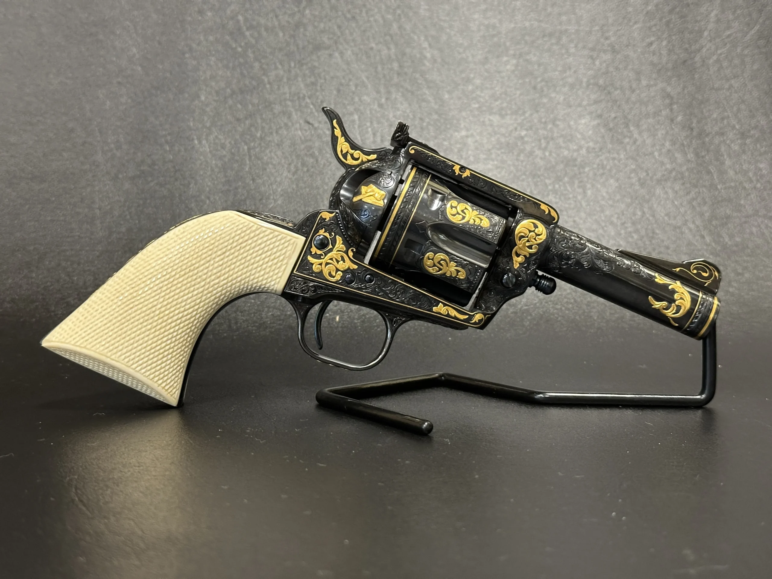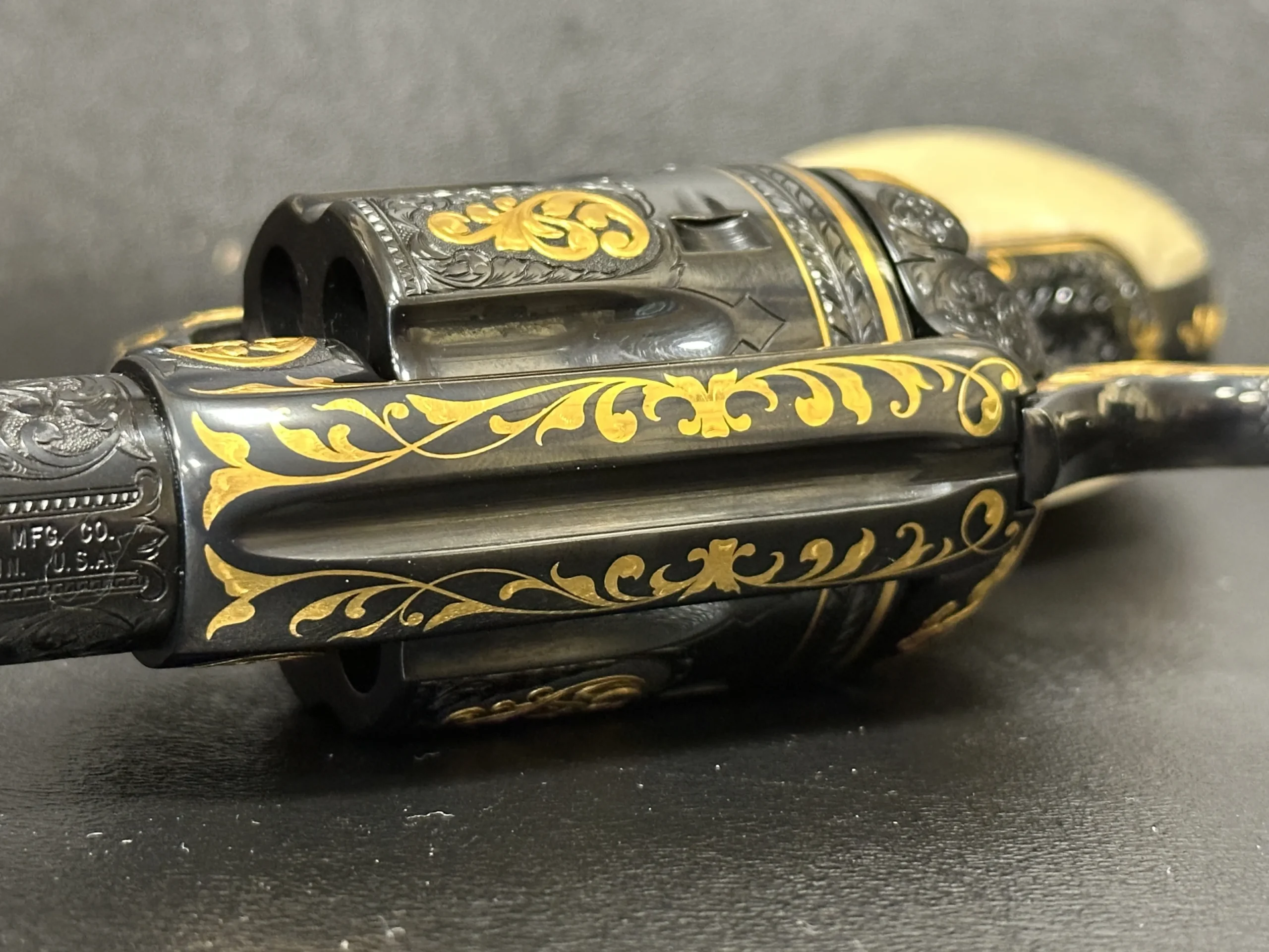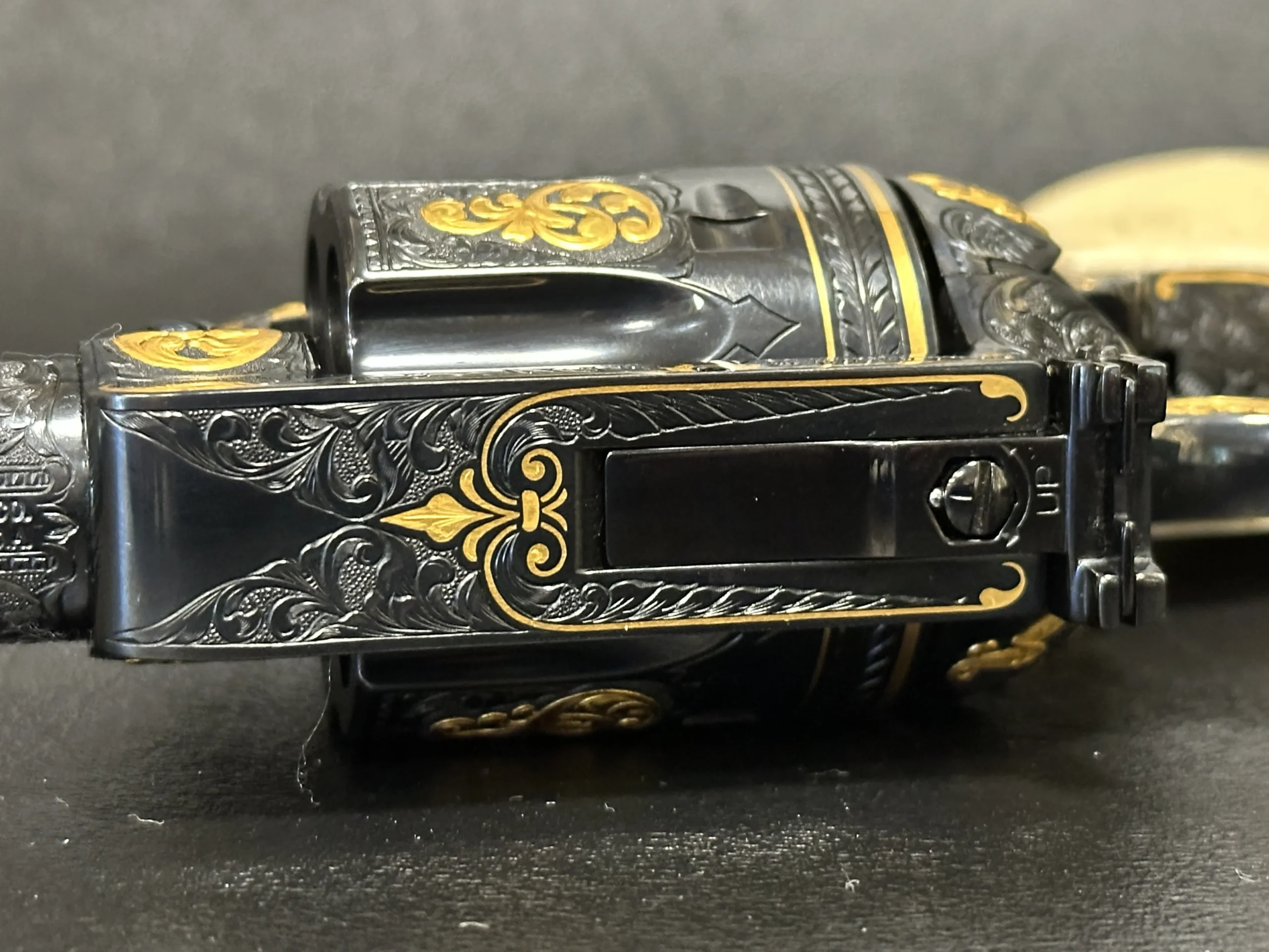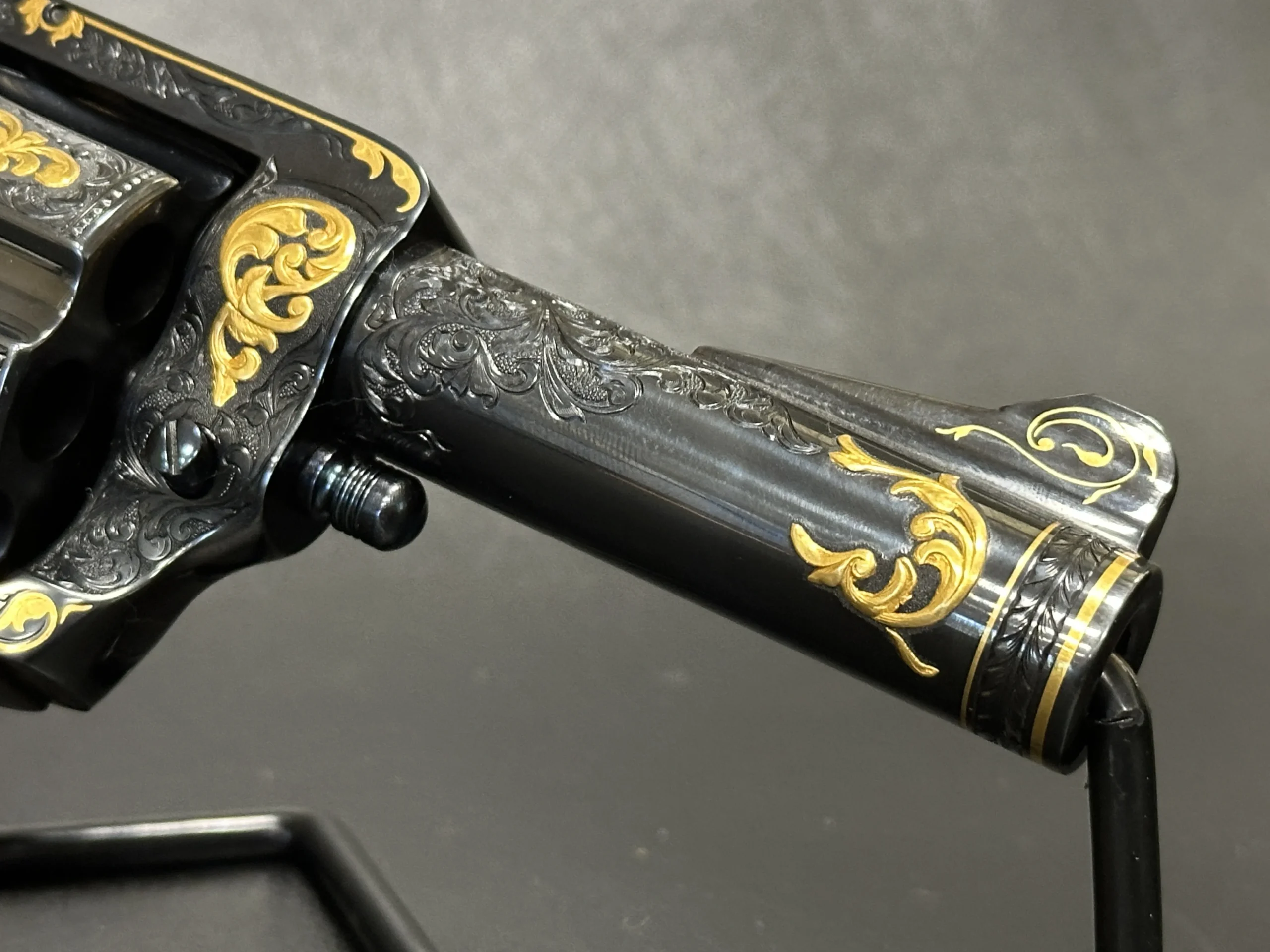 This Colt New Frontier Sheriff’s Model is chambered in .38 Special and finished in royal blue with fire-blued screws, trigger, and cylinder pins. Howard Dove’s engraving features flush gold inlays and type “B” American scrollwork, with a judge’s gavel inlaid on the loading gate and Lady Justice depicted on the recoil shield. Thirteen engraved stars complete the design.