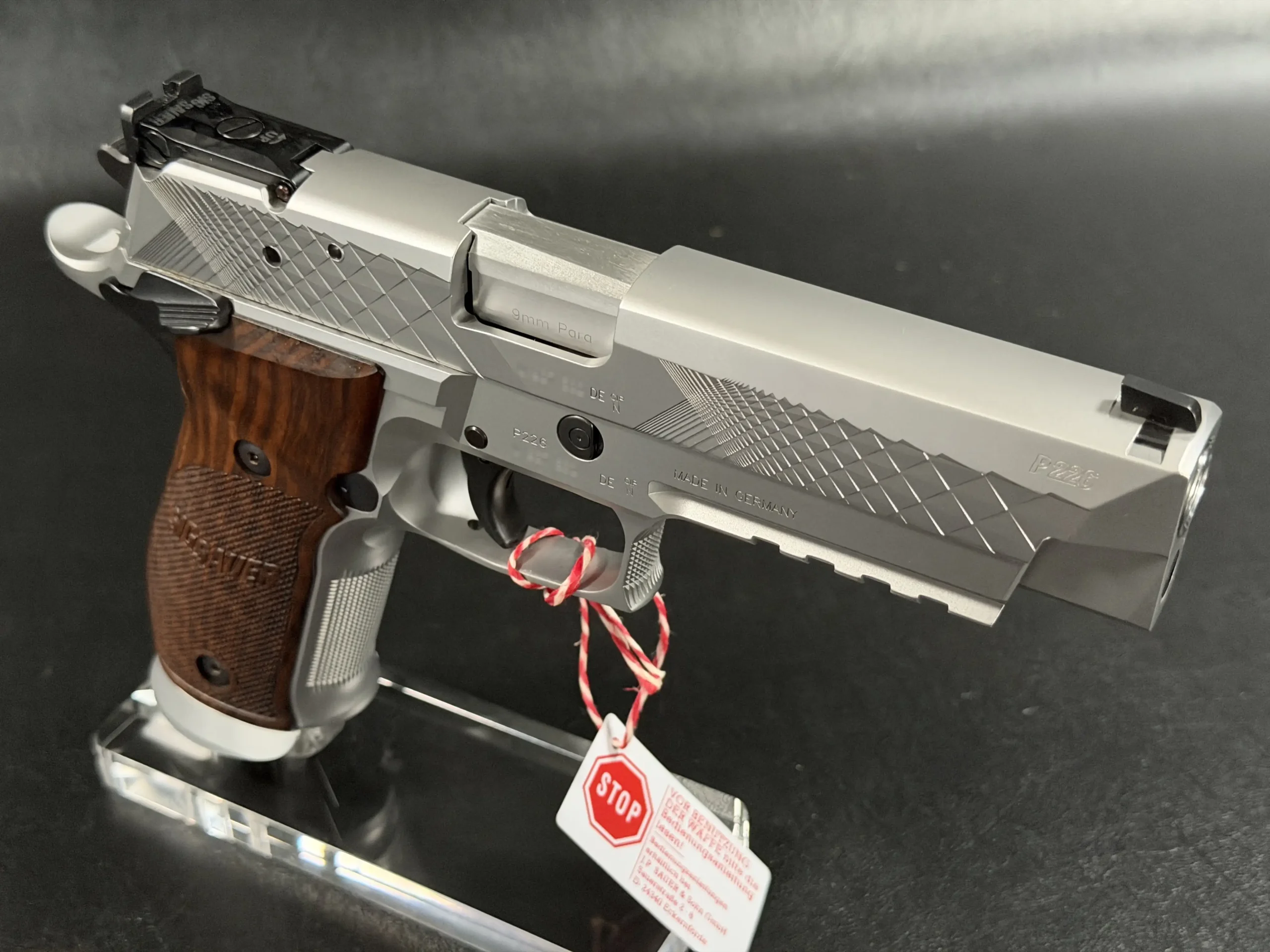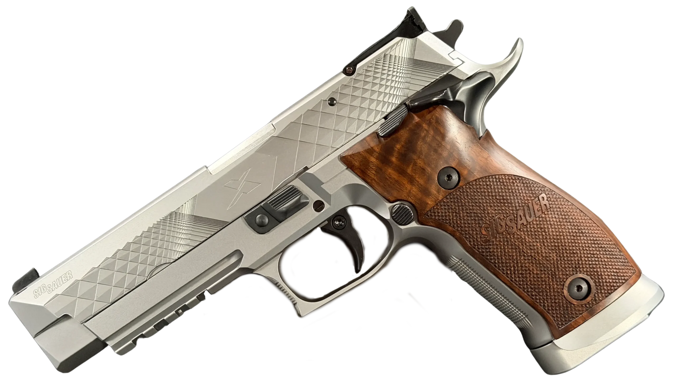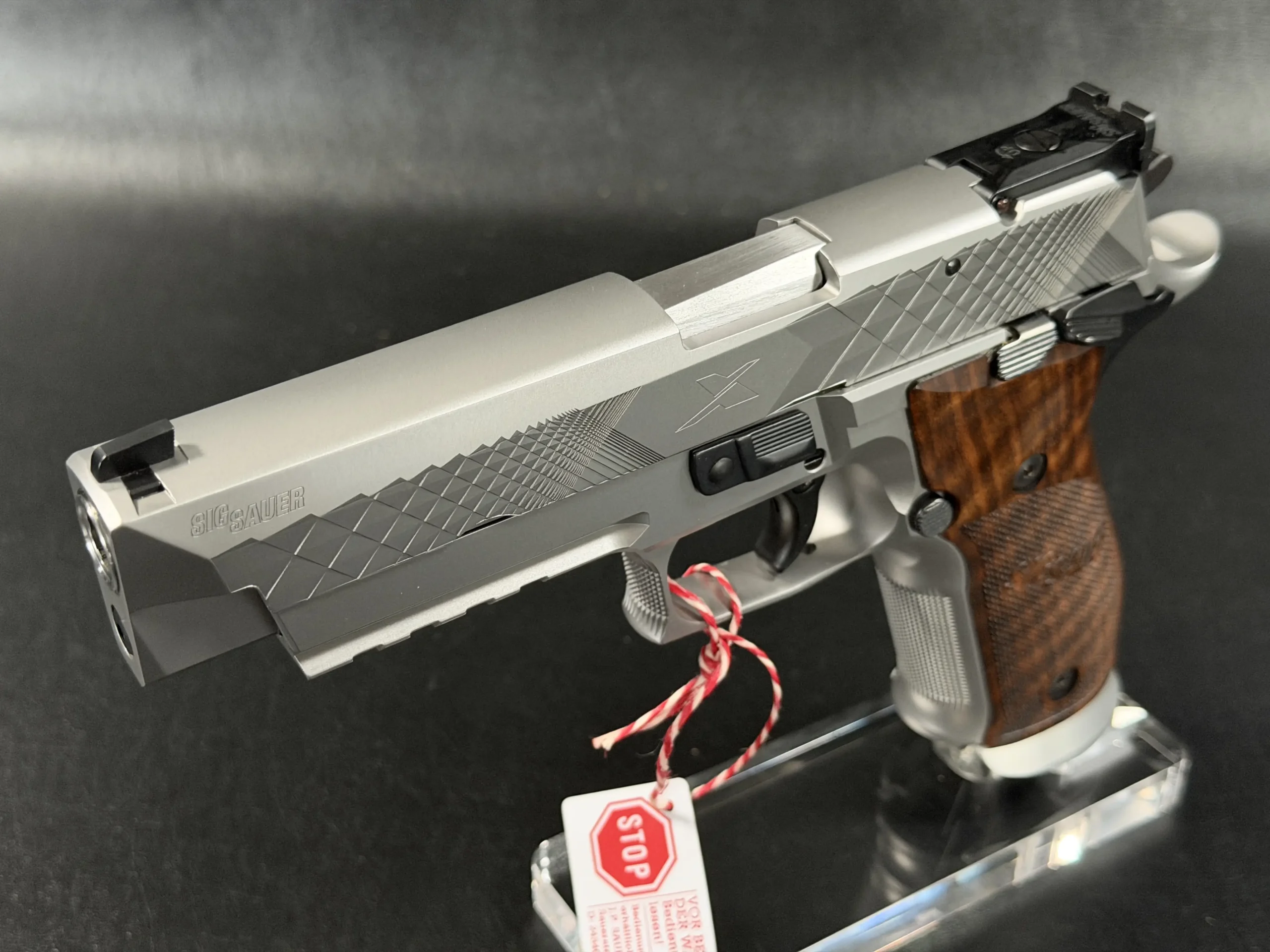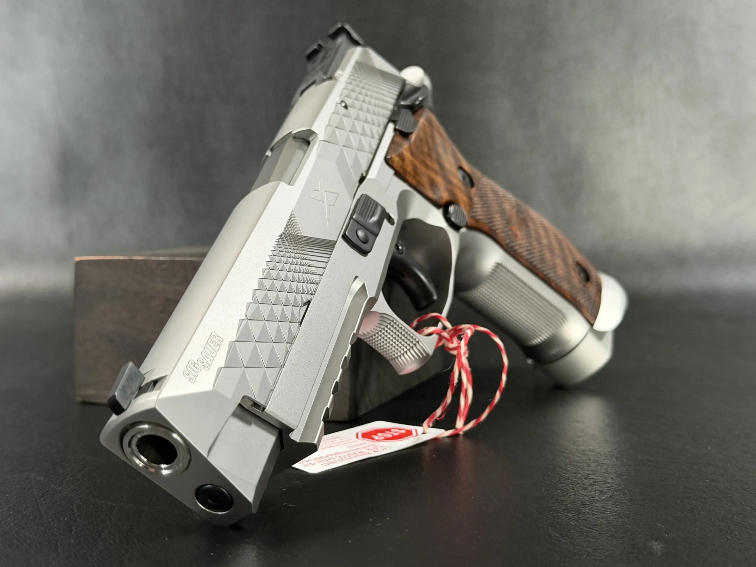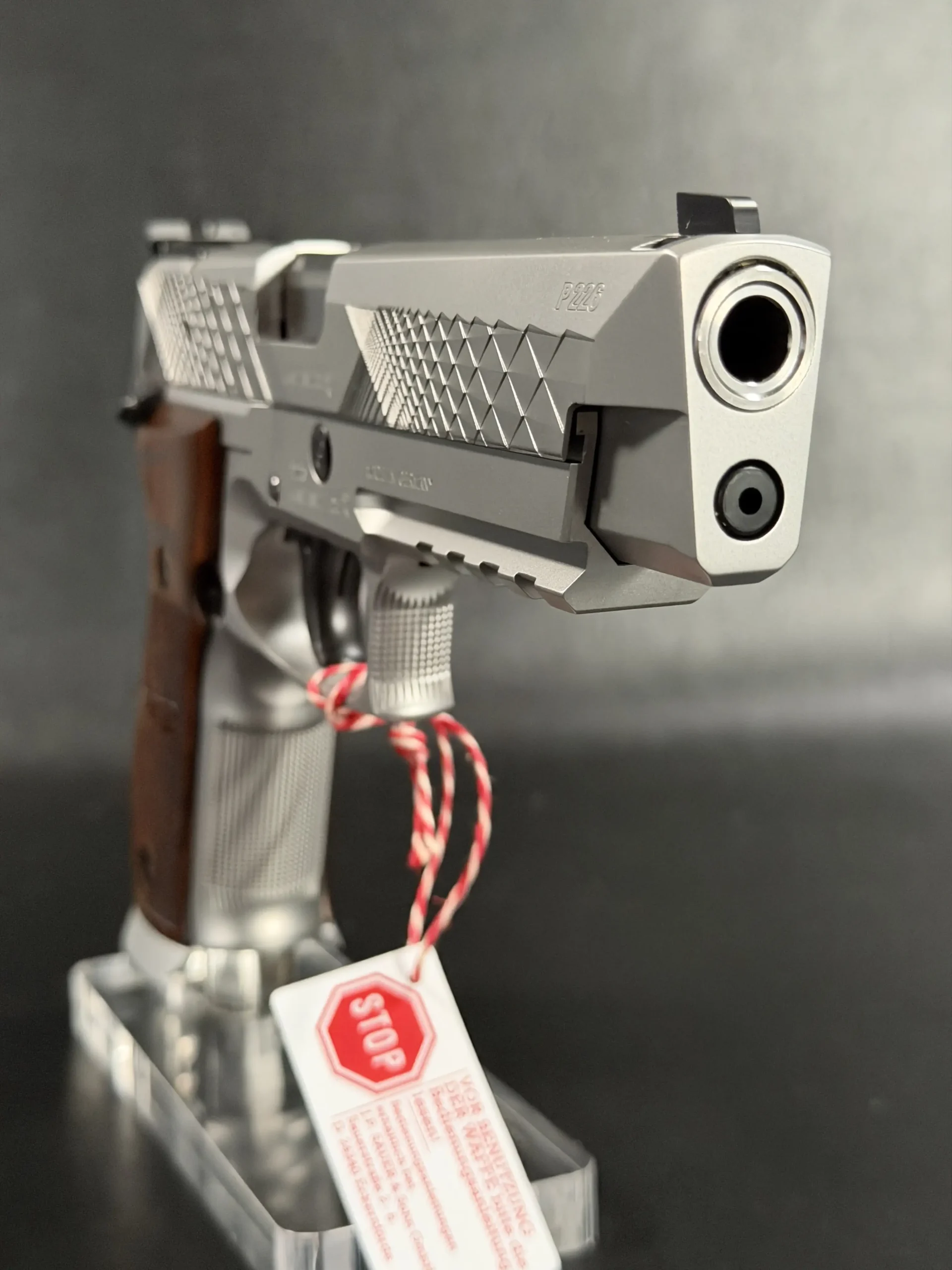 Chambered in 9mm, the pistol is built on the X-Five platform and finished with a uniform matte treatment on the slide and frame. Walnut grips add warmth and contrast to the technical design, while the factory markings remain crisp and consistent.