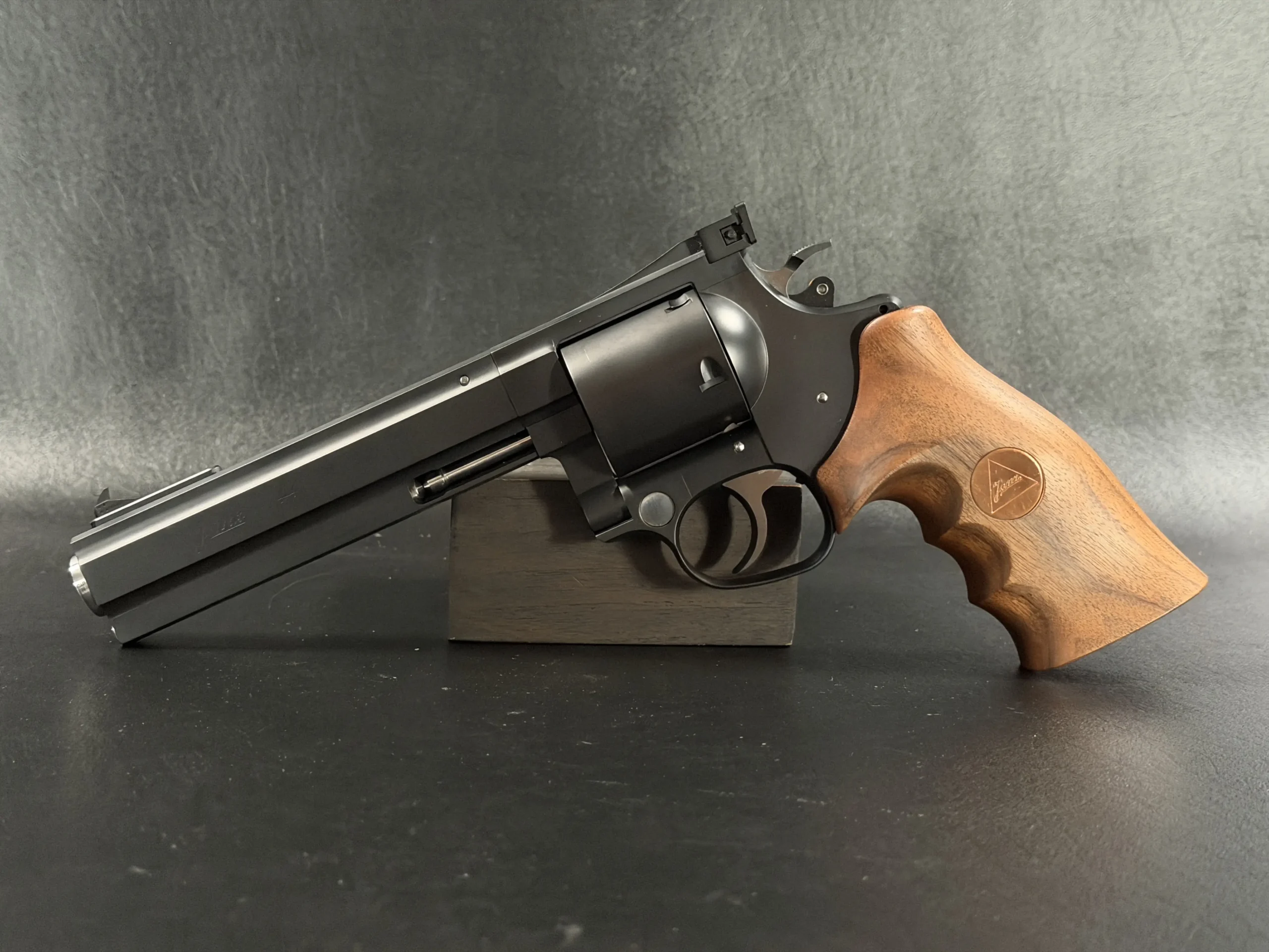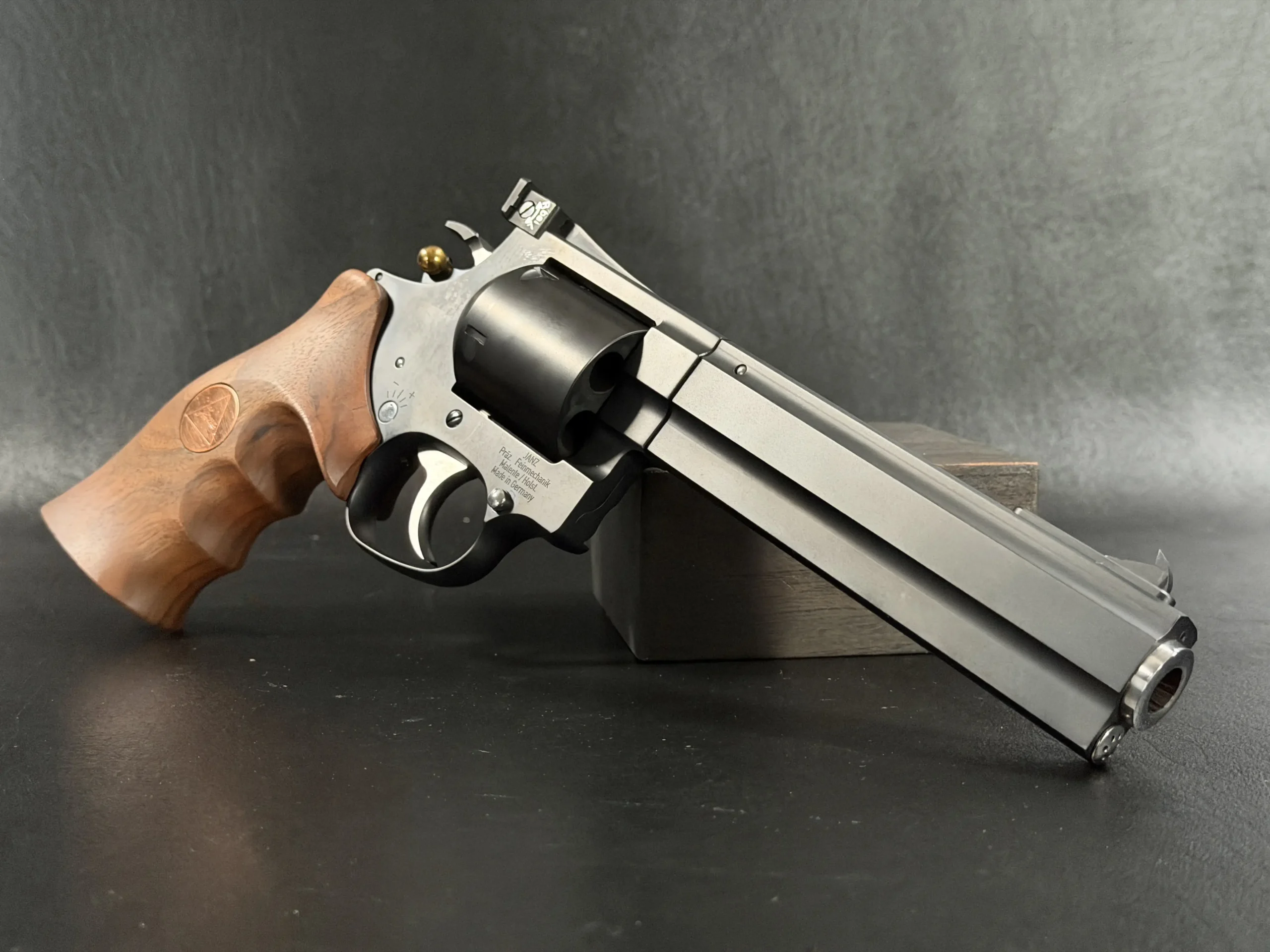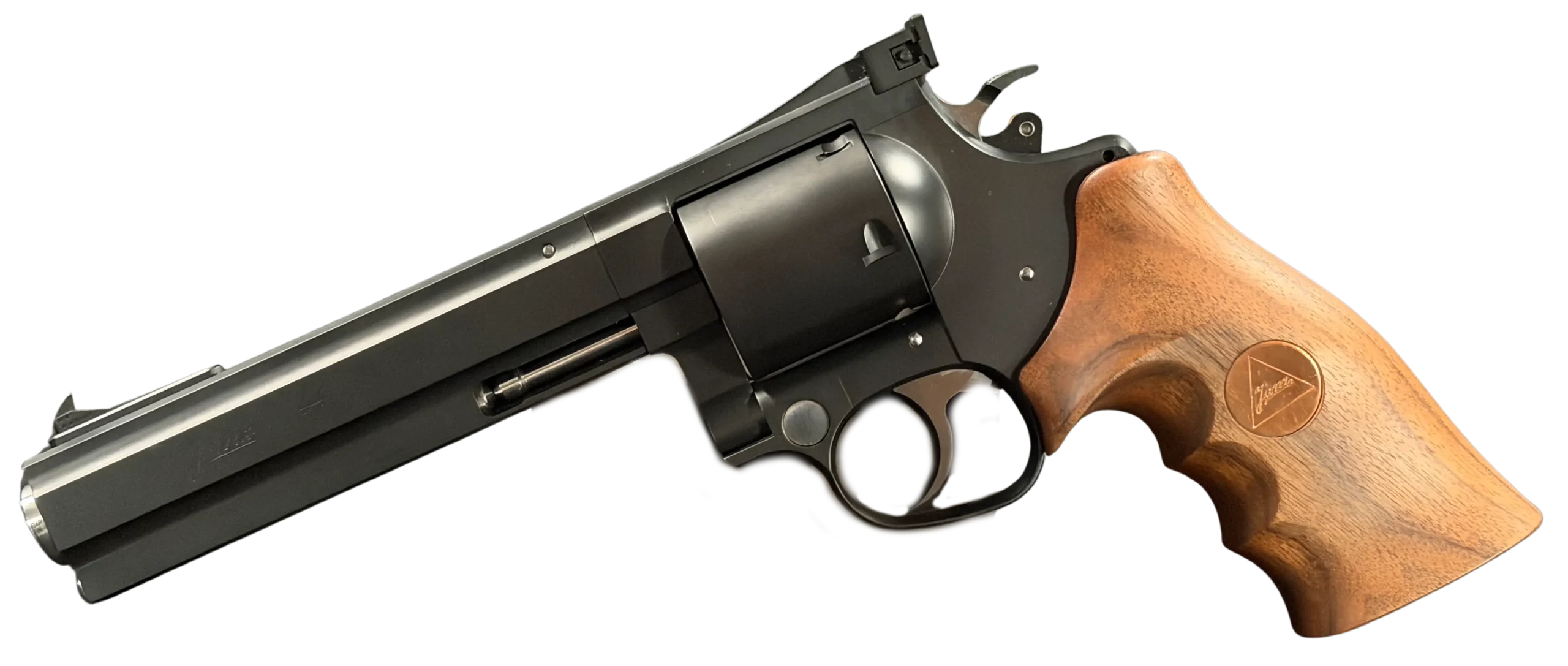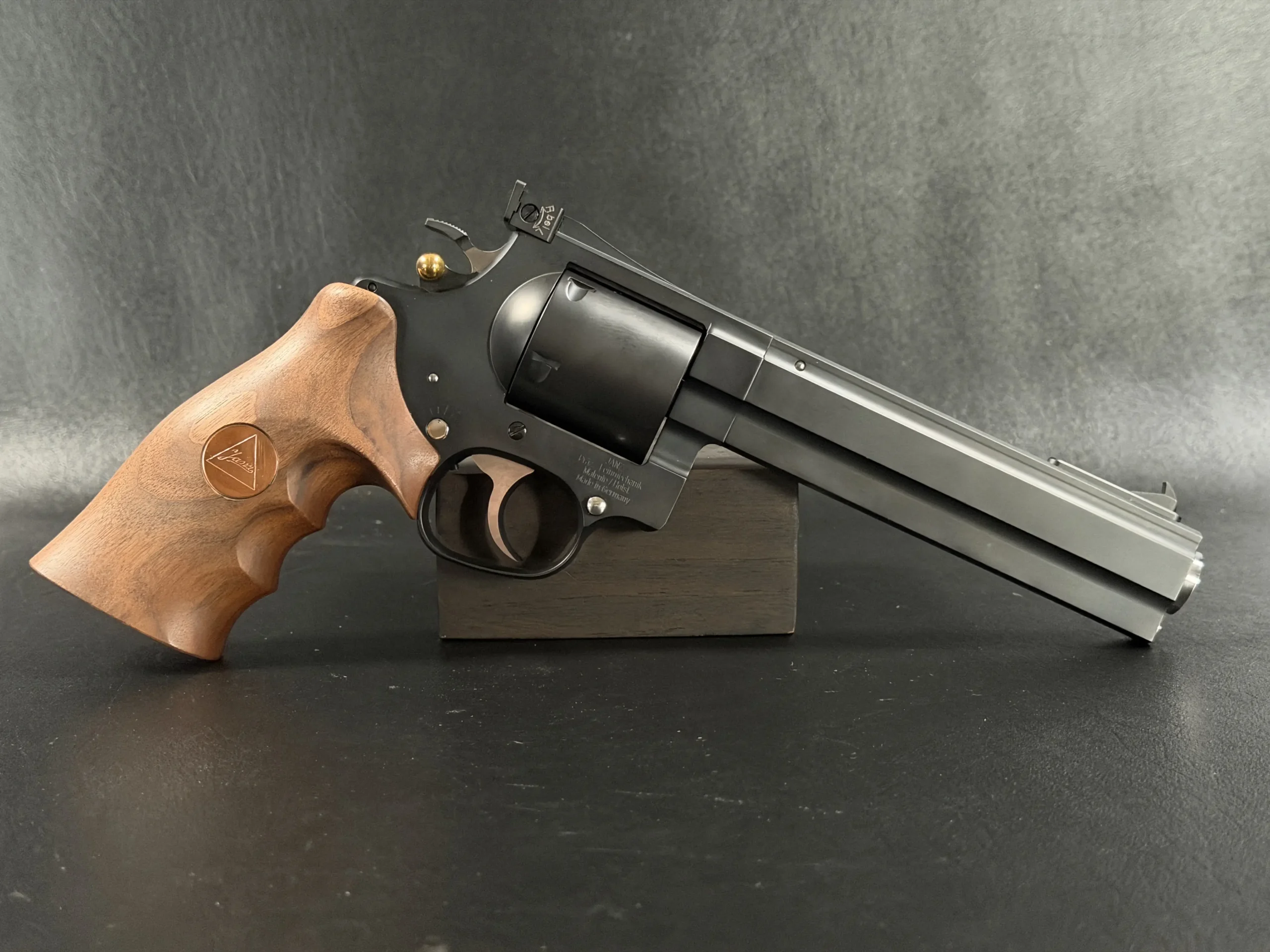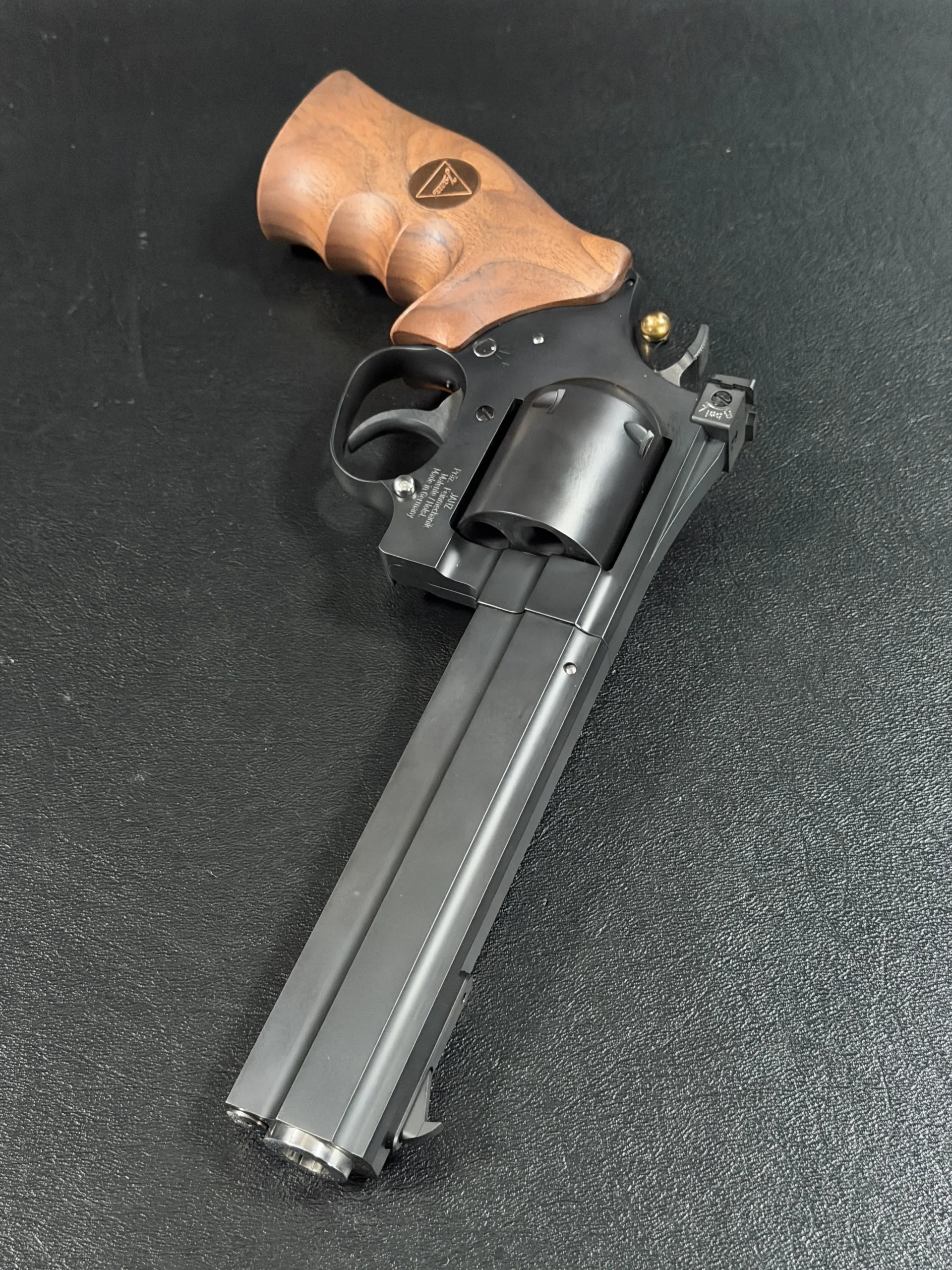 The revolver is fitted with an ergonomic walnut grip with palm swells and a Janz medallion, giving it a natural, hand-filling feel while complementing the substantial barrel weight. The 6-inch barrel also highlights the distinctive octagonal profile associated with the JTL line.
