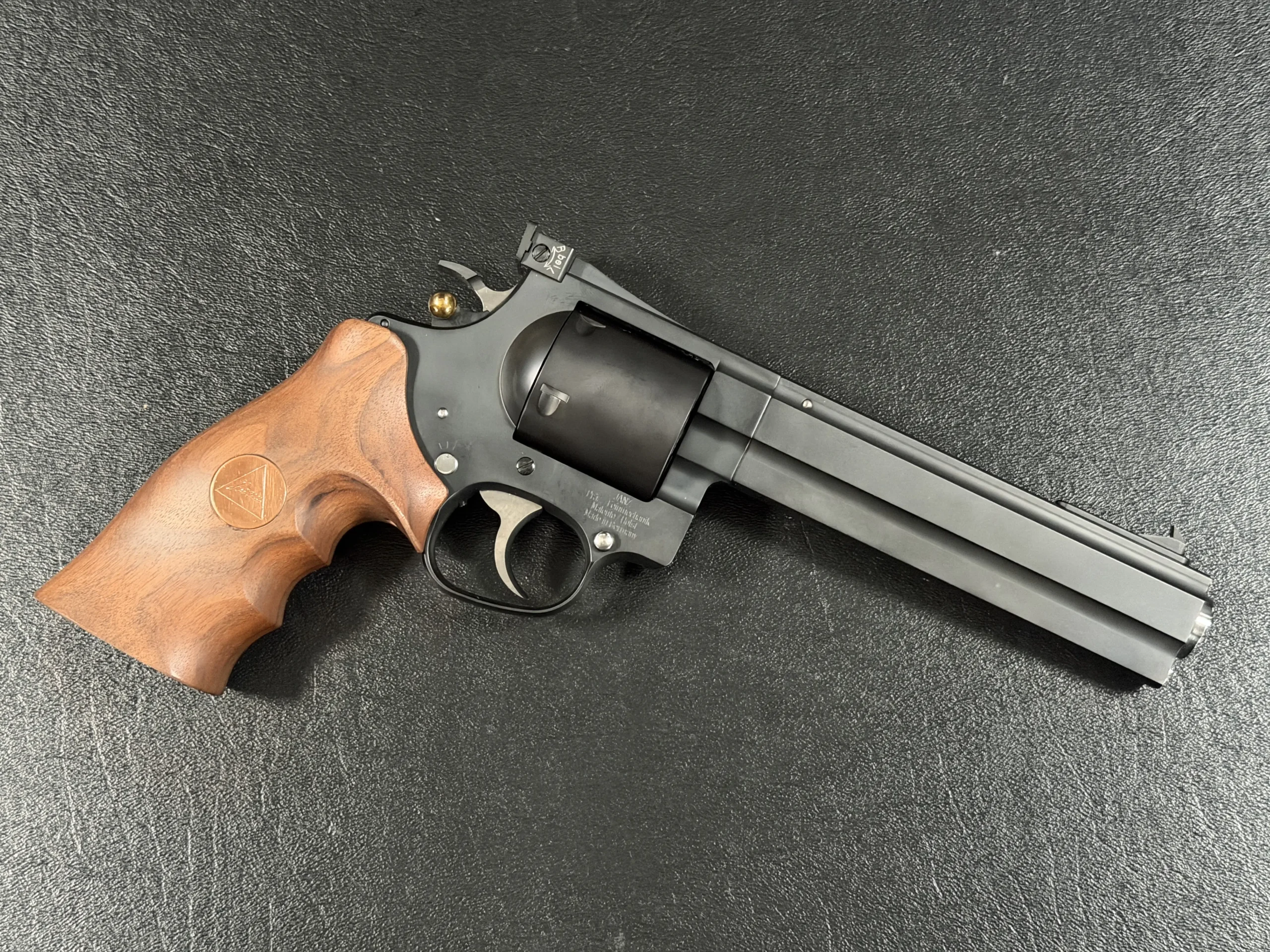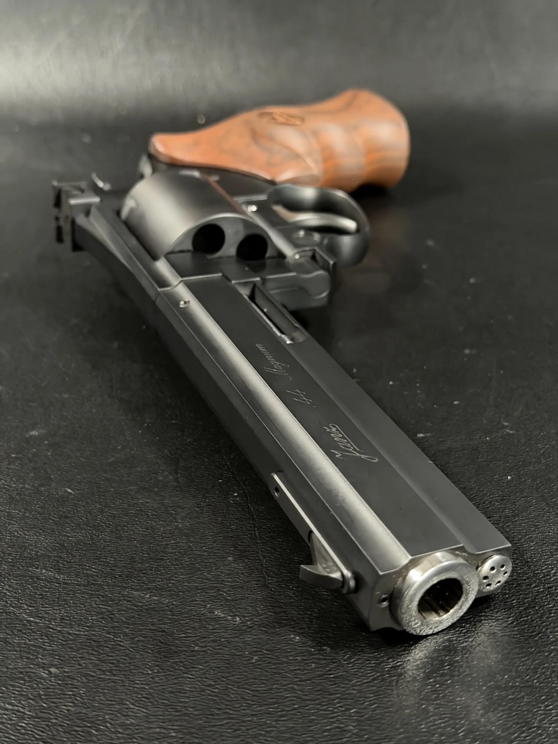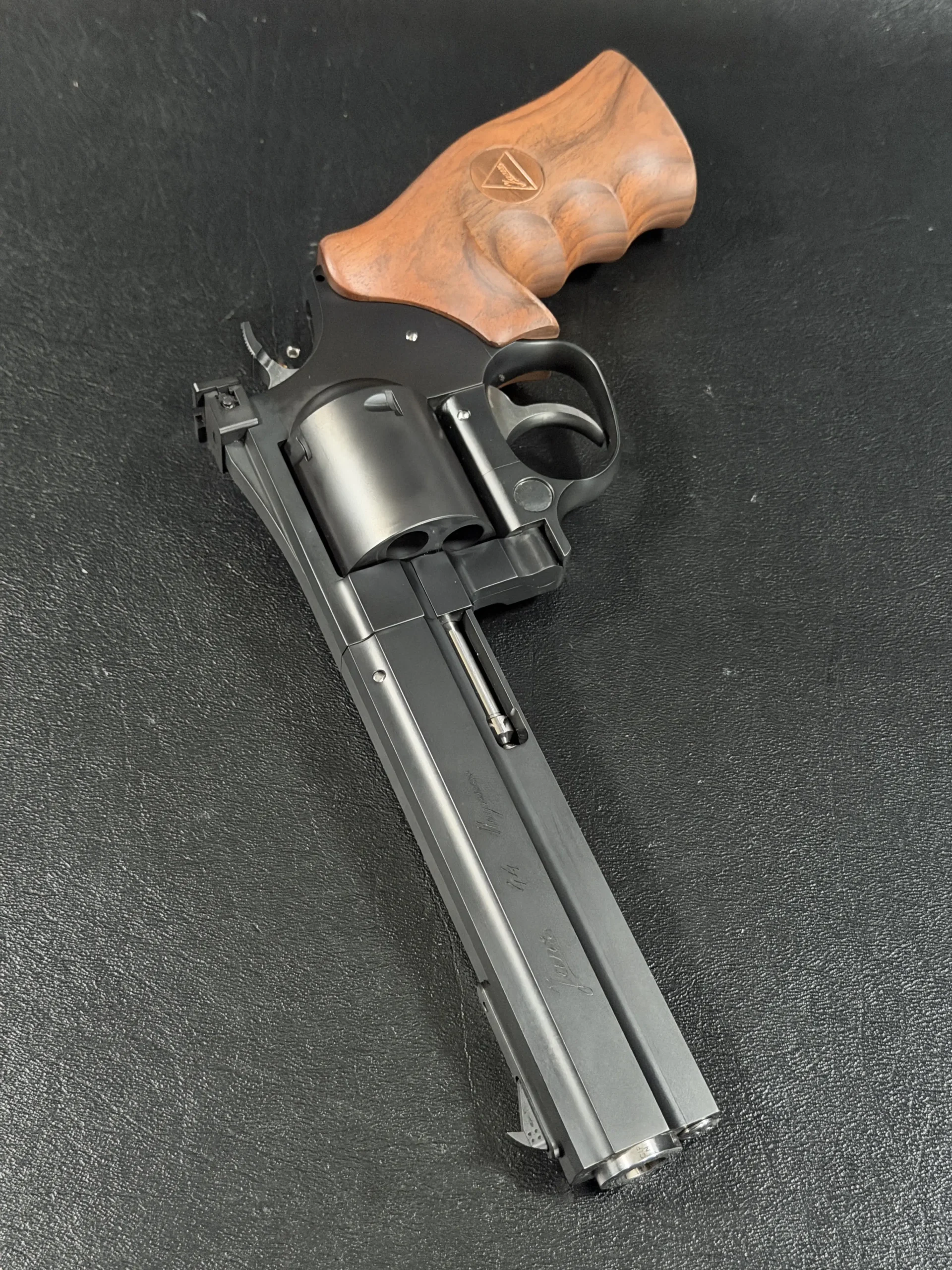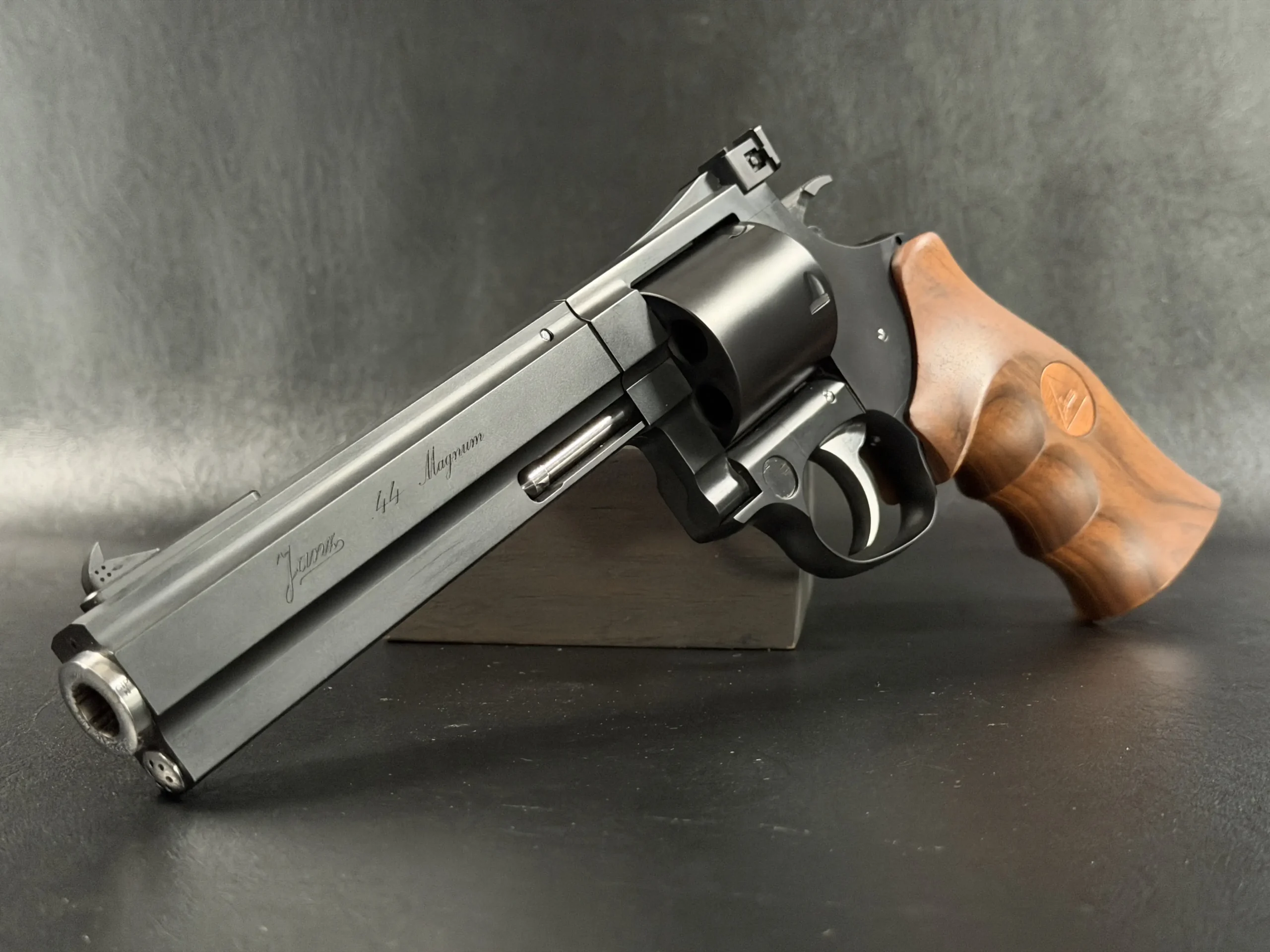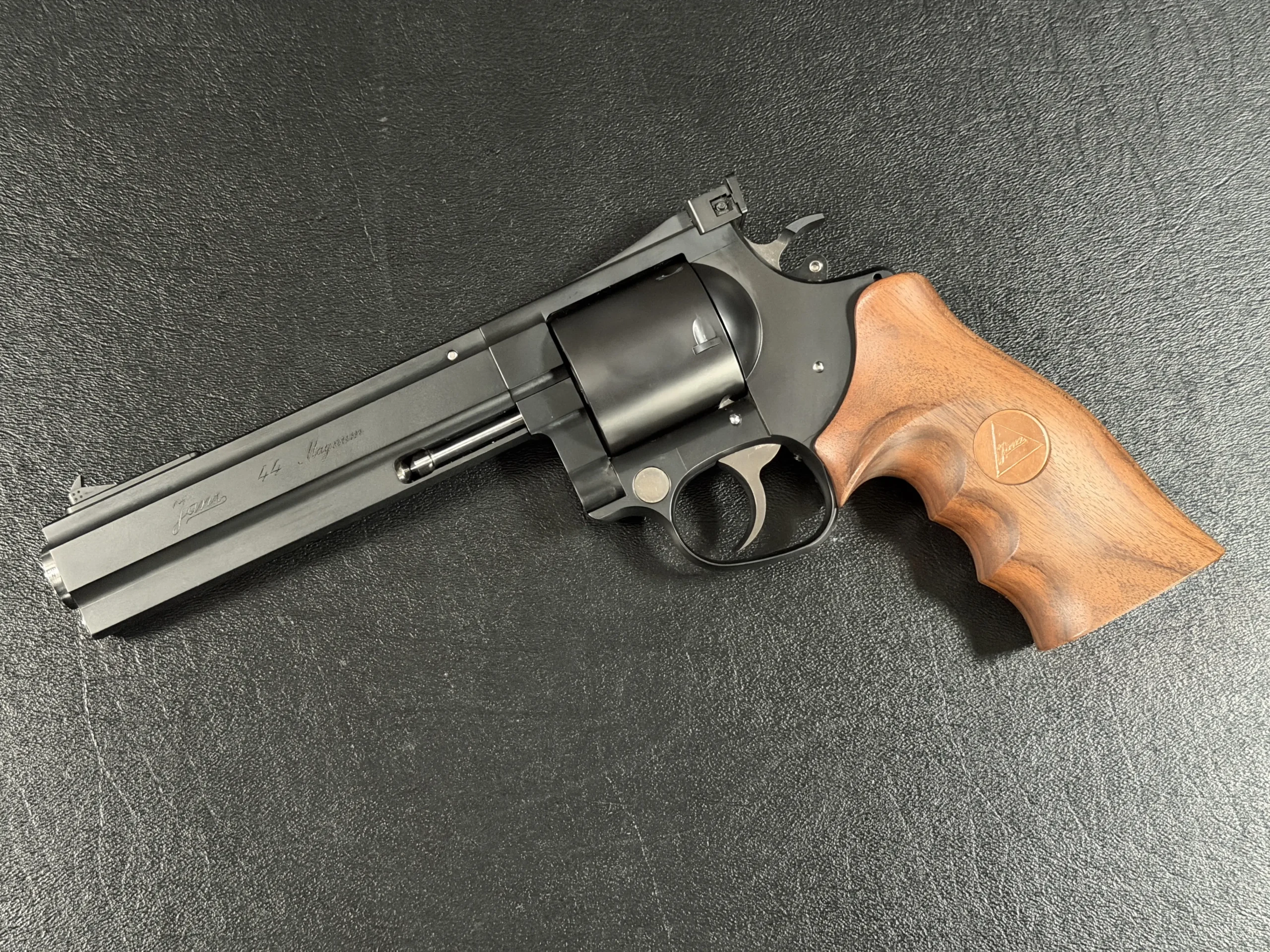 The revolver is fitted with an ergonomic walnut grip with palm swells and a Janz medallion, giving it a natural, hand-filling feel while complementing the substantial barrel weight. The 6-inch barrel also highlights the distinctive octagonal profile associated with the JTL line.