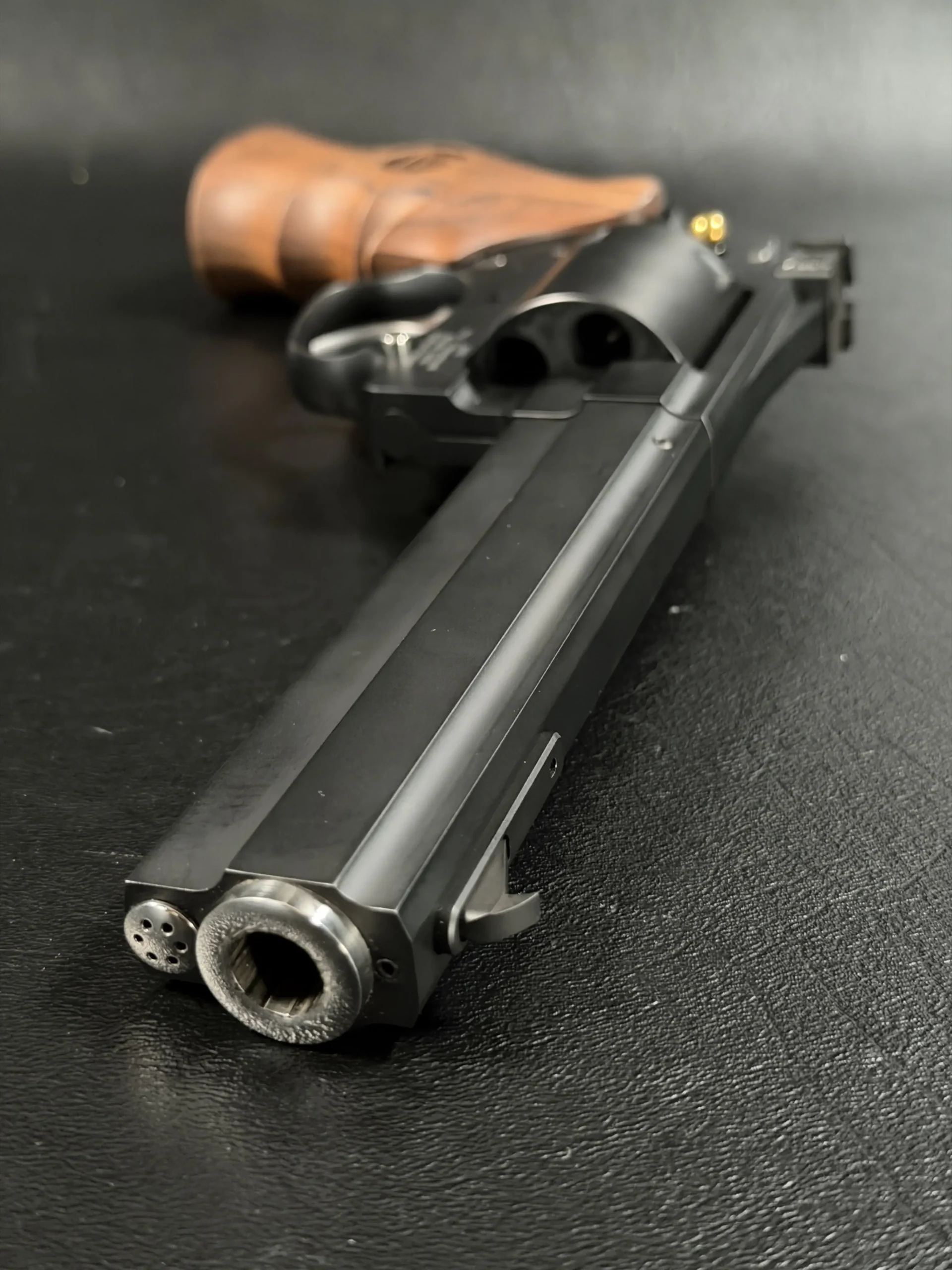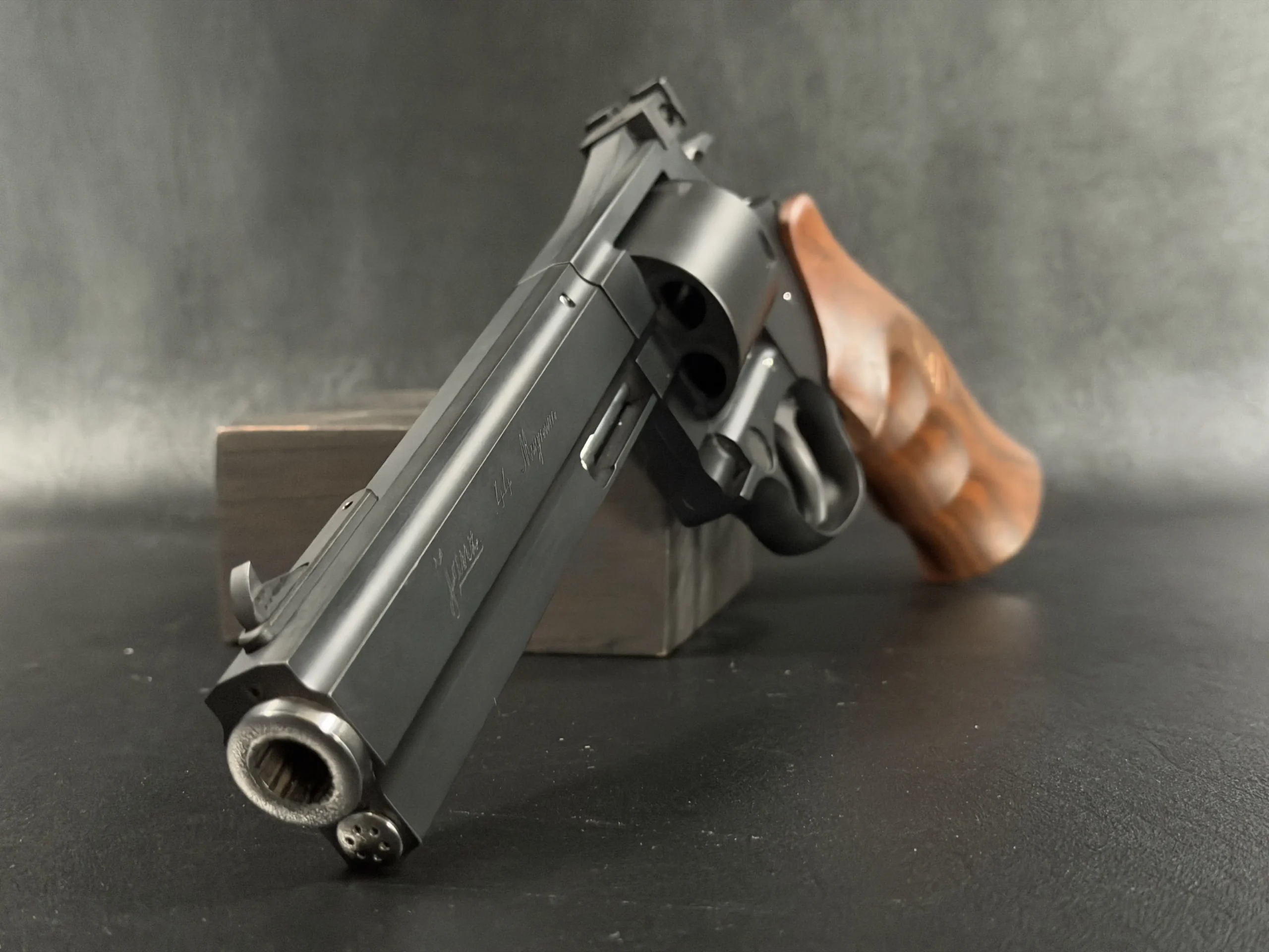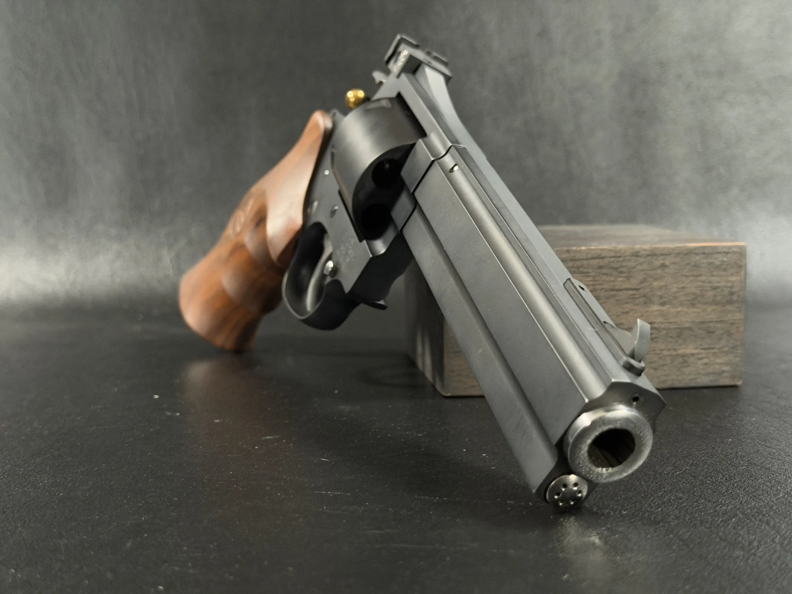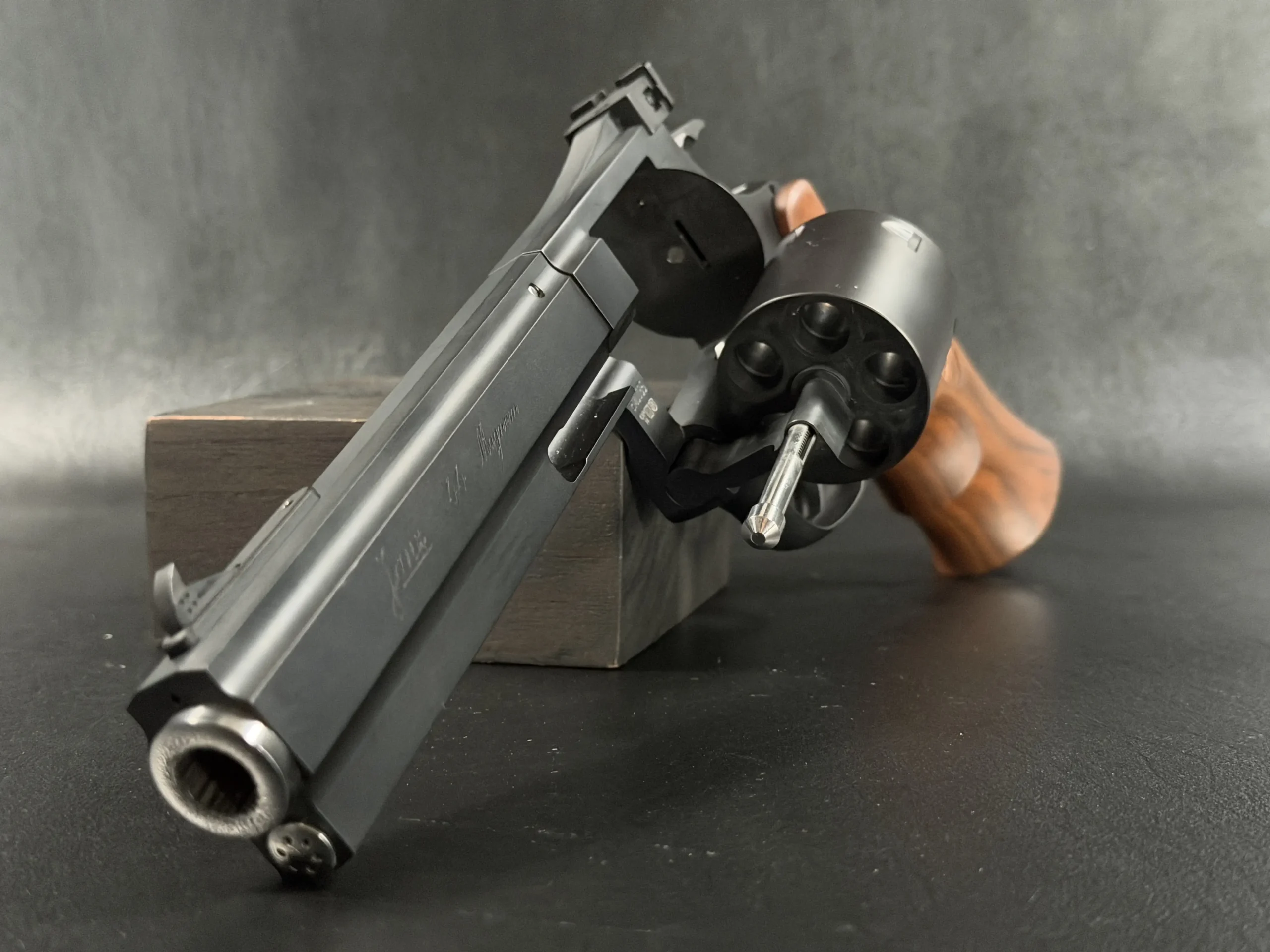 A deep matte finish across the frame and cylinder is paired with polished stainless accents at the muzzle and ejector rod for a restrained, elegant contrast. The barrel, cylinder, and frame are fitted as a matching set, reflecting the cohesive construction described in the original presentation.