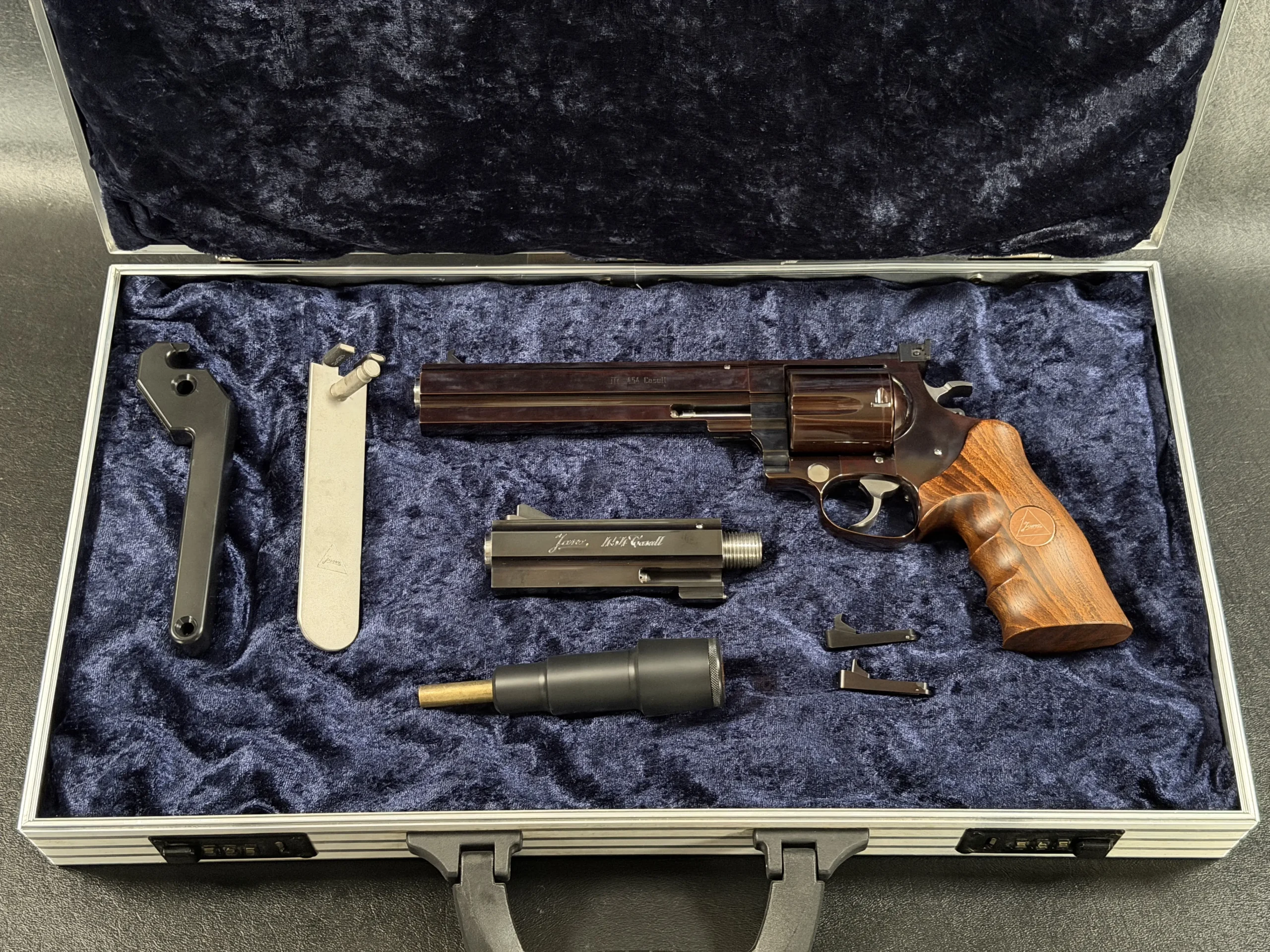Janz EMS JTL revolver set chambered in .545 Casull, presented with both 6-inch and 5-inch barrels. Includes factory tools and accessories in a velvet-lined presentation case.