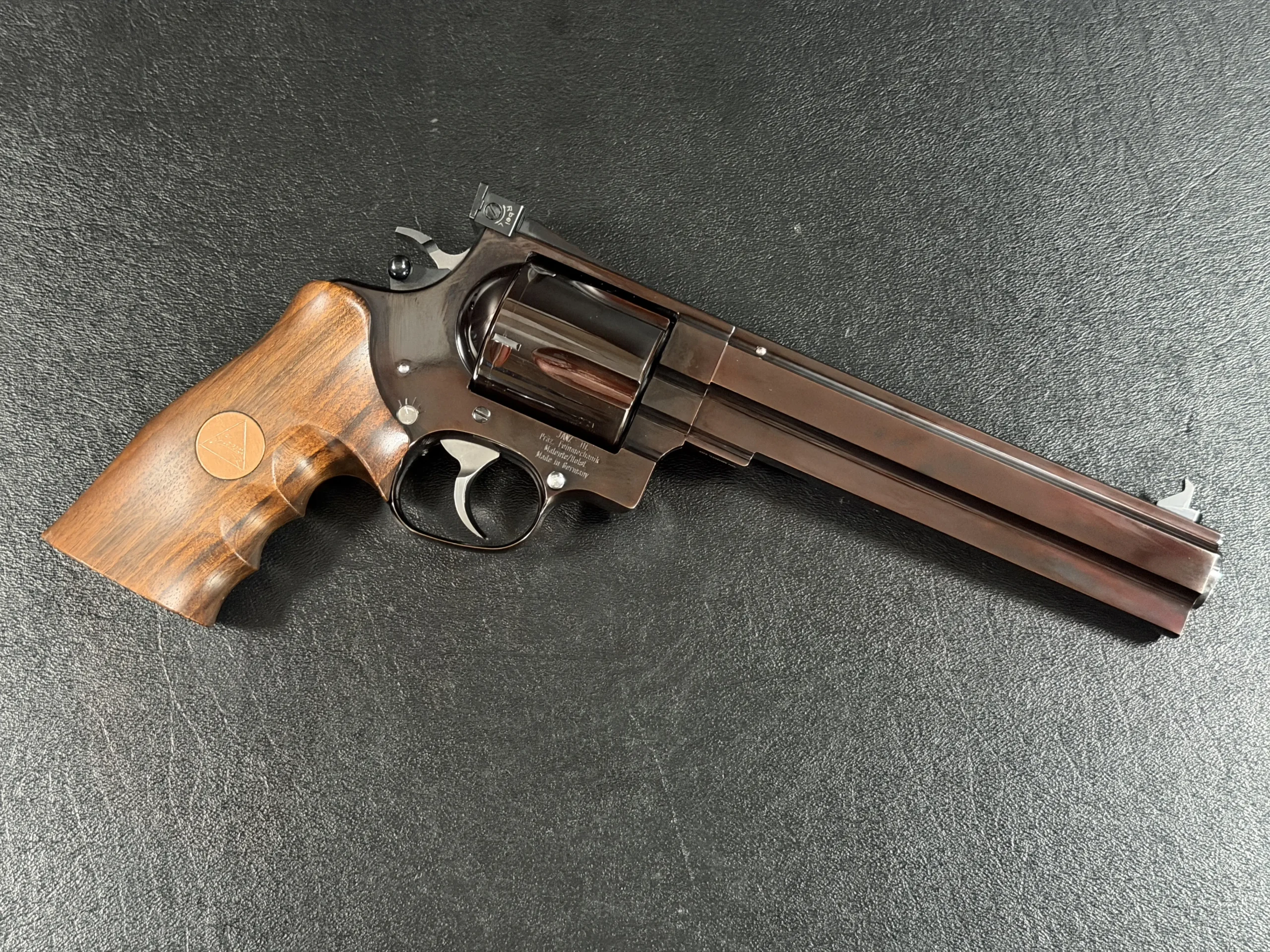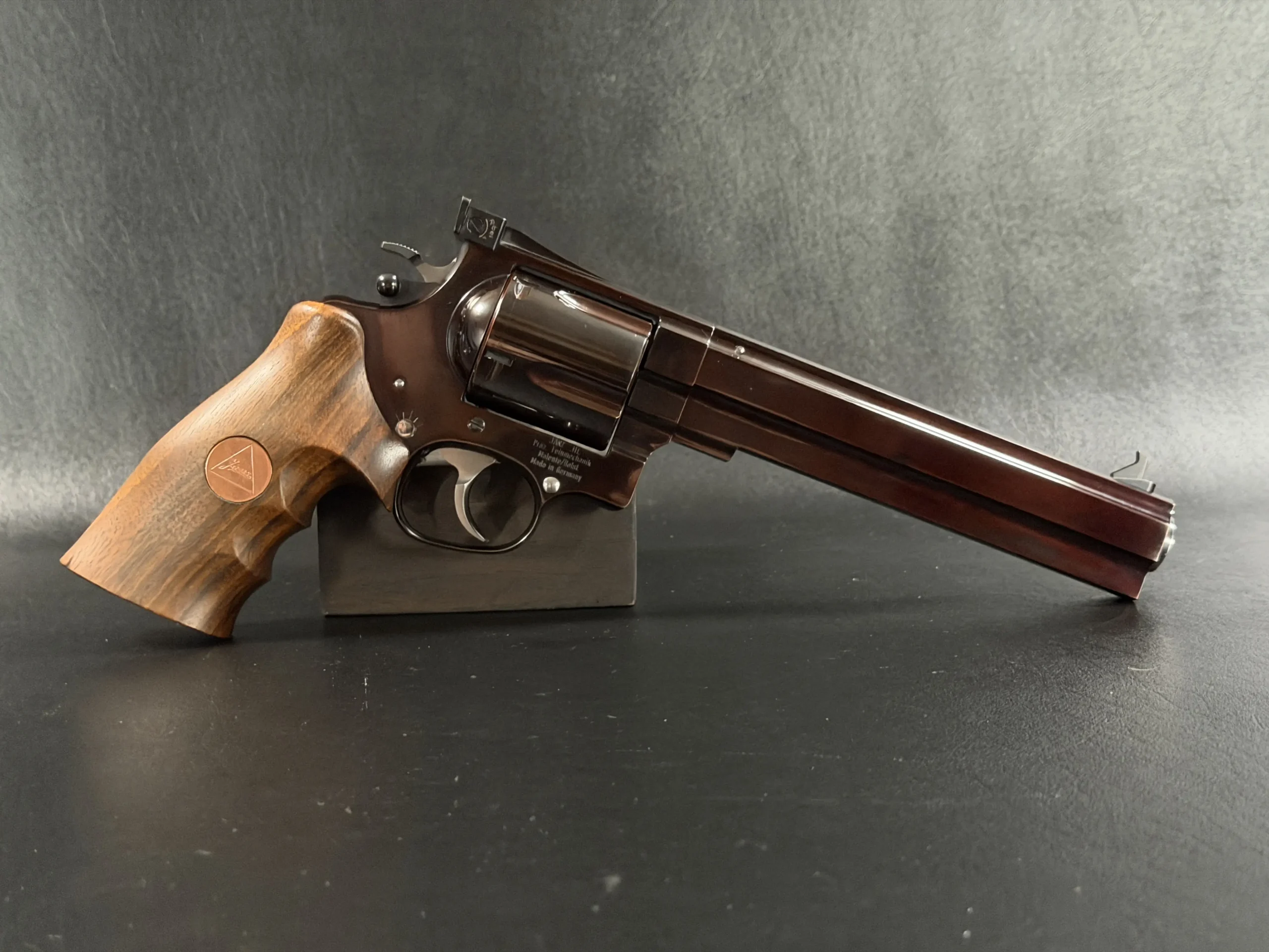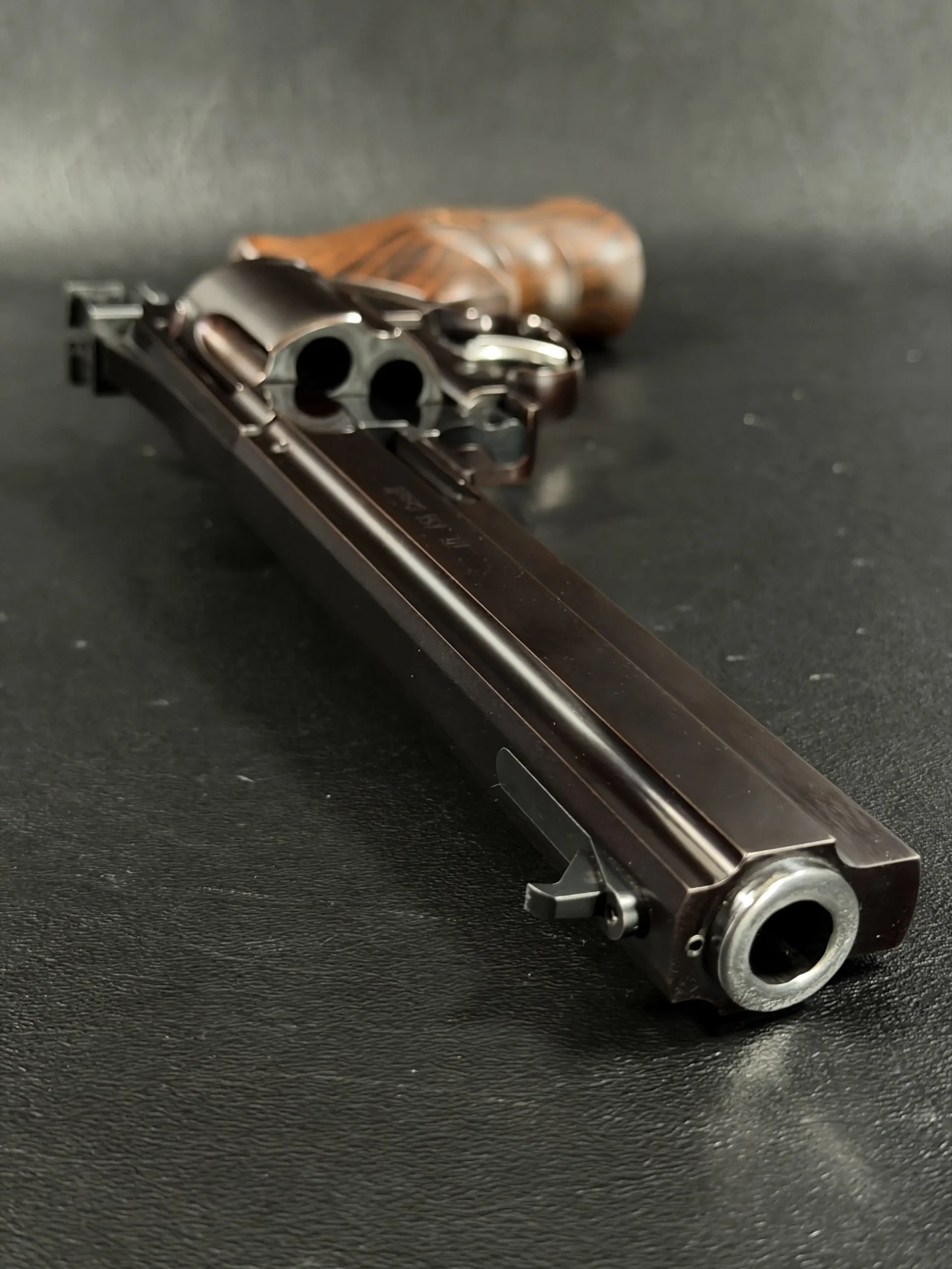 The polished steel surfaces show a deep, mirror-like appearance, paired with a walnut ergonomic grip inlaid with the Janz medallion. Together, these details give the revolver a distinctive visual presence while maintaining the clean, purposeful character of the EMS series.