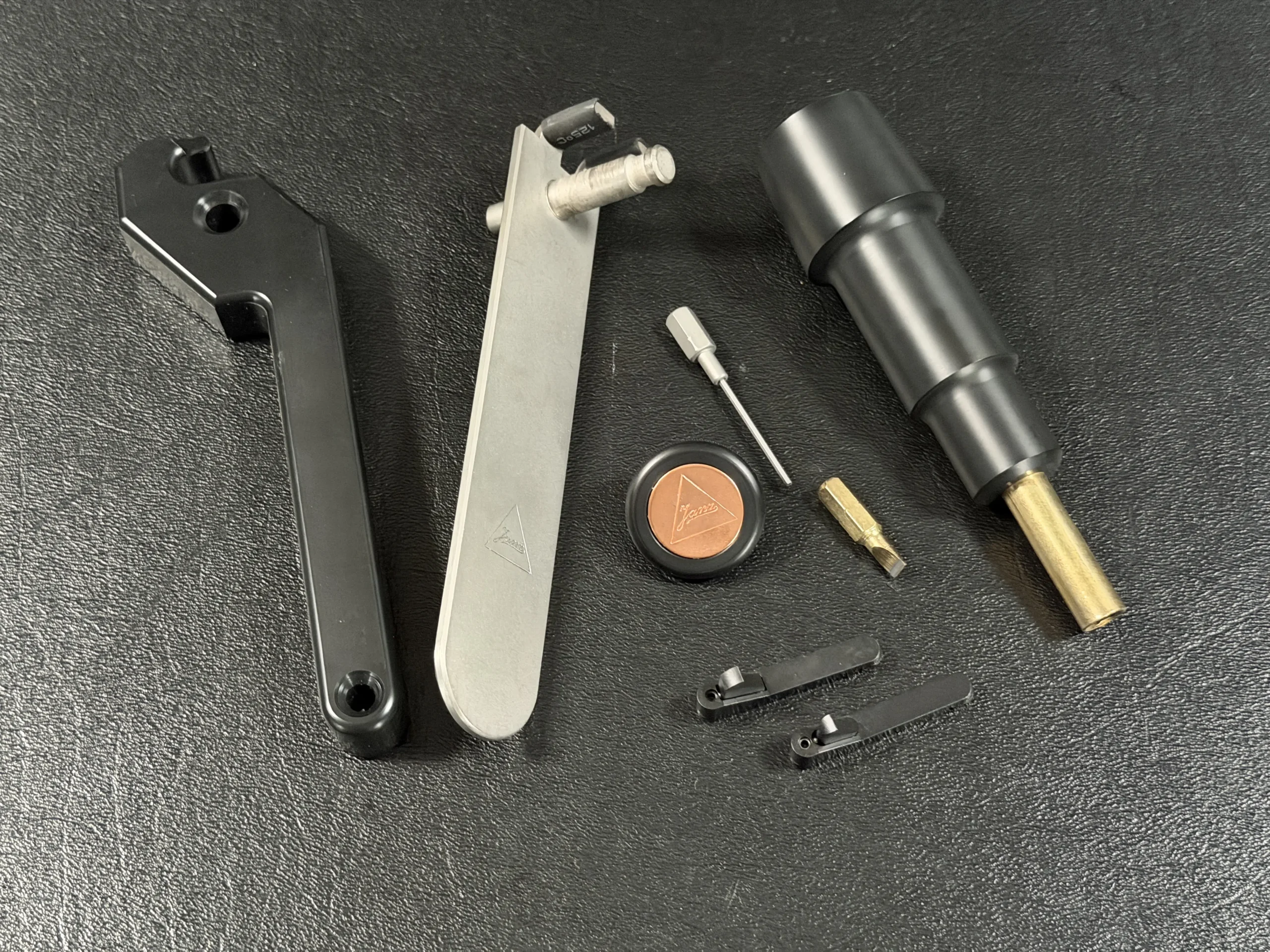 This set includes an extensive suite of factory tools and accessories, fitted in a velvet-lined presentation case. The kit is intended for barrel changes, extractor adjustments, and precision tuning, making this a complete multi-barrel Janz system with its accompanying components.