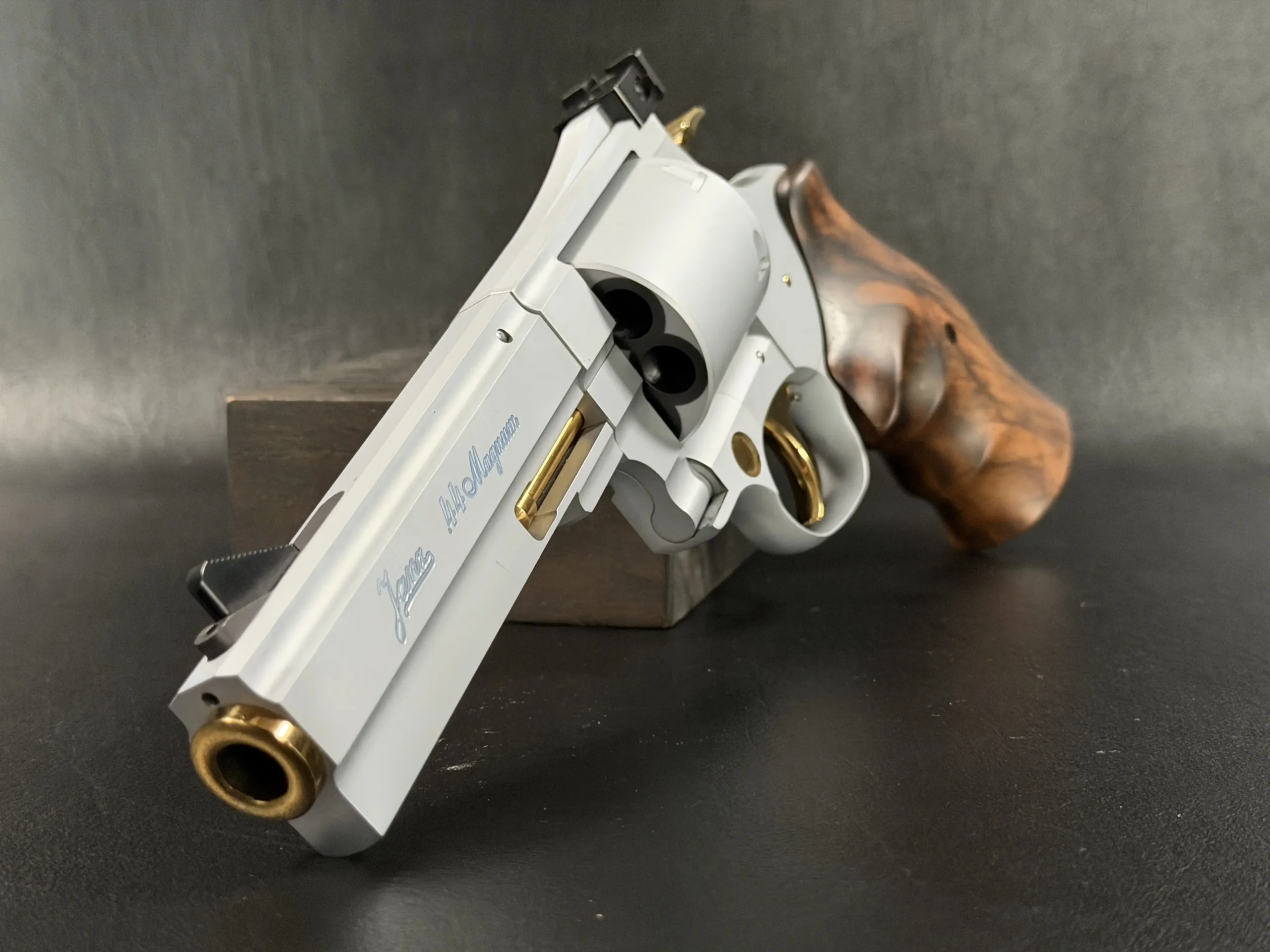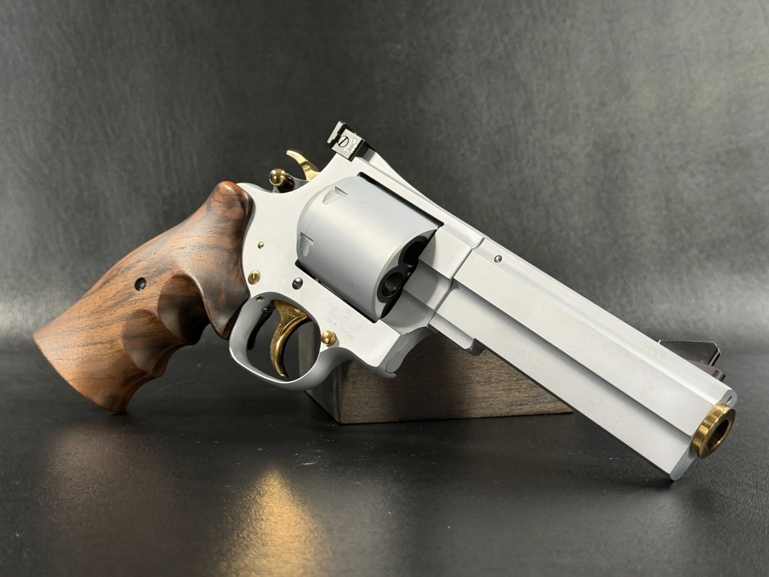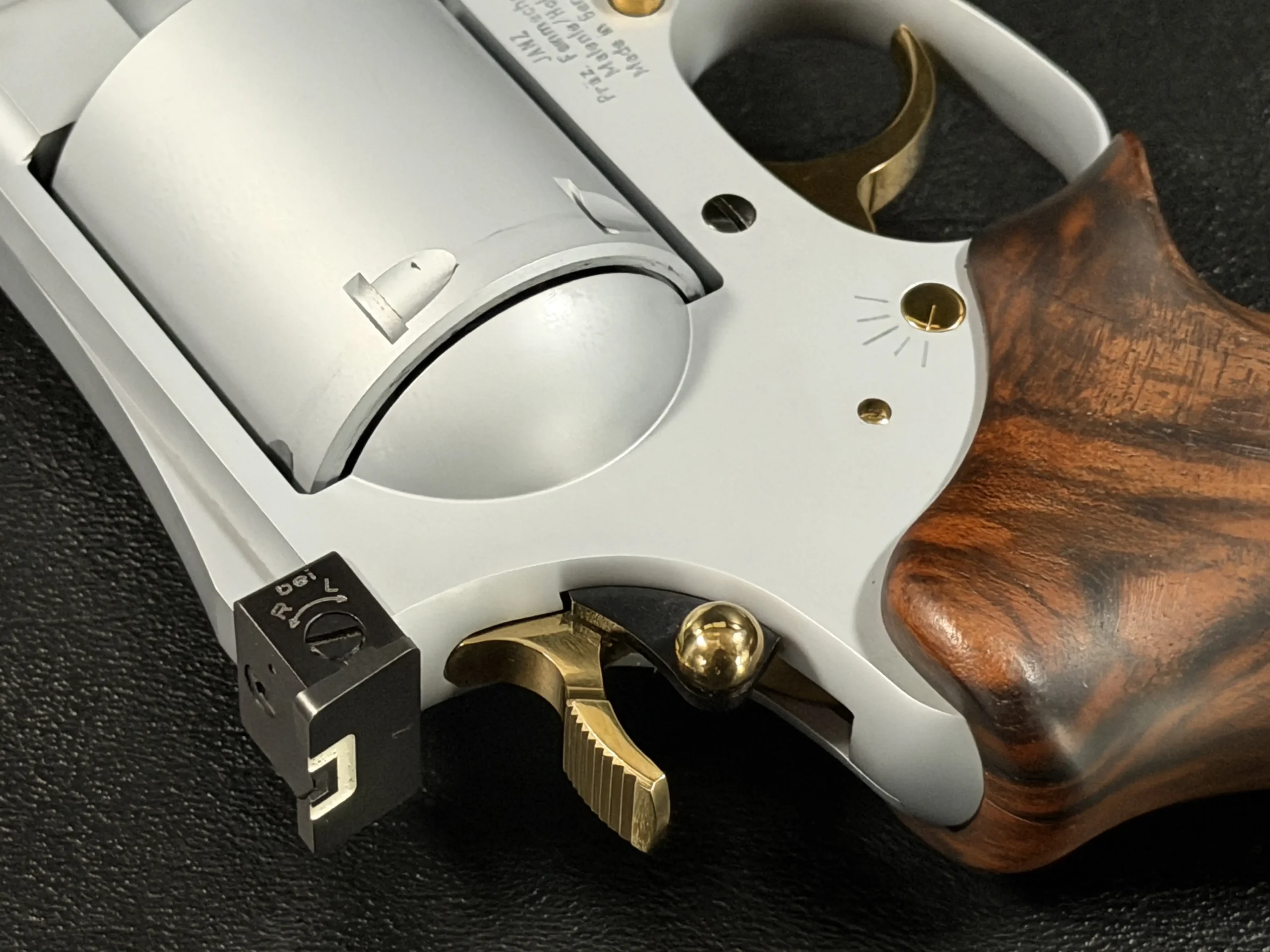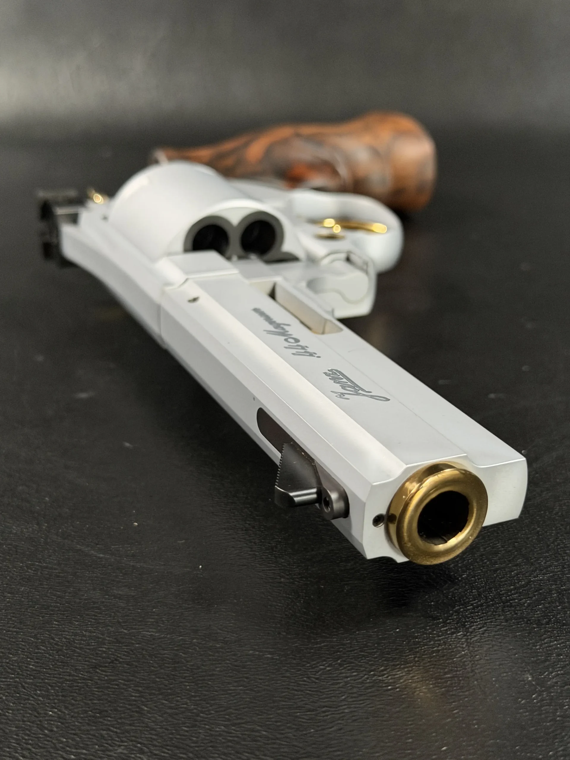 Deeply figured wood grips bring warmth and contrast to the stainless finish, while gold-toned accents add a refined visual touch throughout the revolver and its conversion components. Complete and thoughtfully presented, this EMS JTL set brings together precision manufacturing, modular design, and a distinctive premium finish.