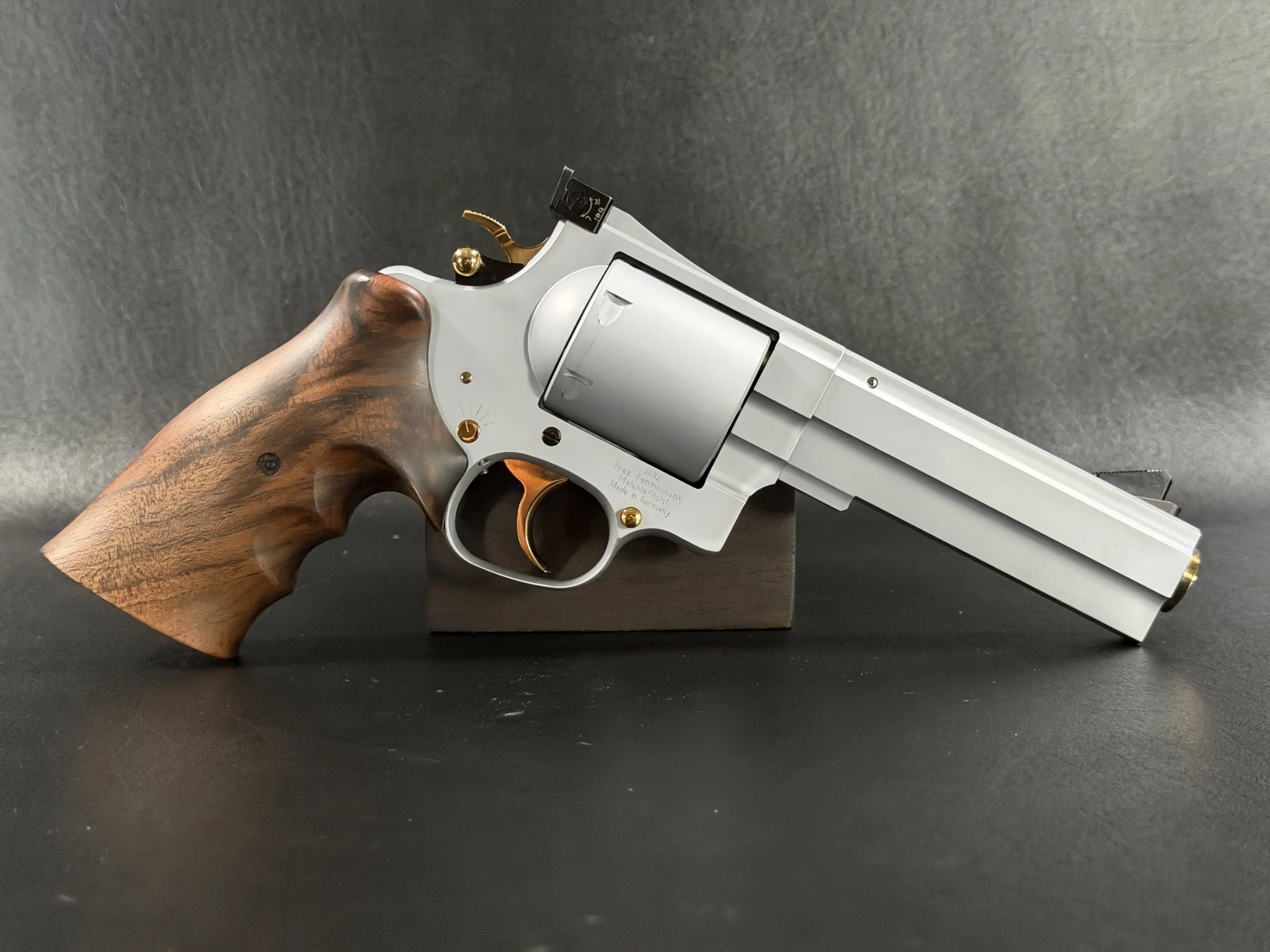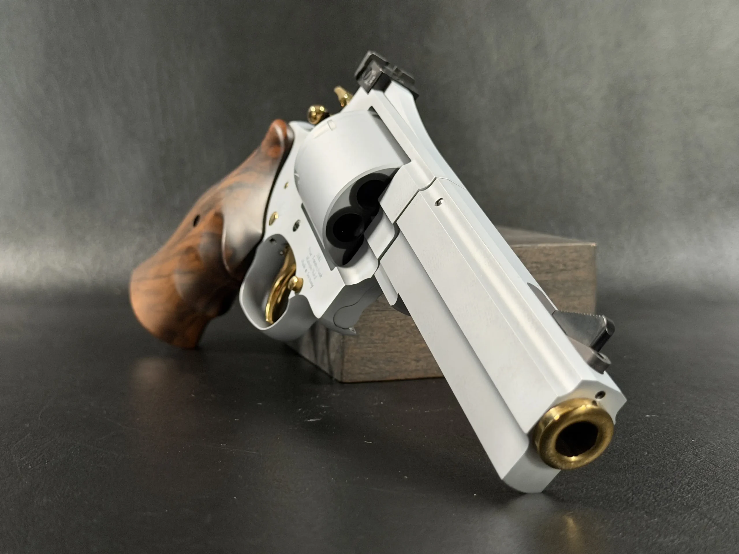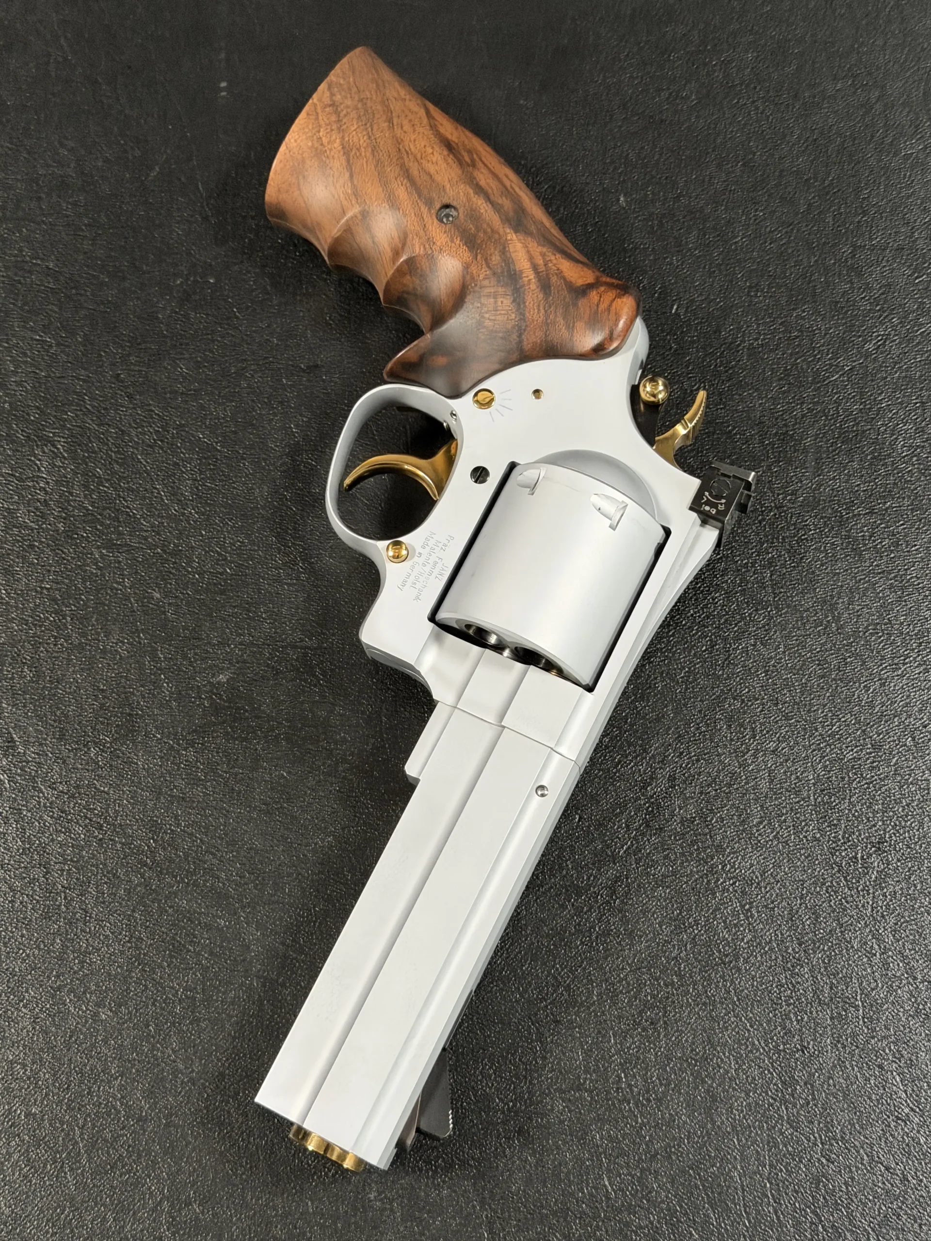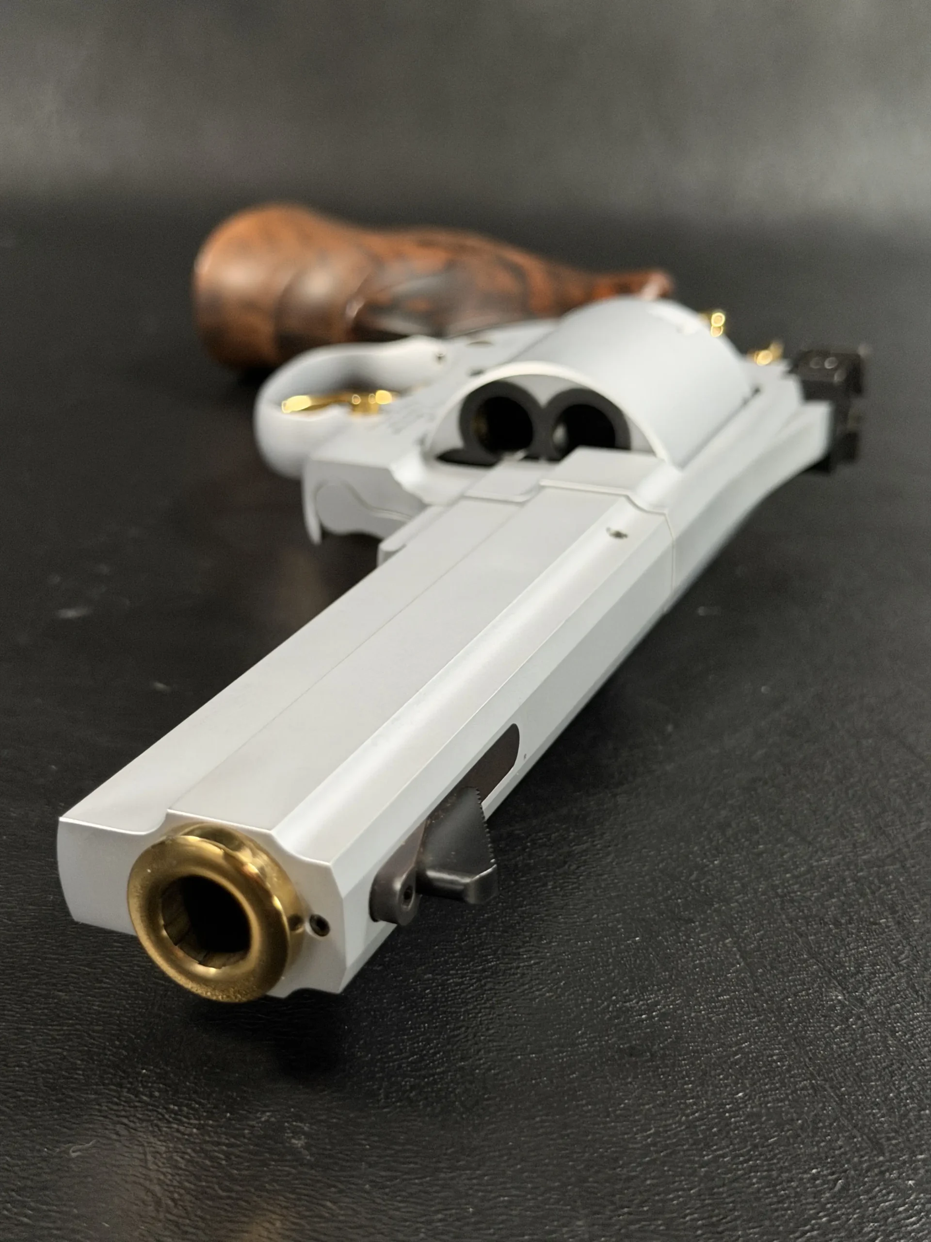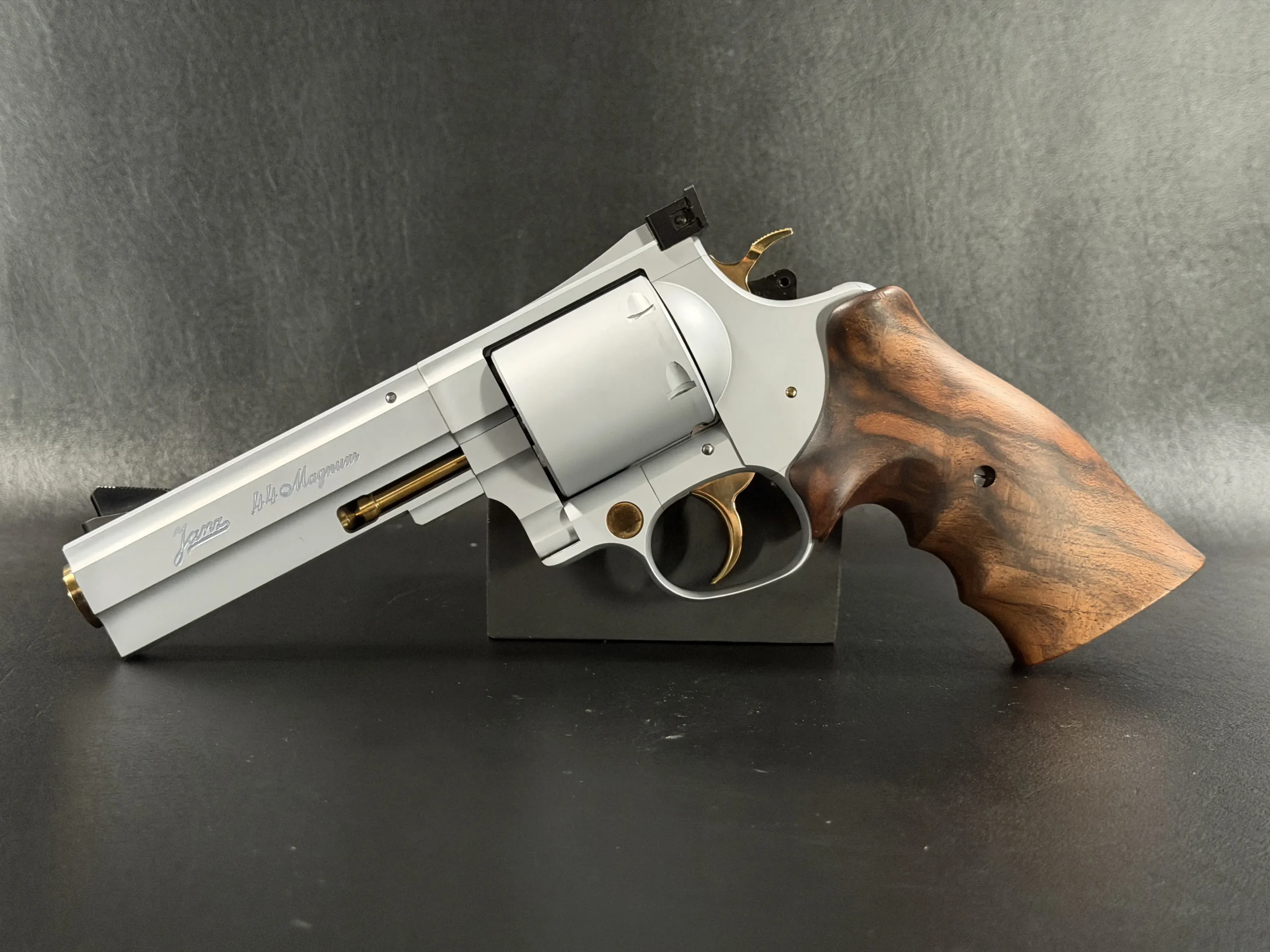 Deeply figured wood grips bring warmth and contrast to the stainless finish, while gold-toned accents add a refined visual touch throughout the revolver and its conversion components. Complete and thoughtfully presented, this EMS JTL set brings together precision manufacturing, modular design, and a distinctive premium finish.