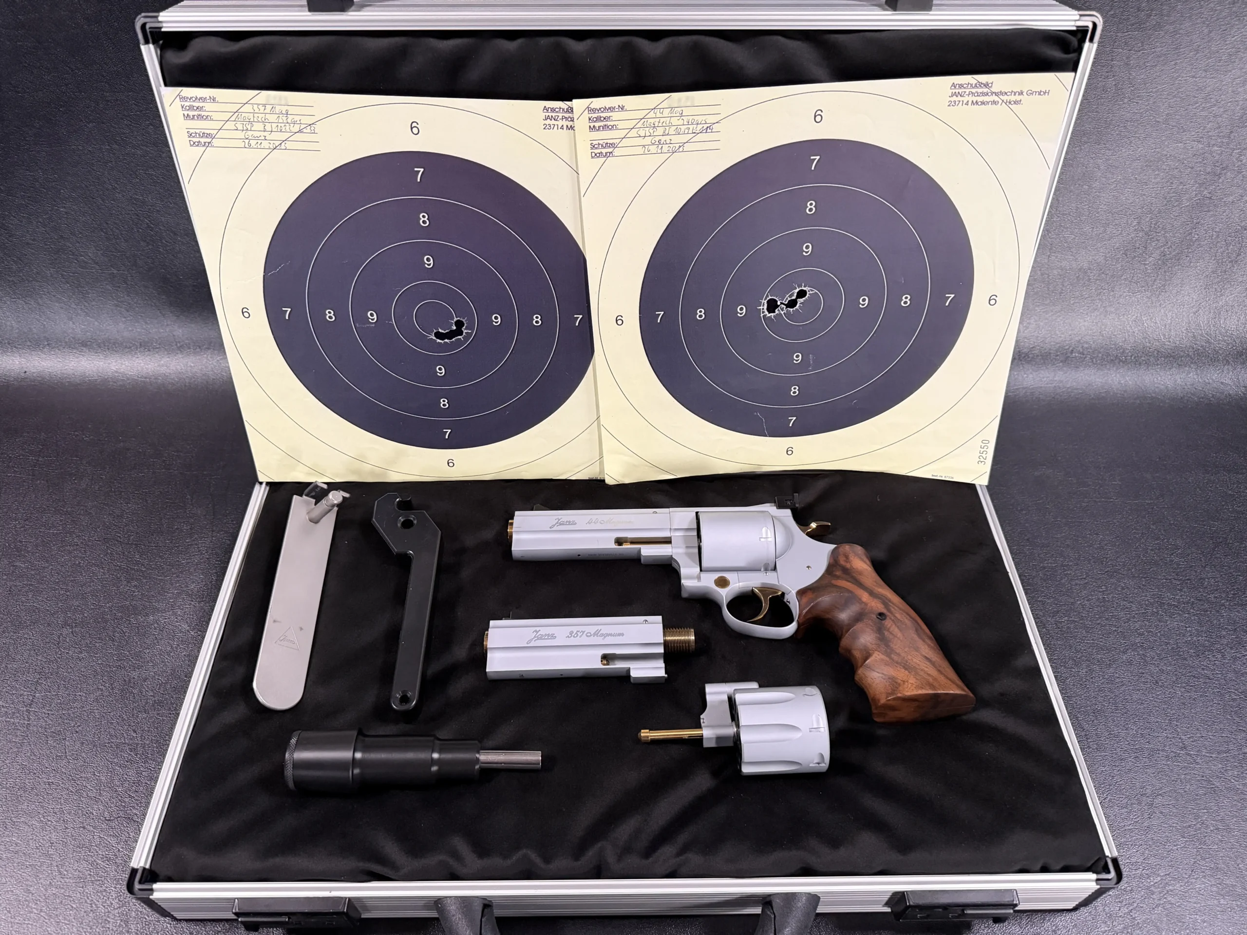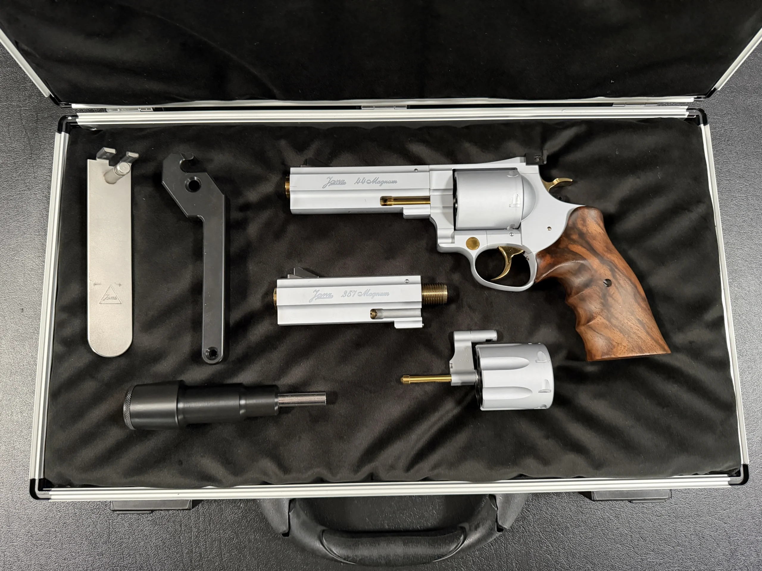 This set includes both .44 Magnum and .357 Magnum configurations, with dedicated matching barrels and cylinders for each caliber. Factory tools for the conversion system are included in the fitted case, allowing the revolver to be reconfigured with the components supplied in the set.