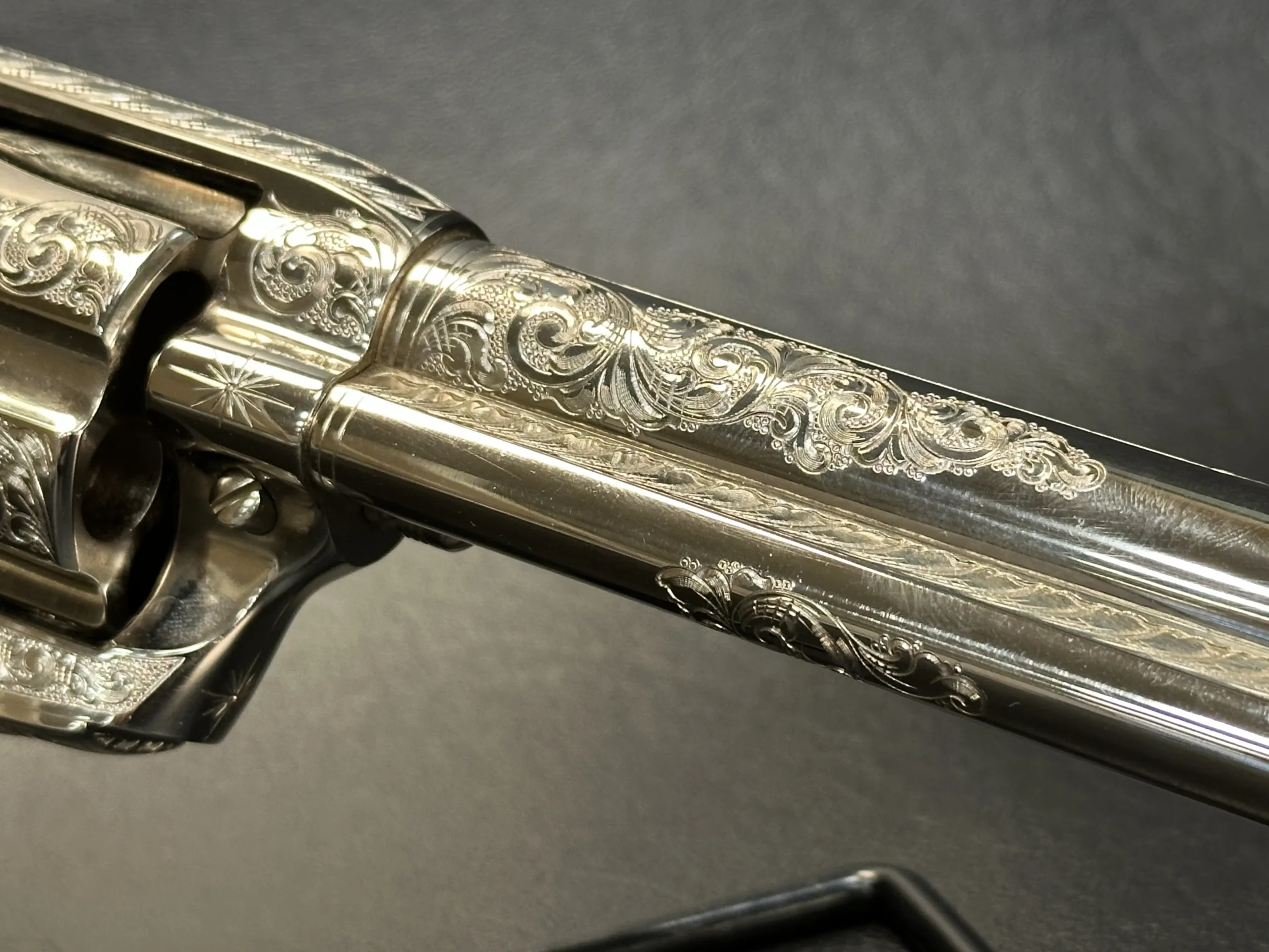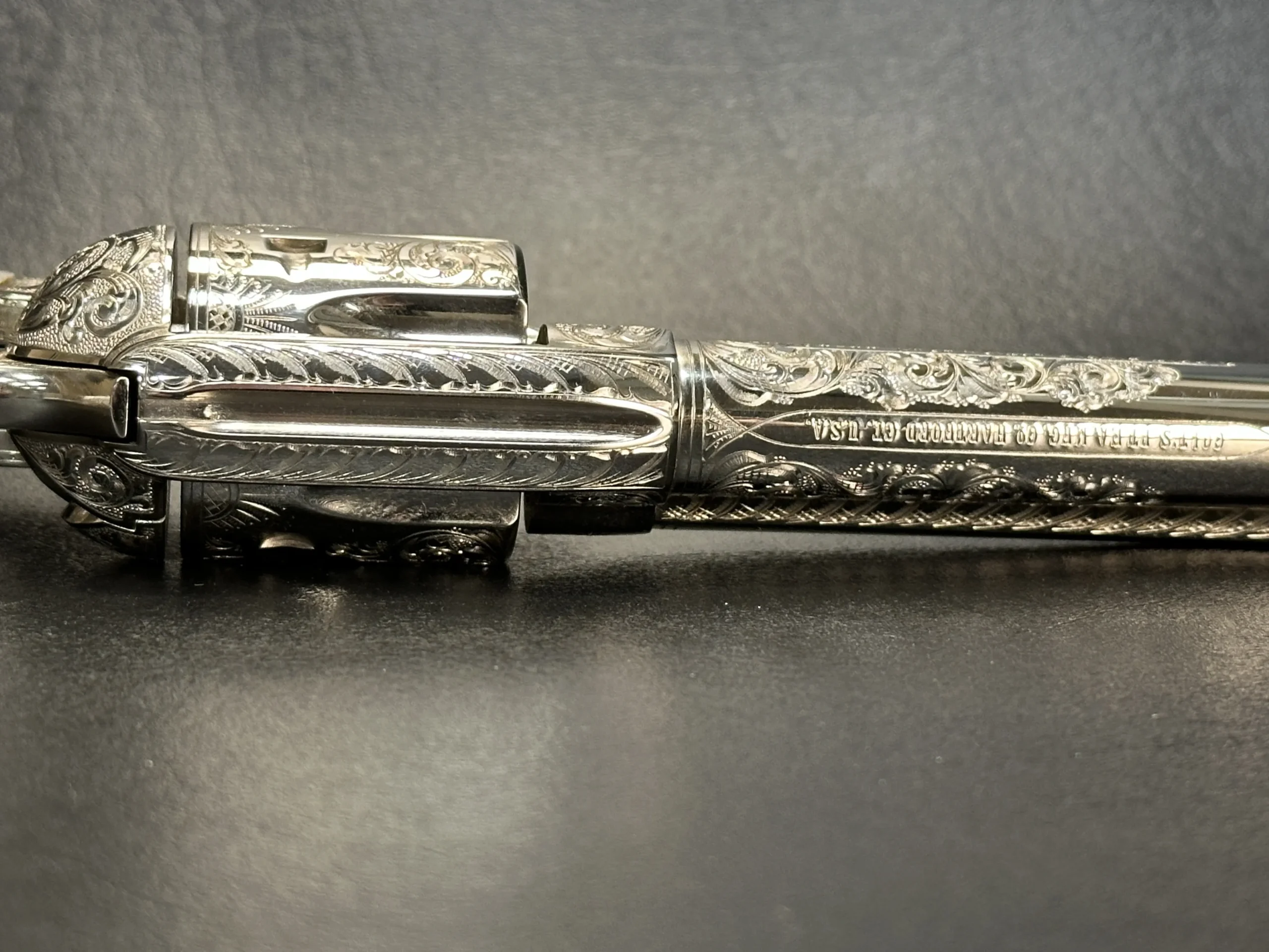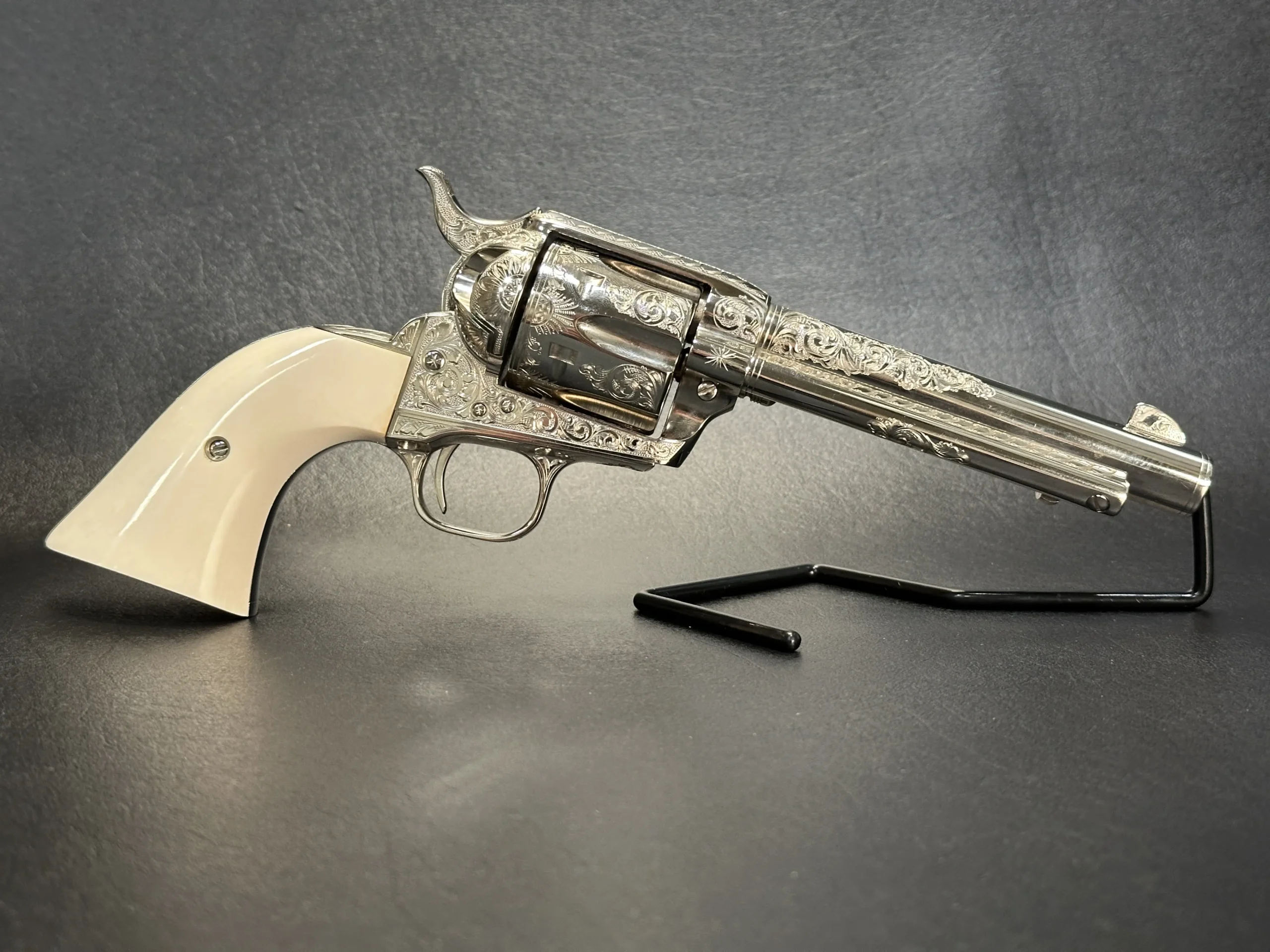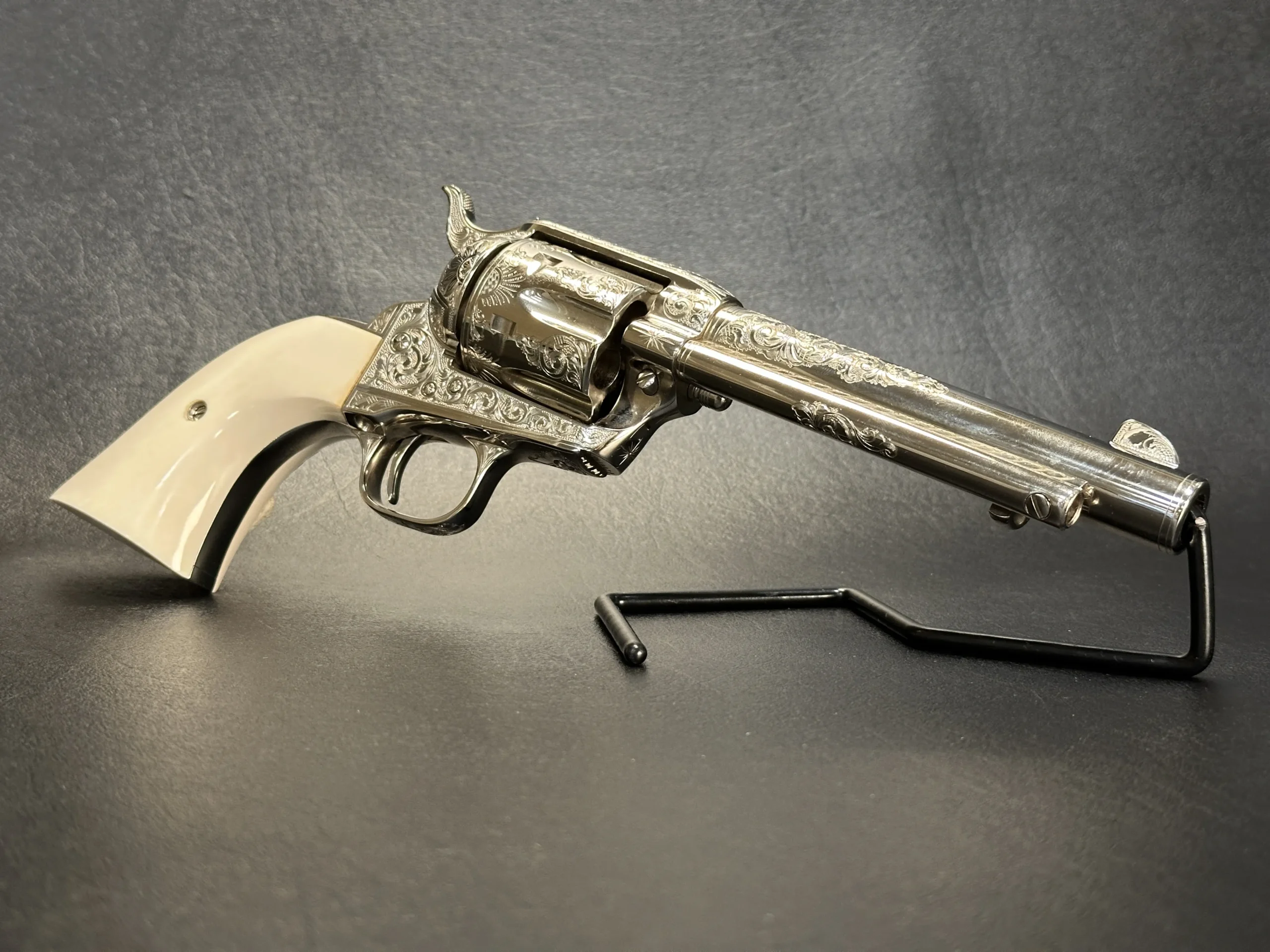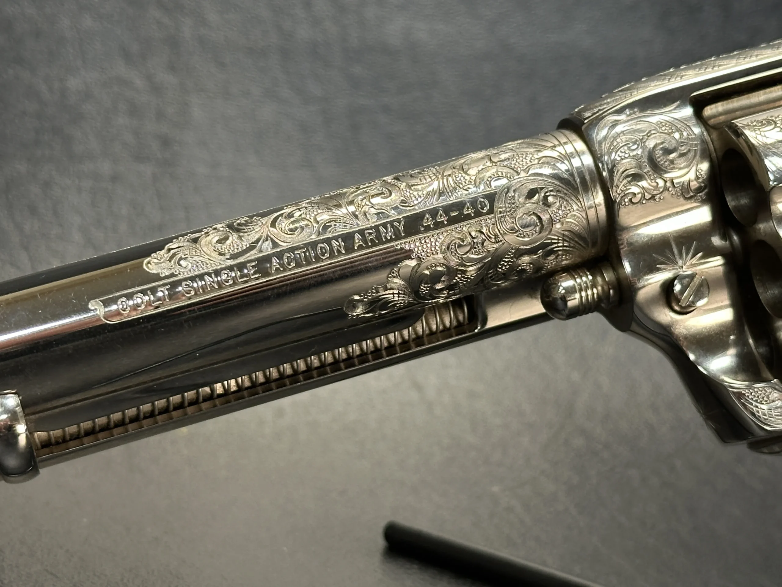 This 1993 Colt Single Action Army 3rd Generation revolver showcases extensive hand engraving by John Adams Jr. Floral scrollwork runs along the barrel and frame, framed by dual engraved bands at the muzzle and frame. The design flows around the original Colt markings and continues across the revolver with matching coverage on the hammer, cylinder, trigger guard, back strap, ejector rod housing, cylinder pin release, loading gate, and top strap.