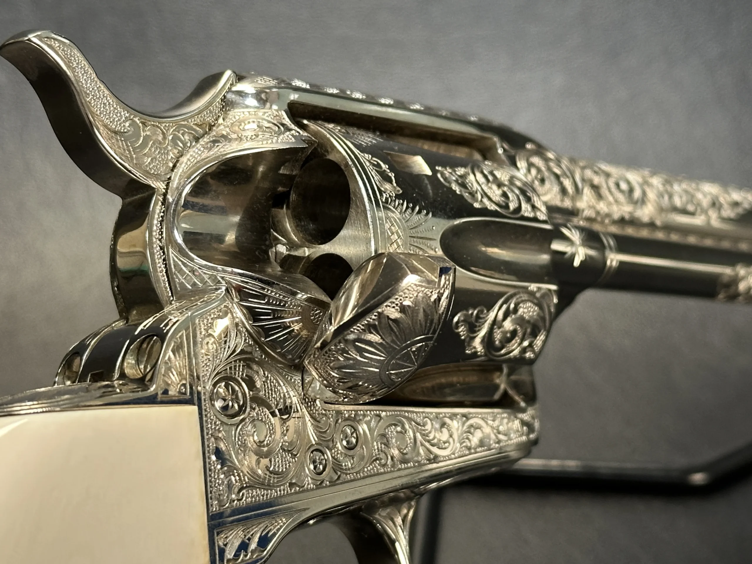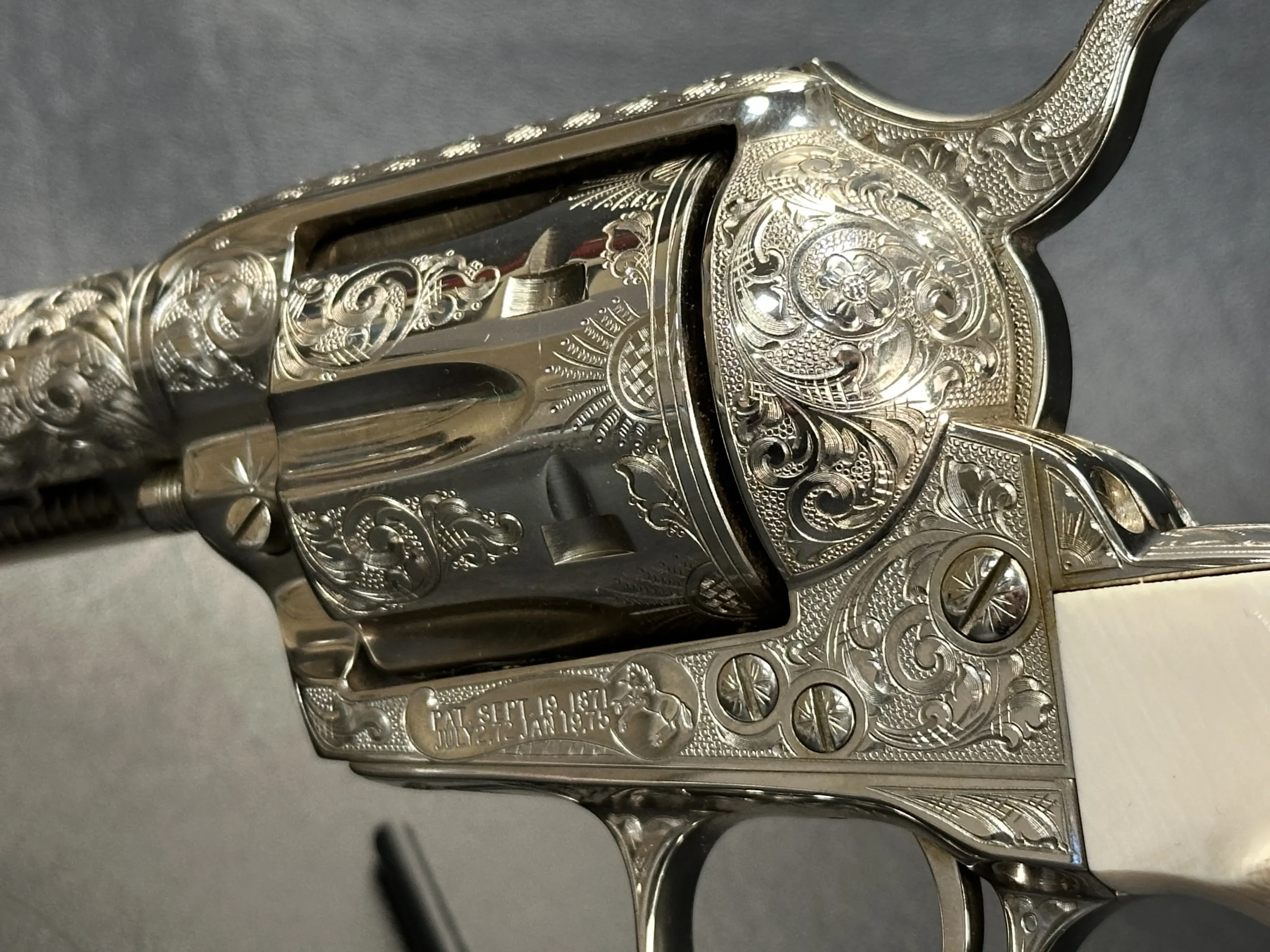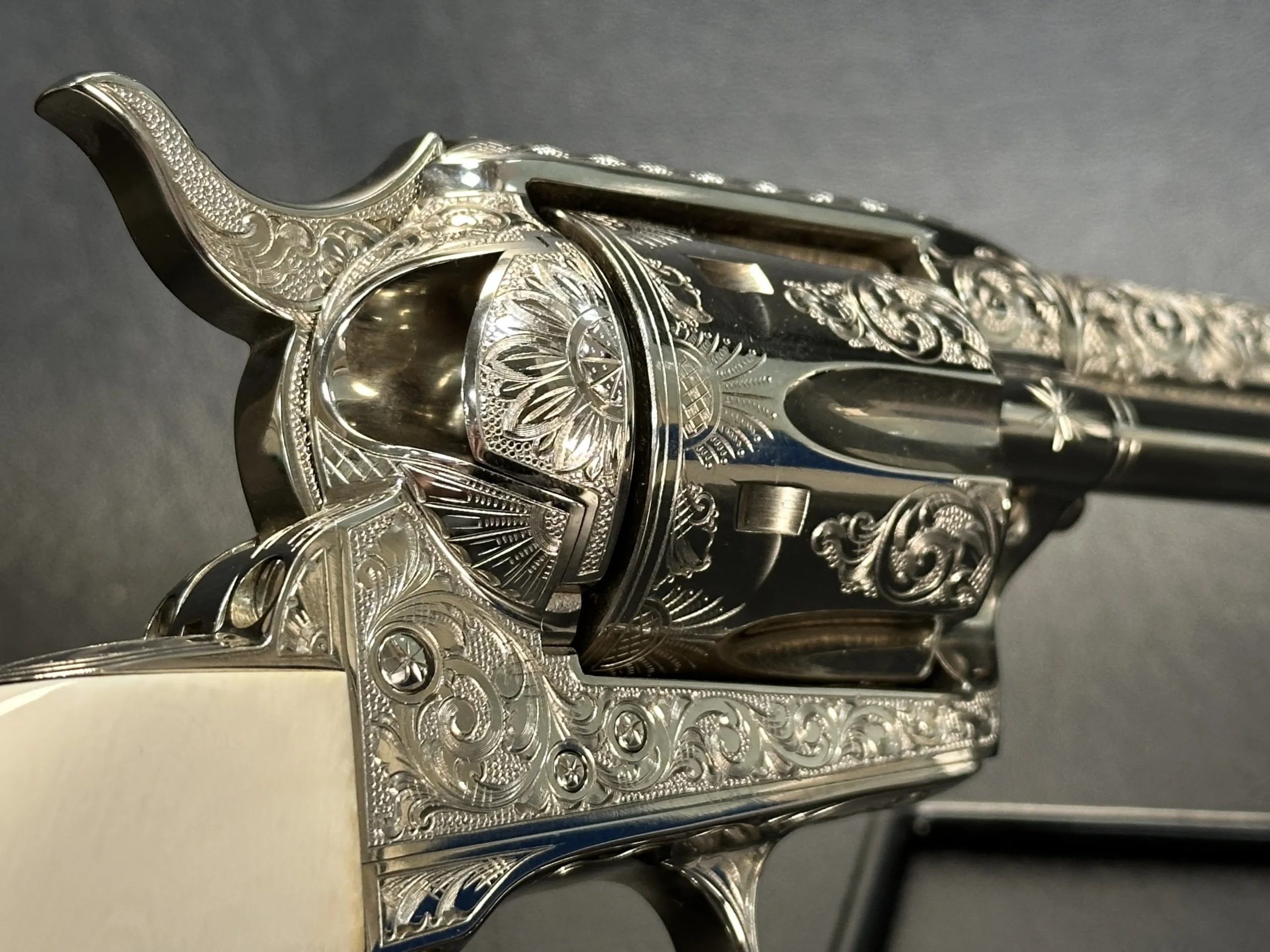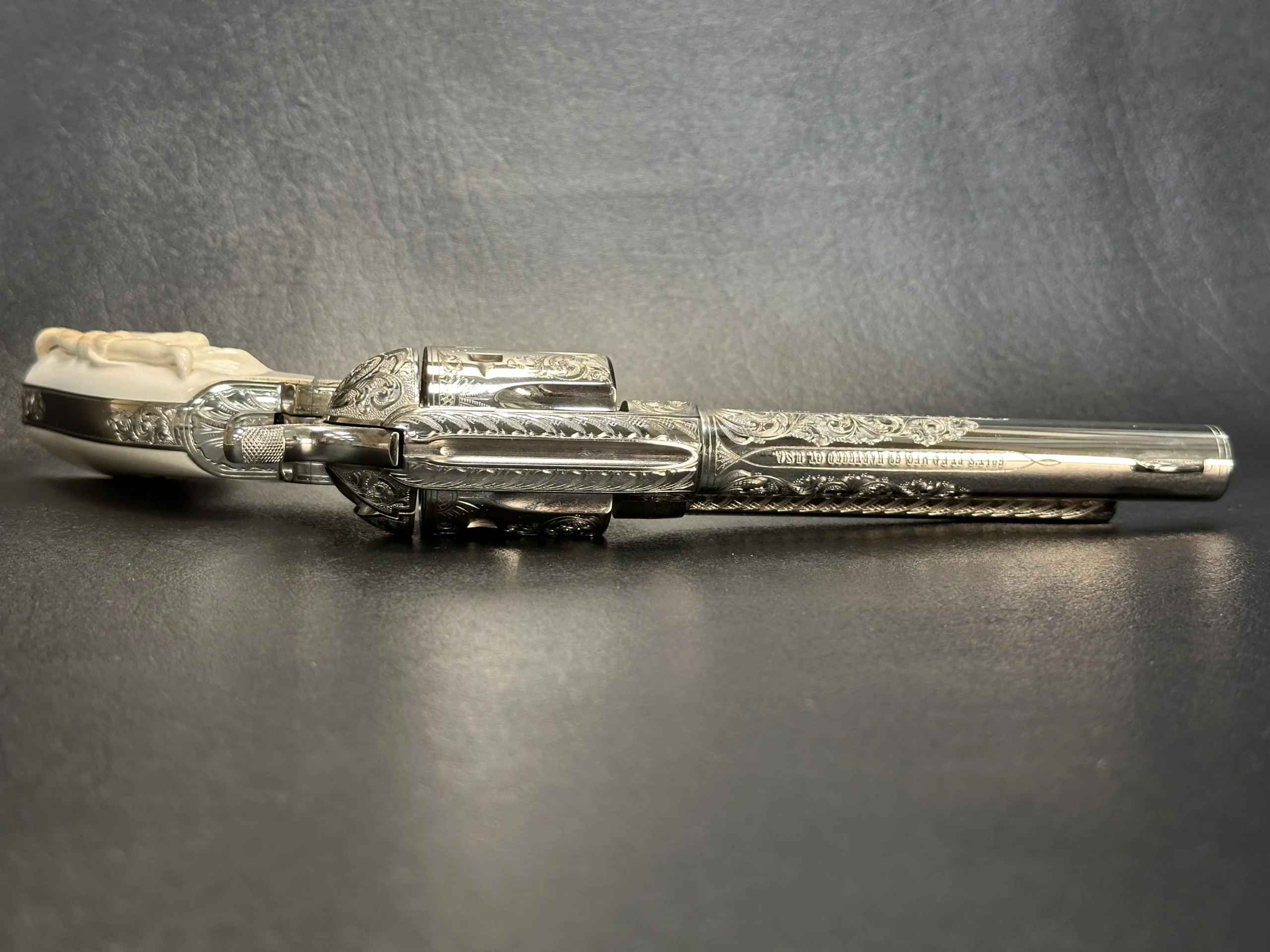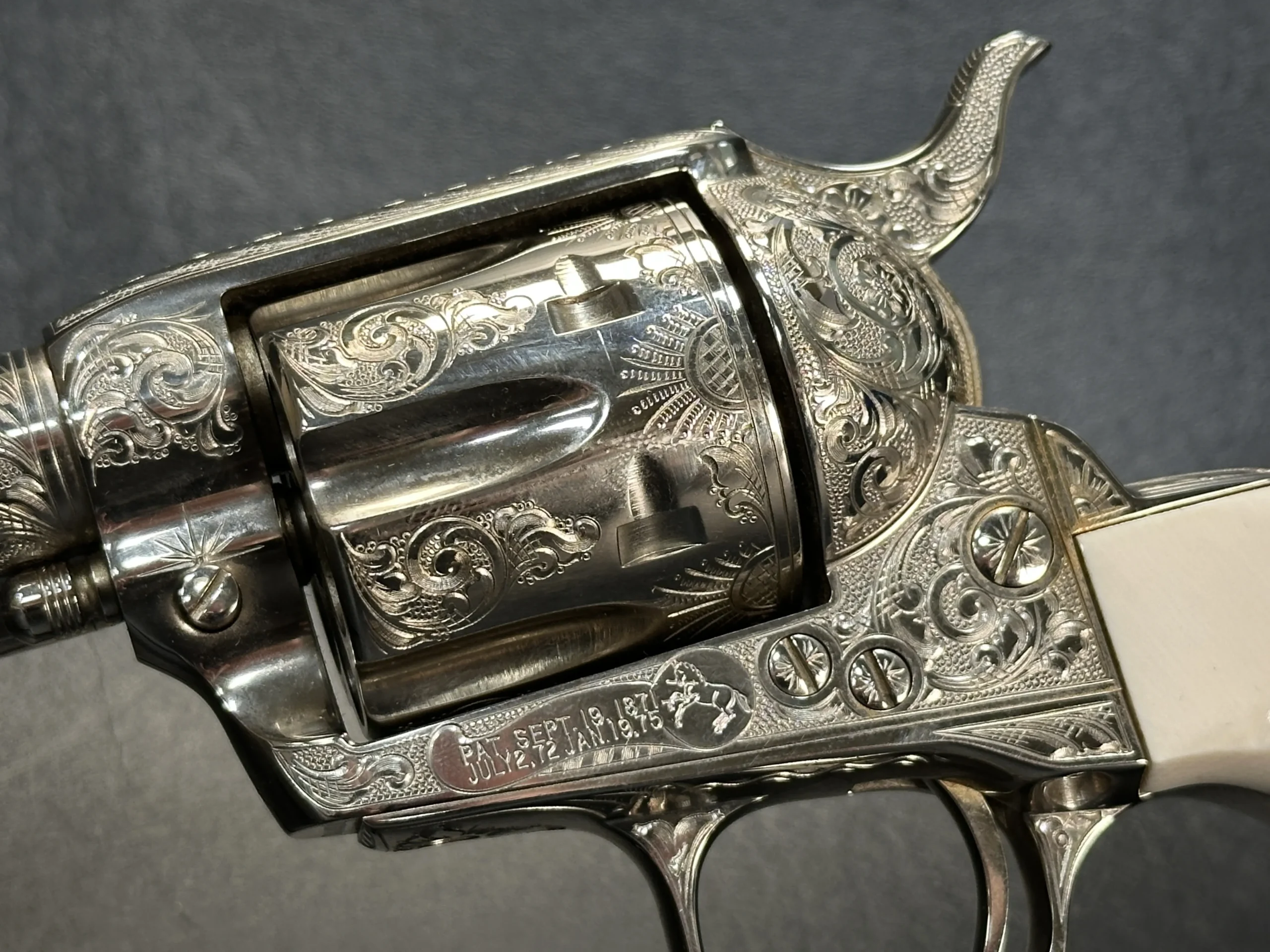 Additional details include a starburst motif on the frame, a finely cut floral design on the loading gate, and leafy engraving along the top strap. John Adams Jr. signed the trigger guard, adding a discreet finishing touch to the overall composition.
