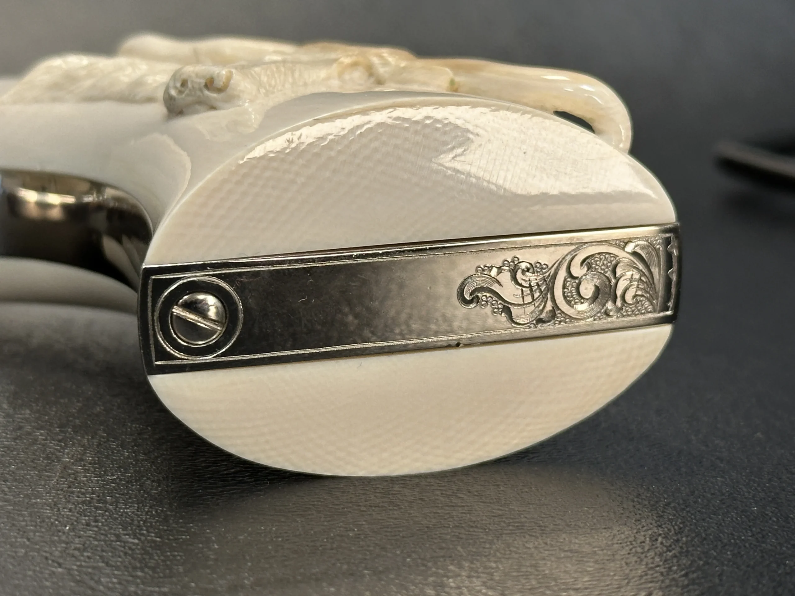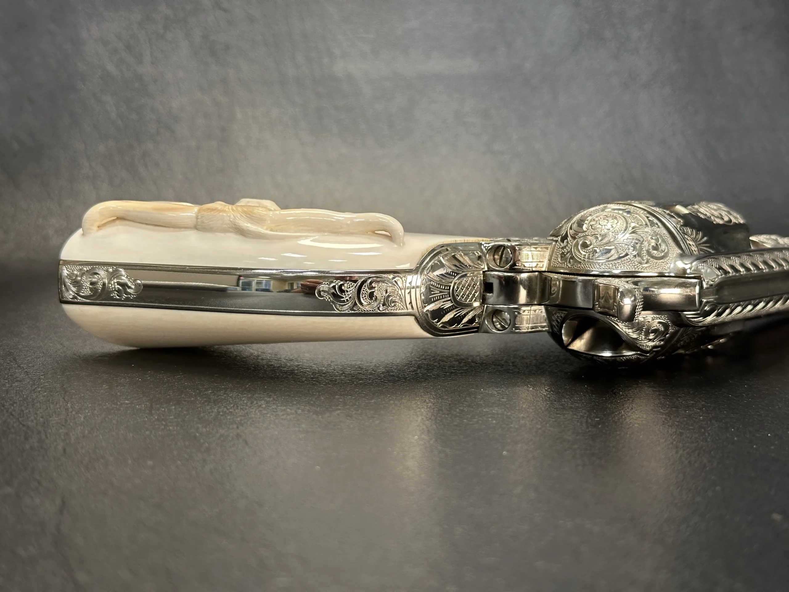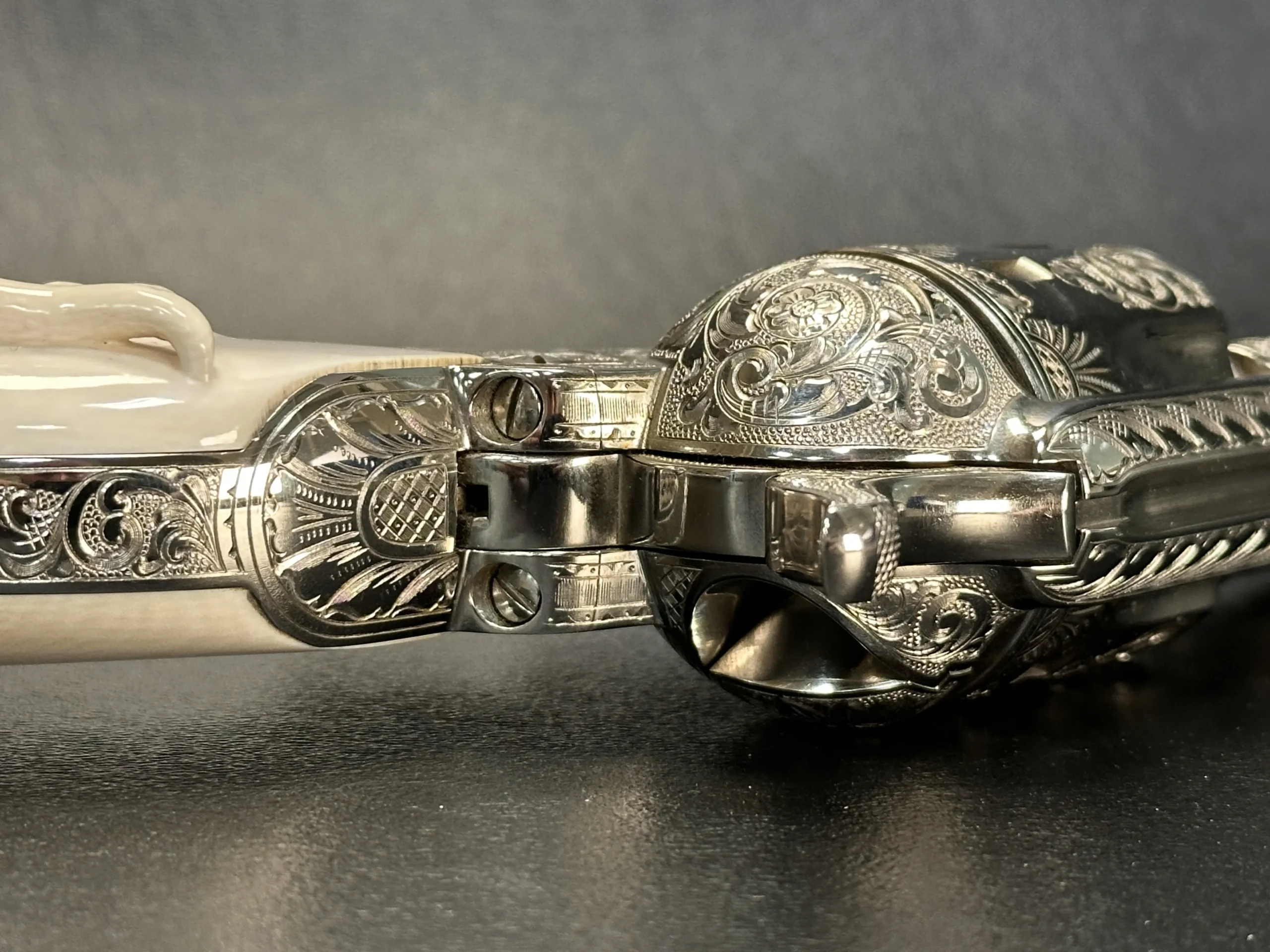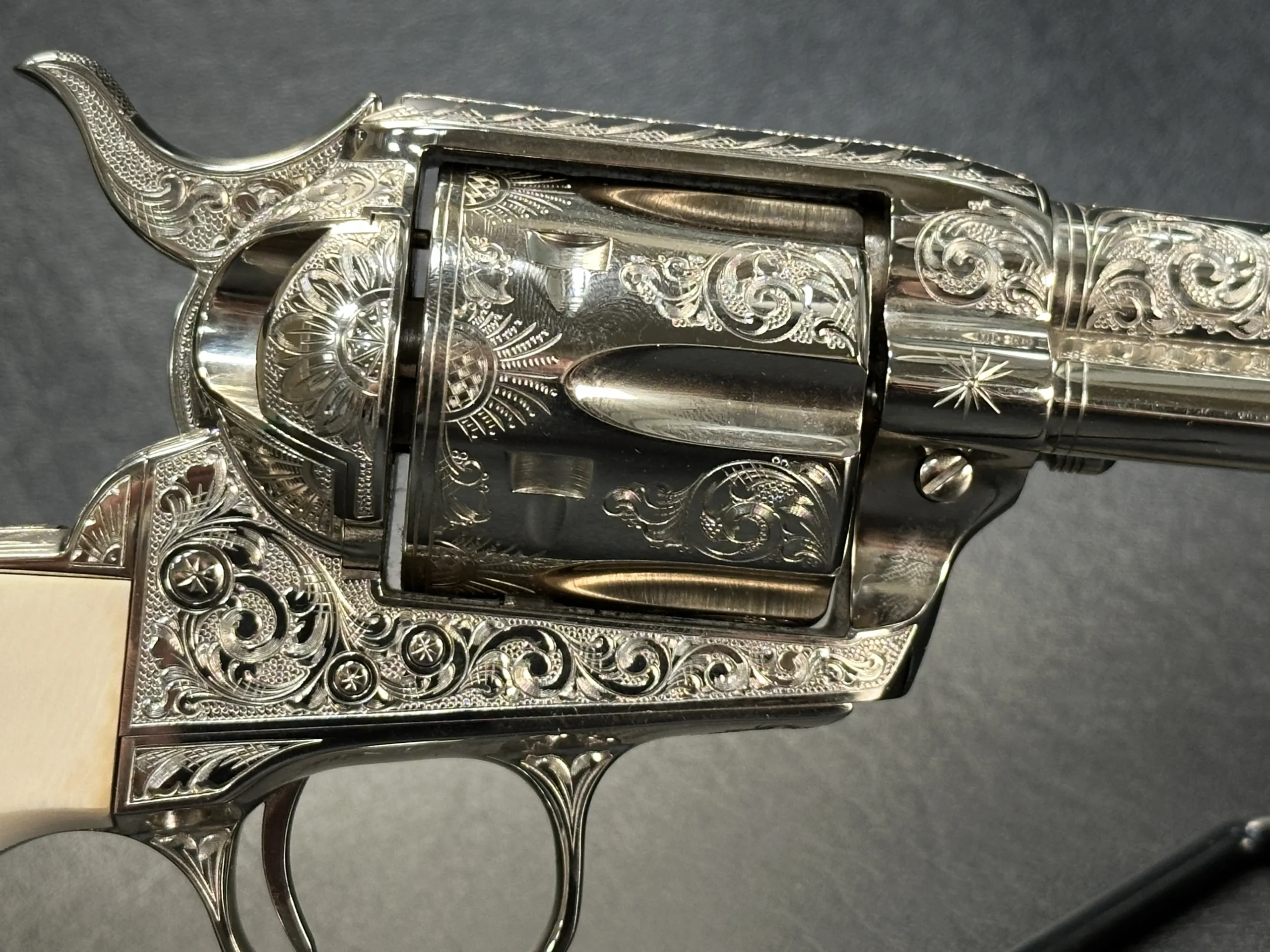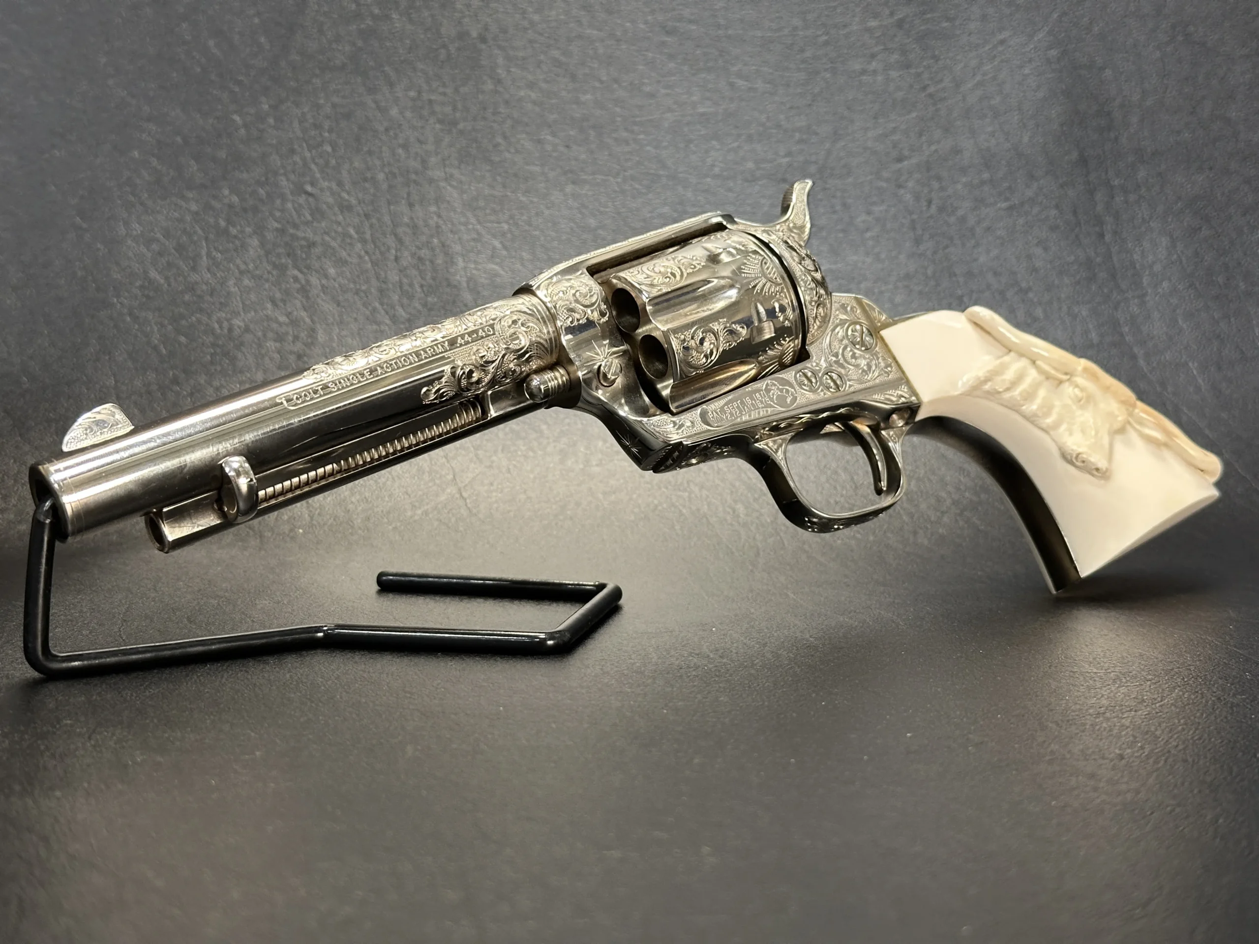 Additional details include a starburst motif on the frame, a finely cut floral design on the loading gate, and leafy engraving along the top strap. John Adams Jr. signed the trigger guard, adding a discreet finishing touch to the overall composition.