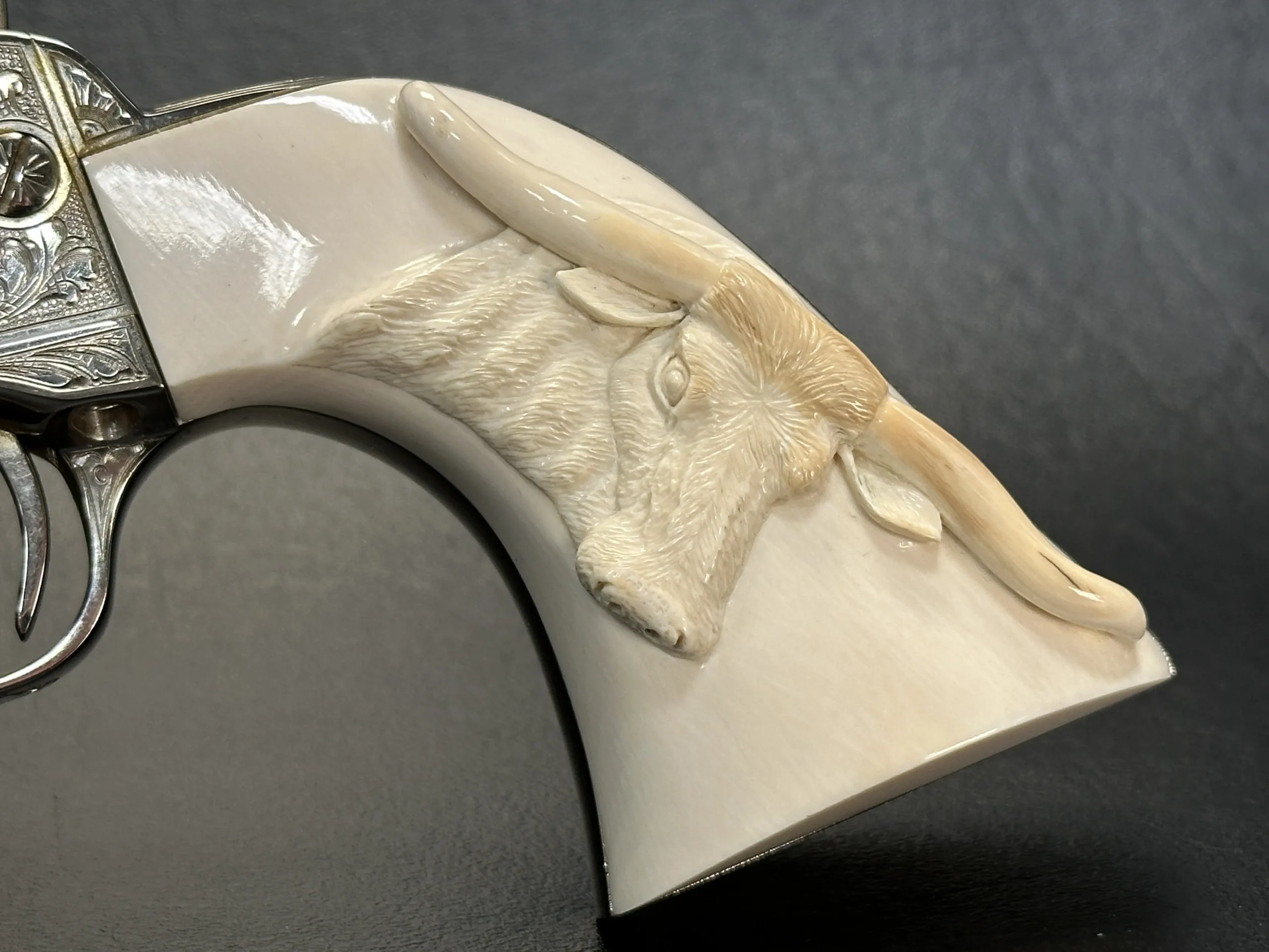 The revolver is fitted with carved steer head grips with pierced horn details, reinforcing its classic Western character. It is accompanied by its original Colt blue box and matching shipping carton. The nickel finish is described as more than 99 percent, with a few faint handling marks noted in the original description.