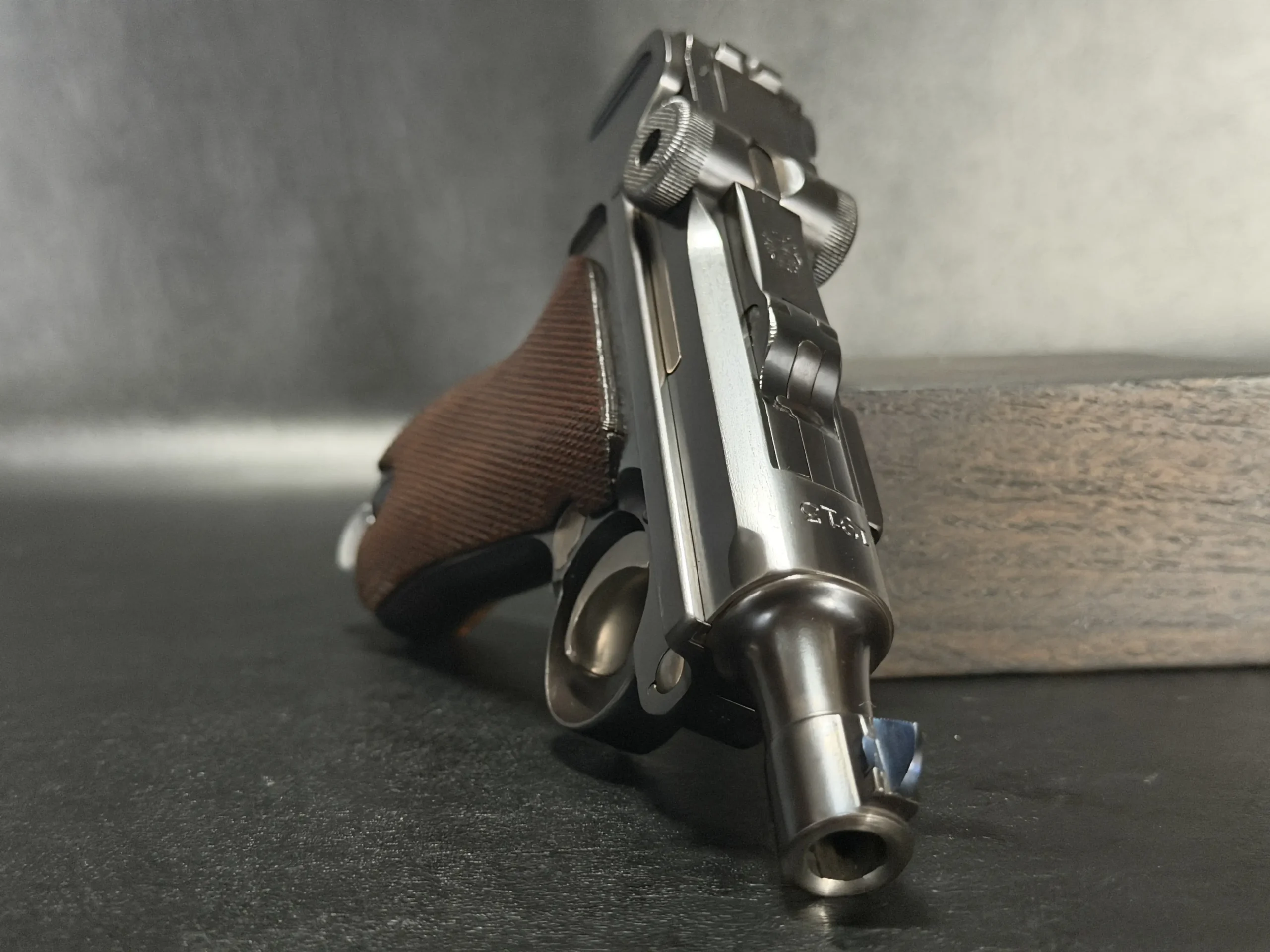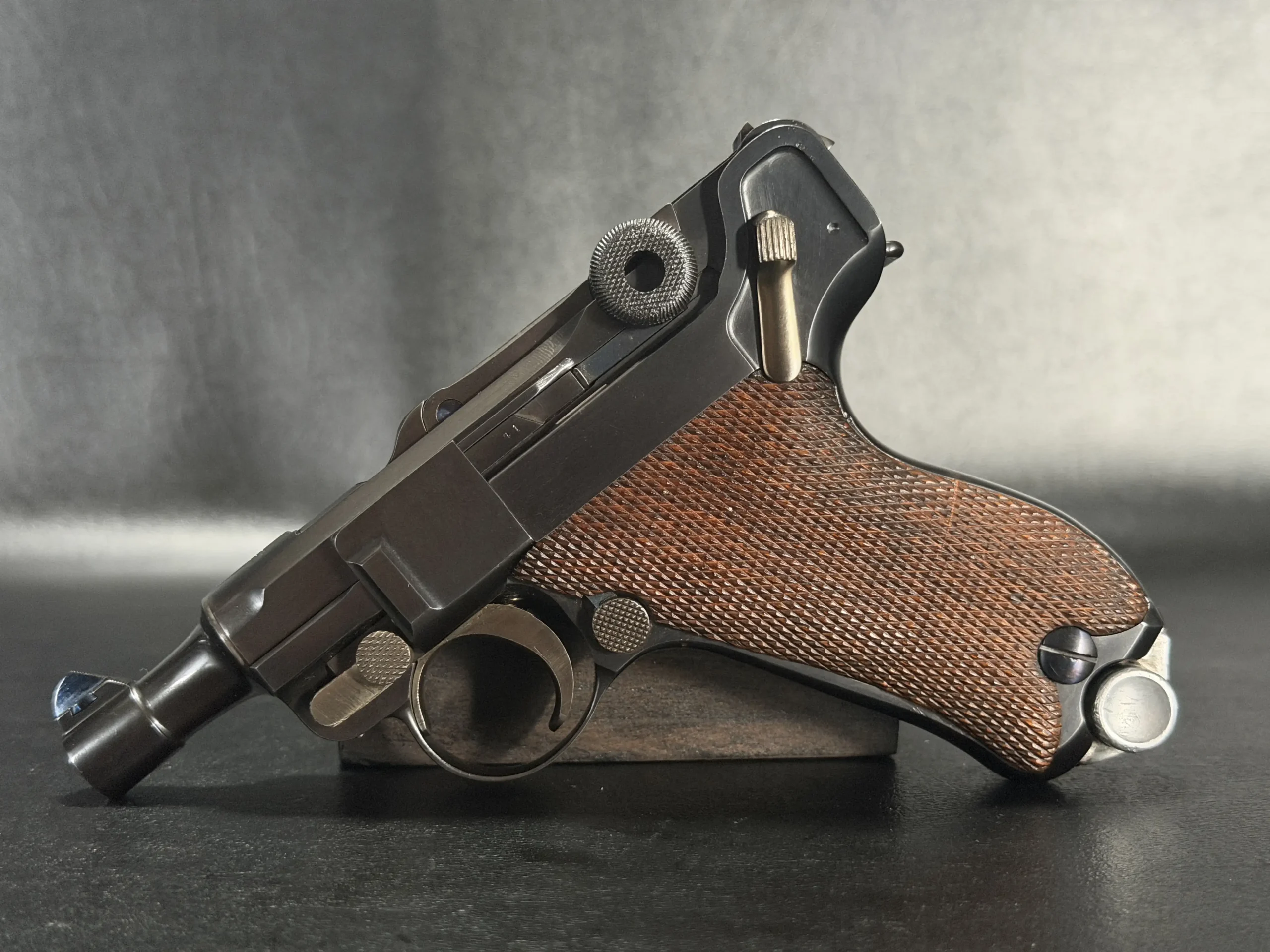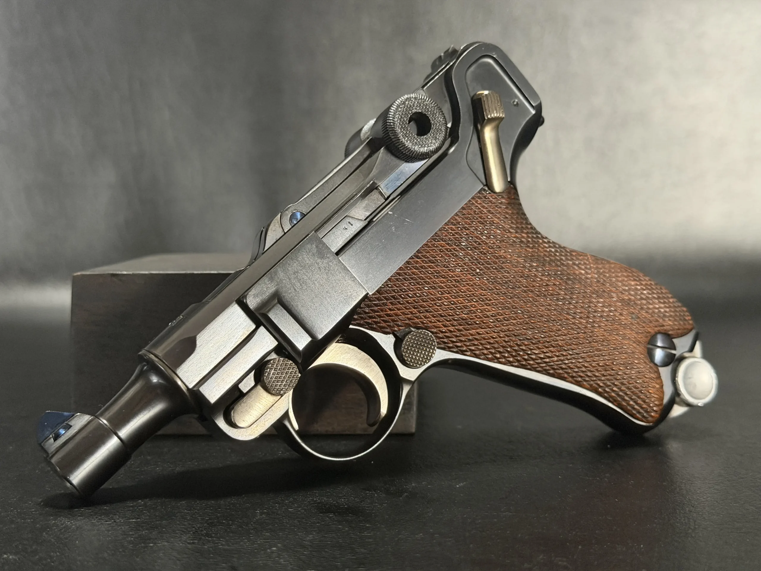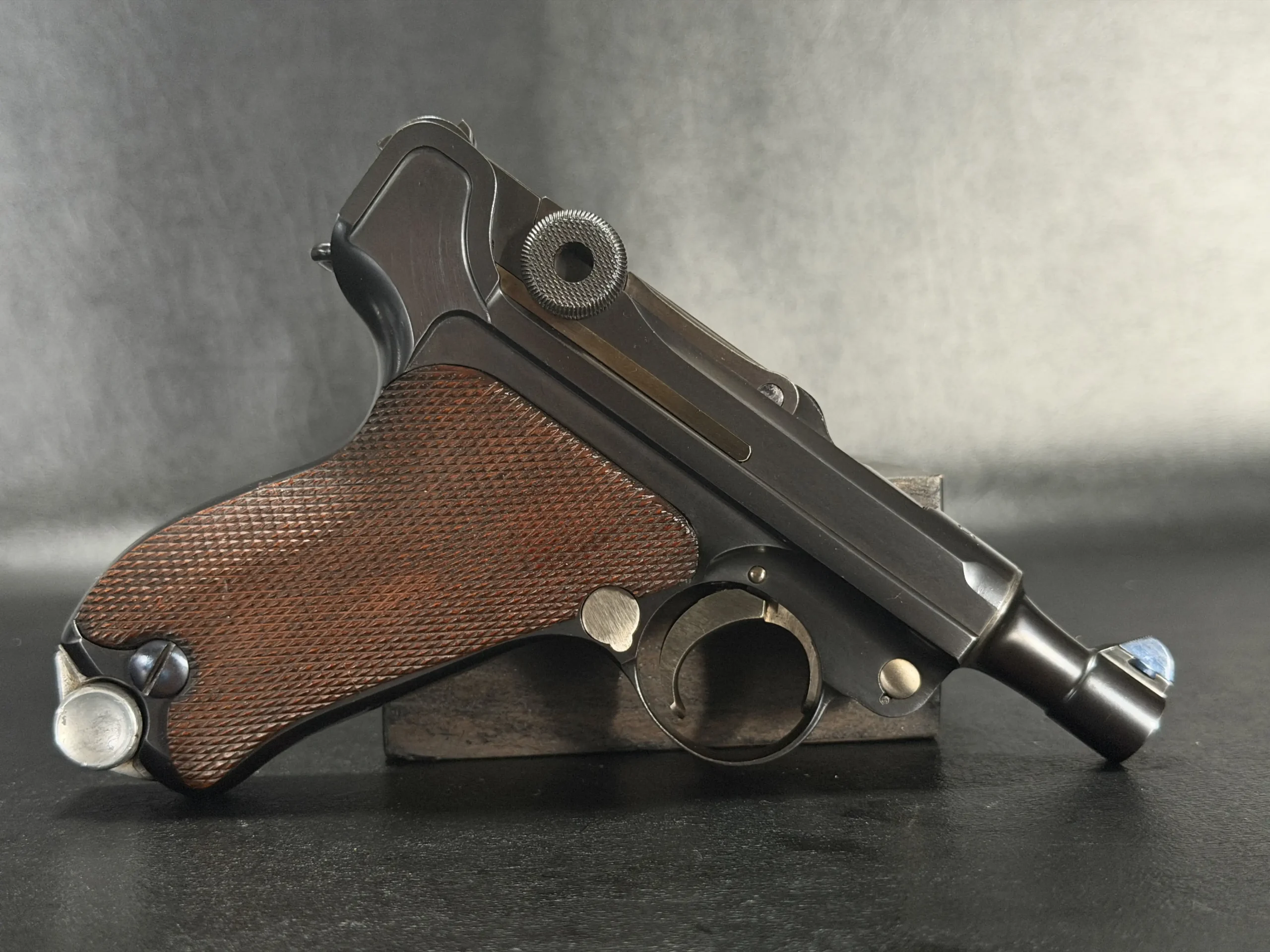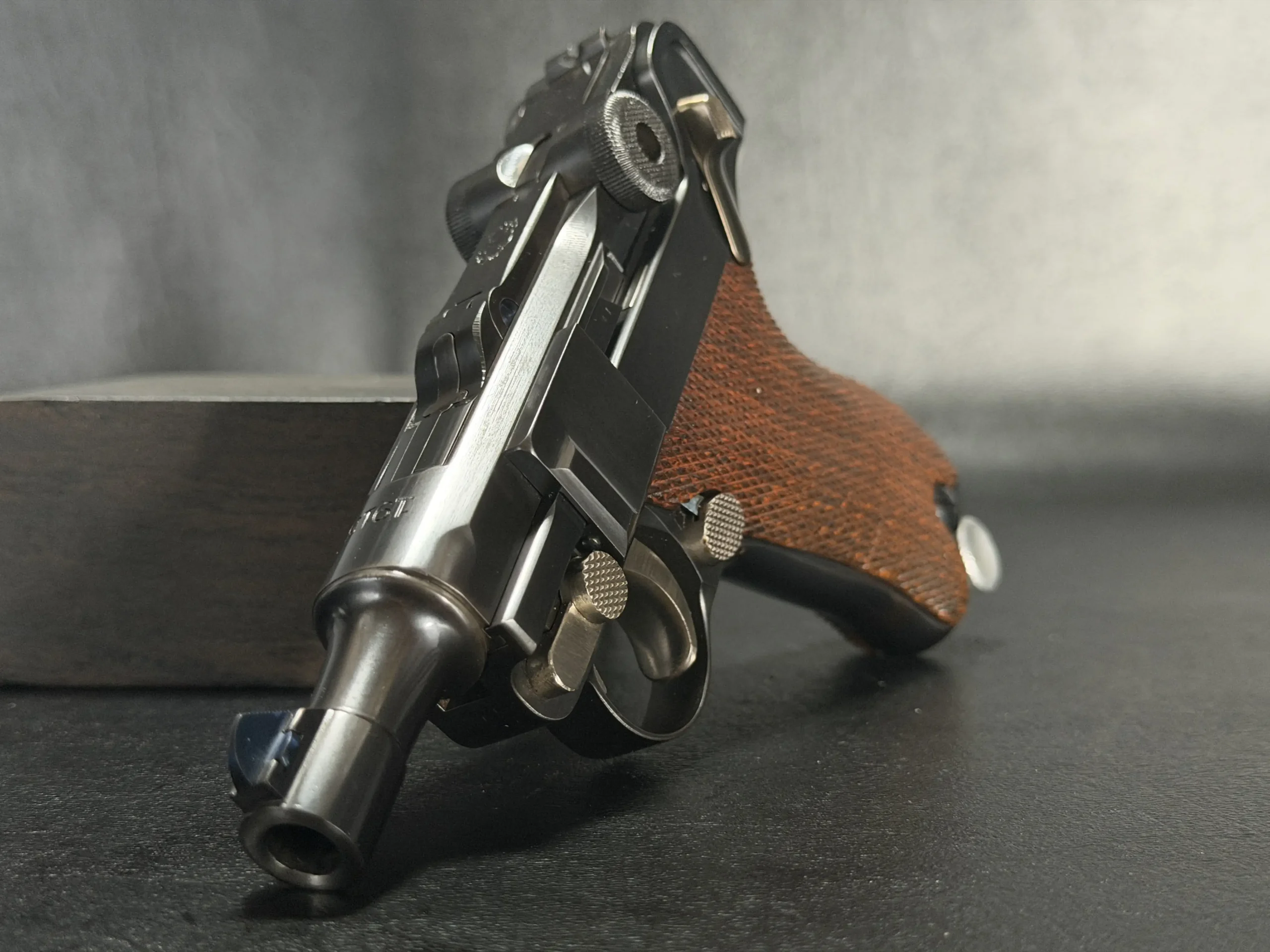 The pistol features a deep satin rust-blue finish with straw-colored accents on the controls, creating a refined contrast true to the character of early Lugers. Finely checkered walnut grip panels are carefully fitted to the frame, adding warmth and visual balance to the blued steel construction.